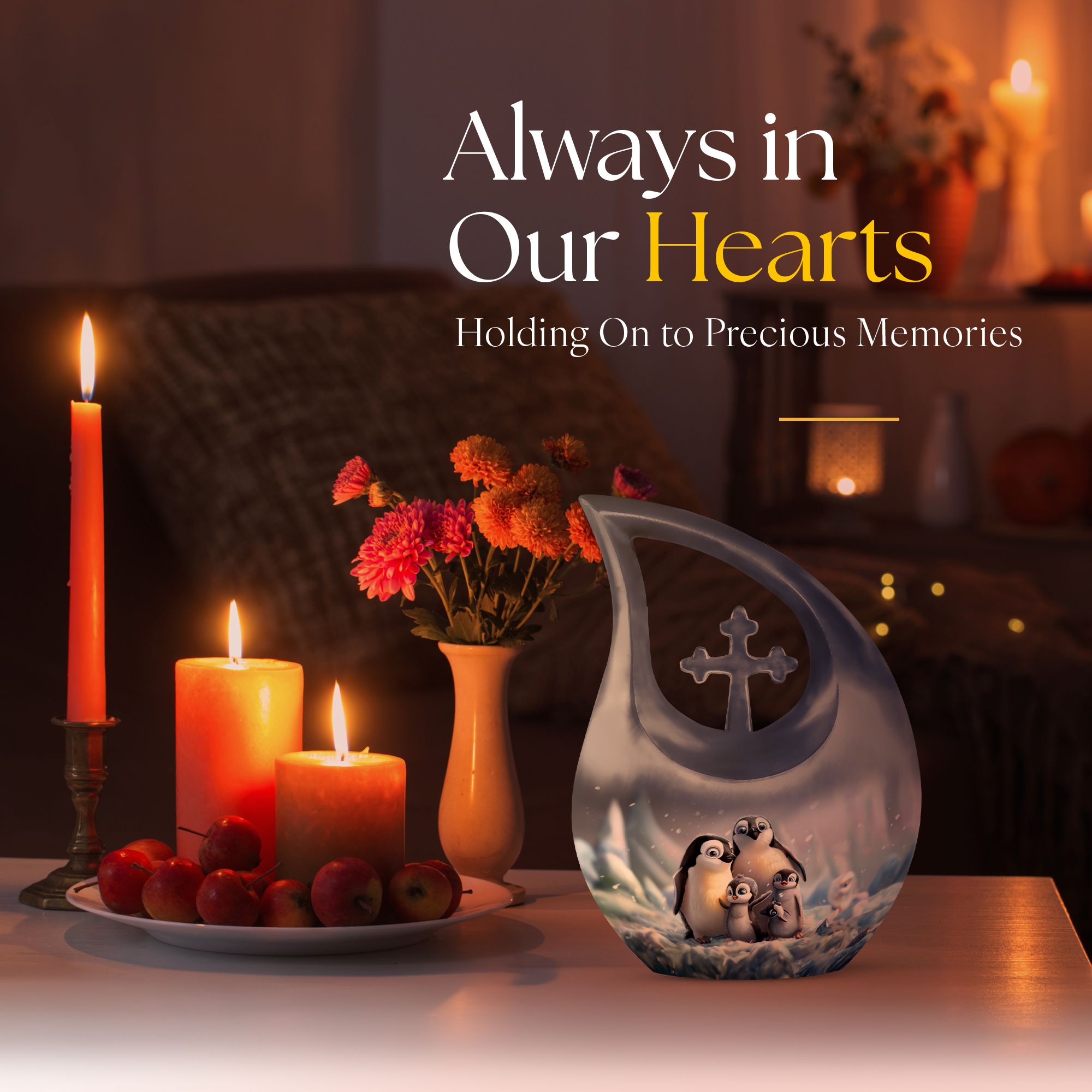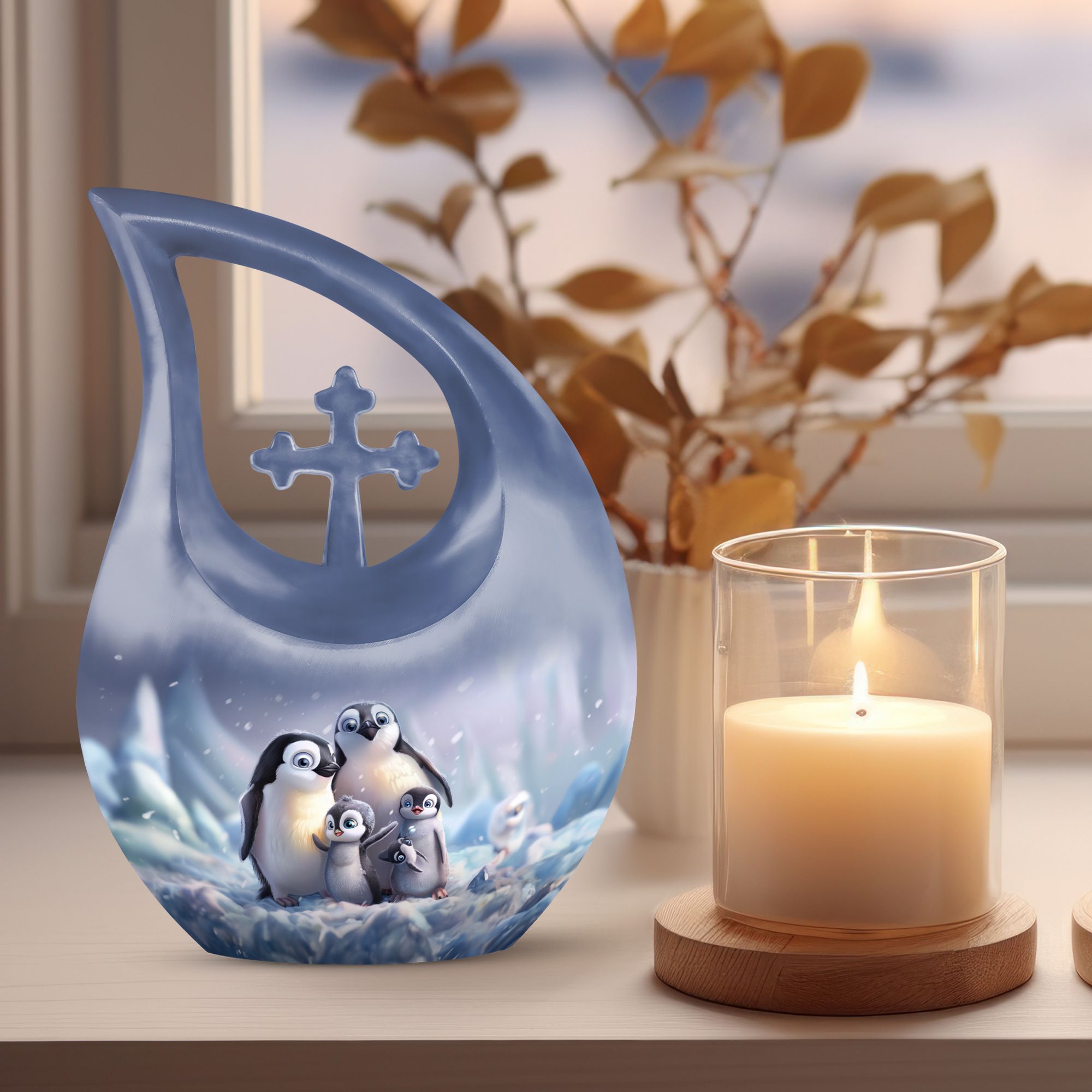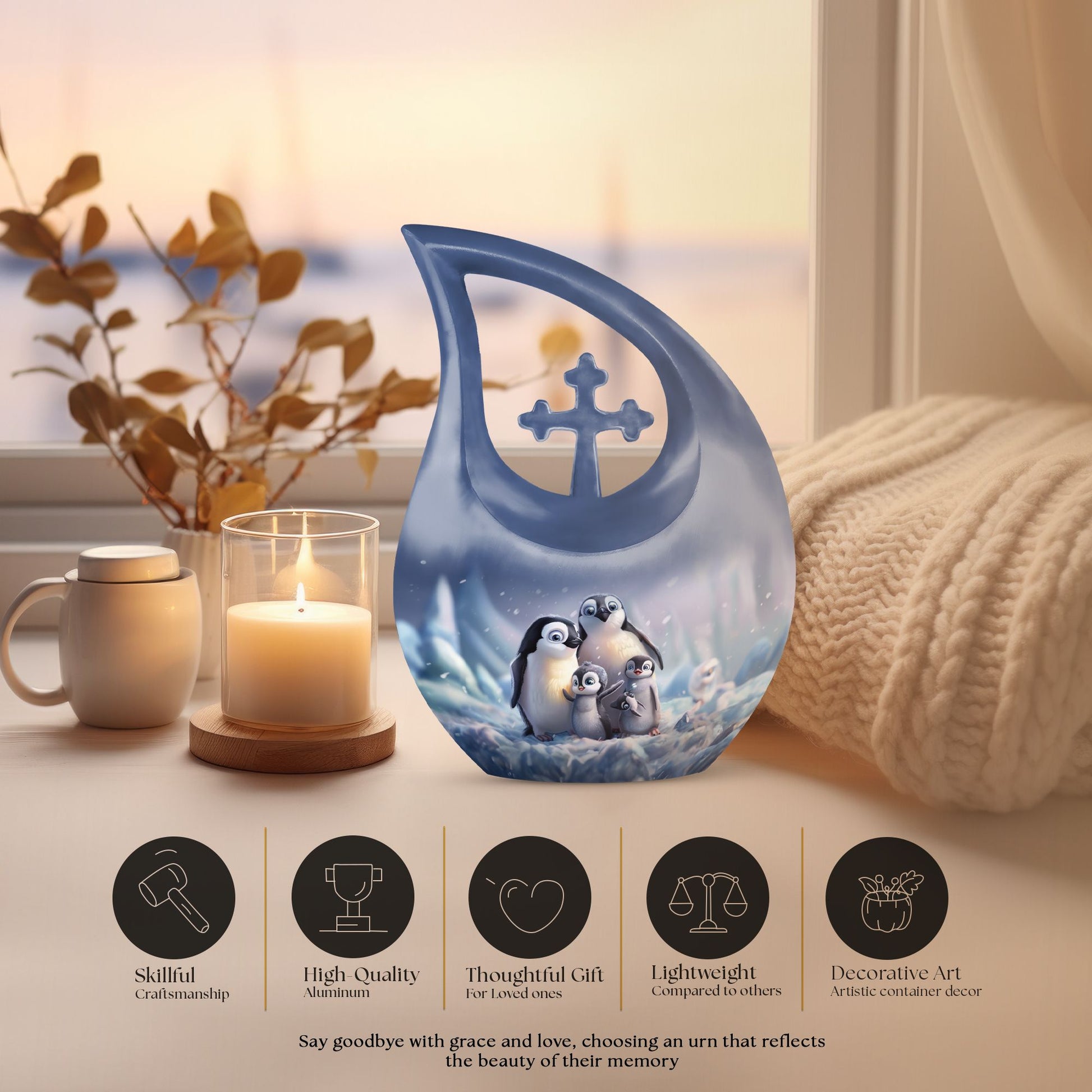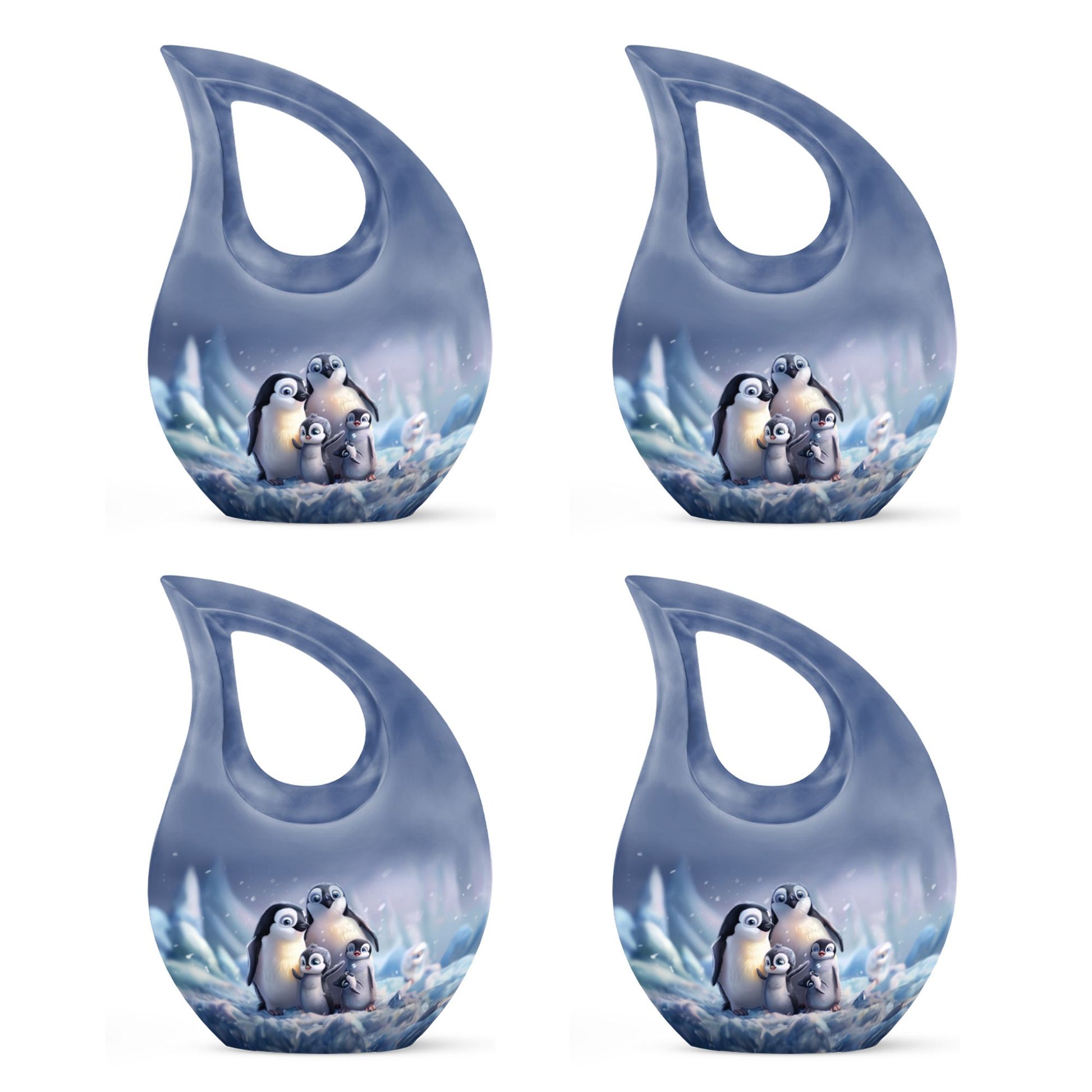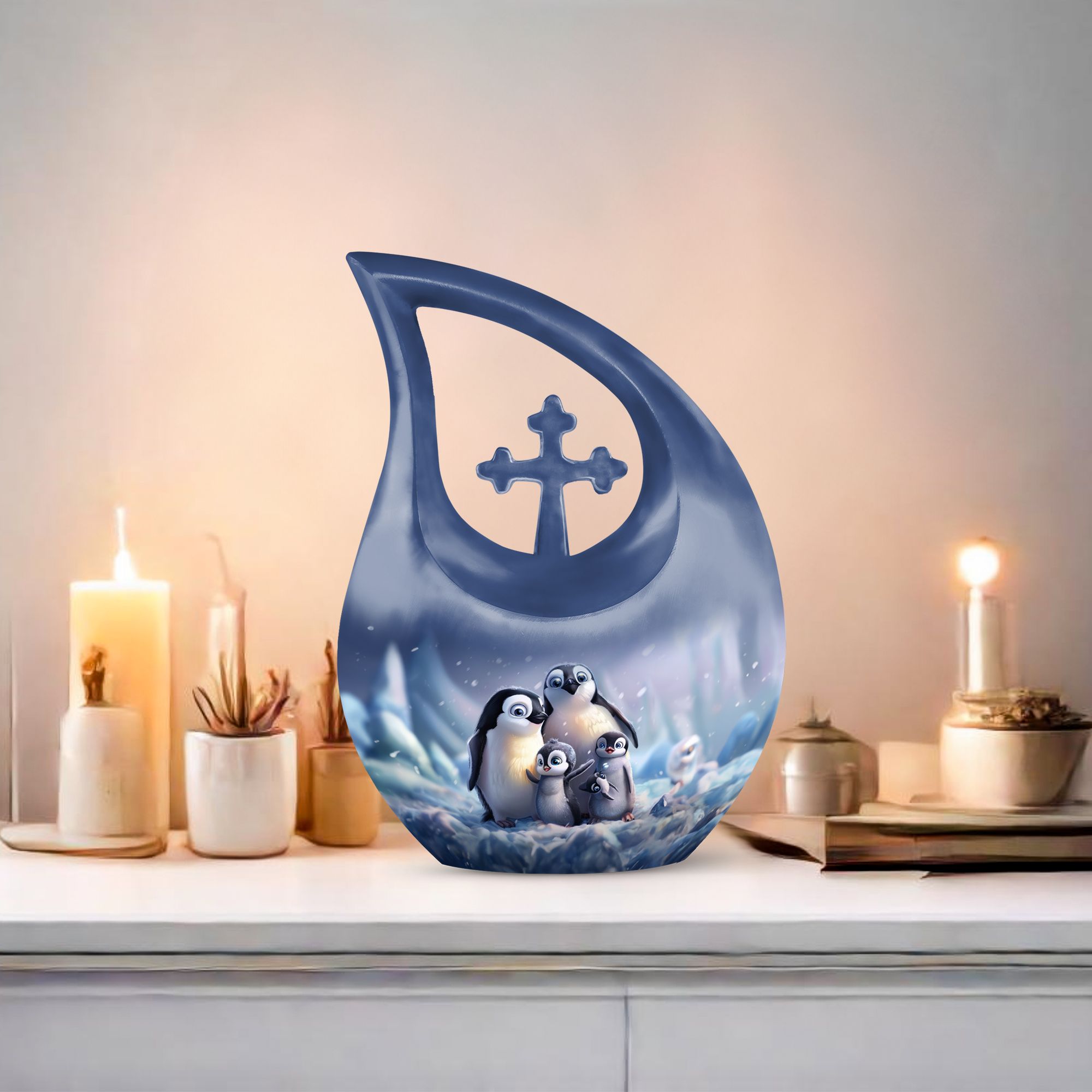 Delve into a cherished tribute with our large Penguin Urn, an elegant remembrance urn for ashes captivatingly crafted from durable aluminium. Captivate in its unique 10-Inch stature, this modern urn for ashes is meticulously personalized with engraved names, making it an exclusively bespoke piece for your loving mom. It weighs a solid 3.3 pounds and with dimensions of 10 inches in height, it commands respect and reverence. The urn generously offers a sizable capacity of 200 cubic inches and comes hand in hand with a snug velvet pouch for containment of ashes, underscoring its unmatched value. Our signature 'Cross Drop' asserts itself on this urn, giving it a sacred feel, fitting for angels and loved ones. Its theme dances to the penguin tune, a subtle symbolism of love, family and community cohesion. Be assured to have your desires in urn customization met in this embodiment of sublime craft and tradition, a fitting vessel to pay tribute to your mom's beautiful life. A memento to hold dear, this urn serves as a loving sanctuary for your lost loved one's ashes.