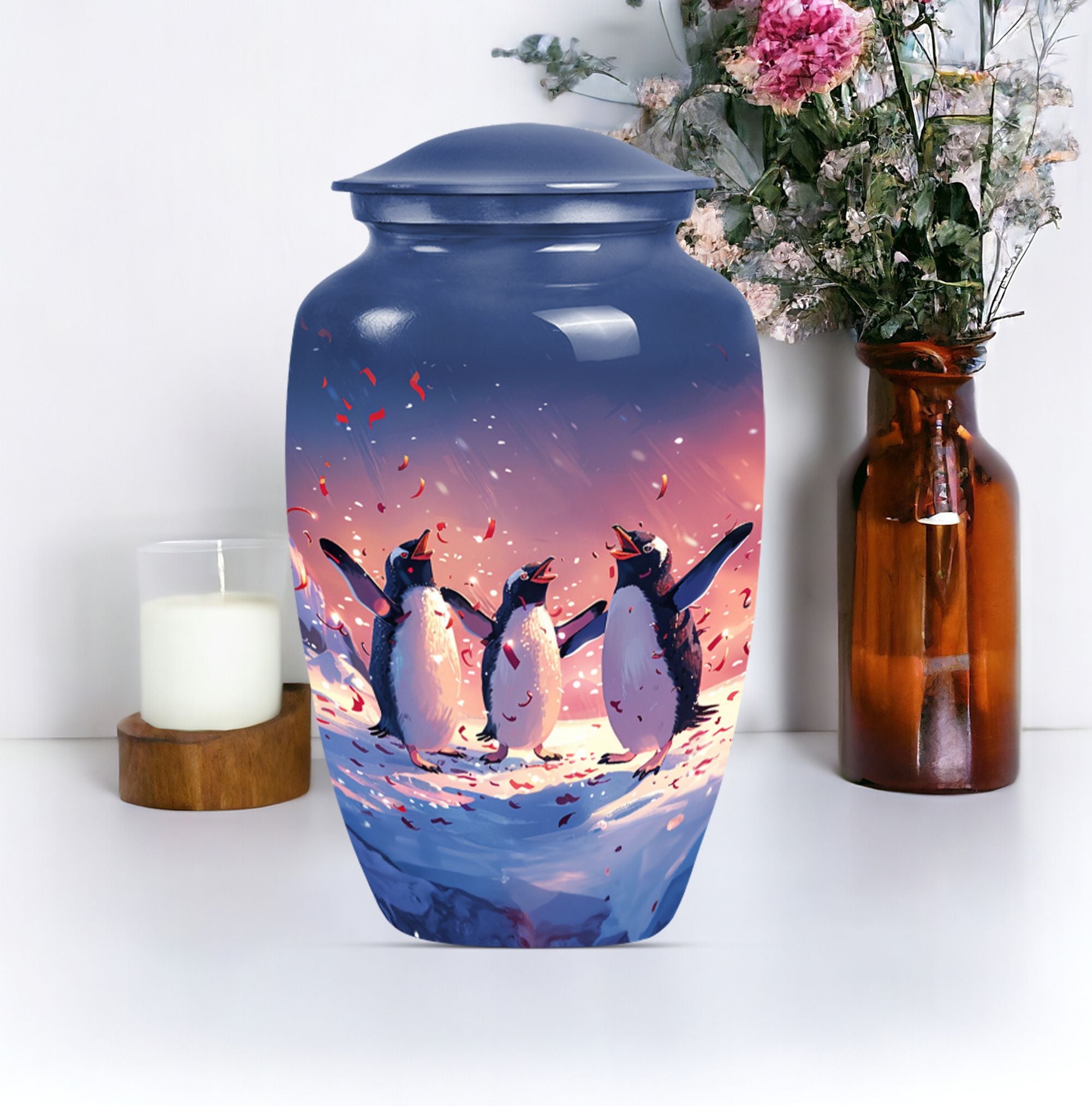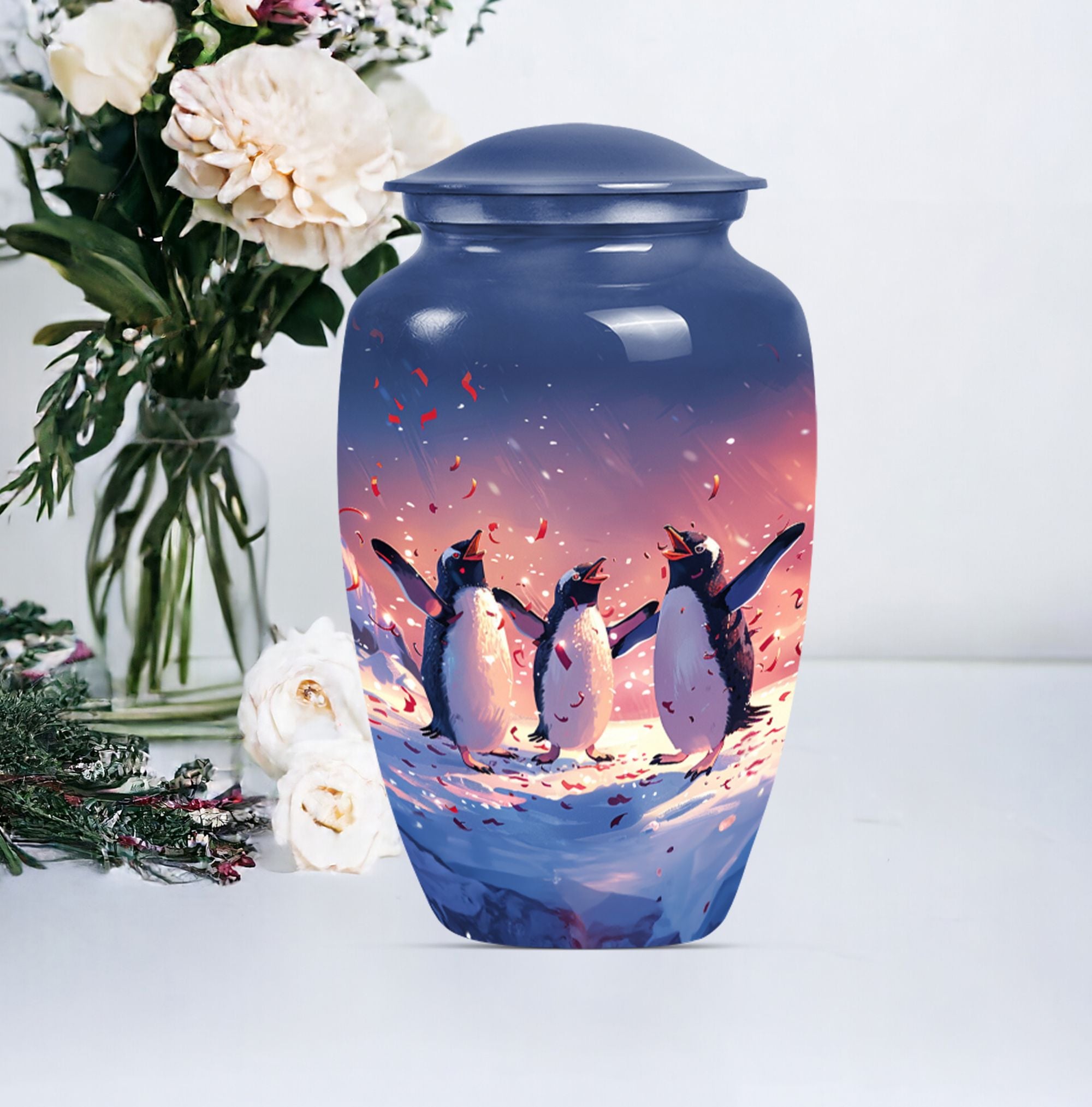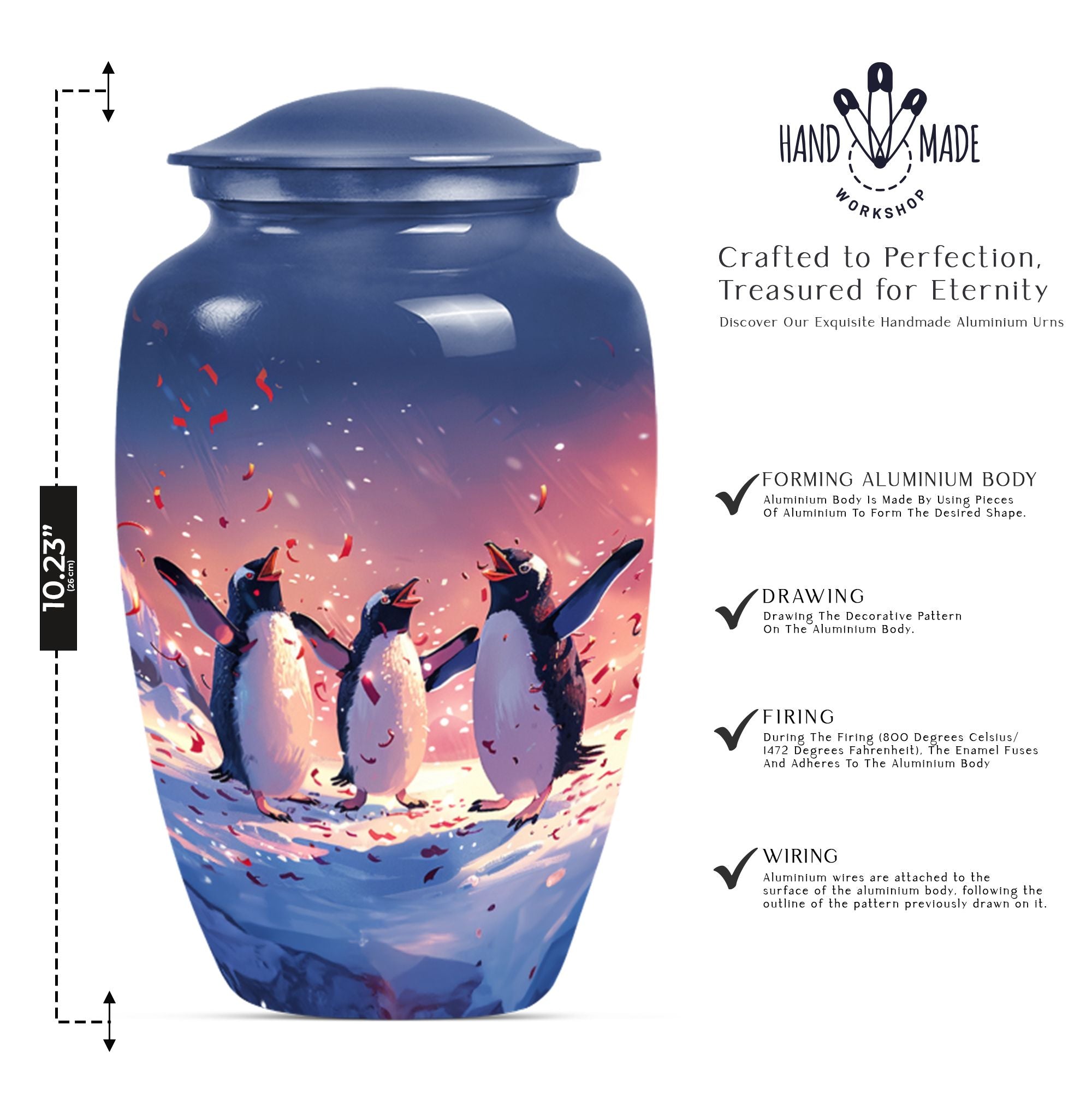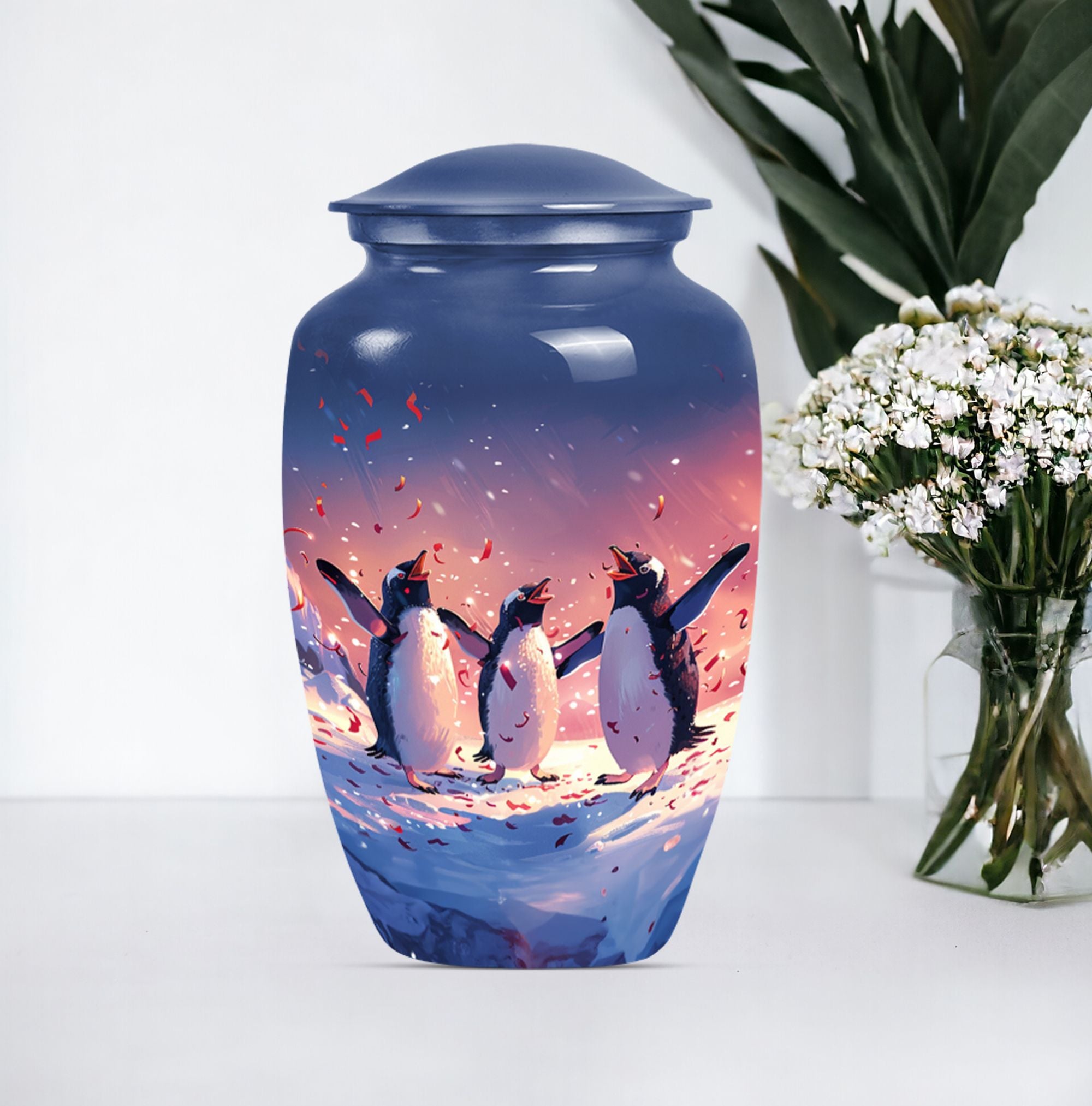 Honor your loved one with our elevated Penguin Urn, a fitting tribute for memorial ceremonies and an exceptional selection in burial medium size urns. This sizeable 10-inch cremation urn is impeccably crafted from durable and beautifully finished aluminium, offering a capacity of 200 cubic inches. The urn weighs a substantial 3.3 pounds, evoking a sense of permanence and lasting memory. Each urn is uniquely personalized by allowing for engraved names, imbuing a level of sentiment truly unparalleled. The buttery theme adds a touch of tranquility to the classic urn design, bringing peace and solace in times of grief. To enhance the experience further, we provide a plush velvet pouch for containment of ashes. This artistic urn, suitable for both women and men, offers a timeless way to memorialize your loved one's ashes. Our Penguin urn is more than a metal urn for burial in ground large size. It’s an embodiment of care, respect, and everlasting memory.