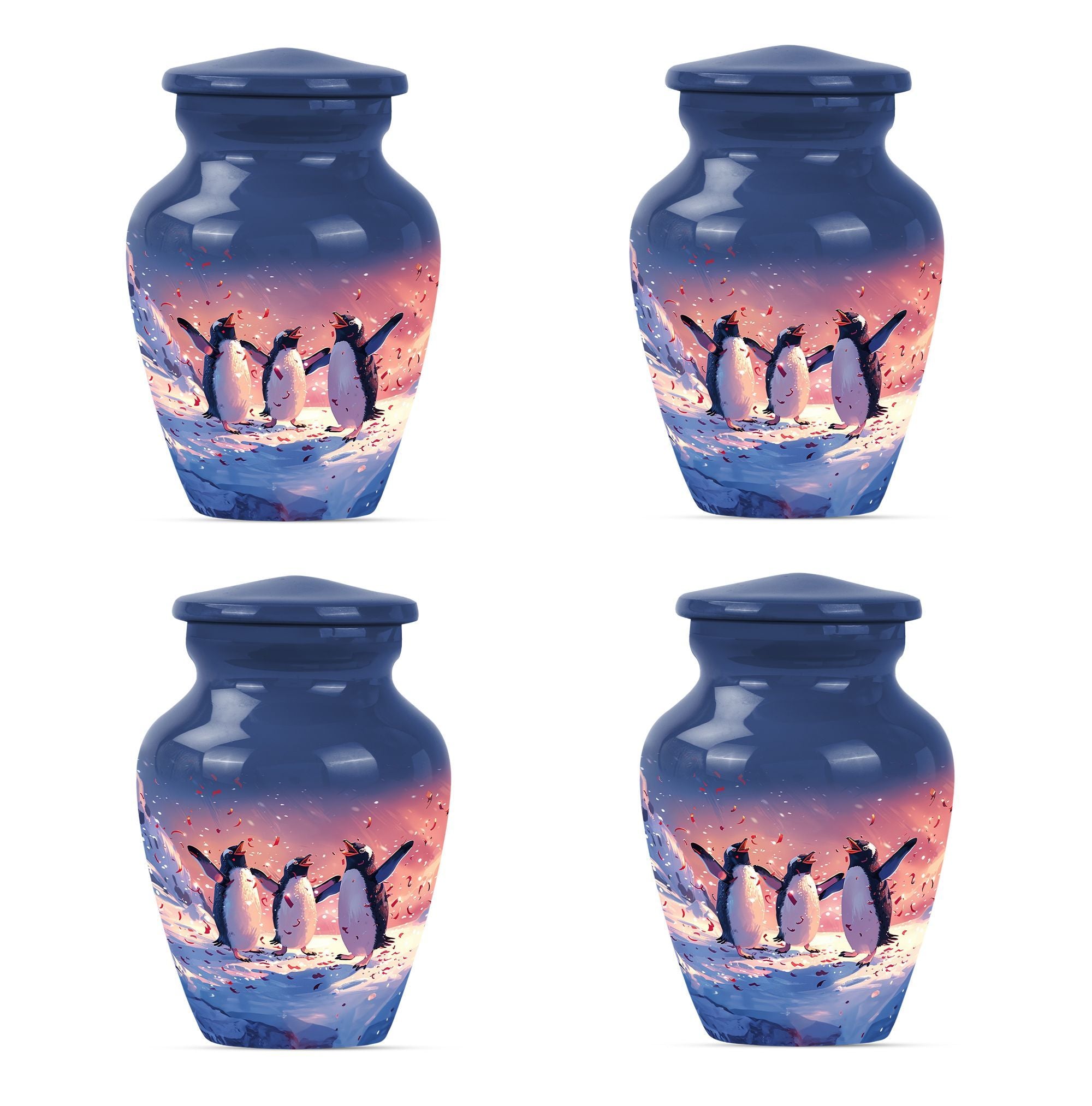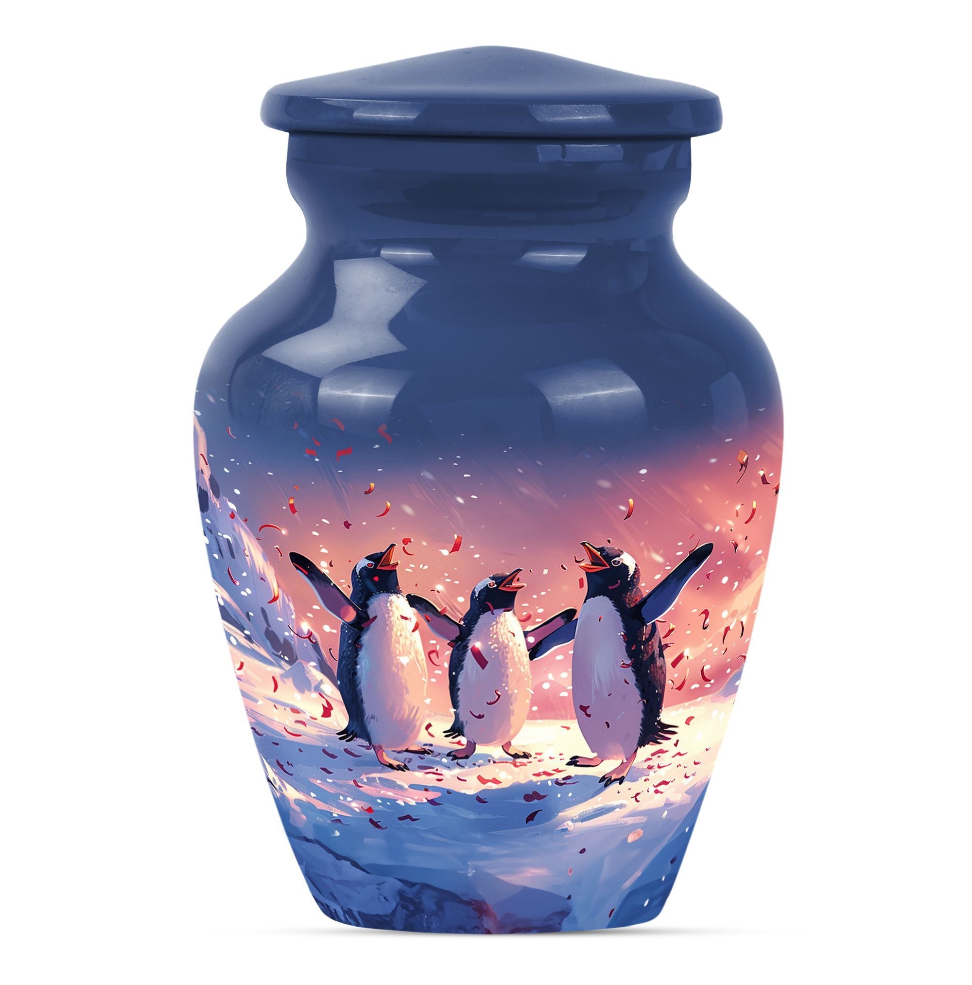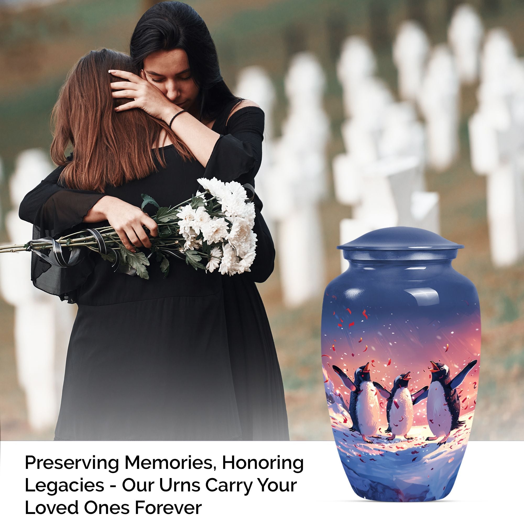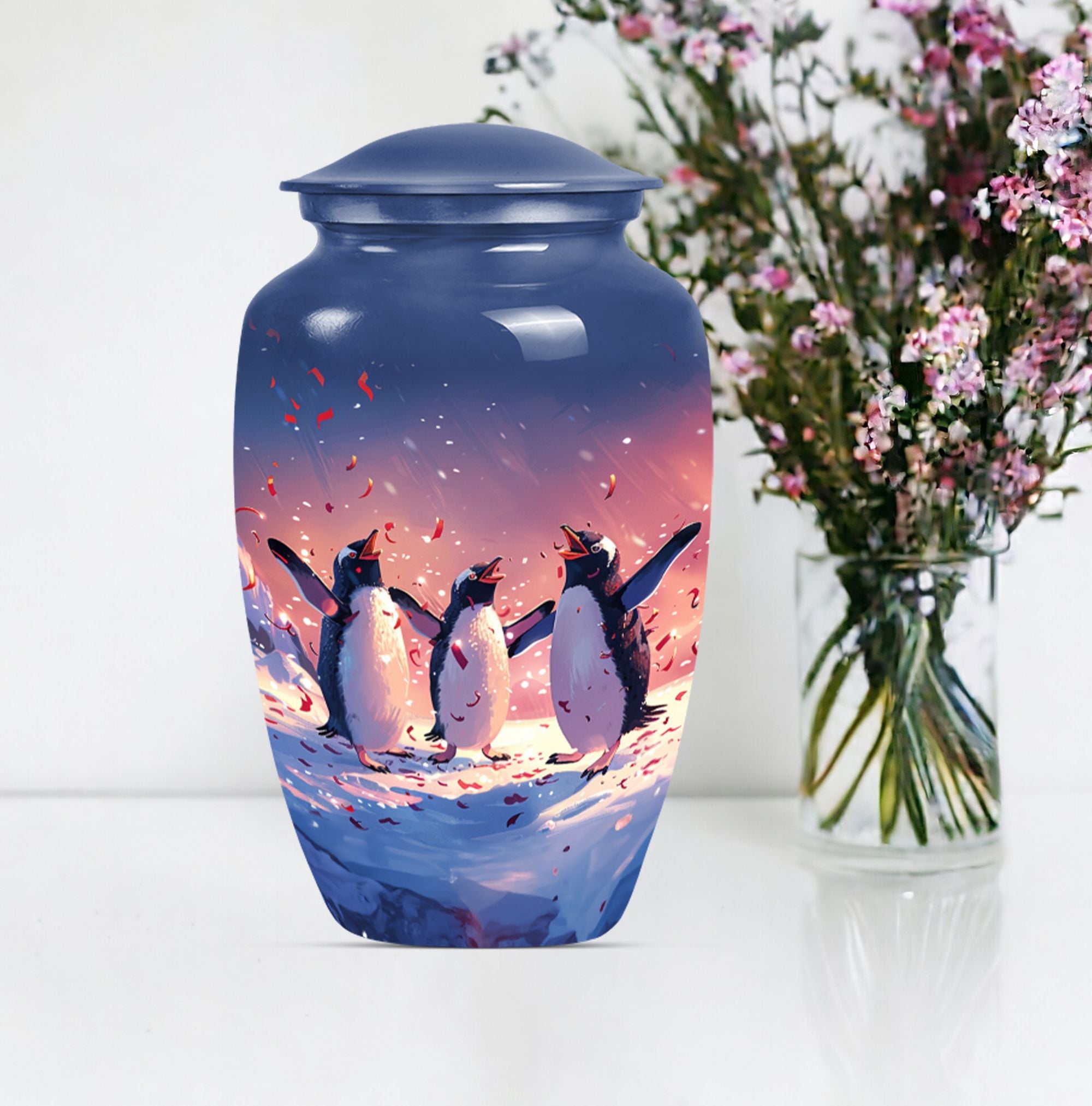 Honor your loved one with our elevated Penguin Urn, a fitting tribute for memorial ceremonies and an exceptional selection in burial medium size urns. This sizeable 10-inch cremation urn is impeccably crafted from durable and beautifully finished aluminium, offering a capacity of 200 cubic inches. The urn weighs a substantial 3.3 pounds, evoking a sense of permanence and lasting memory. Each urn is uniquely personalized by allowing for engraved names, imbuing a level of sentiment truly unparalleled. The buttery theme adds a touch of tranquility to the classic urn design, bringing peace and solace in times of grief. To enhance the experience further, we provide a plush velvet pouch for containment of ashes. This artistic urn, suitable for both women and men, offers a timeless way to memorialize your loved one's ashes. Our Penguin urn is more than a metal urn for burial in ground large size. It’s an embodiment of care, respect, and everlasting memory.
