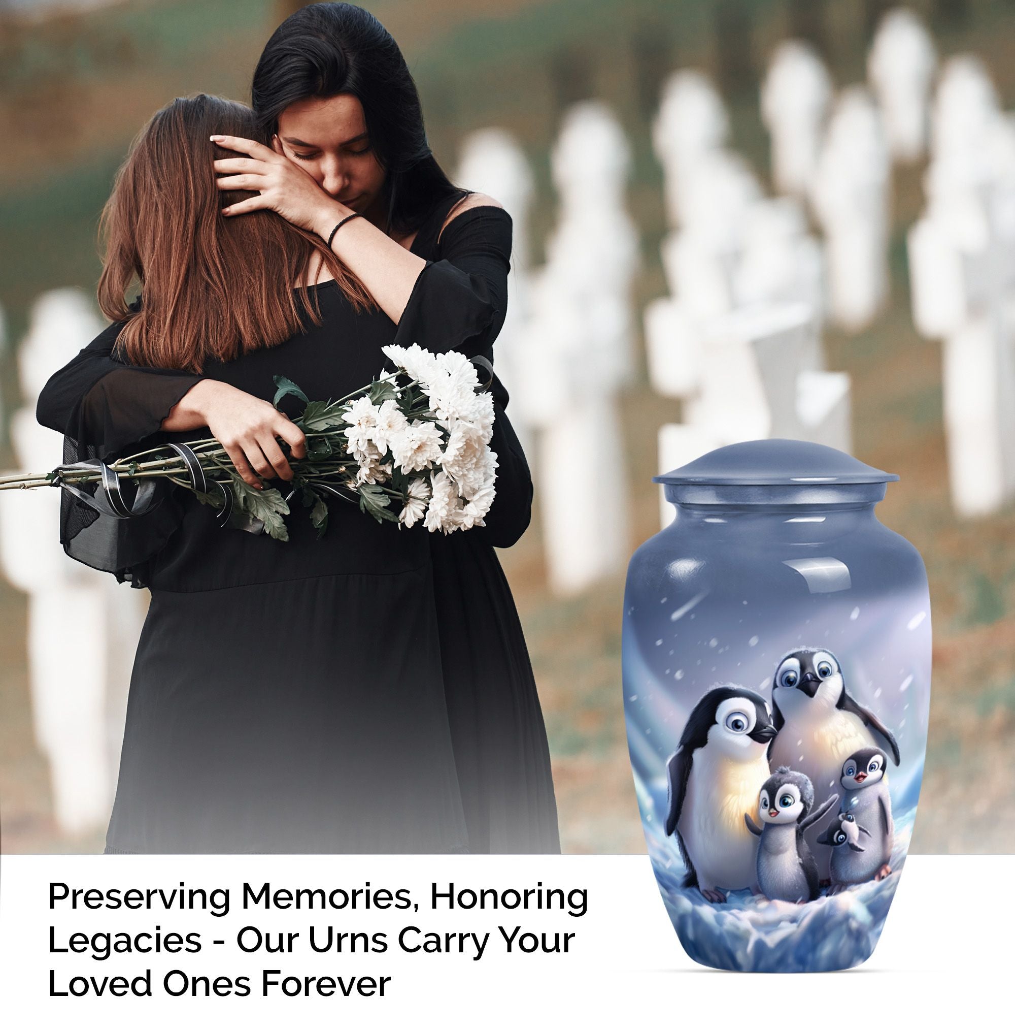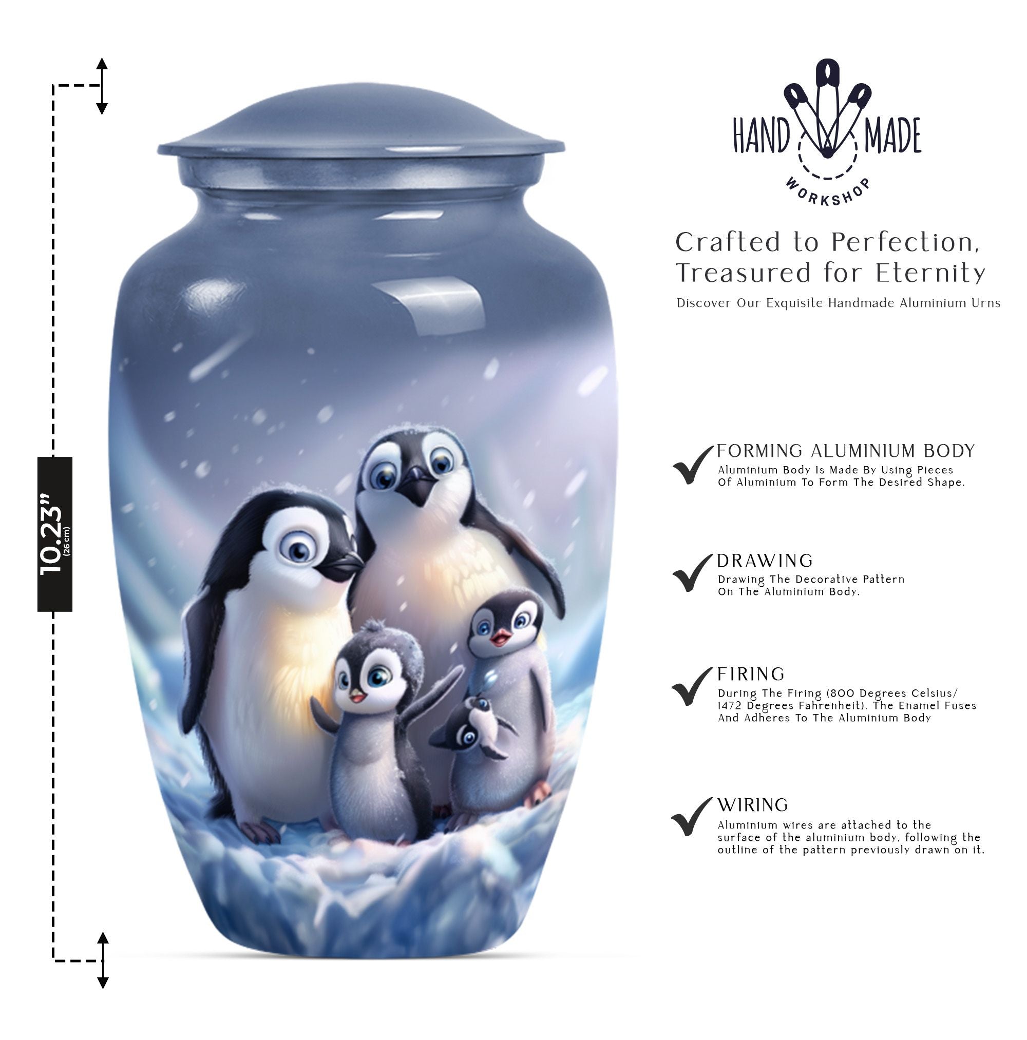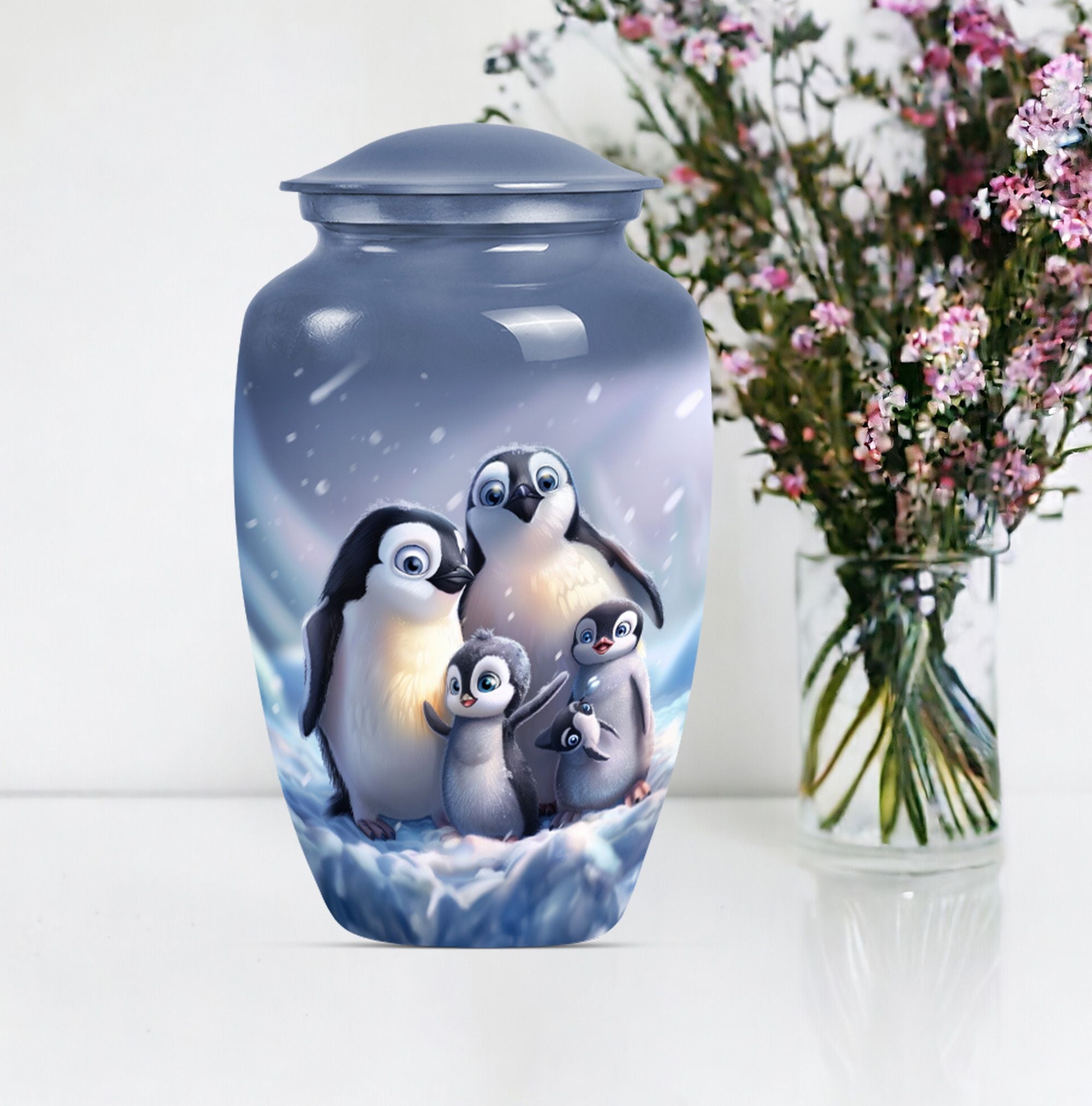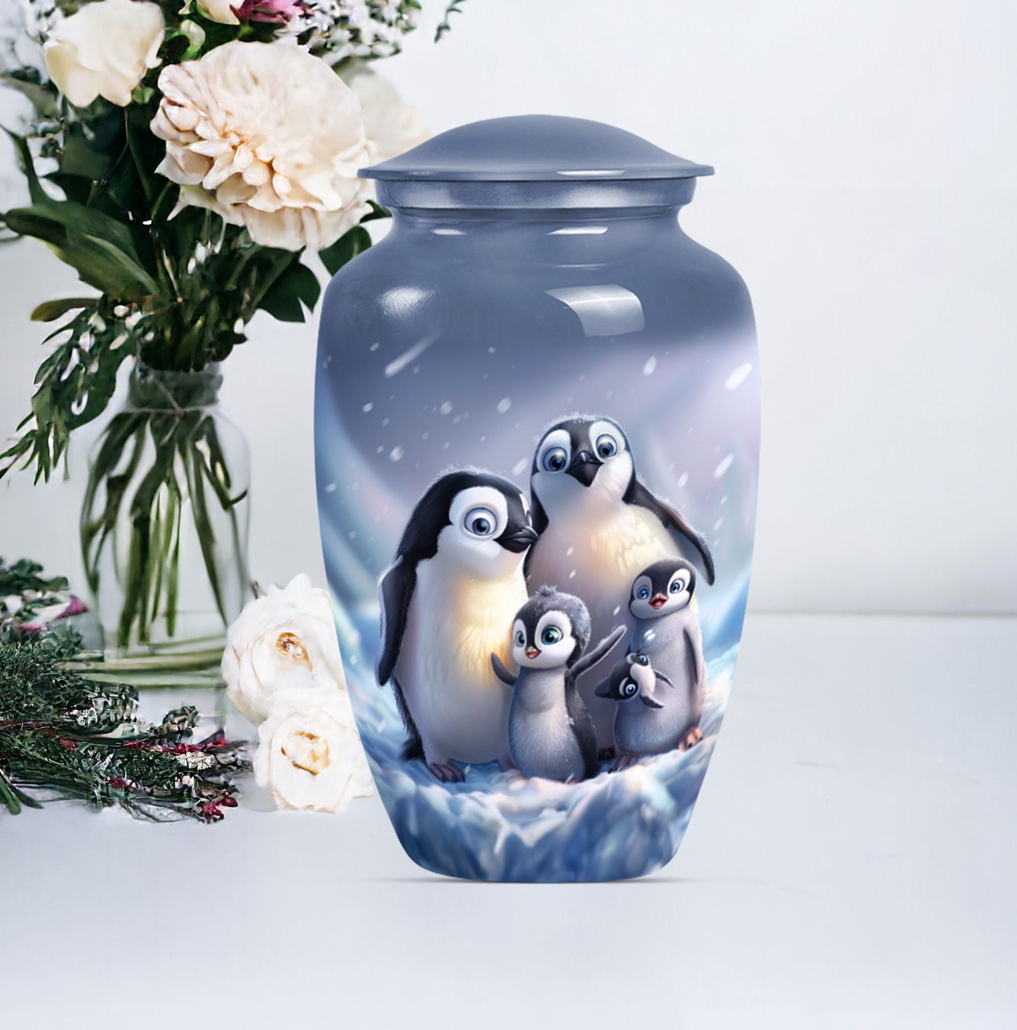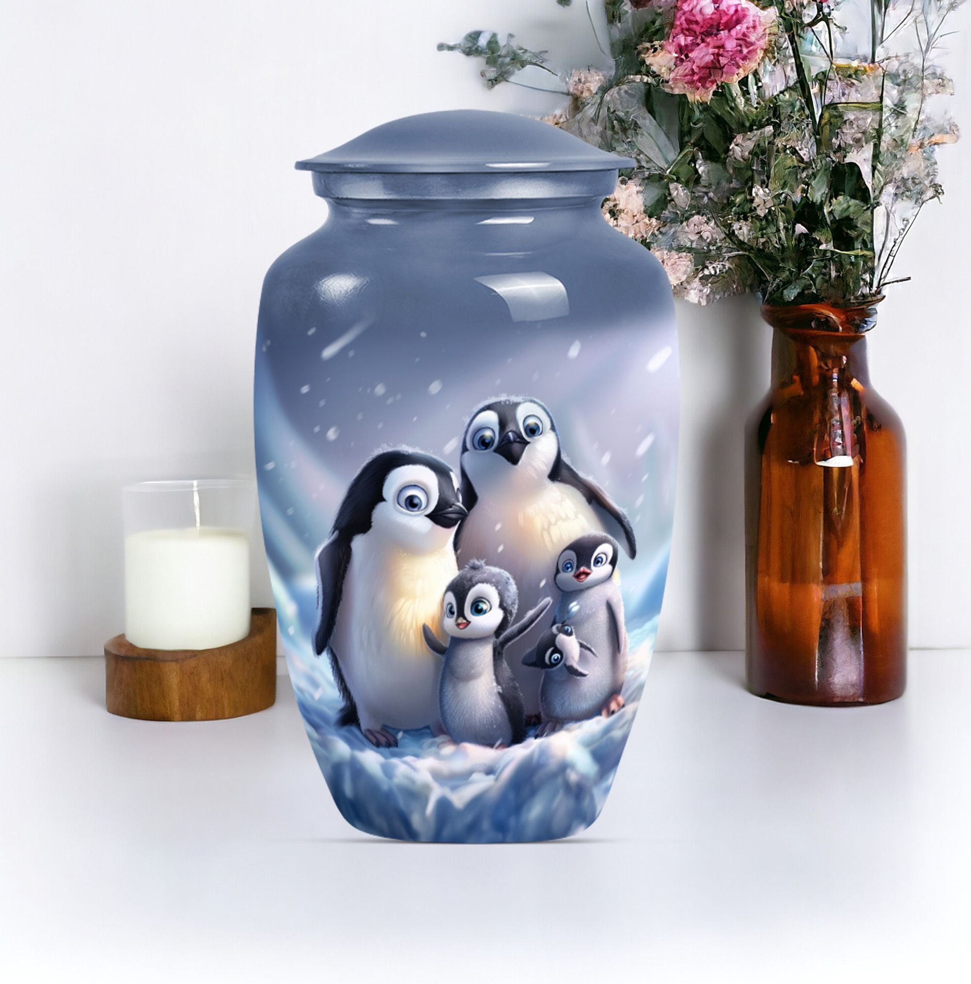 The Penguin Urn is a refined and elegant tribute designed to honor the memory of a cherished loved one. This urn embodies a gentleman's cadence and tranquility, featuring a beautifully detailed penguin design that symbolizes grace, dignity, and serene reflection. Crafted from high-quality materials, the urn ensures both durability and lasting beauty, making it a fitting and dignified resting place. The gentle presence of the penguin amidst a tranquil setting serves as a touching reminder of the cherished memories and the peaceful legacy of your loved one. Perfect for display or burial, the Penguin Urn offers a heartfelt and serene way to commemorate their life with elegance and tranquility.