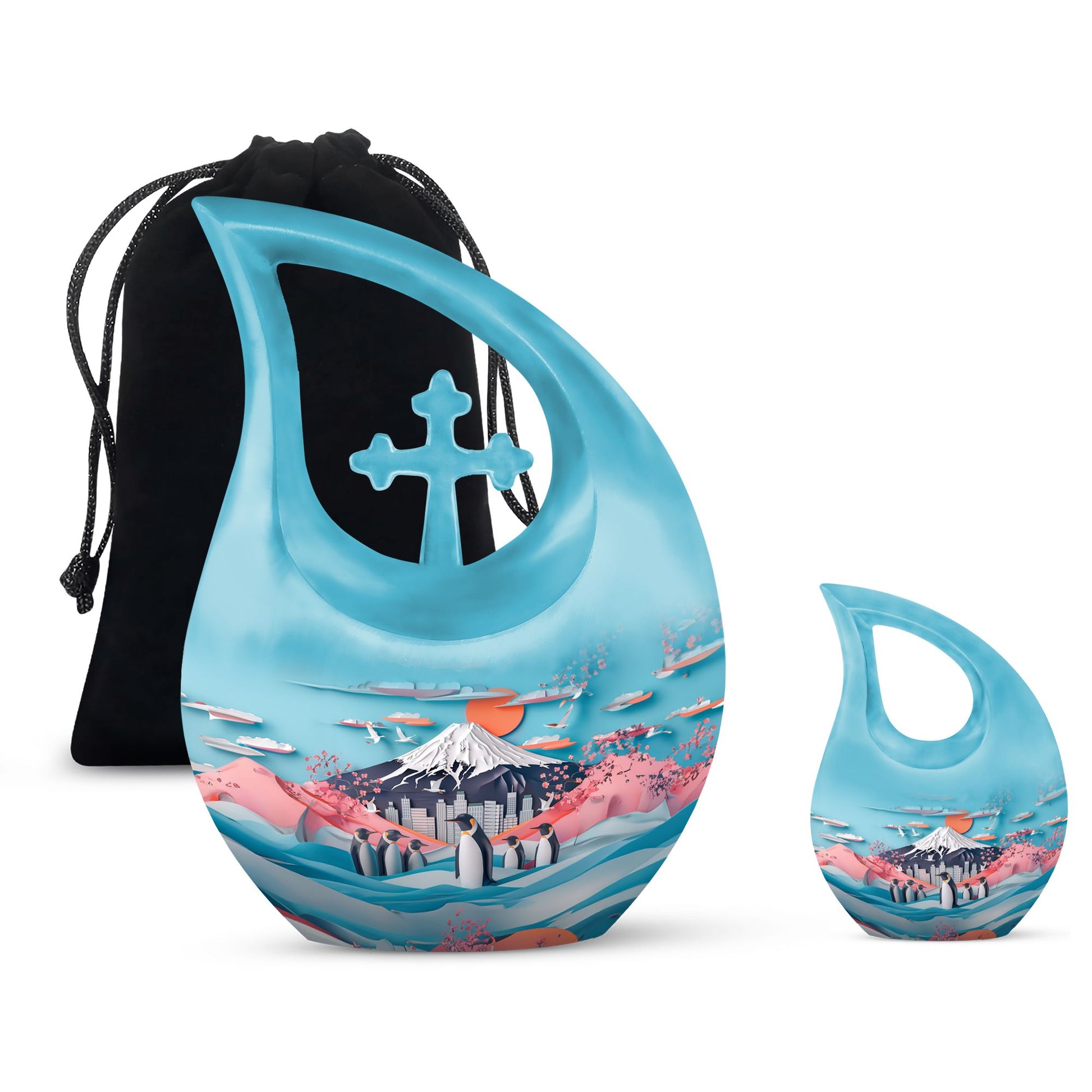 Discover a meaningful, dignified, and respectful resting place for your loved one with our Penguin urn, a medium-sized urn that captures the essence of beauty and solace. This 10-inch tall urn showcases a tasteful 'Cross Drop' theme, reflecting the soft serenity of a cherished memory. Its sturdy aluminium construction guarantees longevity, designed to house up to 200 cubic inches of ash. With a weight of 3.3 pounds, this urn exudes a comfortable presence for a peaceful memento. The package comes complete with a velvet pouch for the containment of ashes. Personalize your urn with engraved names, making it unique and more personal. You're not just getting an urn; you're investing in a memorable keepsake that signifies a dignified farewell. Ideal for those seeking out 'memorial urns' or 'companion urns for ashes'; this urn is one of the best urns that serve as a beautiful reminder. Whether 'cool urns' or 'keepsake memory box’ are your usual search criteria, our Penguin urn fills all categories with grace and reverence.