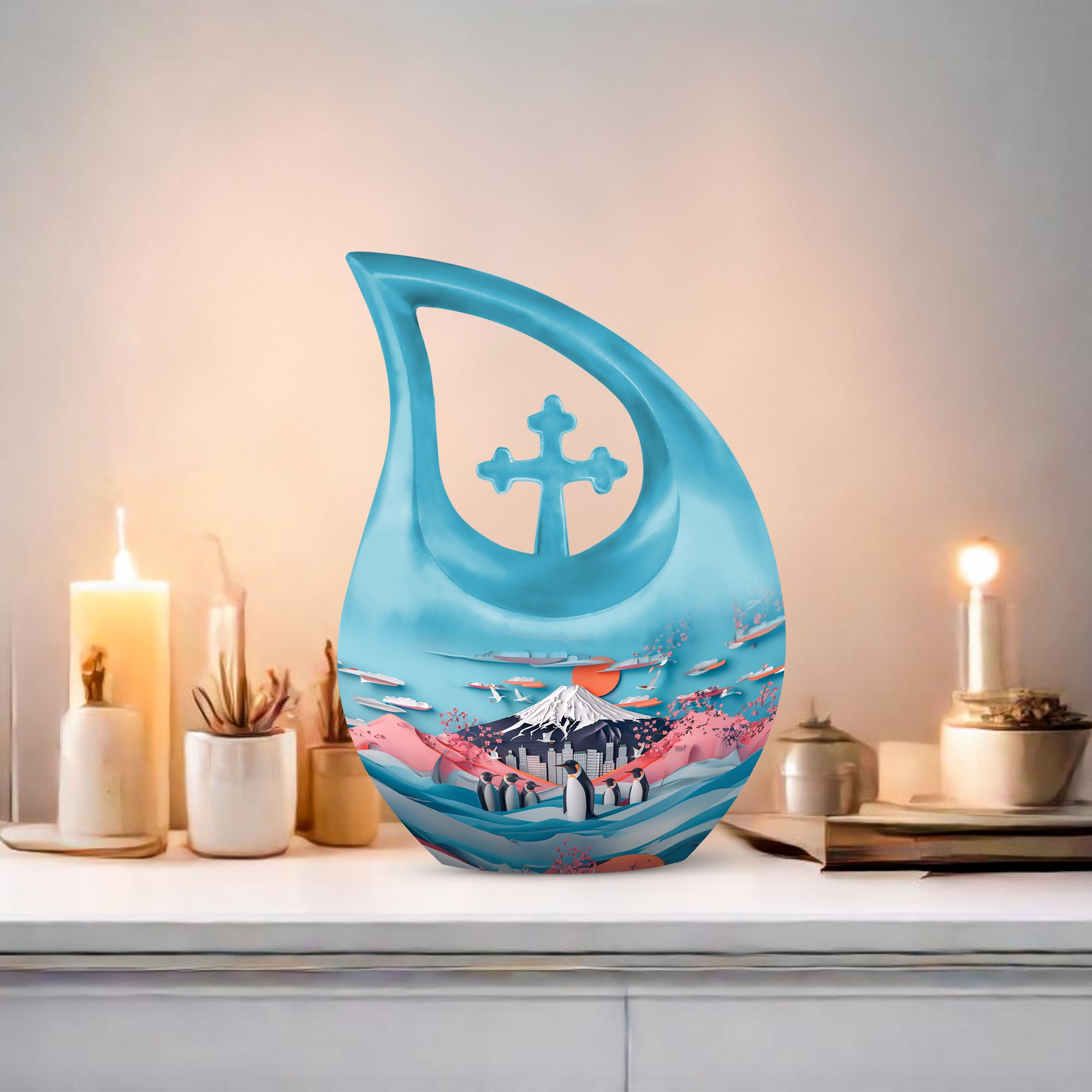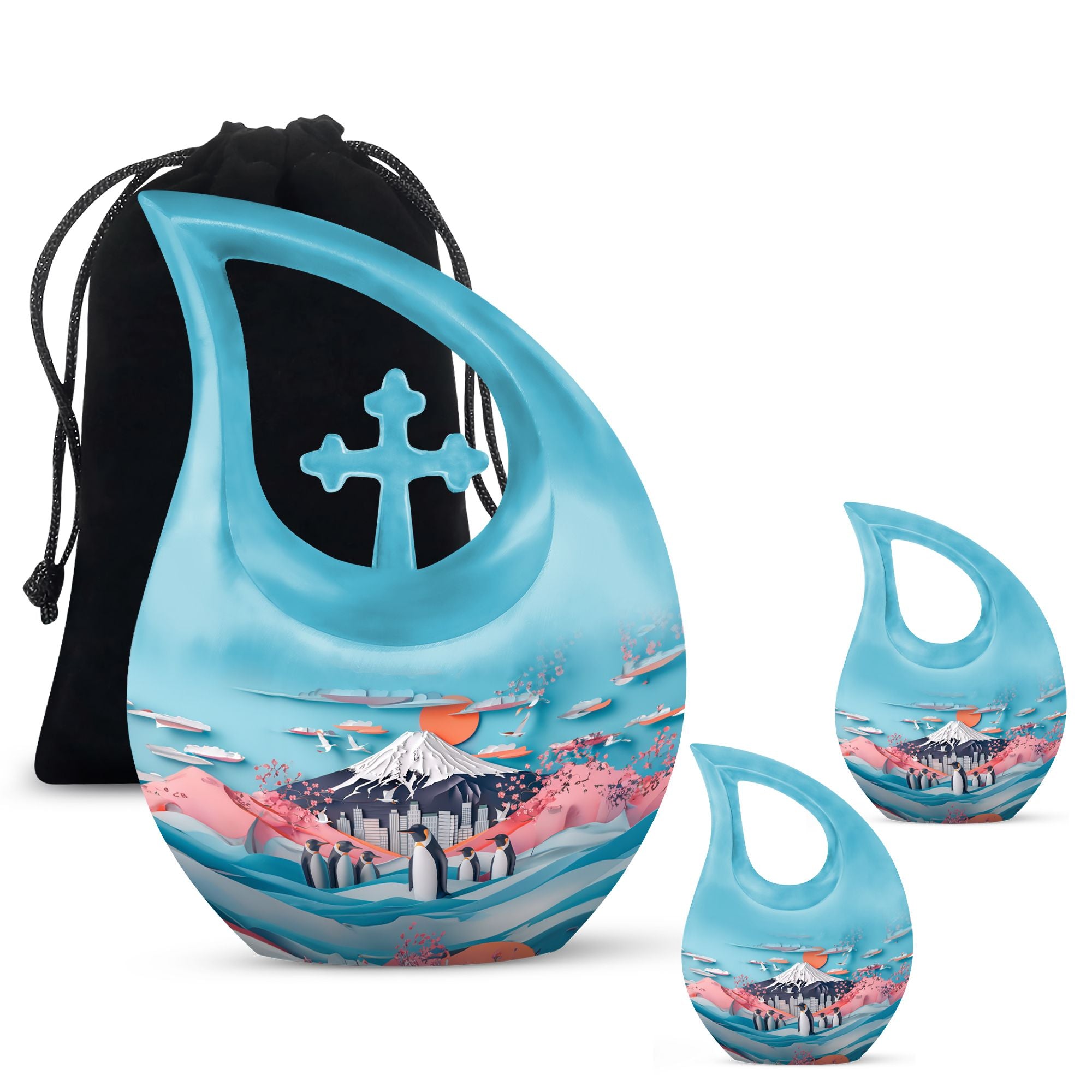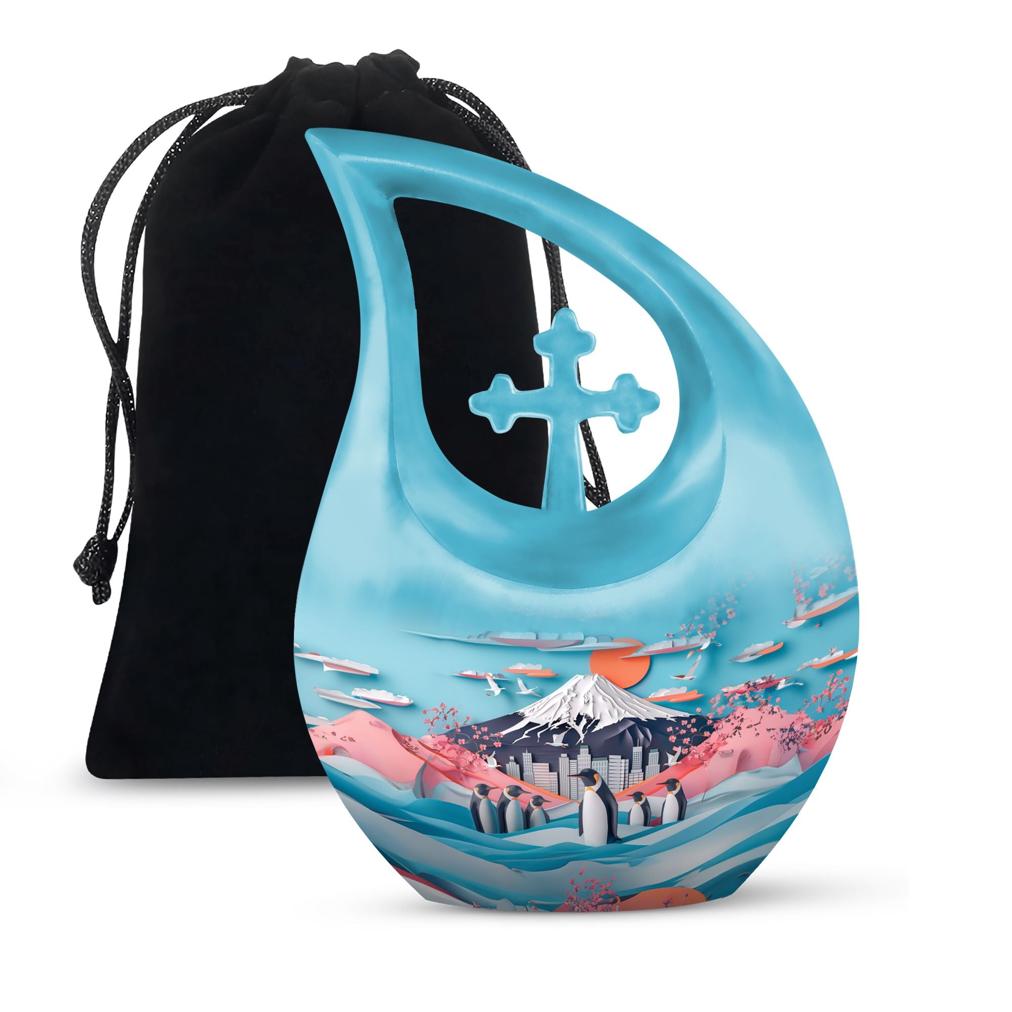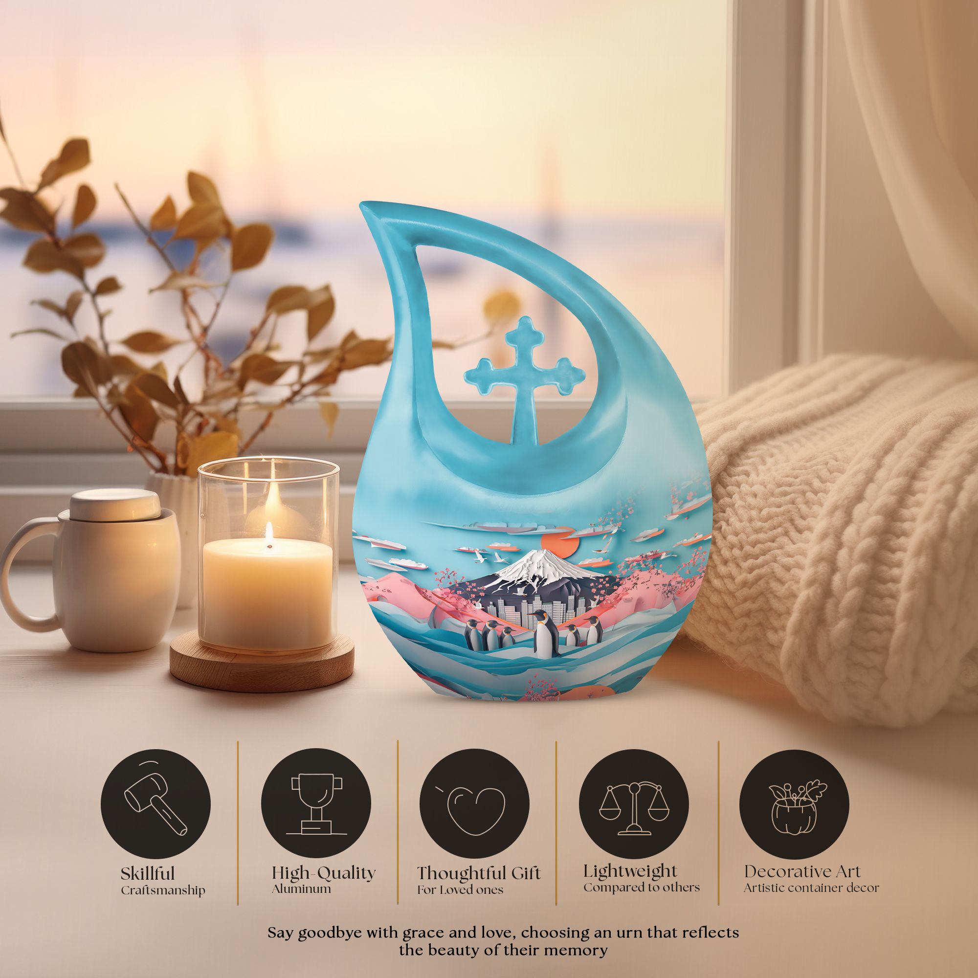 Discover a meaningful, dignified, and respectful resting place for your loved one with our Penguin urn, a medium-sized urn that captures the essence of beauty and solace. This 10-inch tall urn showcases a tasteful 'Cross Drop' theme, reflecting the soft serenity of a cherished memory. Its sturdy aluminium construction guarantees longevity, designed to house up to 200 cubic inches of ash. With a weight of 3.3 pounds, this urn exudes a comfortable presence for a peaceful memento. The package comes complete with a velvet pouch for the containment of ashes. Personalize your urn with engraved names, making it unique and more personal. You're not just getting an urn; you're investing in a memorable keepsake that signifies a dignified farewell. Ideal for those seeking out 'memorial urns' or 'companion urns for ashes'; this urn is one of the best urns that serve as a beautiful reminder. Whether 'cool urns' or 'keepsake memory box’ are your usual search criteria, our Penguin urn fills all categories with grace and reverence.