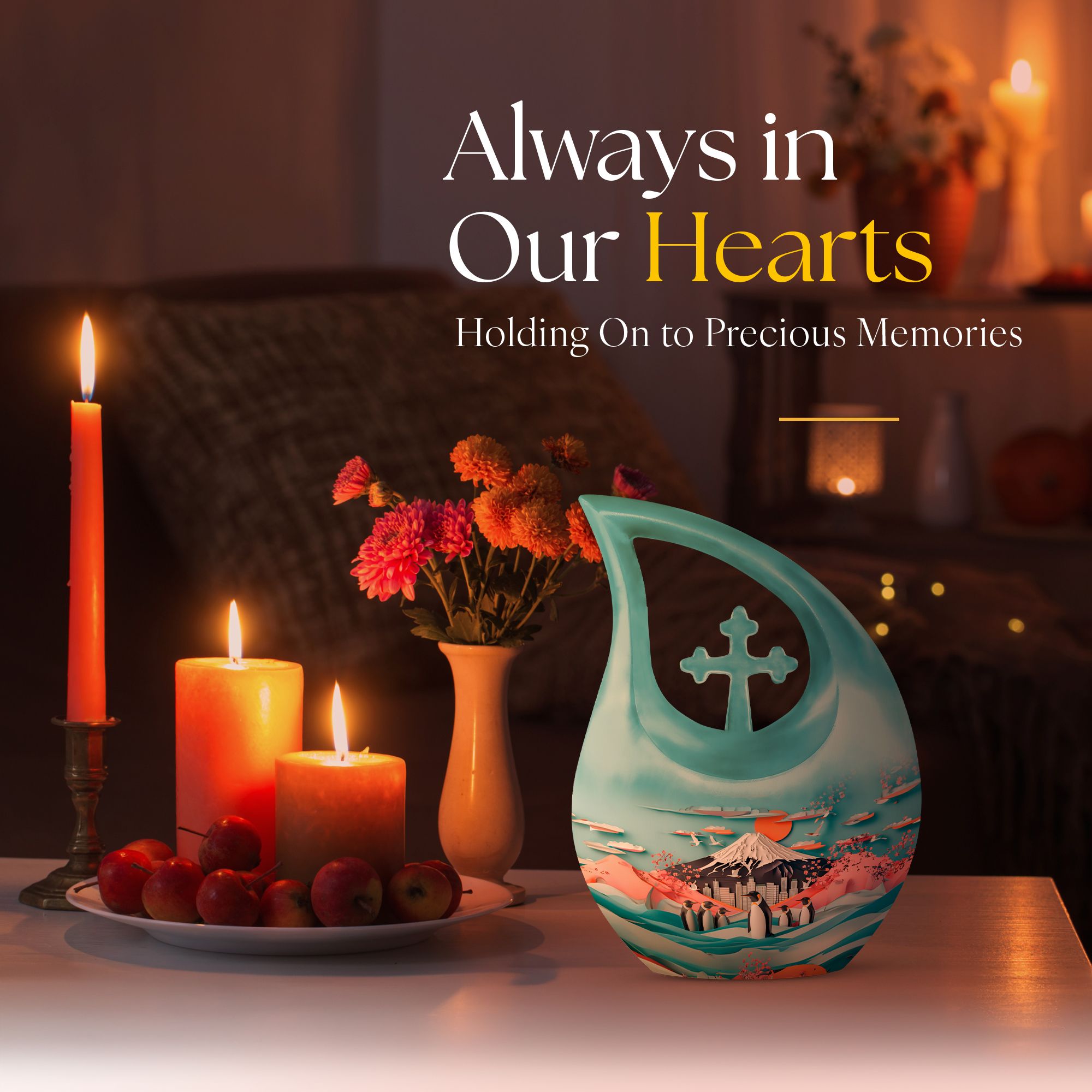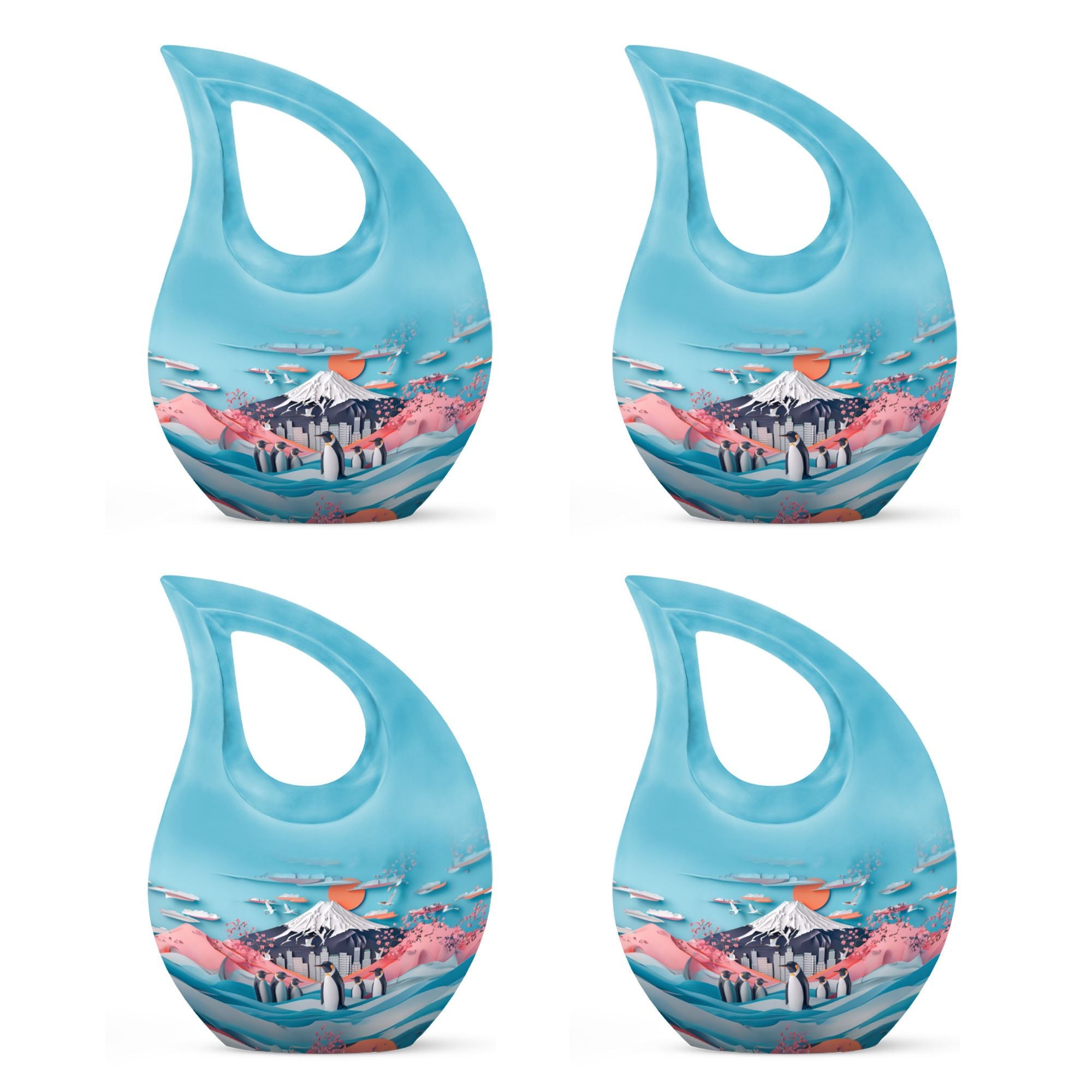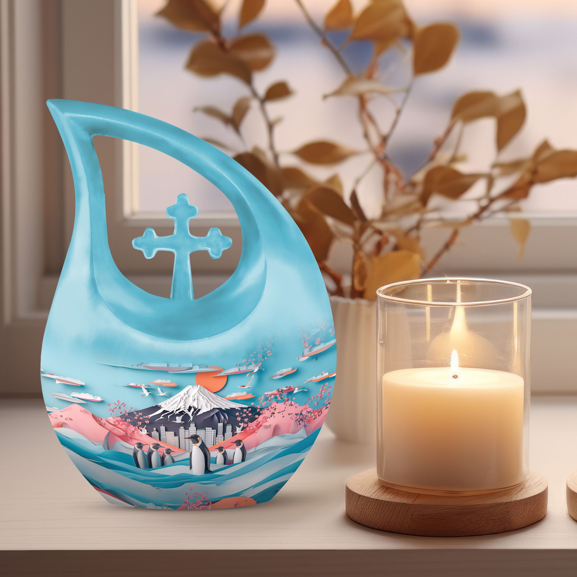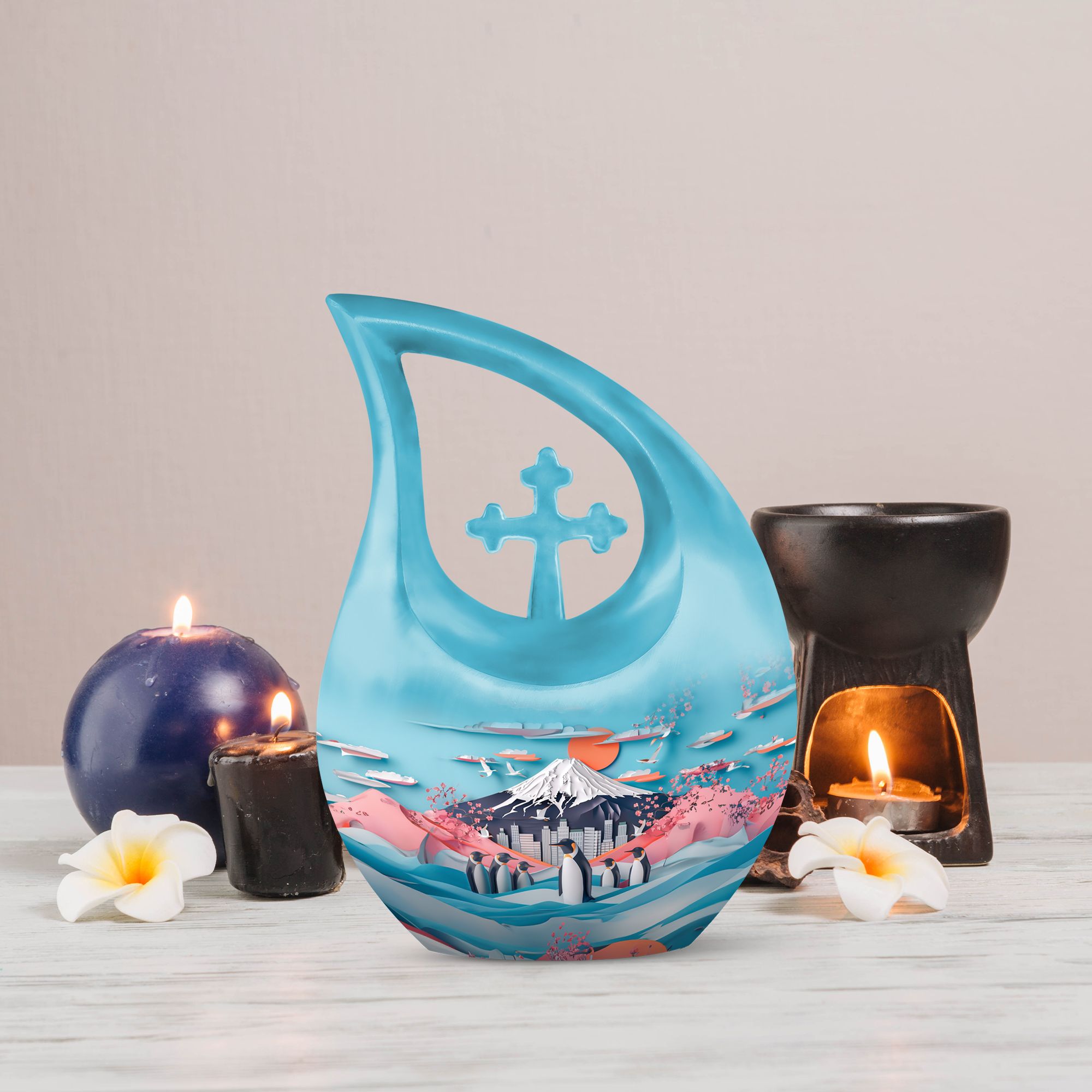 Discover a meaningful, dignified, and respectful resting place for your loved one with our Penguin urn, a medium-sized urn that captures the essence of beauty and solace. This 10-inch tall urn showcases a tasteful 'Cross Drop' theme, reflecting the soft serenity of a cherished memory. Its sturdy aluminium construction guarantees longevity, designed to house up to 200 cubic inches of ash. With a weight of 3.3 pounds, this urn exudes a comfortable presence for a peaceful memento. The package comes complete with a velvet pouch for the containment of ashes. Personalize your urn with engraved names, making it unique and more personal. You're not just getting an urn; you're investing in a memorable keepsake that signifies a dignified farewell. Ideal for those seeking out 'memorial urns' or 'companion urns for ashes'; this urn is one of the best urns that serve as a beautiful reminder. Whether 'cool urns' or 'keepsake memory box’ are your usual search criteria, our Penguin urn fills all categories with grace and reverence.