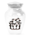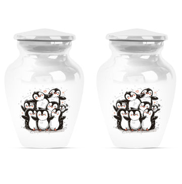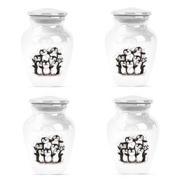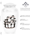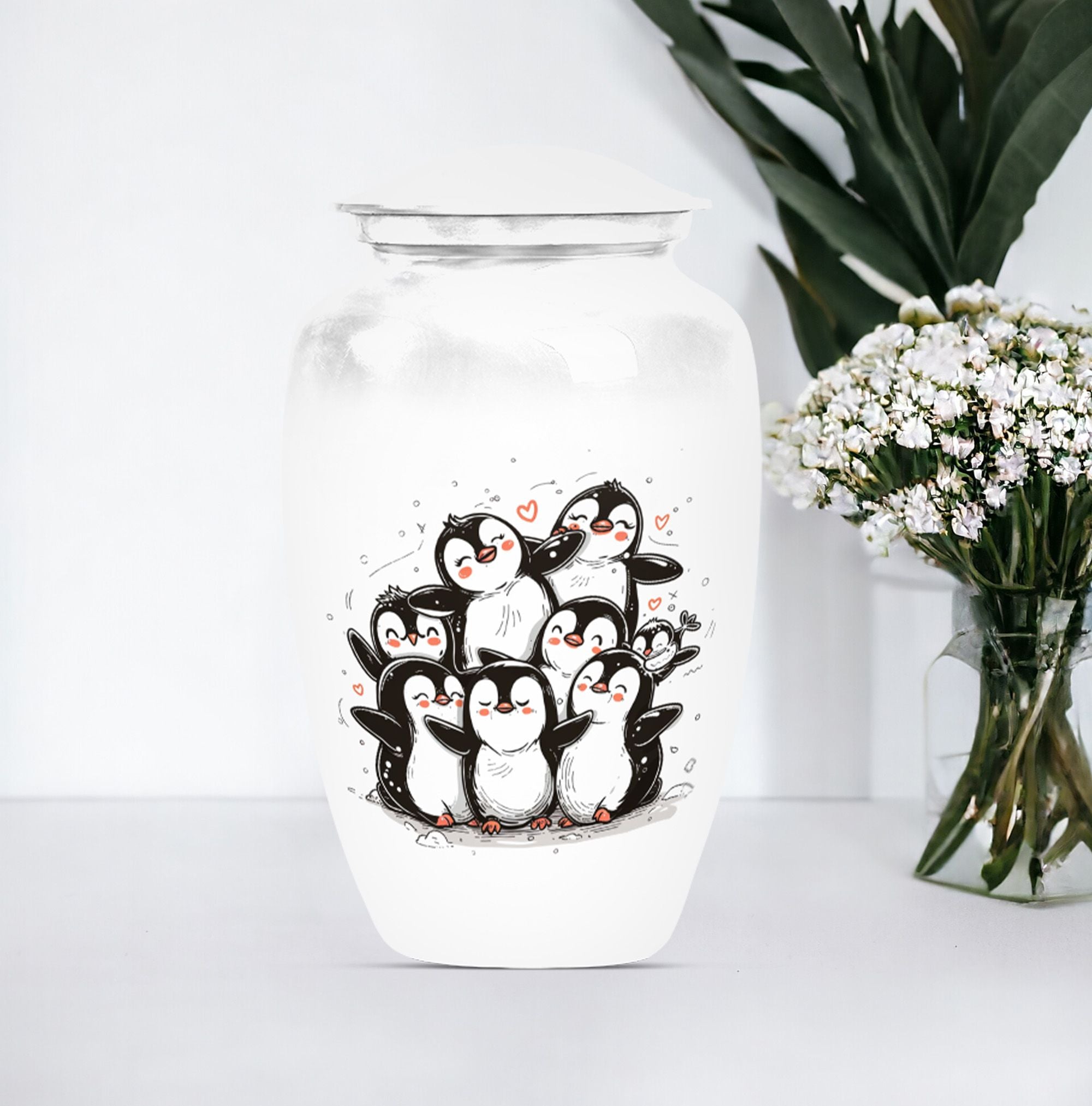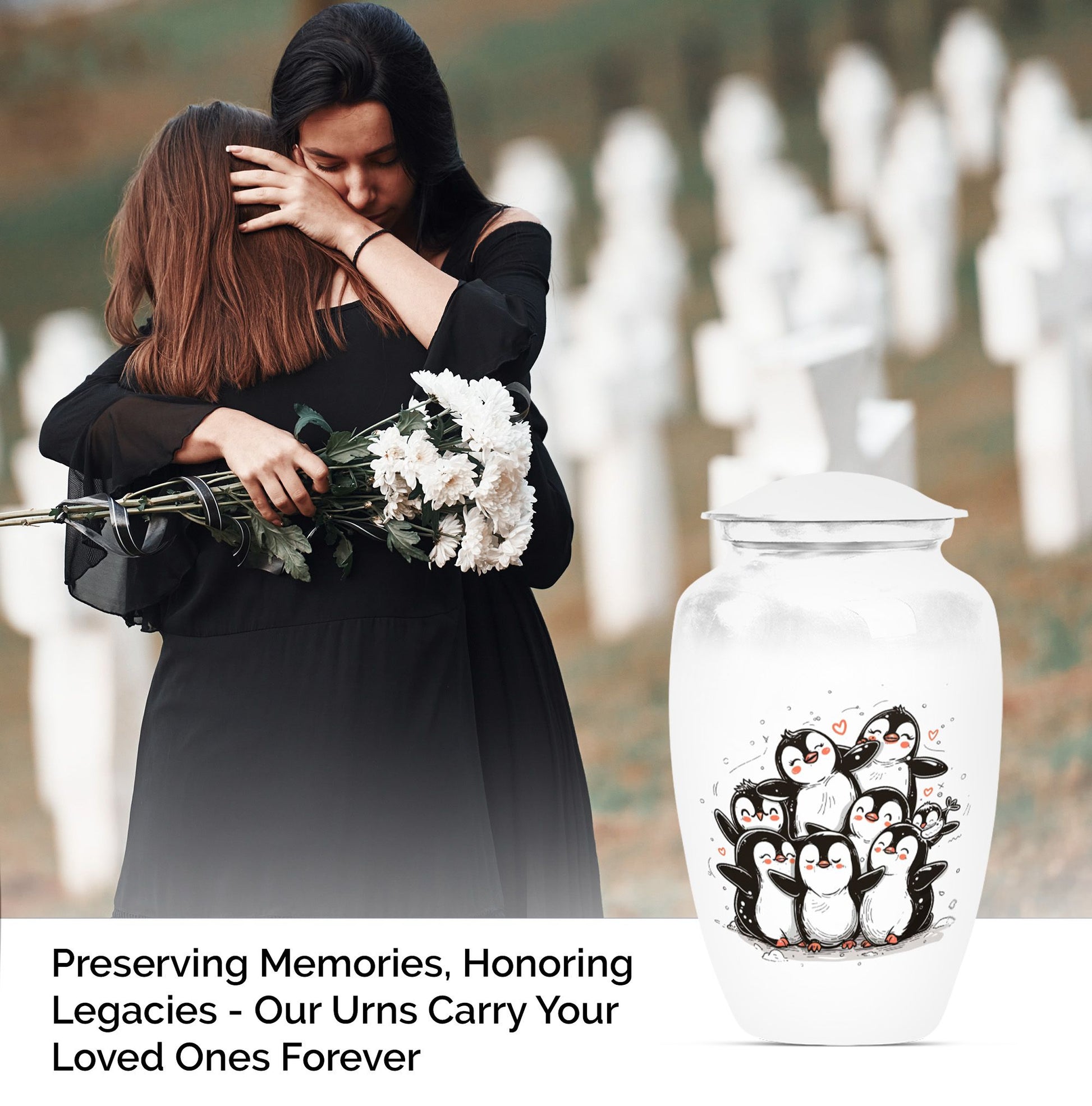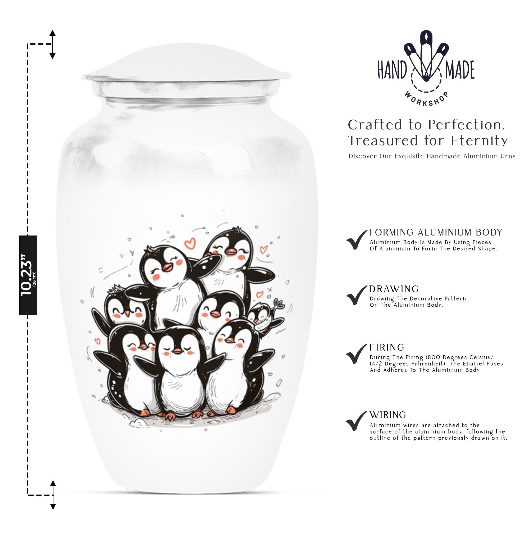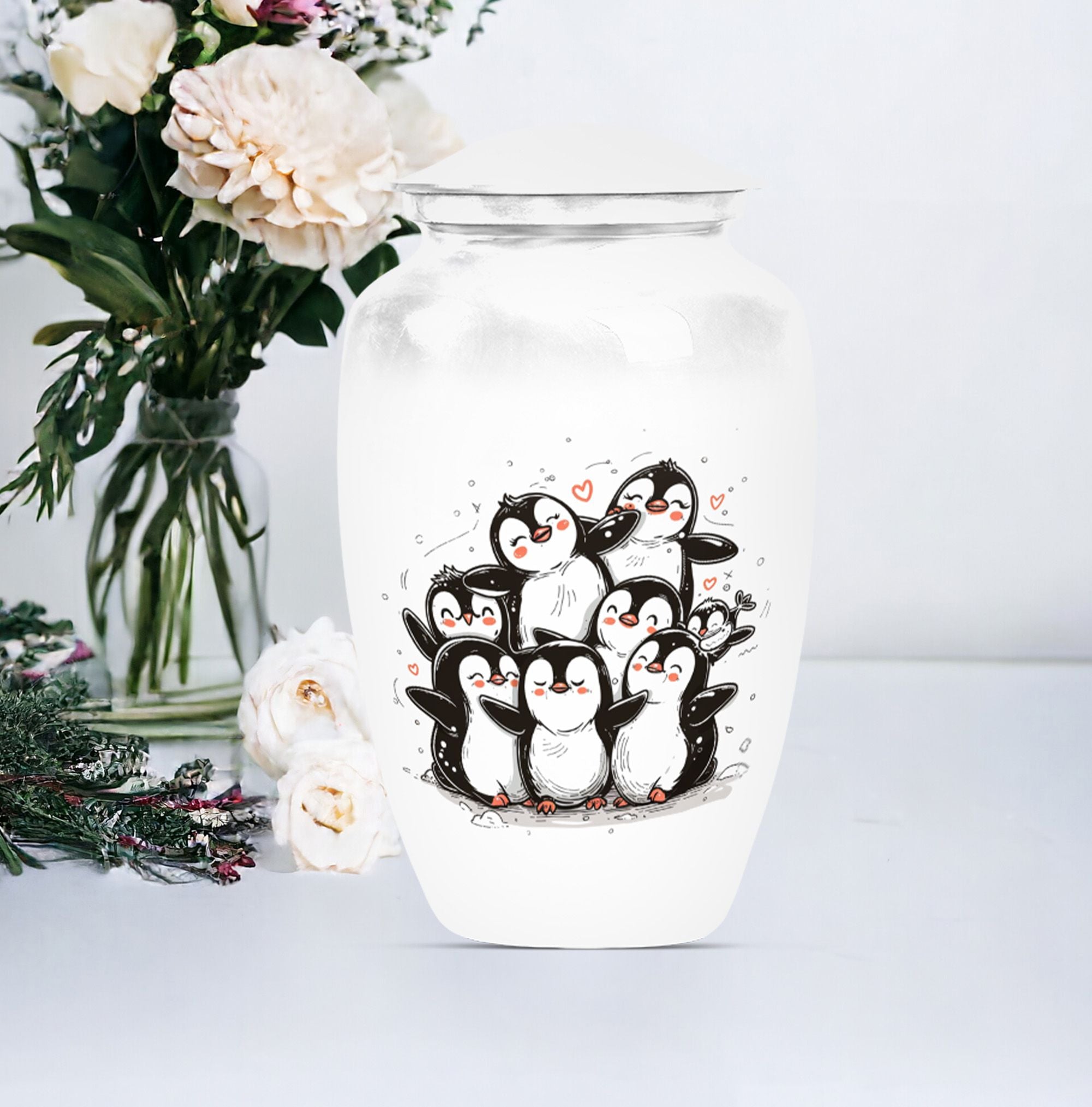 Discover our Penguin Urn, a testament of love and respect, ensuring an eloquent tribute to your loved one's memories. Handcrafted from robust aluminium, this classic cremation urn stands 10 inches in height, and with a hefty weight of 3.3 pounds, it ensures stability wherever it's placed. With an ample capacity of 200 cubic inches, it store adult human ashes with utmost dignity. Its theme is embossed with elegant butterflies, providing a serene, calming aura. The package comes complete with a soft velvet pouch, careful containment and transport of ashes. Its customization features leave room for reflective personal touches, allowing you to engrave names and create a special tribute. Larger than typical urns, this slates itself as a noteworthy addition to your household. Ideal for those seeking cremation urns for adult female ashes or a modern looking urn for a home shrine. However, the Penguin Urn's appeal is not limited: It transcends any ash containment needs with its universal design. Keep their memory alive with a housing as unique and beautiful as they were.