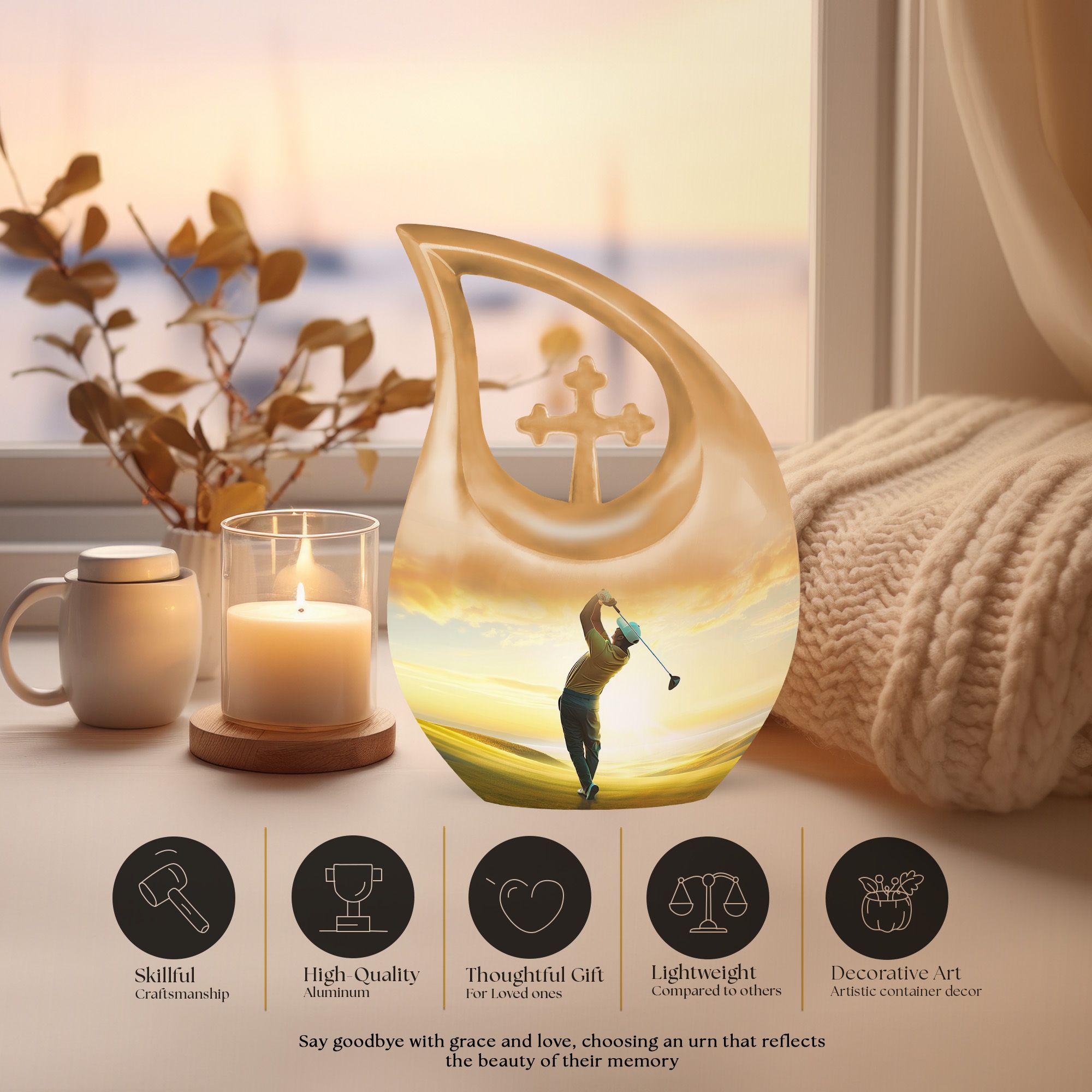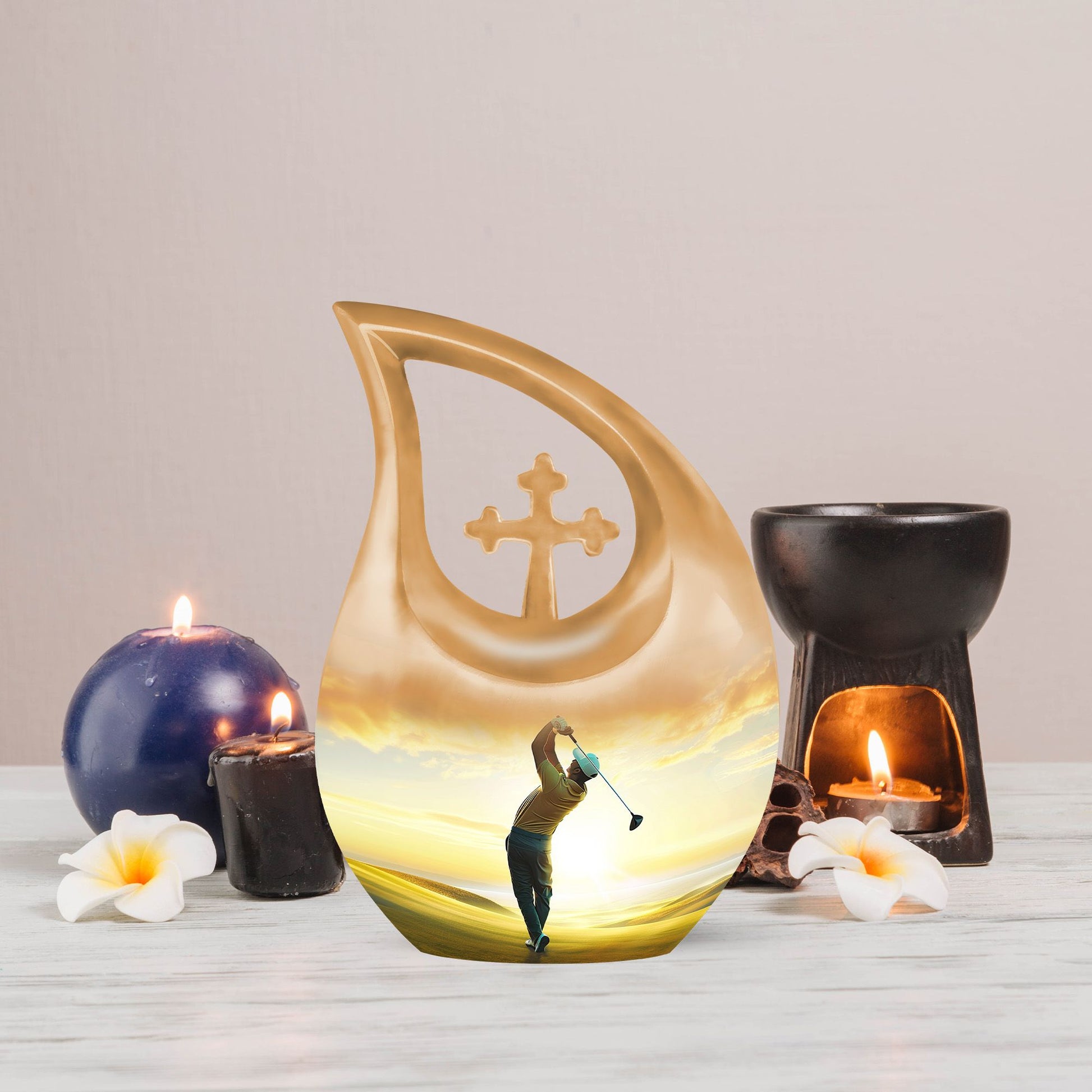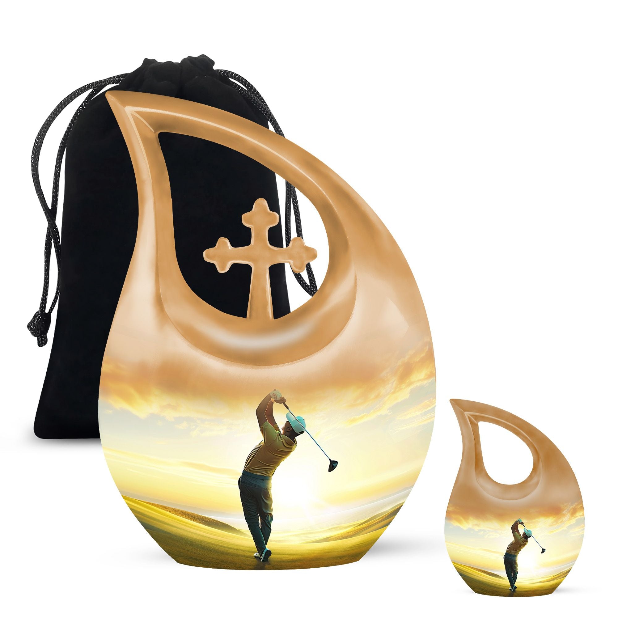 Discover a remarkable way to keep the memories alive with this themed Golf Urn, a distinctive variant within the realm of memorial urns. This aluminium made large urn meticulously weighs 3.3 pounds and sports a stunning height of 10 inches, effectively accommodating 200 cubic inches capacity. Take peace in the poignant 'Cross Drop' URN DESIGN, which displays an exceptional attention to detail. The size, measuring a remarkable 10 inch, ensures a substantial volume. This item, shipped complete with a velvet pouch for containment of ashes, adds an extra layer of reverence to the complete package. Delight in the ability to personalize your keepsake with an engraving, adding an intimate touch to this final resting place. Ranked high in the Large Urns category, you'll sure to appreciate the unique craftsmanship of this Golf Urn, also known as a Garden Urn or a Keepsake Cremation Urn. Notice: Personalized Urns for human ashes are consciously designed for the purpose of offering respect while evoking tranquillity.