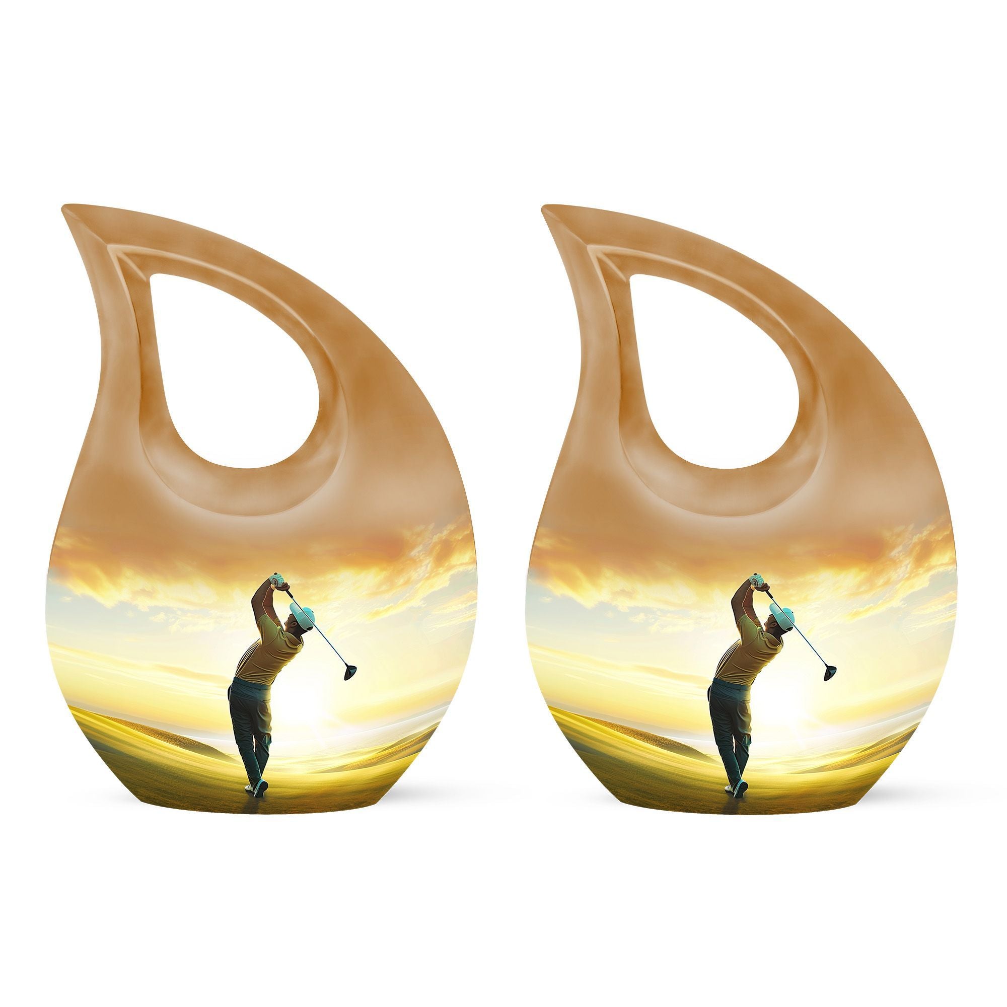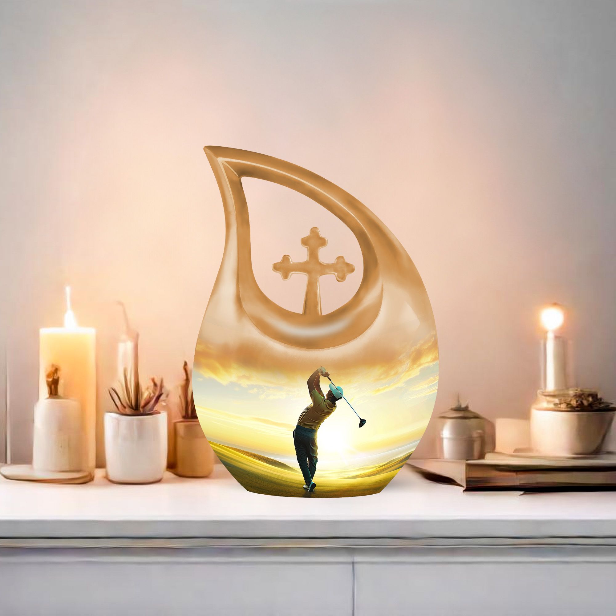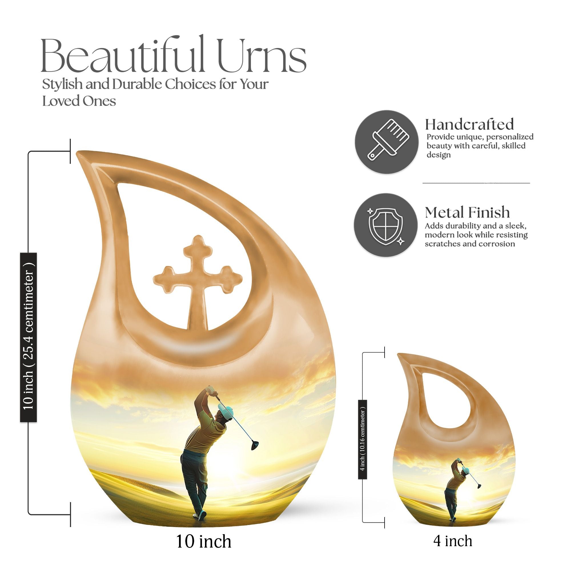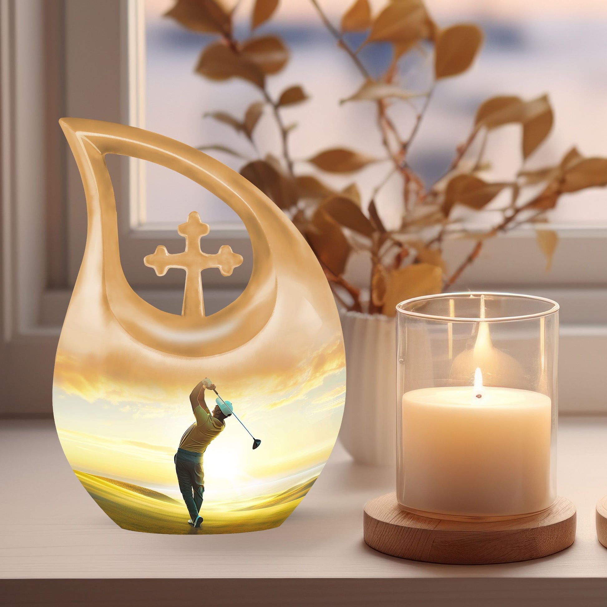 Discover a remarkable way to keep the memories alive with this themed Golf Urn, a distinctive variant within the realm of memorial urns. This aluminium made large urn meticulously weighs 3.3 pounds and sports a stunning height of 10 inches, effectively accommodating 200 cubic inches capacity. Take peace in the poignant 'Cross Drop' URN DESIGN, which displays an exceptional attention to detail. The size, measuring a remarkable 10 inch, ensures a substantial volume. This item, shipped complete with a velvet pouch for containment of ashes, adds an extra layer of reverence to the complete package. Delight in the ability to personalize your keepsake with an engraving, adding an intimate touch to this final resting place. Ranked high in the Large Urns category, you'll sure to appreciate the unique craftsmanship of this Golf Urn, also known as a Garden Urn or a Keepsake Cremation Urn. Notice: Personalized Urns for human ashes are consciously designed for the purpose of offering respect while evoking tranquillity.