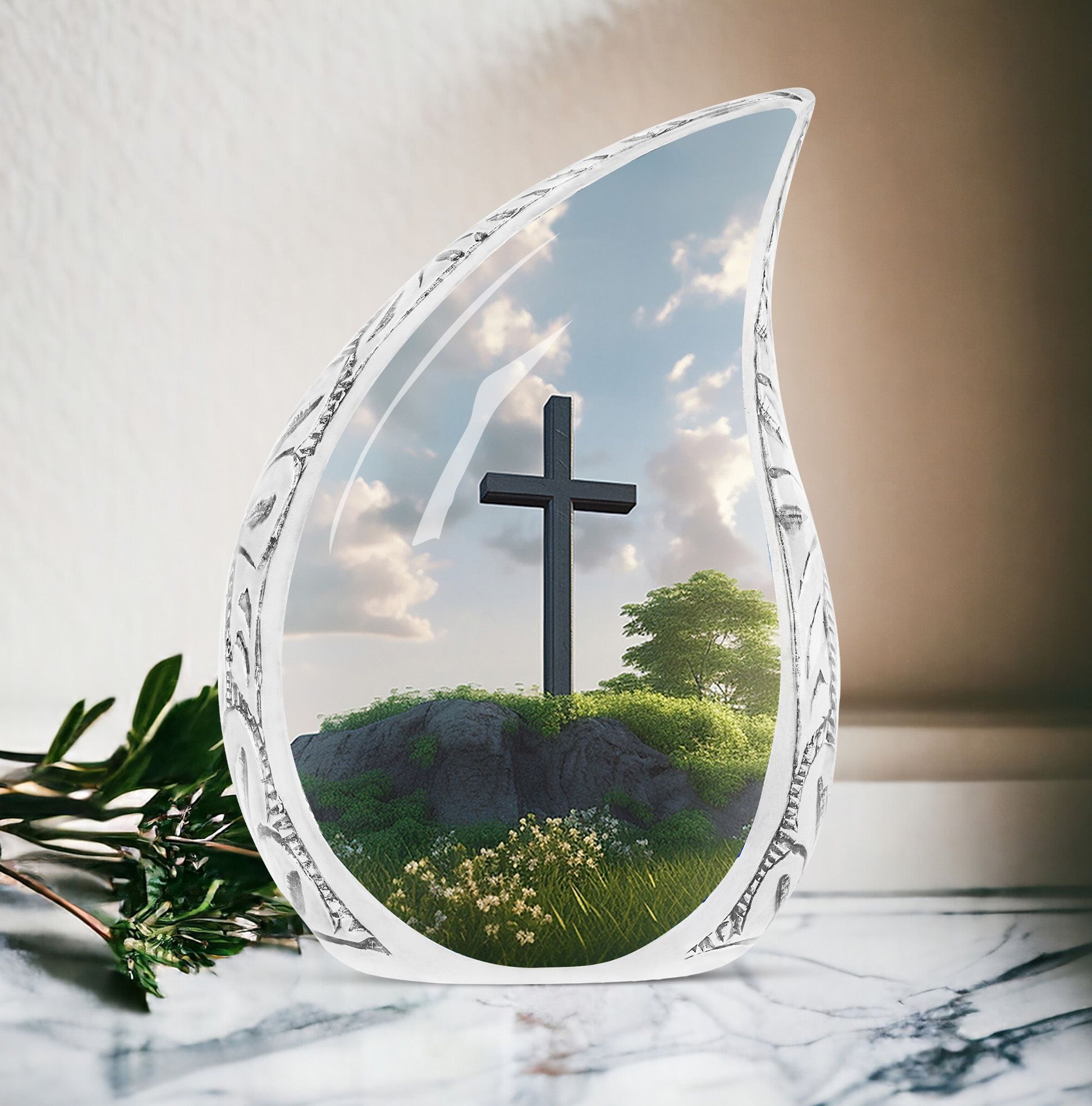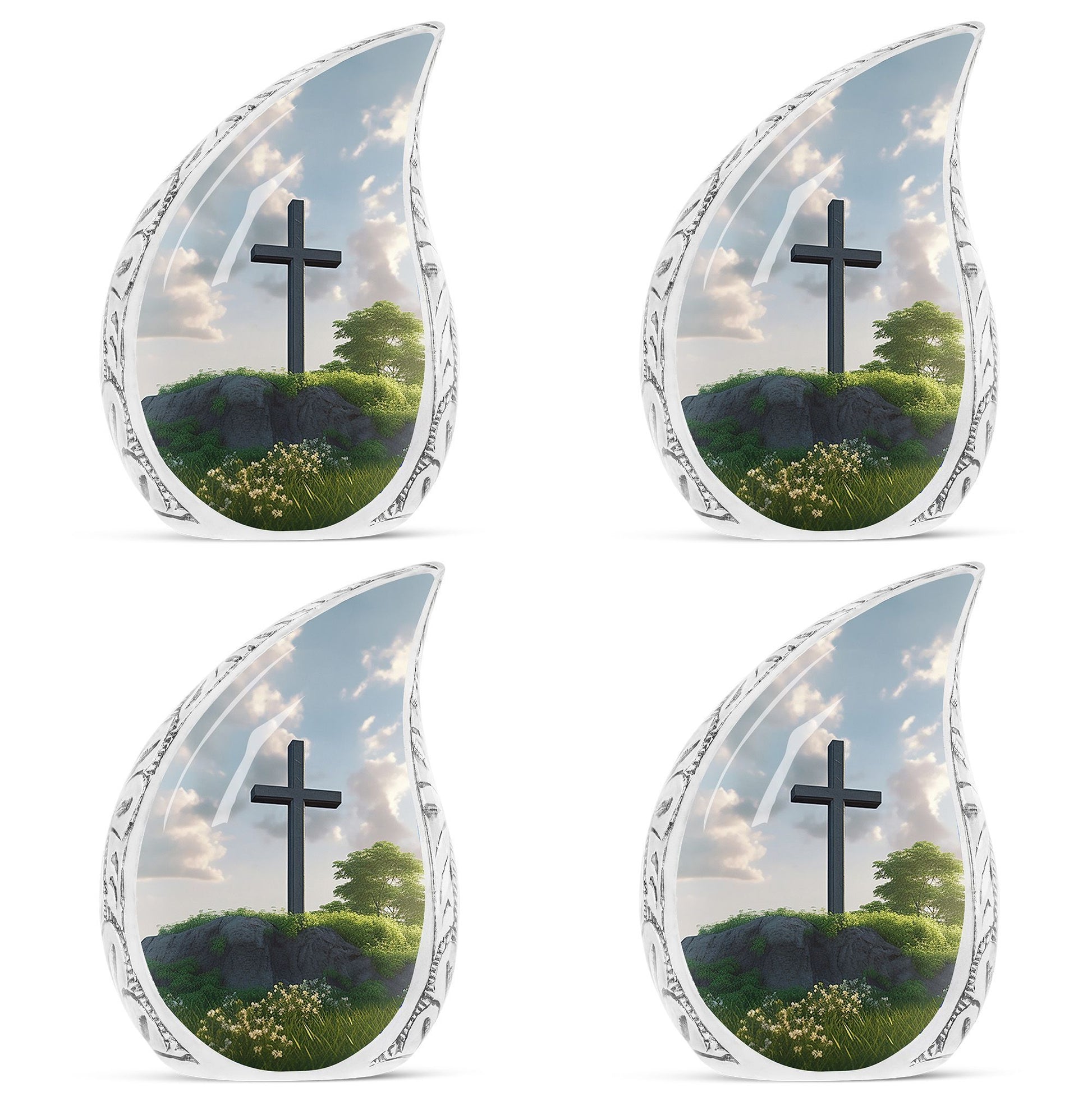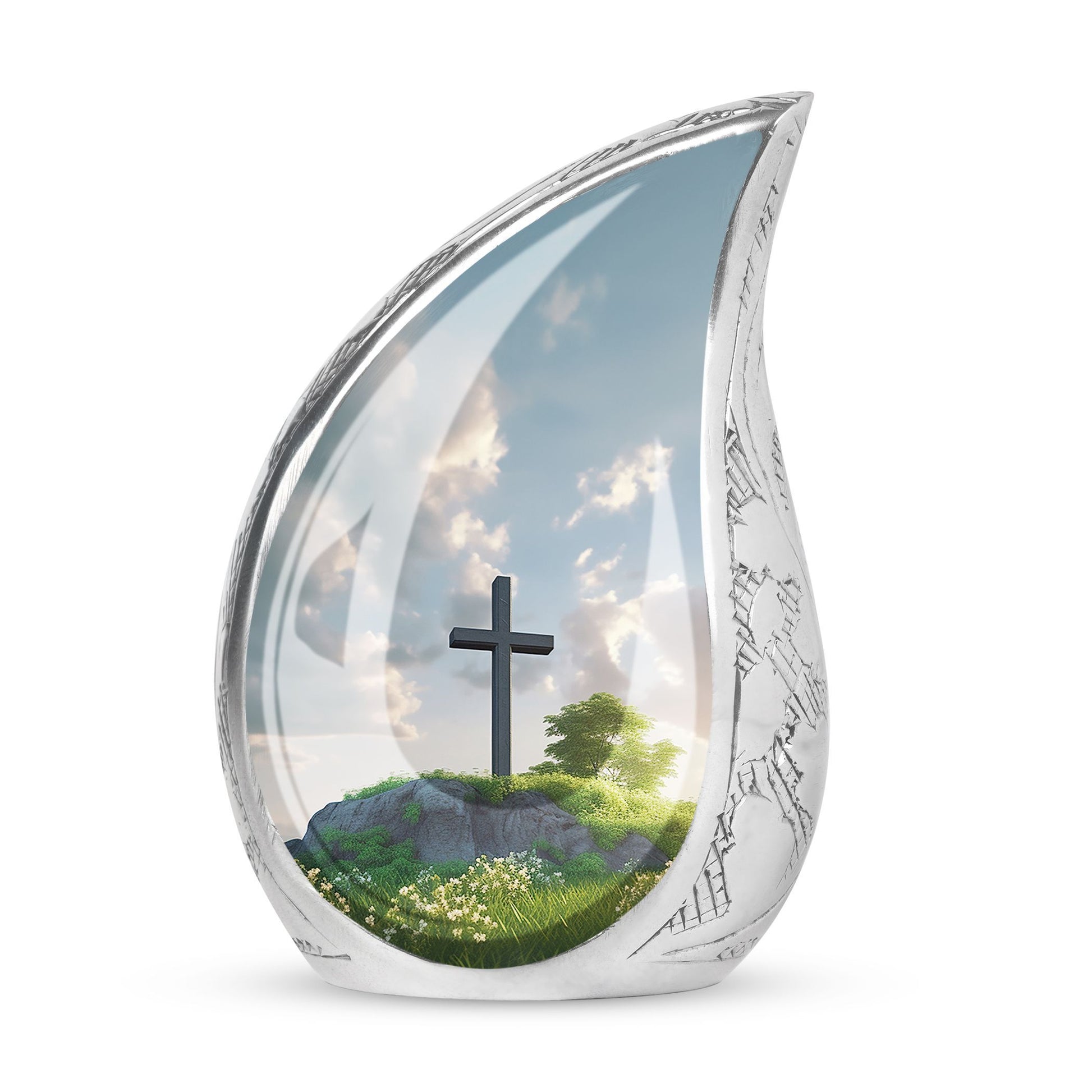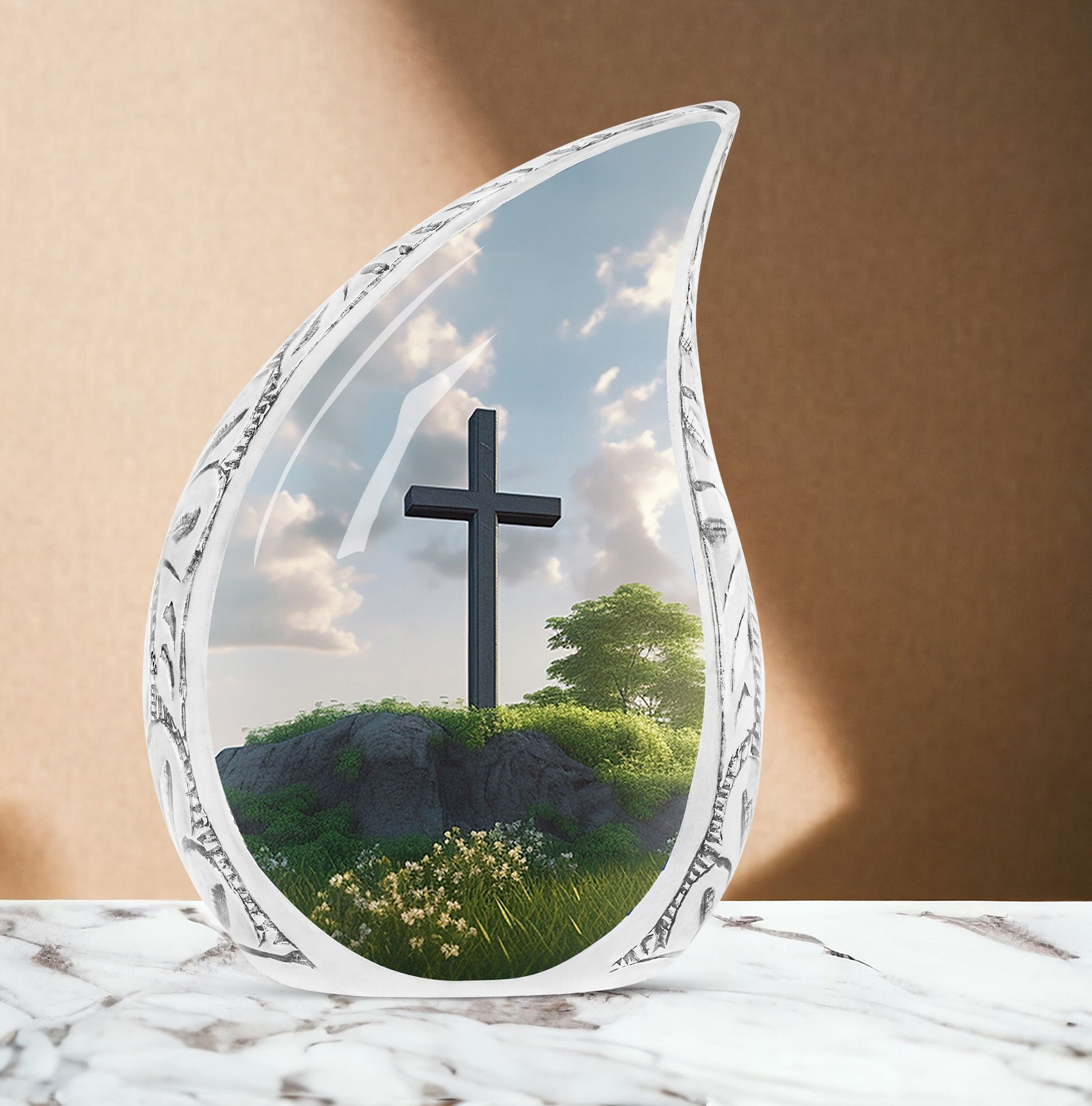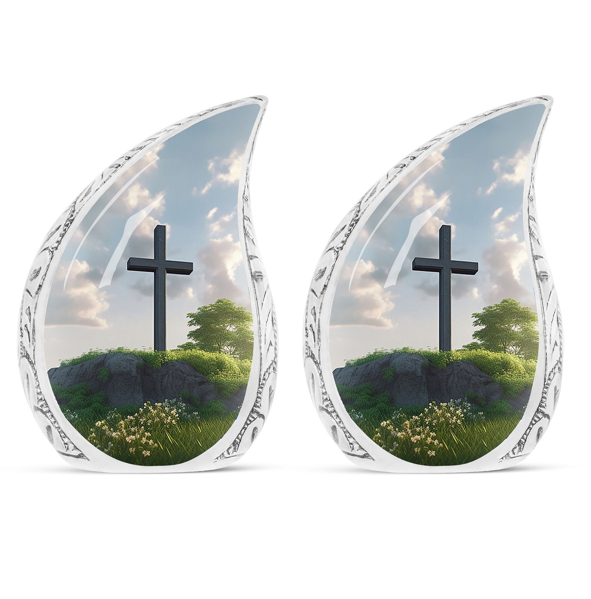 Honor departed souls with our distinct Jesus Christ cross urn, an elegant piece in our memorial ceremony supplies. Made from sturdy aluminum, this large-sized urn flaunts a weight of 3.3 pounds and stands tall at 10 inches in height. The 3-inch classic urn design offers substantial space with its 200 cubic inch capacity, ensuring a secure resting place for your cherished one's ashes. The cremation urn comes packaged with a soft, velvet pouch designed for dignified containment and transport. Personalize this burial urn with engraved names. This symbolism of love and farewell makes it stand out among common metal cremation urns for human ashes. Perfectly suited for adults, it underscores the importance of remembrance and mourning rites in our lives. The thoughtfulness of personalized urns for human ashes goes beyond simple possession, turning it into a lasting tribute.