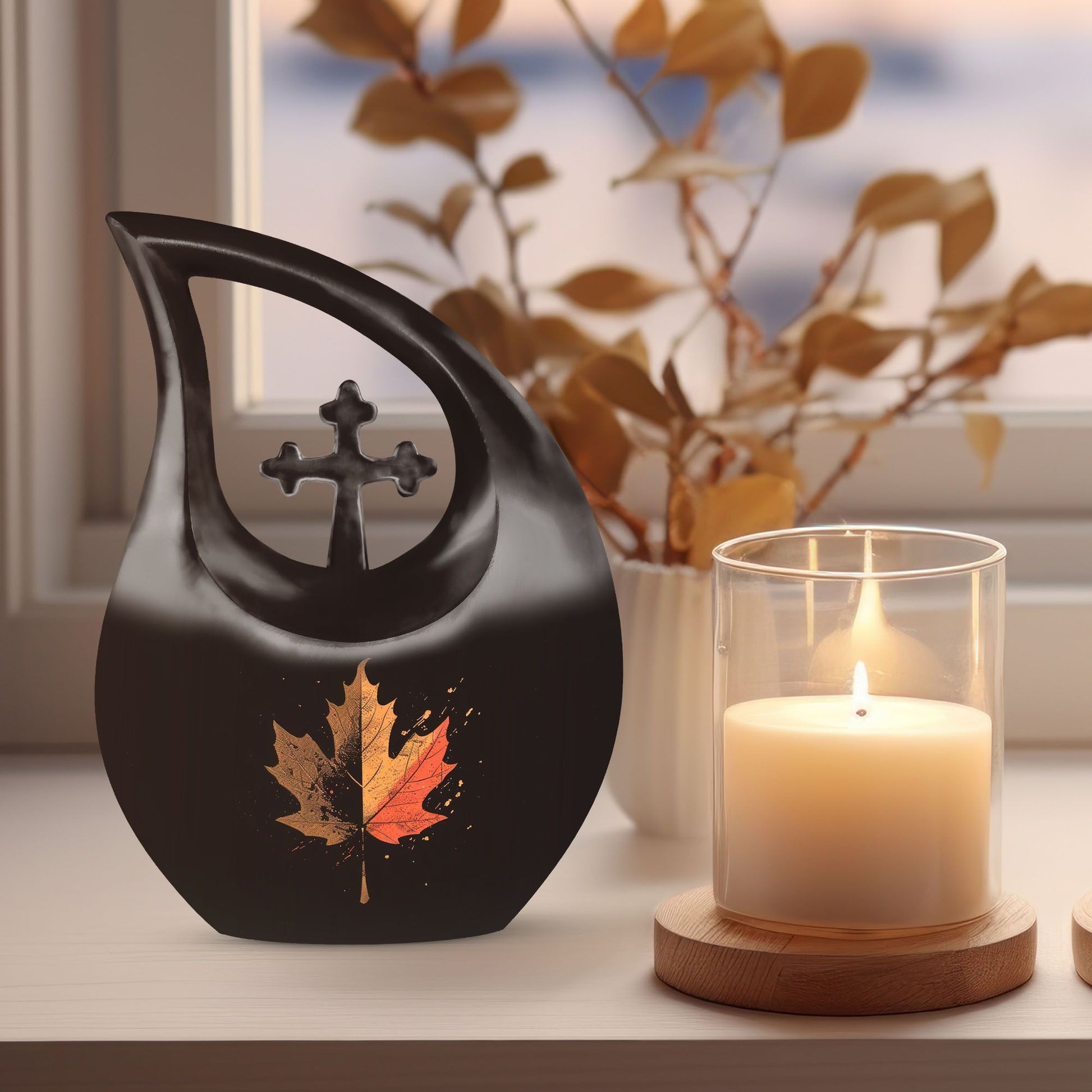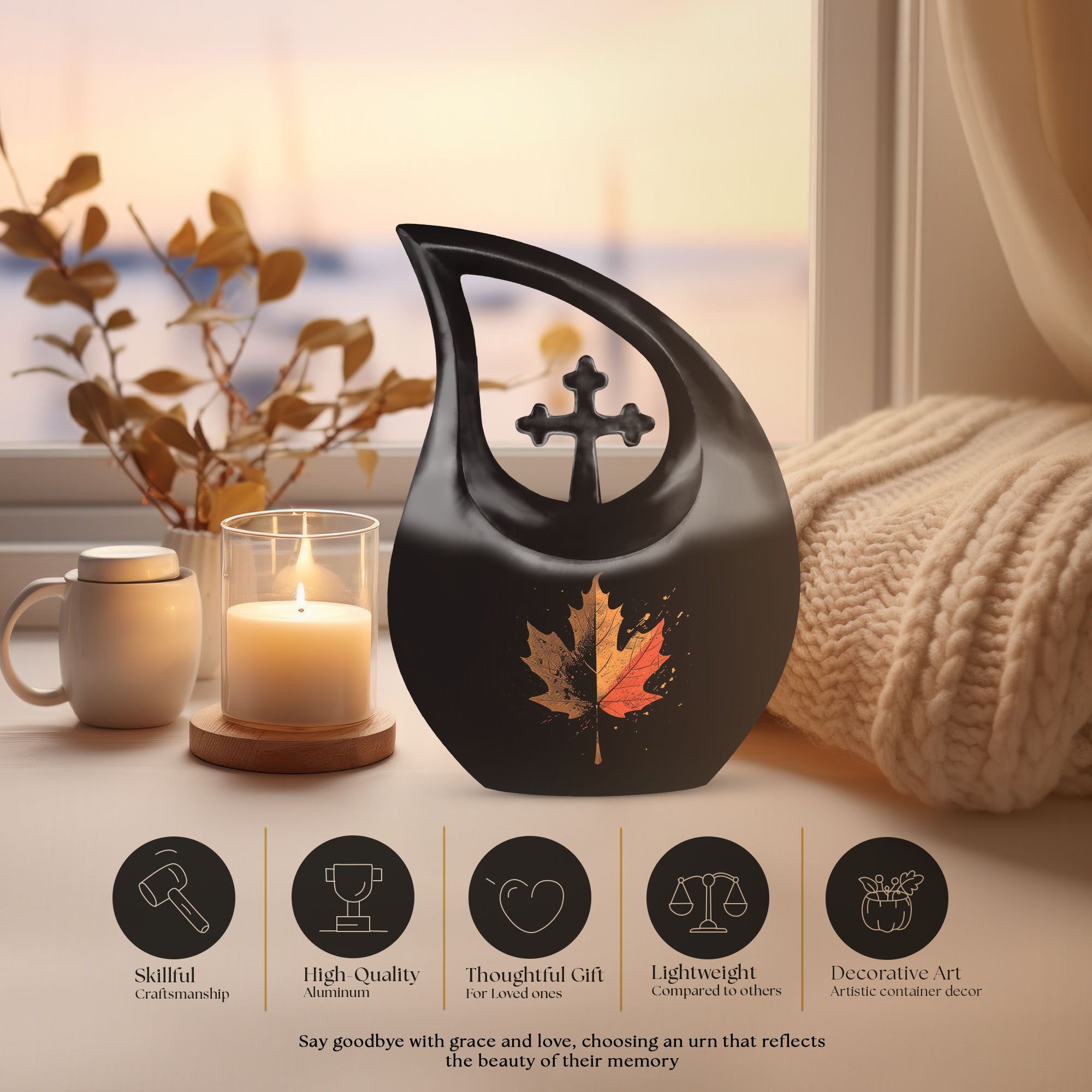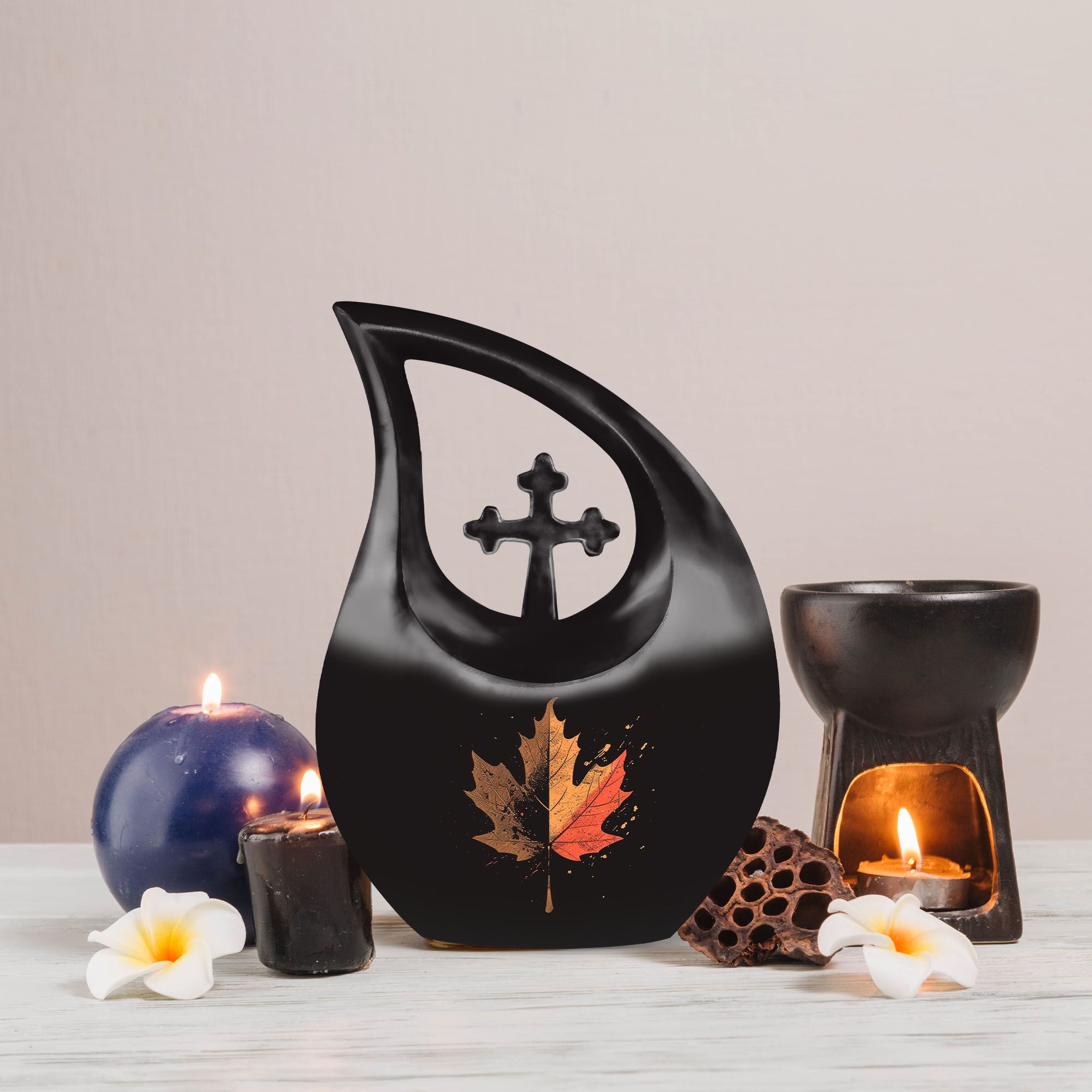 Cherish the memory of a beloved family member with this exquisite Mapple Leaf Urn. This large-sized, 10-inch, aluminium urn has a distinctive Cross Drop theme that fosters a feeling of peace and tranquility. Weighing a solid 3.3 pounds and with a capacity to hold up to 200 cubic inches of ashes, this urn is as purposeful as it is aesthetic. One of the features that sets it apart is the option to personalize it through engraved names, allowing a unique touch to your memorial tribute. The urn comes complete with a velvet pouch, providing a respectful containment for the ashes of your dear one. Ideal for those searching for ‘Memorial Urns’, ‘Remembrance Urns For Ashes’, ‘Urns For Angels’, ‘Modern Urns For Ashes’, or a 'Custom Mom Urn', this Mapple Leaf Urn is a striking symbol of remembrance, offering a touching way to honor and remember your loved one.