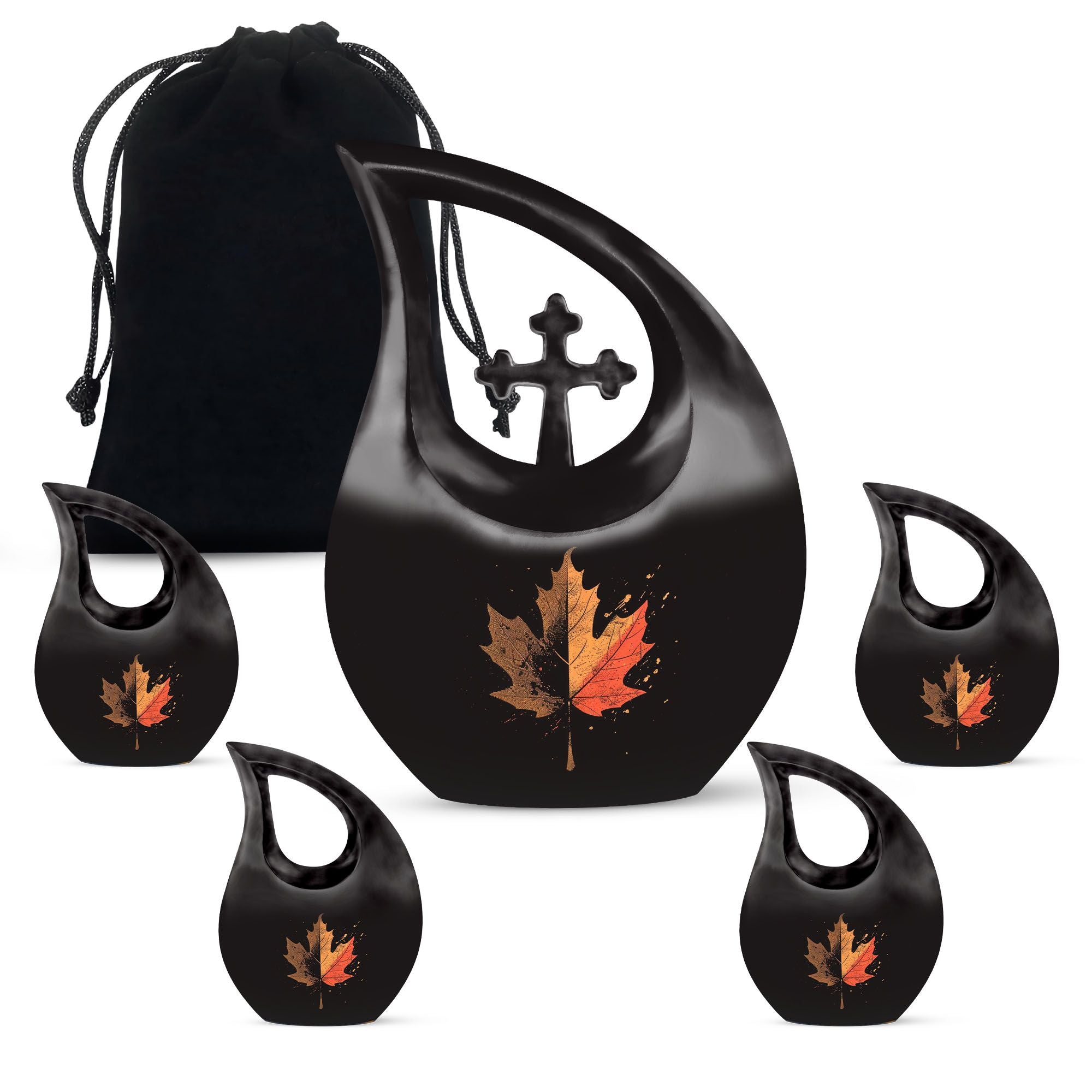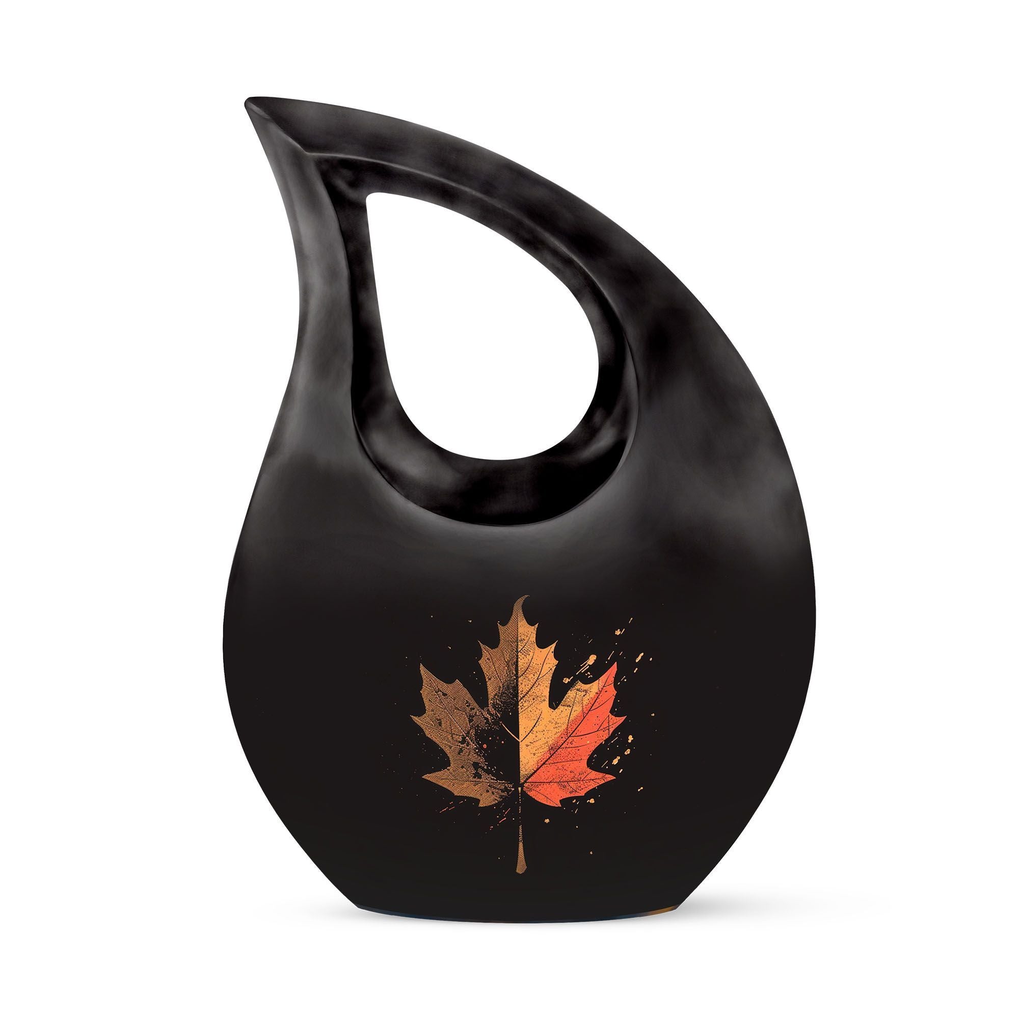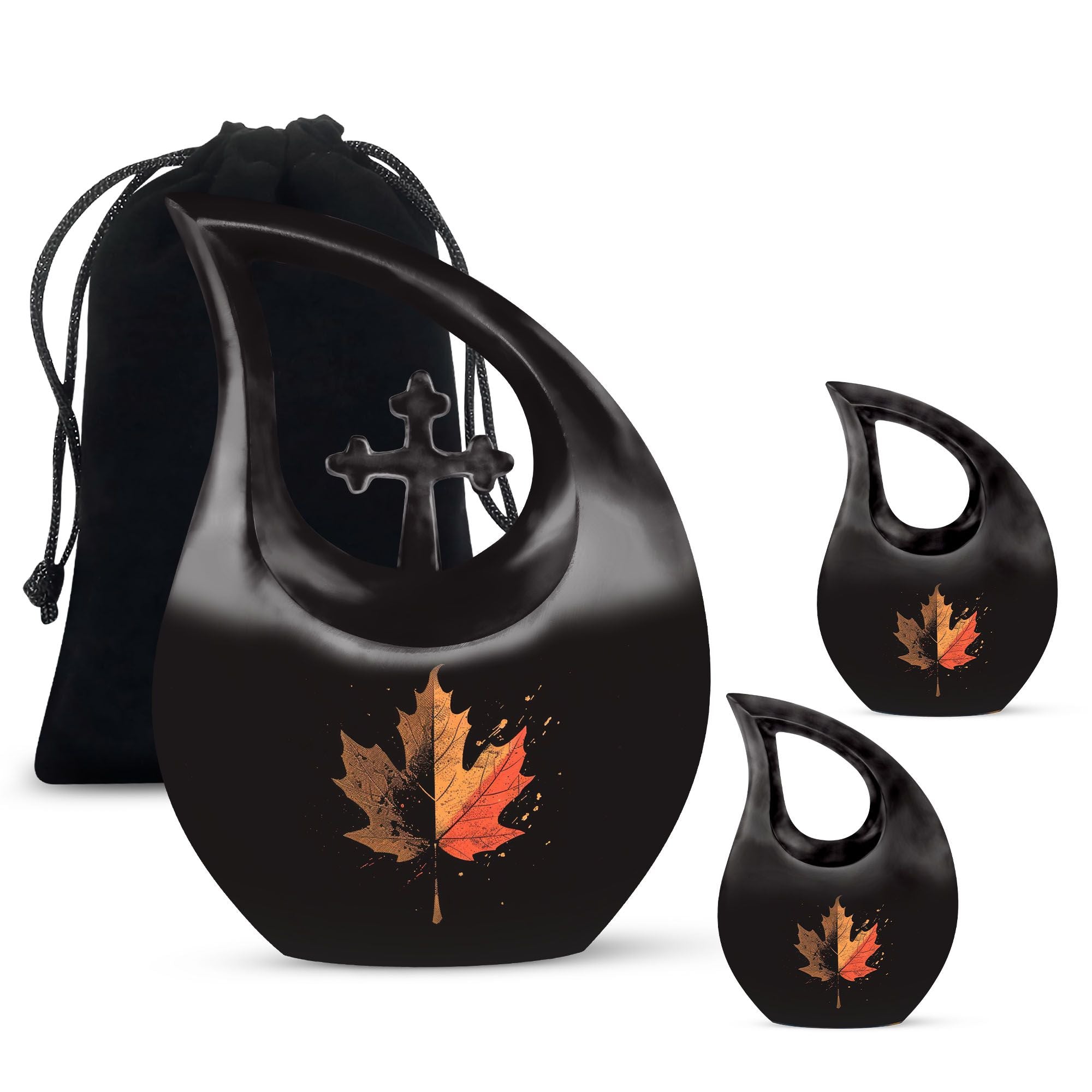 Cherish the memory of a beloved family member with this exquisite Mapple Leaf Urn. This large-sized, 10-inch, aluminium urn has a distinctive Cross Drop theme that fosters a feeling of peace and tranquility. Weighing a solid 3.3 pounds and with a capacity to hold up to 200 cubic inches of ashes, this urn is as purposeful as it is aesthetic. One of the features that sets it apart is the option to personalize it through engraved names, allowing a unique touch to your memorial tribute. The urn comes complete with a velvet pouch, providing a respectful containment for the ashes of your dear one. Ideal for those searching for ‘Memorial Urns’, ‘Remembrance Urns For Ashes’, ‘Urns For Angels’, ‘Modern Urns For Ashes’, or a 'Custom Mom Urn', this Mapple Leaf Urn is a striking symbol of remembrance, offering a touching way to honor and remember your loved one.