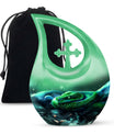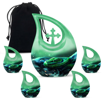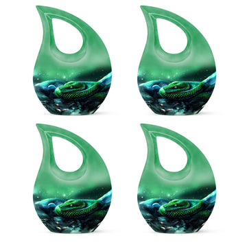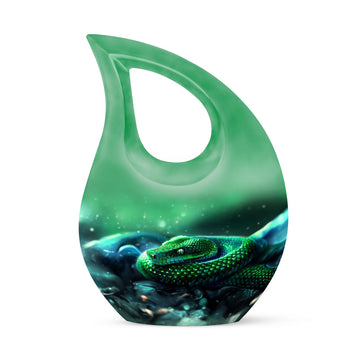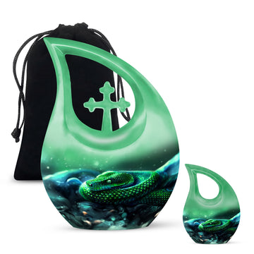 Honor the memory of your loved one with our high-quality Snake Urn. This large 10-inch urn is made of enduring aluminium and weighs a sturdy 3.3 pounds, ensuring it remains a lasting tribute. It uniquely combines the 'Cross Drop' and 'Snake' themes, creating a modern yet respectful remembrance item that stands out from typical memorial urns. The urn has a significant capacity of 200 cubic inches, accommodating a substantial amount of ashes. Included with your purchase is a plush velvet pouch, providing a dignified containment for the remains. Furthermore, our Custom Mom Urn offers personalization options, allowing you to engrave names and keep memories alive. This feature makes the item an ideal choice for those seeking memorial items such as Remembrance Urns For Ashes, Urns for Angels, or modern urns for ashes. Let artifacts honor your loved one.