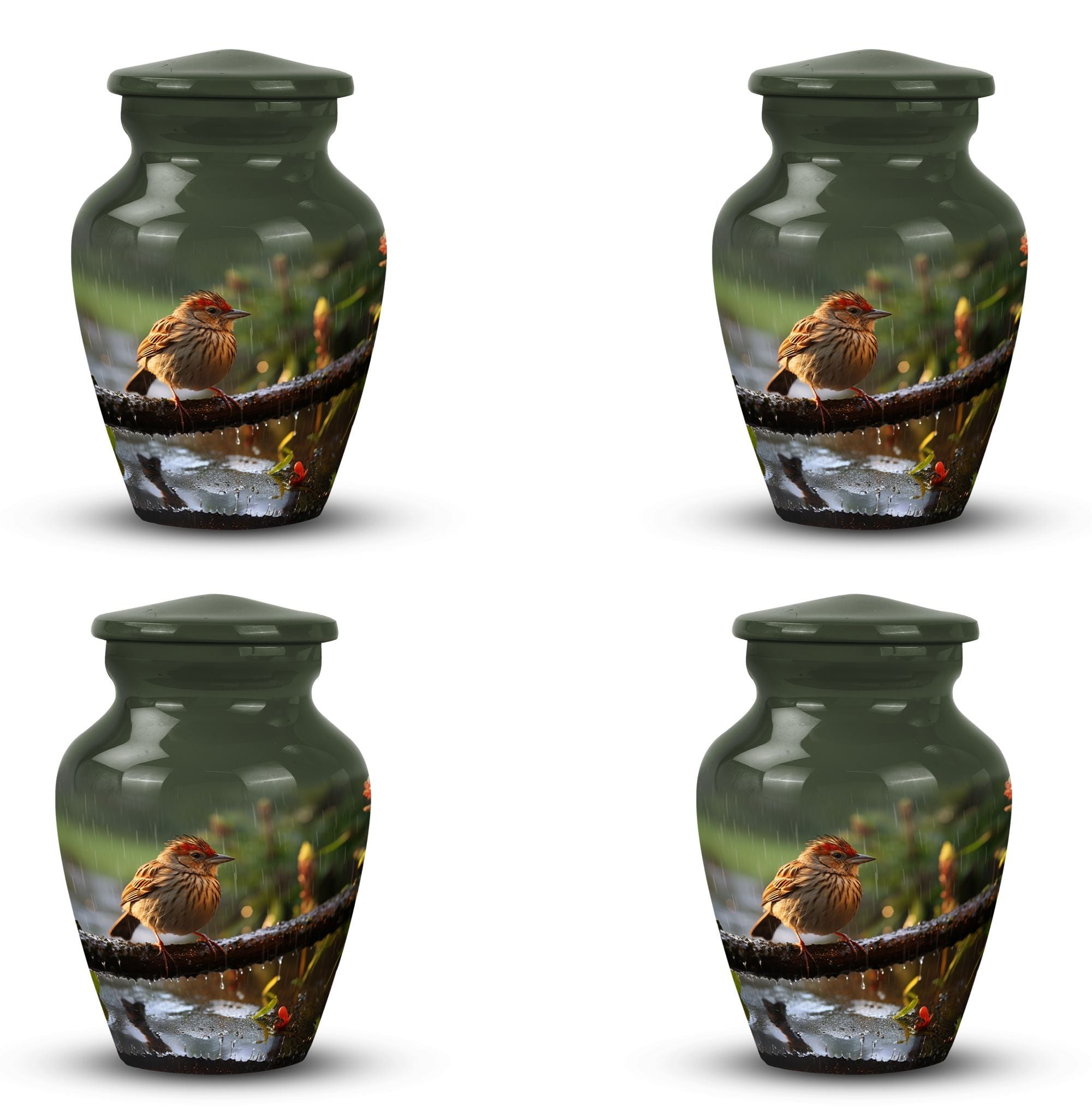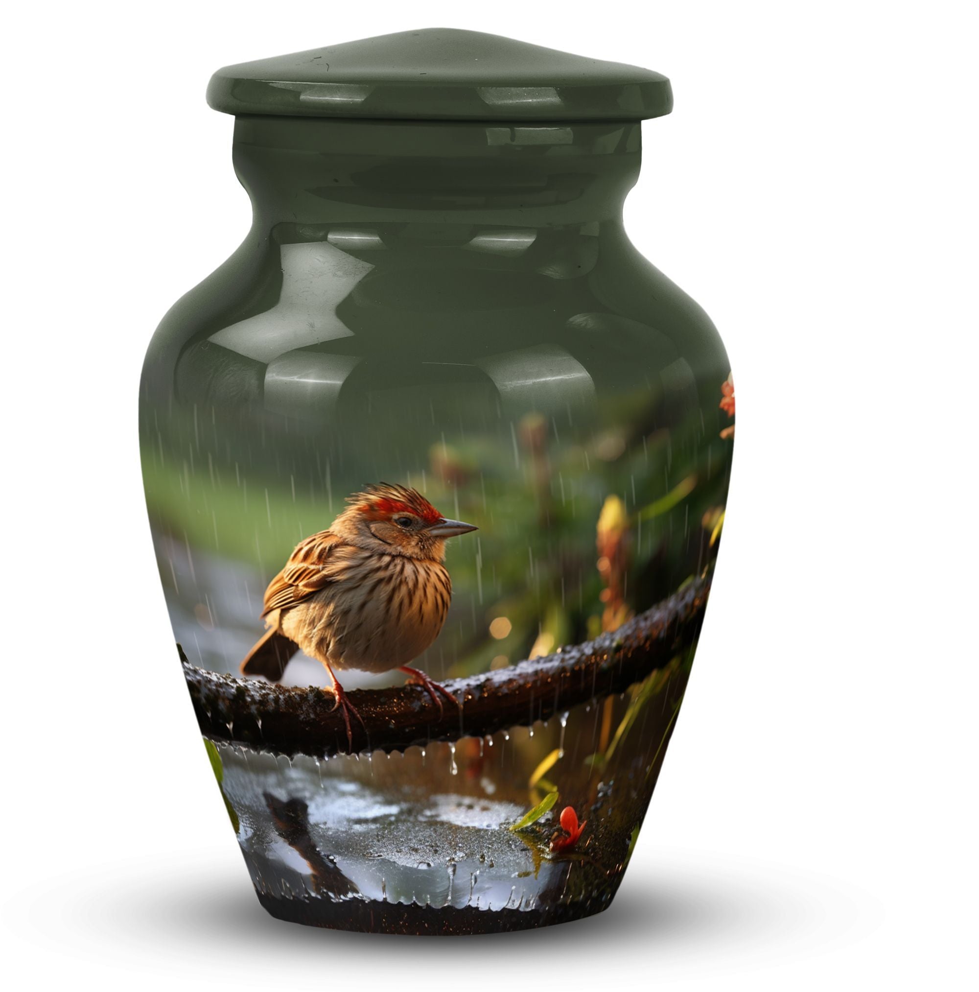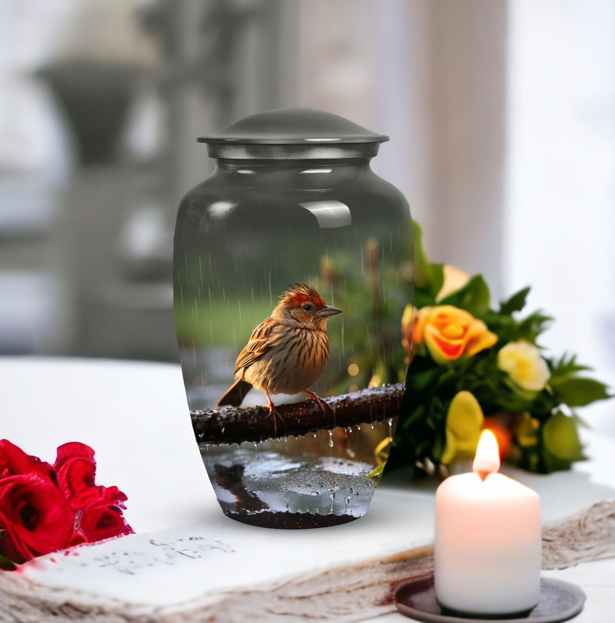 Our Sparrow Cremation Urn evokes a timeless elegance, reflecting the solemnity and dignity of saying final goodbyes. Rendered with passion in high-quality aluminium, this Large Urn is characterized by robustness and finesse. It stands 10 inches tall and has a substantial capacity of 200 cubic inches, making it fitting for adult human ashes. The urn's weight, a solid 3.3 pounds, adds to its considerable feel and overall grandeur. It comes with a luxurious velvet pouch, ensuring additional protection for the contained ashes. We offer customization options, subtly engraving names upon request to ensure every urn becomes a unique keep-sake. Consistently leading the market in personalized urns for human ashes, Sparrow Cremation Urn meets your needs for a unique, stylish, and heartfelt metal cremation urn.