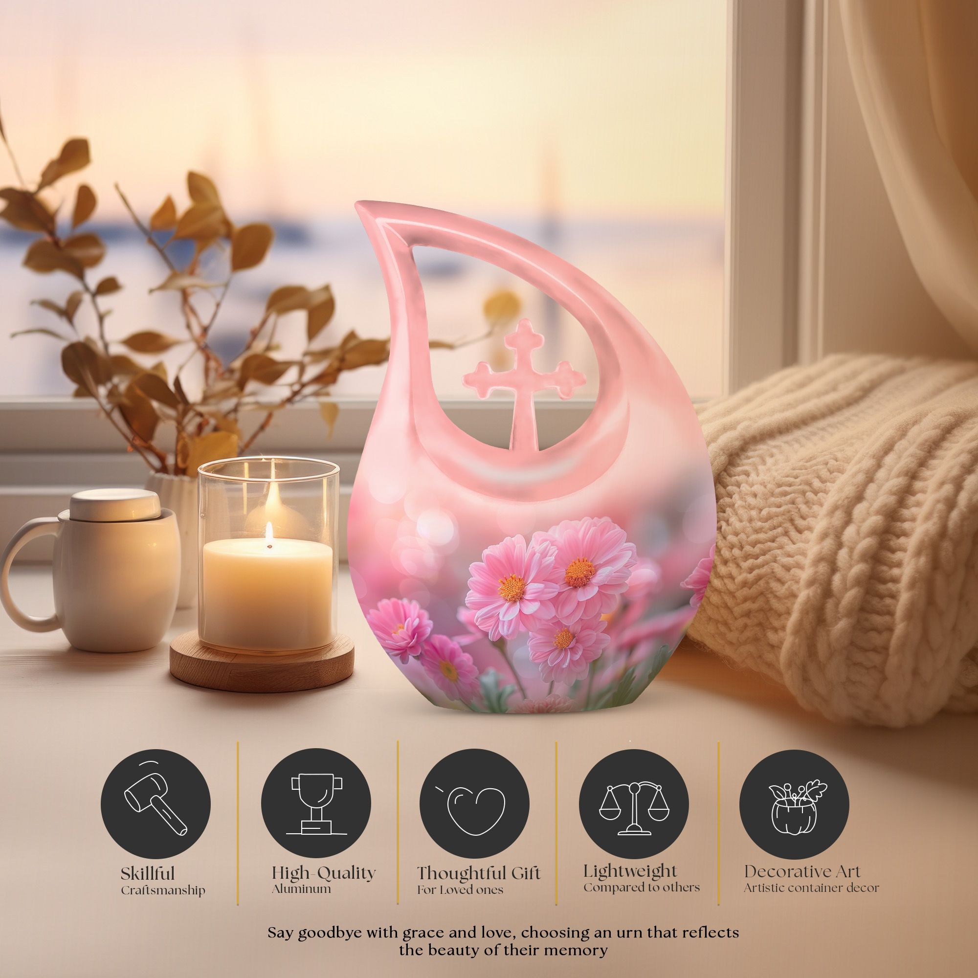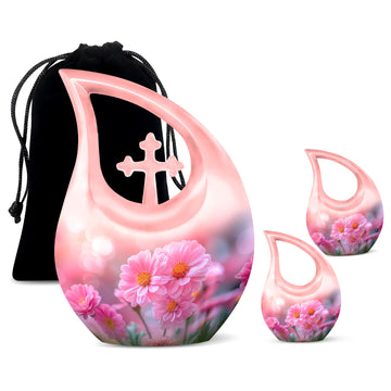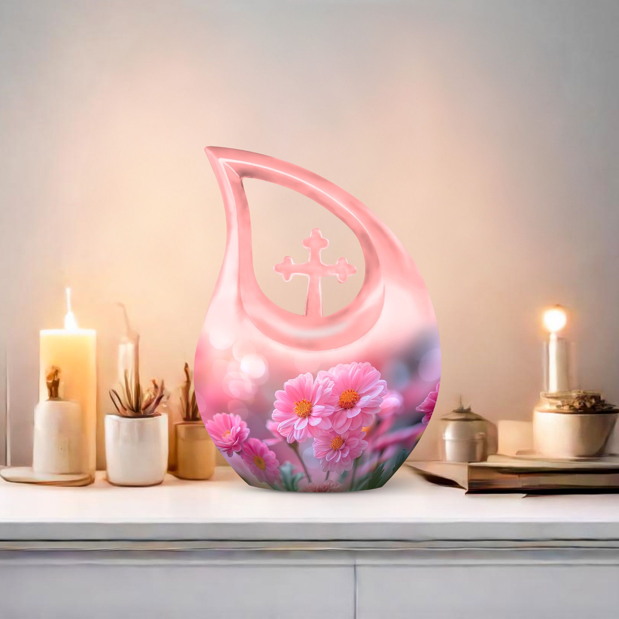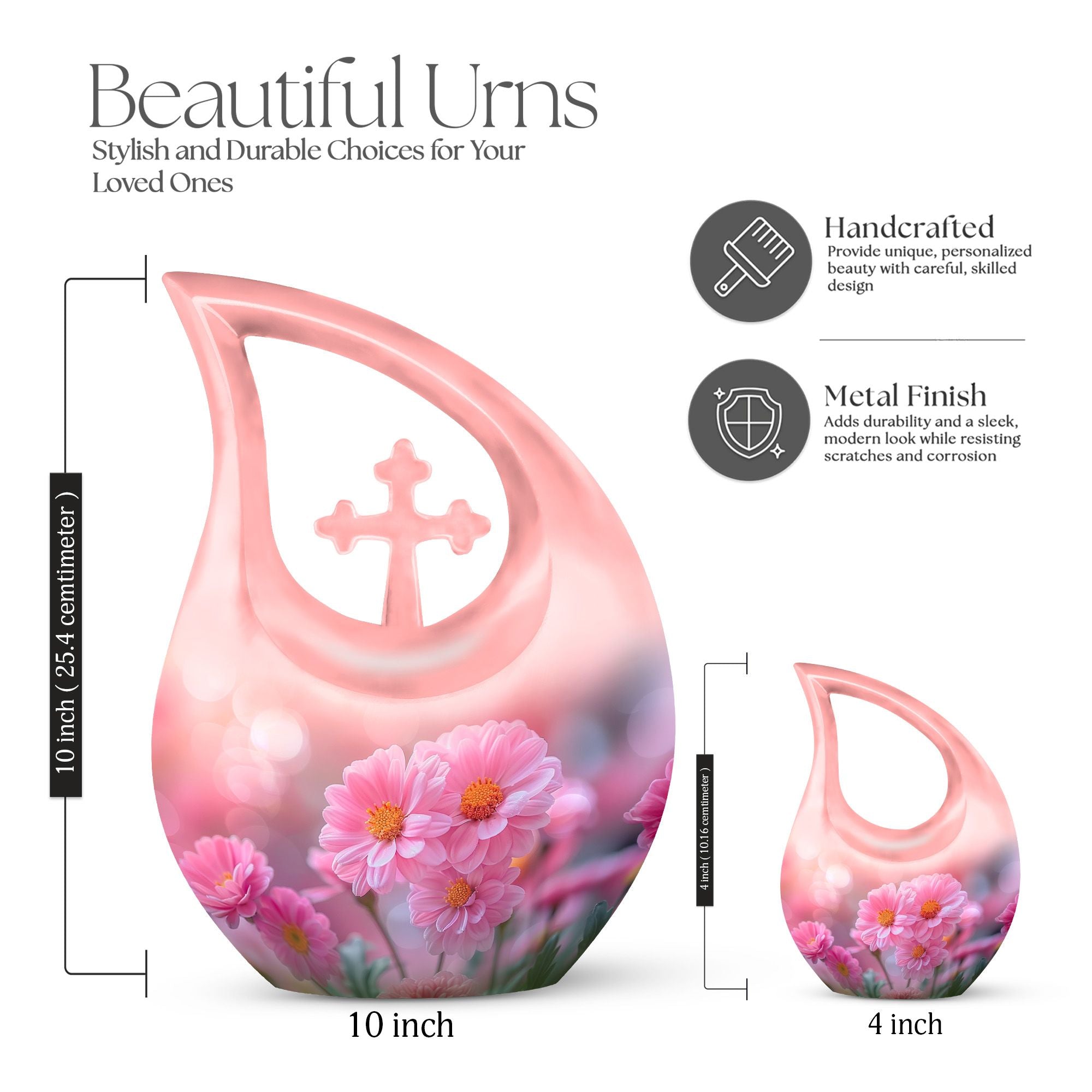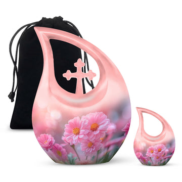 Let us present you with the 'Petals And Light Urn', a beautiful, large urn, designed with utmost precision that reflects love and respect towards your loved ones. This large urn, standing at 10 inches in height, is meticulously crafted from quality aluminium, heavy yet easy to carry, weighing just 3.3 pounds. This urn offers a significant capacity, holding up to 200 cubic inches of remains. It features a distinctly unique 'Cross Drop' design that symbolizes undying faithfulness. We understand how personal grief is; hence, we offer customization options—engrave names on the urn, making it a singular tribute to your loved ones. Additionally, a velvet pouch accompanies this urn for secure containment of ashes. This distinguished piece is a spectacular representation of love, suitable for both mother's or dad's ashes. Explore our collection of memorial urns and discover a beautiful selection of burial urns for sale, including extra-large companion urns and smaller urns for different needs. Experience the serene tranquility of honoring your loved ones with our 'Petals And Light Urn'.