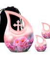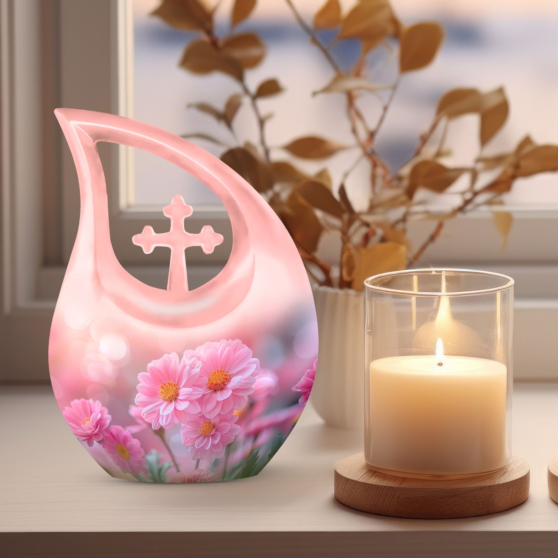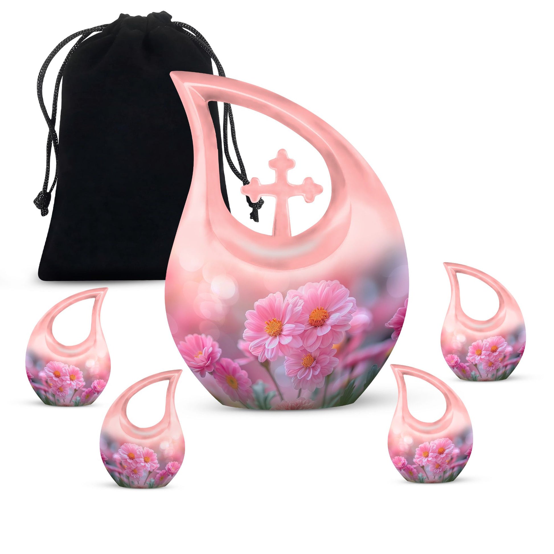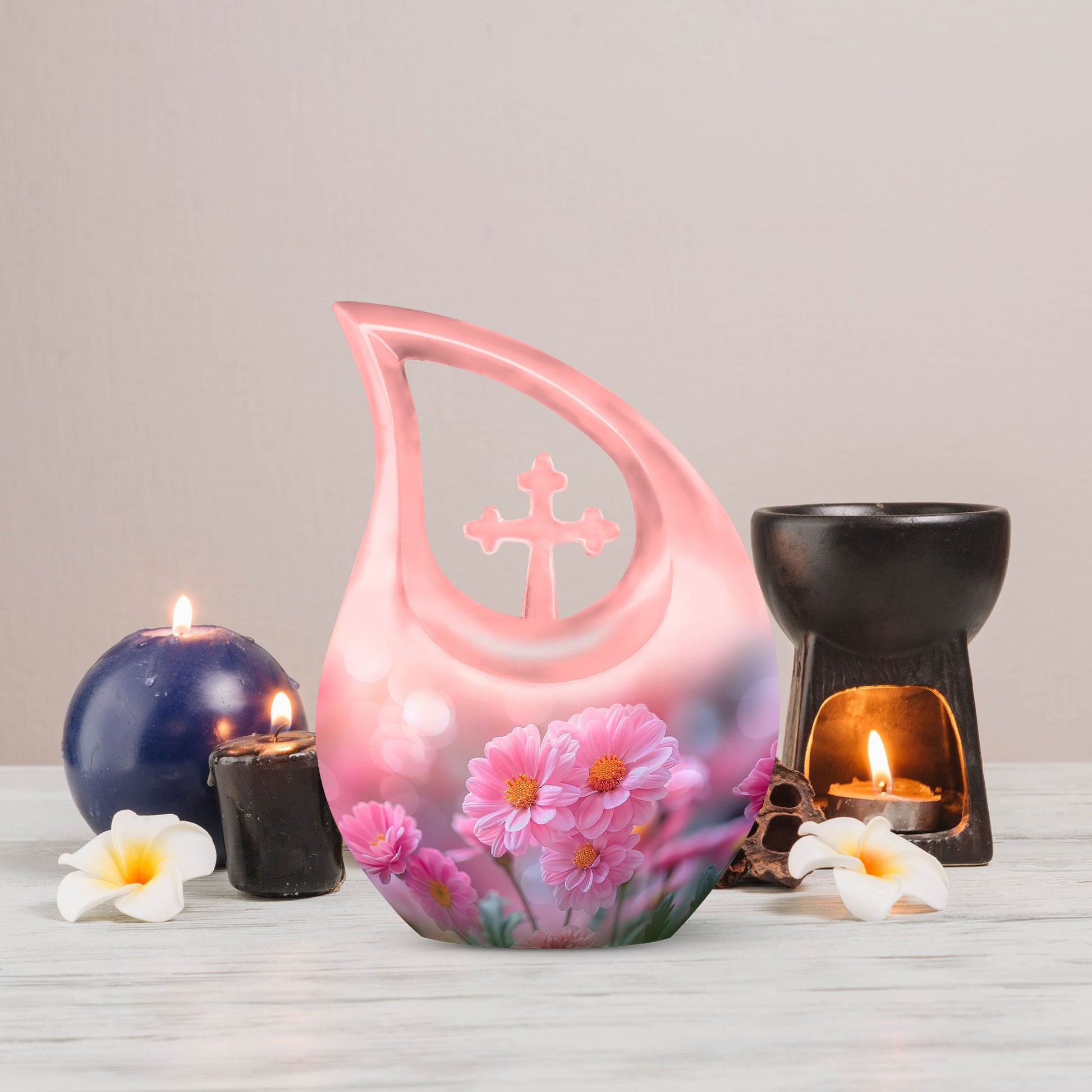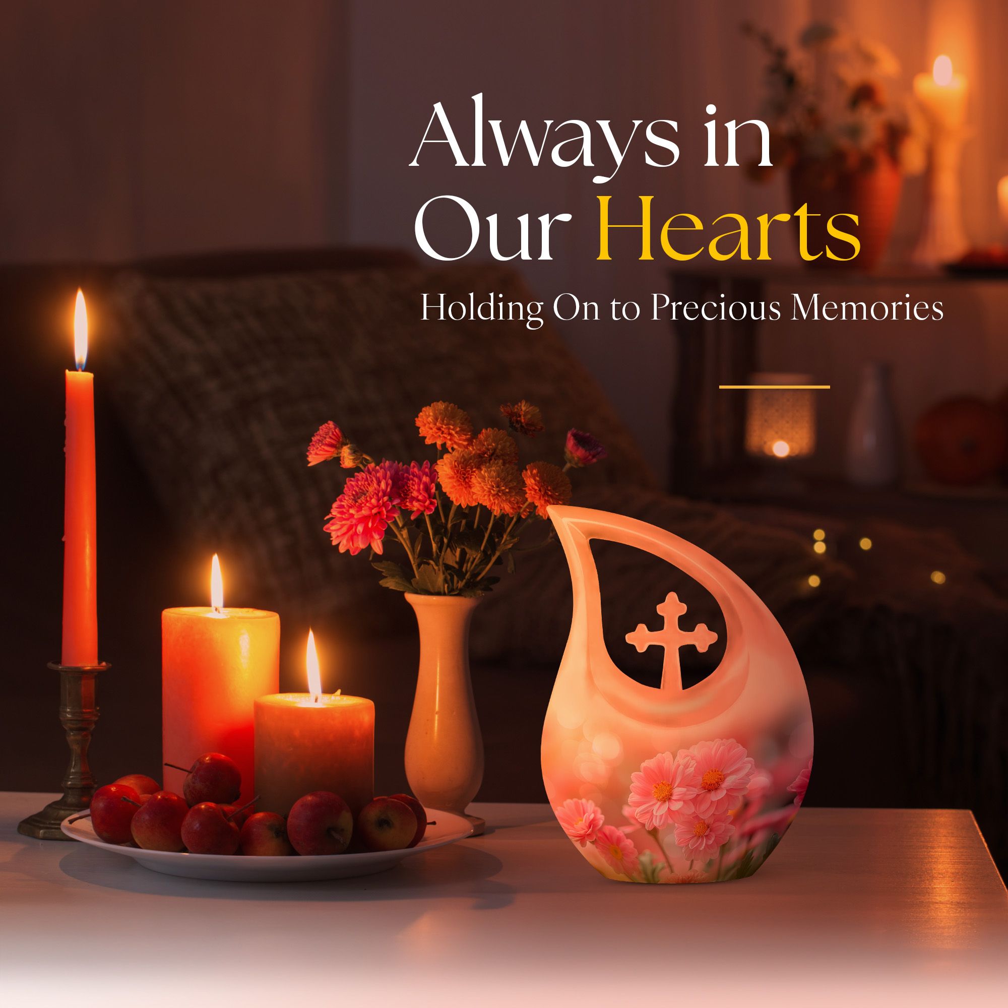 Let us present you with the 'Petals And Light Urn', a beautiful, large urn, designed with utmost precision that reflects love and respect towards your loved ones. This large urn, standing at 10 inches in height, is meticulously crafted from quality aluminium, heavy yet easy to carry, weighing just 3.3 pounds. This urn offers a significant capacity, holding up to 200 cubic inches of remains. It features a distinctly unique 'Cross Drop' design that symbolizes undying faithfulness. We understand how personal grief is; hence, we offer customization options—engrave names on the urn, making it a singular tribute to your loved ones. Additionally, a velvet pouch accompanies this urn for secure containment of ashes. This distinguished piece is a spectacular representation of love, suitable for both mother's or dad's ashes. Explore our collection of memorial urns and discover a beautiful selection of burial urns for sale, including extra-large companion urns and smaller urns for different needs. Experience the serene tranquility of honoring your loved ones with our 'Petals And Light Urn'.