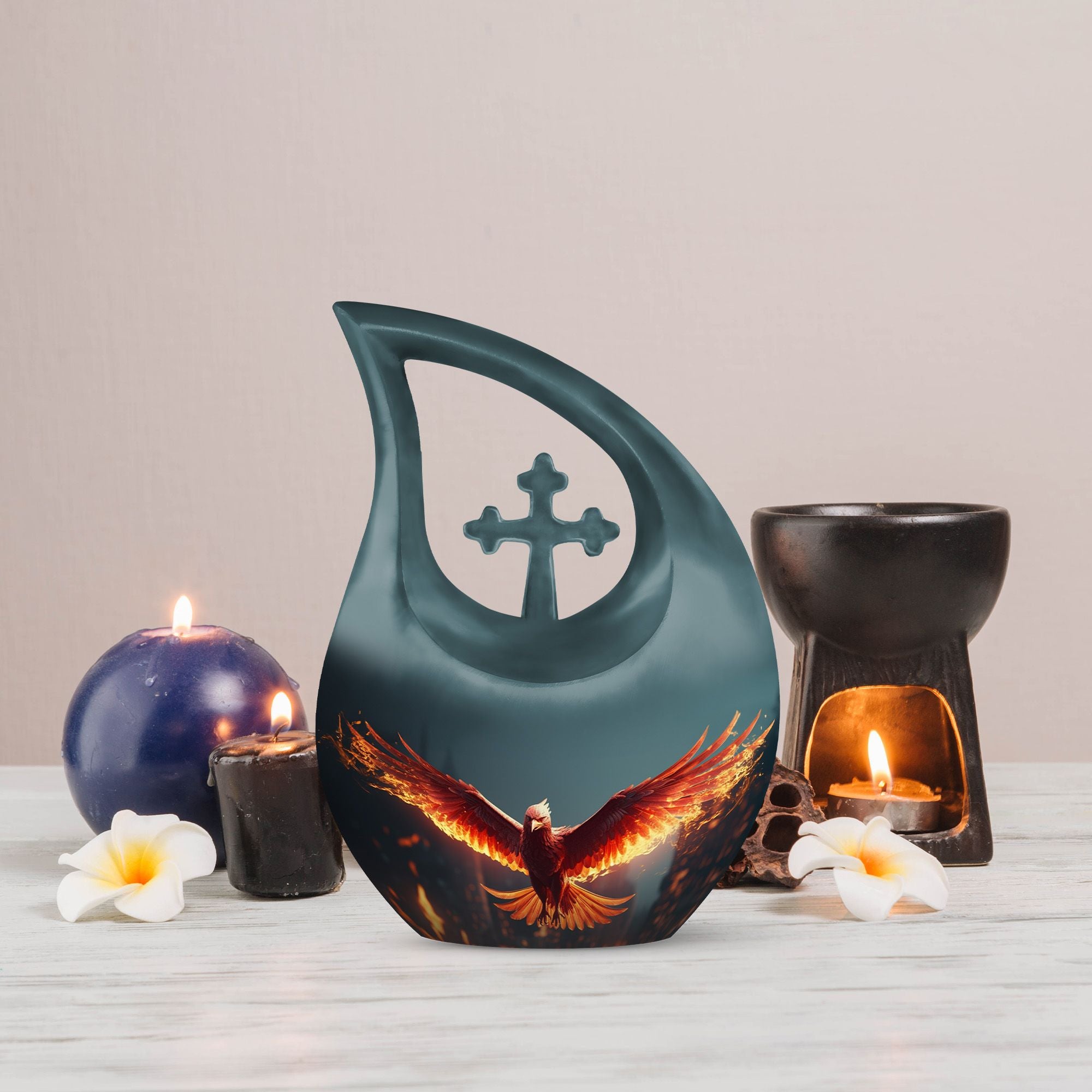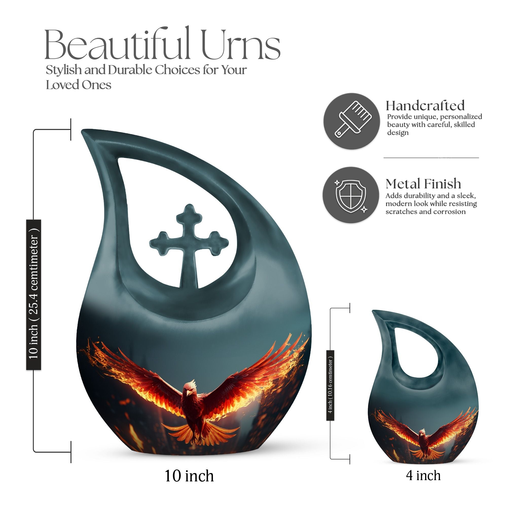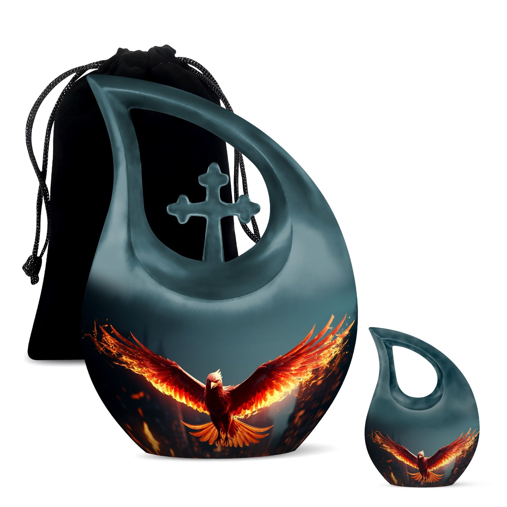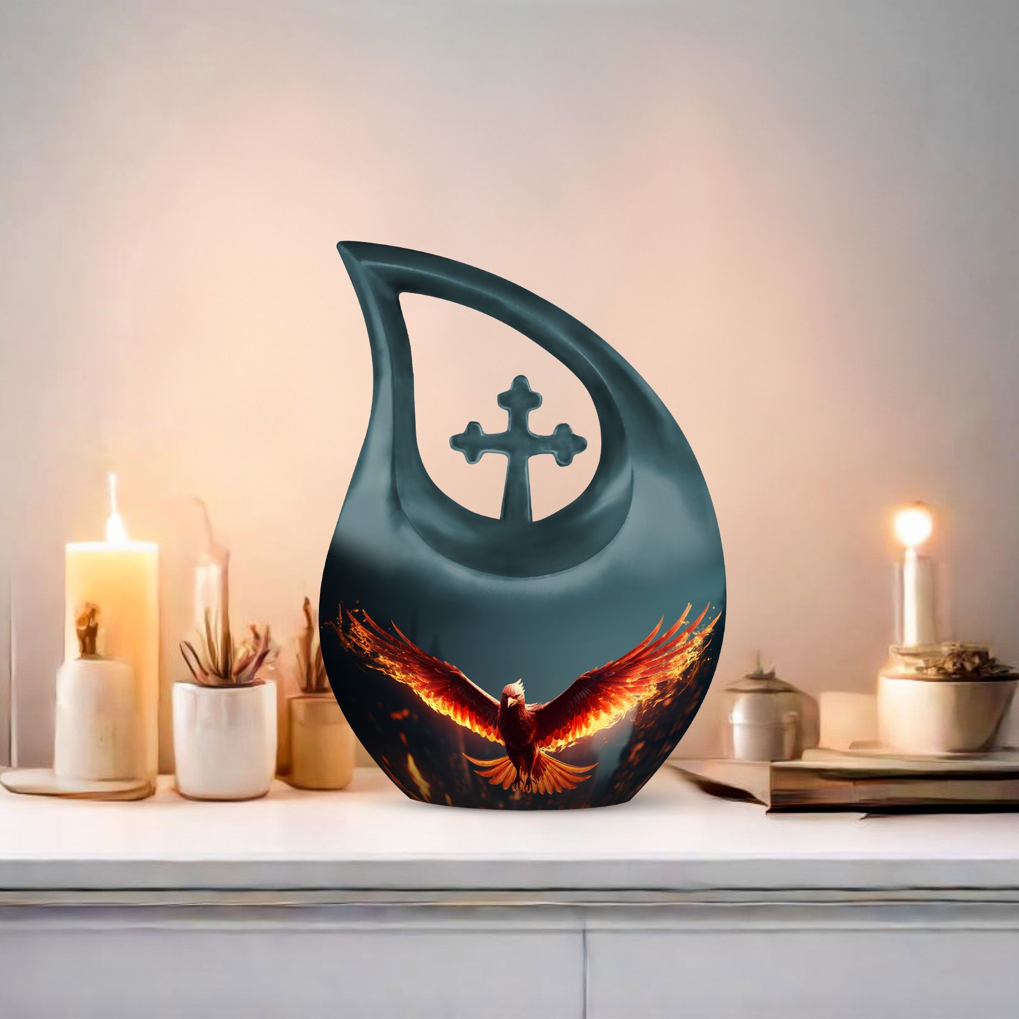 t pouch accompanies the urn ensuring containment of ashes with dignity and respect. Weighing 3.3 pounds, our product stands 10 inches in height, demonstrating its substantial and quality build. This memorial urn is more than a decorative urn, it's a beautiful tribute. Embodying the Cross Drop pattern, this Phoenix Urn also offers an alternative to burial urns for human ashes. Remember, memorial urns aren't just about storing, they're about honoring and remembering a cherished life. Note: This product is not biodegradable.