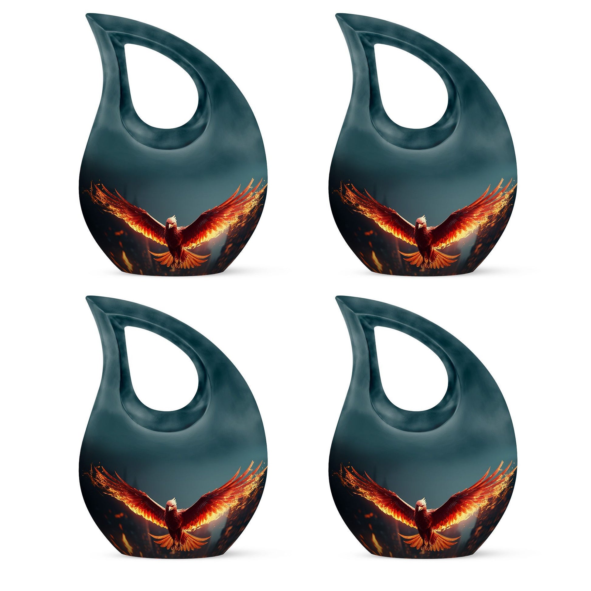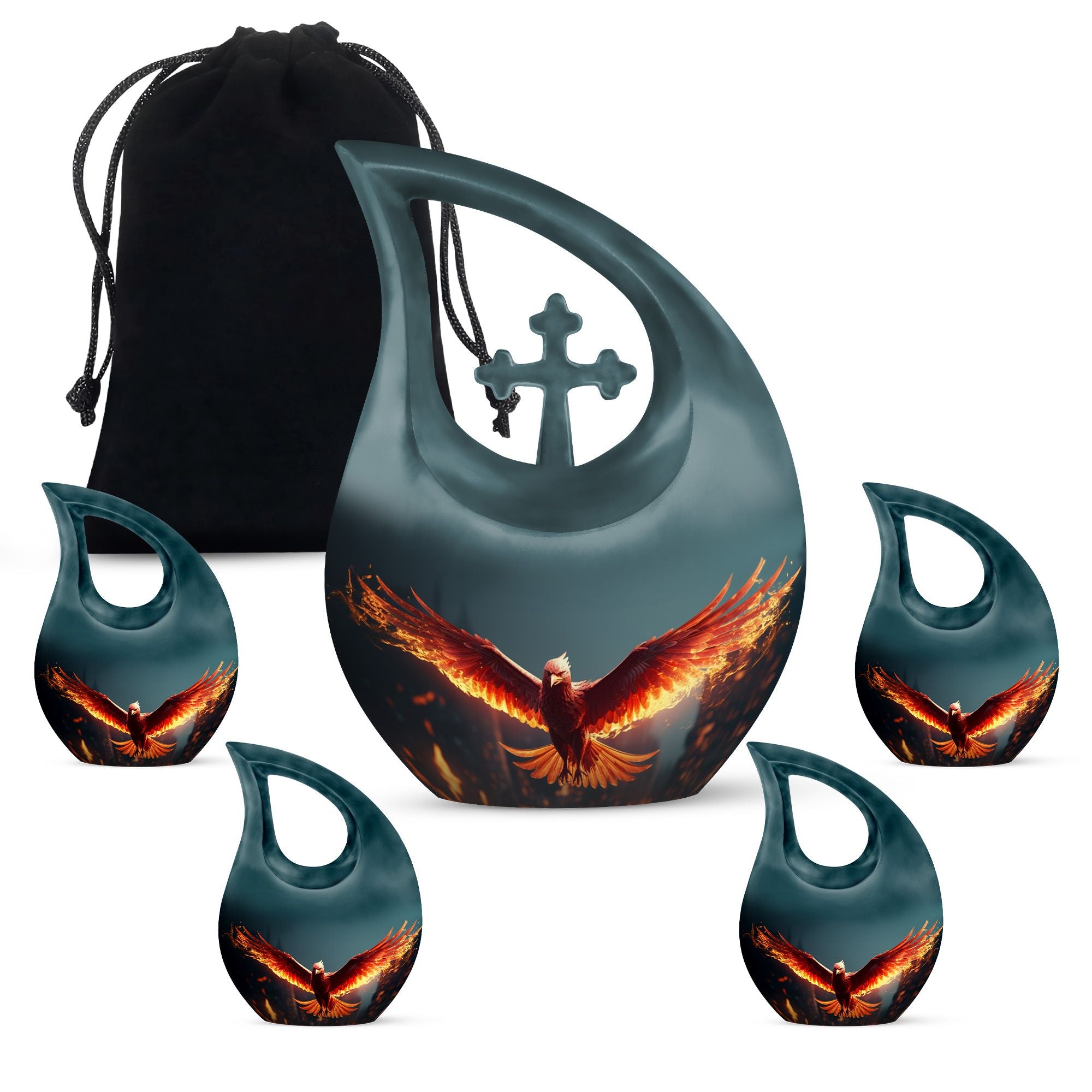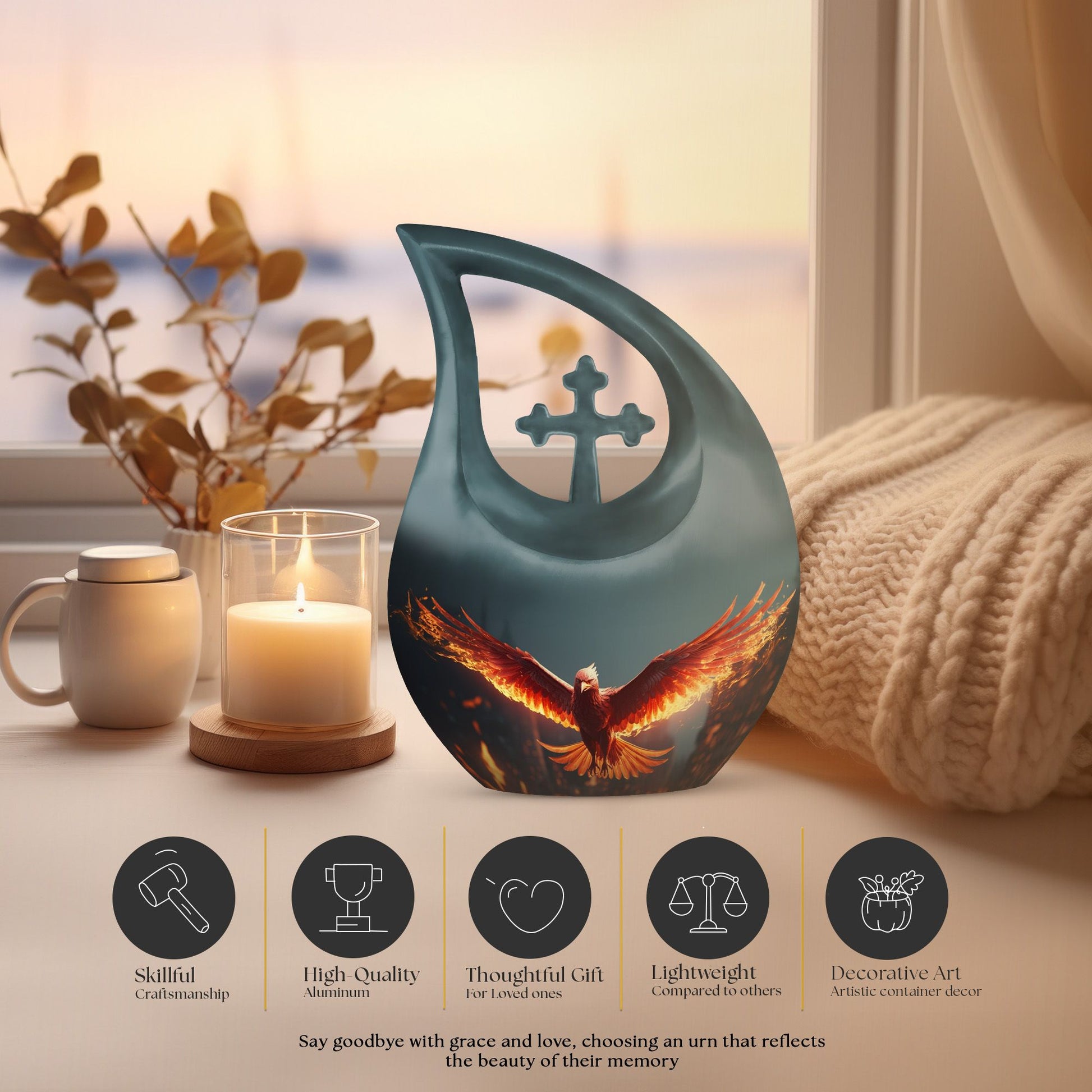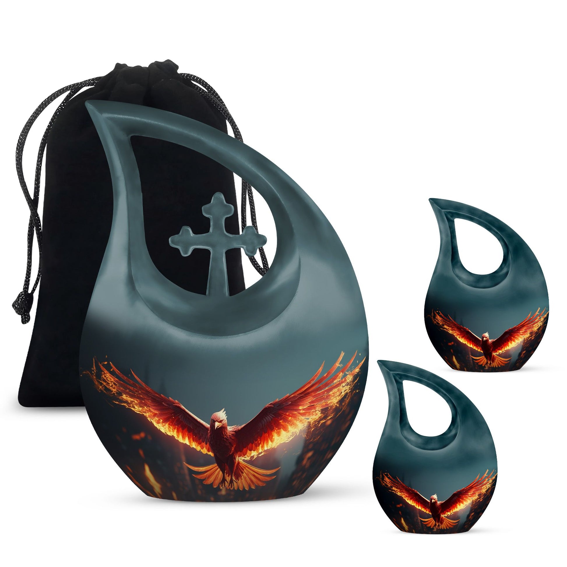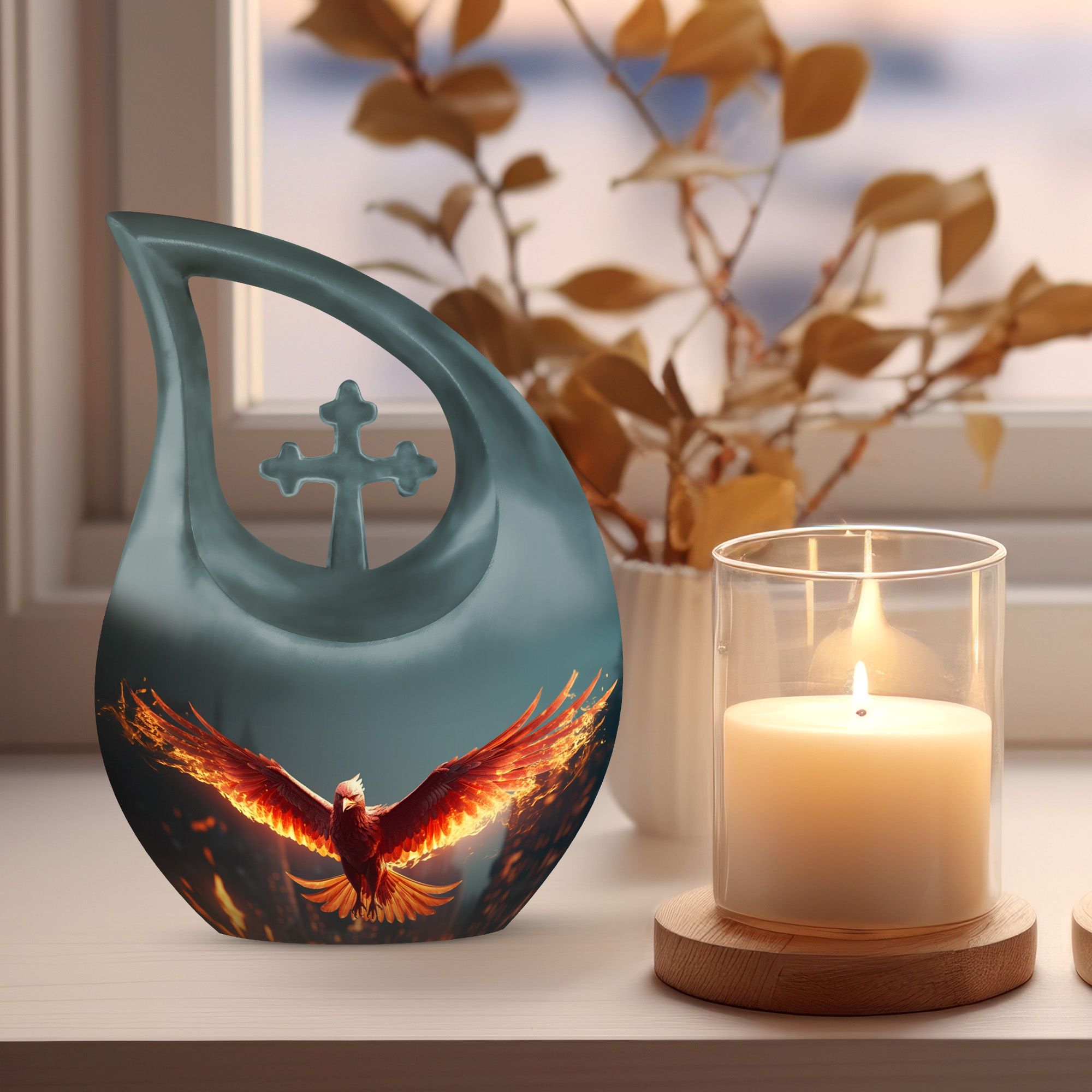 t pouch accompanies the urn ensuring containment of ashes with dignity and respect. Weighing 3.3 pounds, our product stands 10 inches in height, demonstrating its substantial and quality build. This memorial urn is more than a decorative urn, it's a beautiful tribute. Embodying the Cross Drop pattern, this Phoenix Urn also offers an alternative to burial urns for human ashes. Remember, memorial urns aren't just about storing, they're about honoring and remembering a cherished life. Note: This product is not biodegradable.