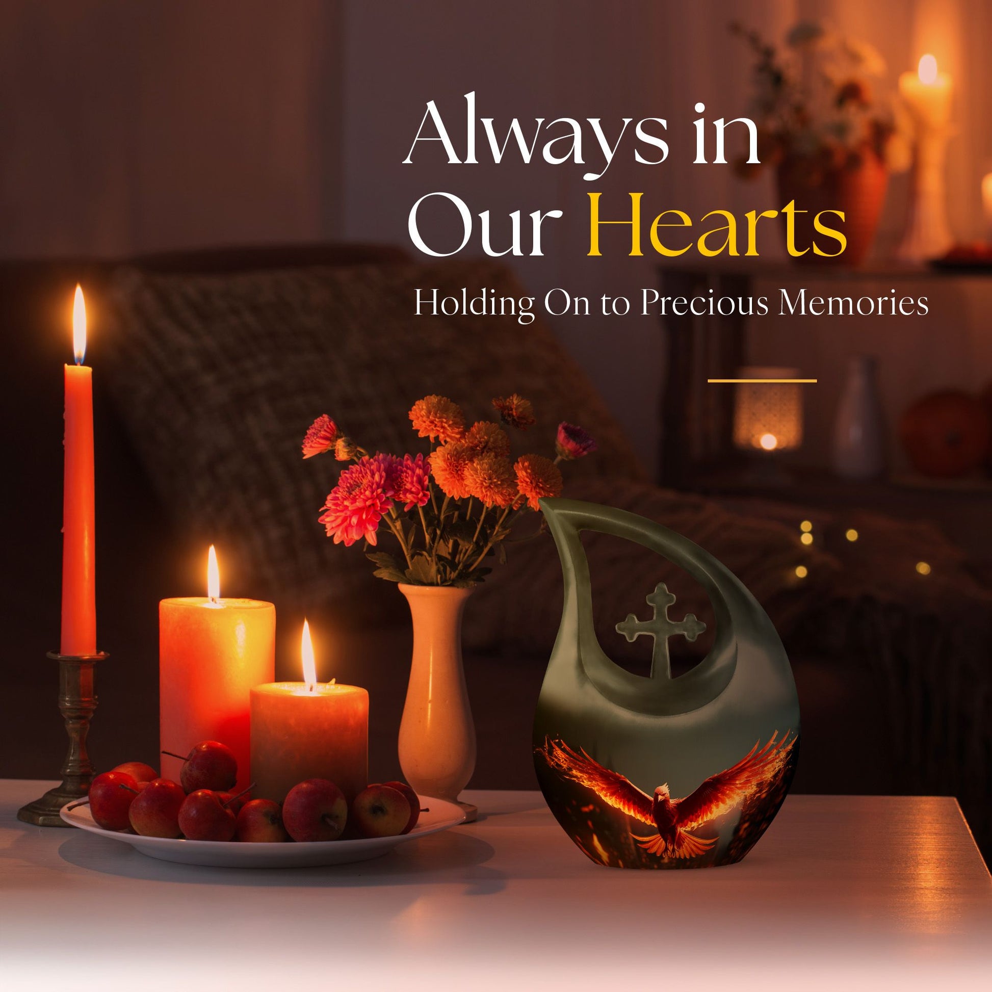The phoenix motif serves as a heartfelt reminder that love transcends time, rising anew just as the spirit lives on — making this burial urn for ashes a beautiful and comforting tribute to a cherished life.