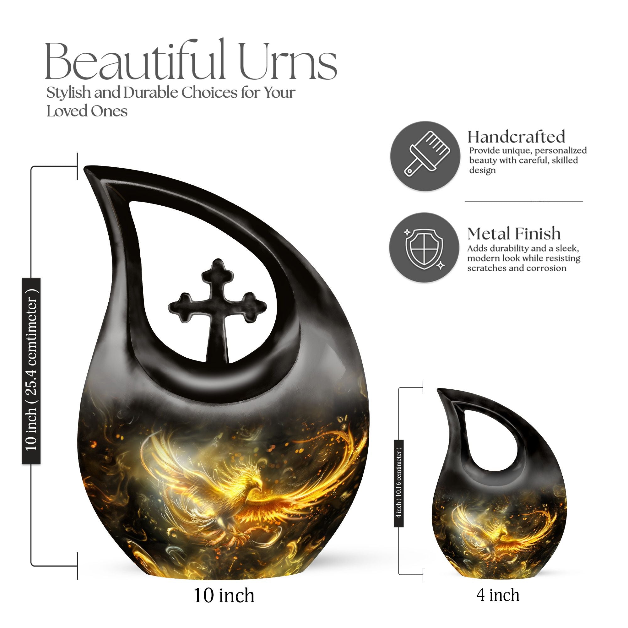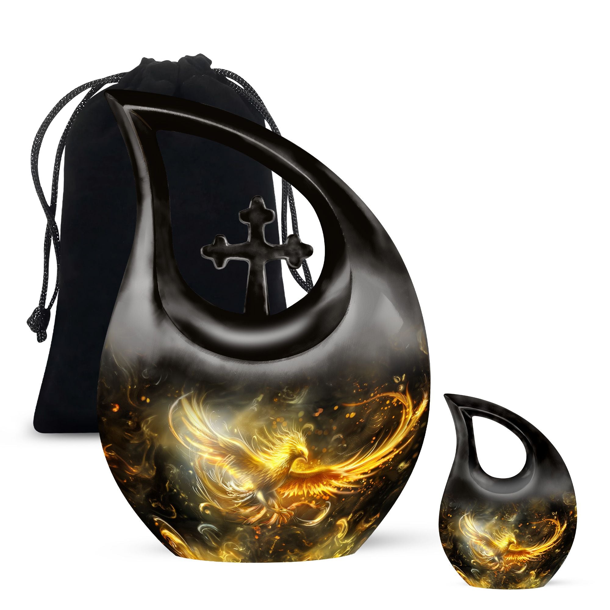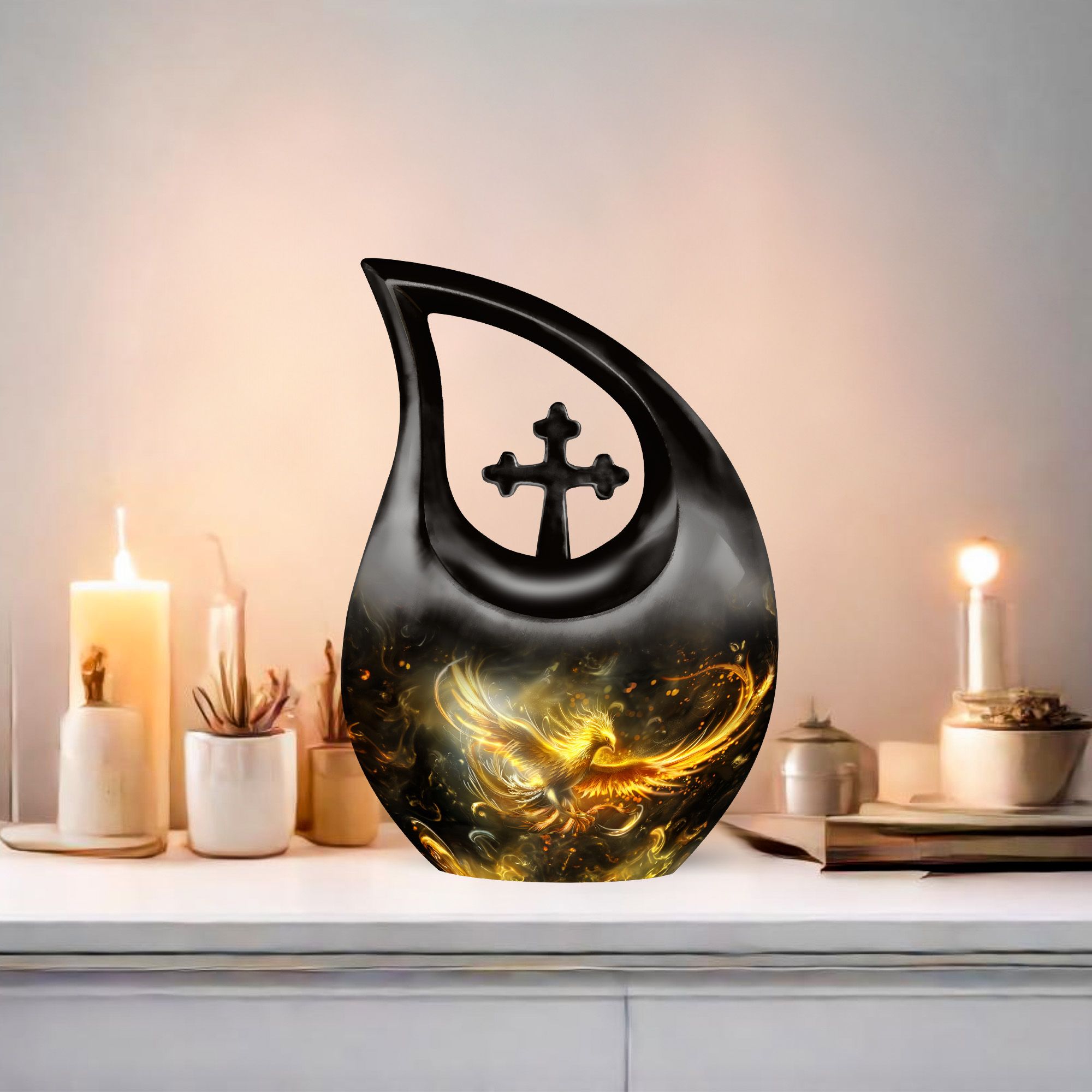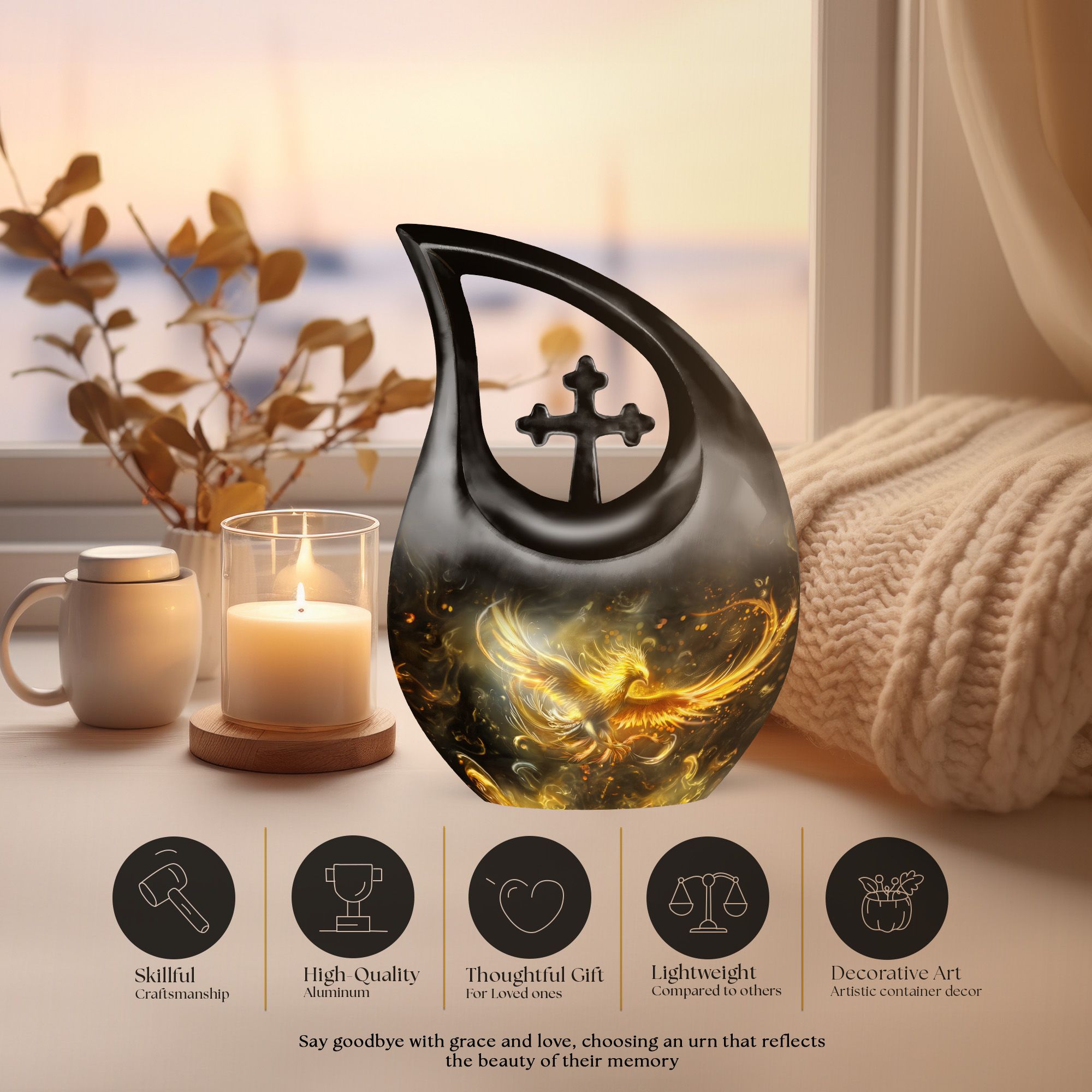 Rise from ashes and ascend into the heavens with our stunning Phoenix Urn, perfect for a memorable tribute. This custom urn, designed for human ashes, stands at a regal 10 inches, made from robust aluminium. Weighing 3.3 pounds, it ensures a sturdy and secure shrine for your loved ones. The 'Cross Drop' theme that embellishes the urn adds a serene elegance and resonates with the spiritual journey beyond physical existence. Not only is it visually symbolic, but it also has a capacity of 200 cubic inches, allowing it to accommodate a sizeable amount of ashes comfortably. It comes with a soft velvet pouch, ensuring the contained ashes are undisturbed and offering an additional layer of respectful containment. For a more personalized touch, the urn can be engraved with names, truly embodying a bespoke memorial. Ideal for adults and seniors on the journey of remembrance, this phoenix urn serves as an enduring symbol of eternal love. Find the ideal fit with our varied range, from extra-large cremation urns to medium size urns, ensuring everyone finds their perfect memorial tribute.