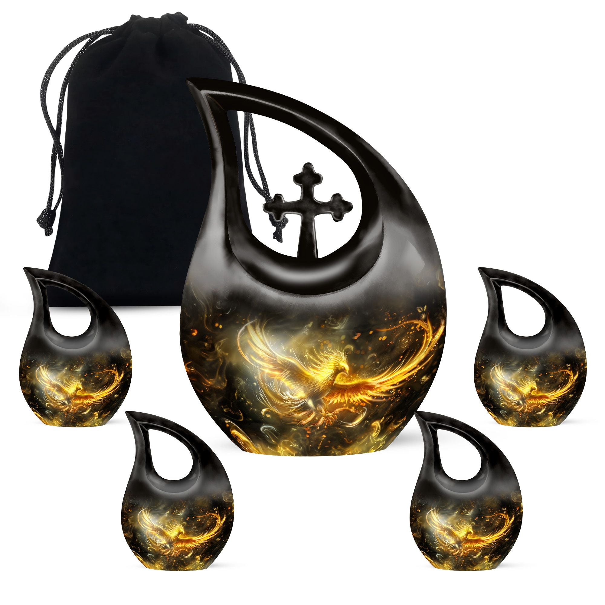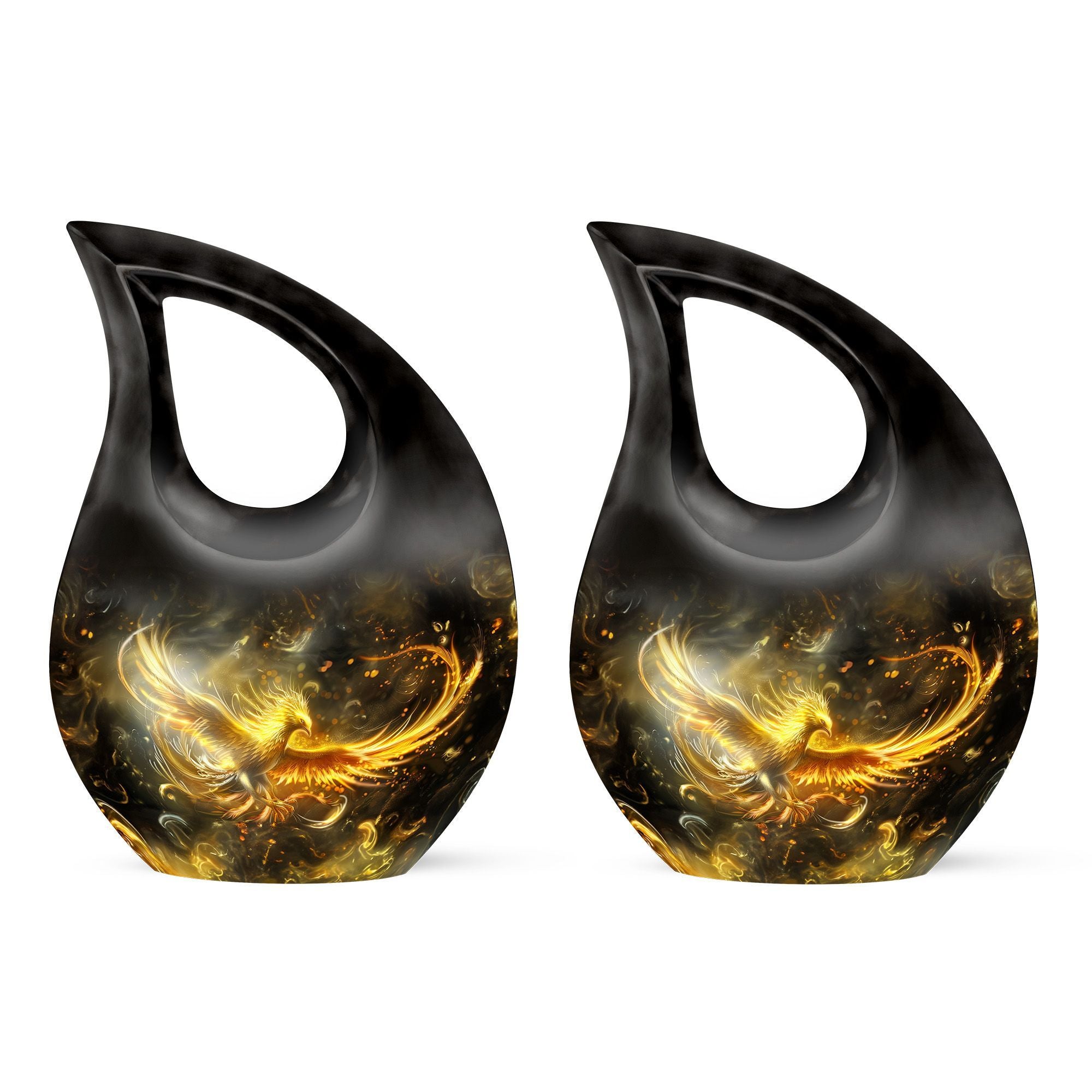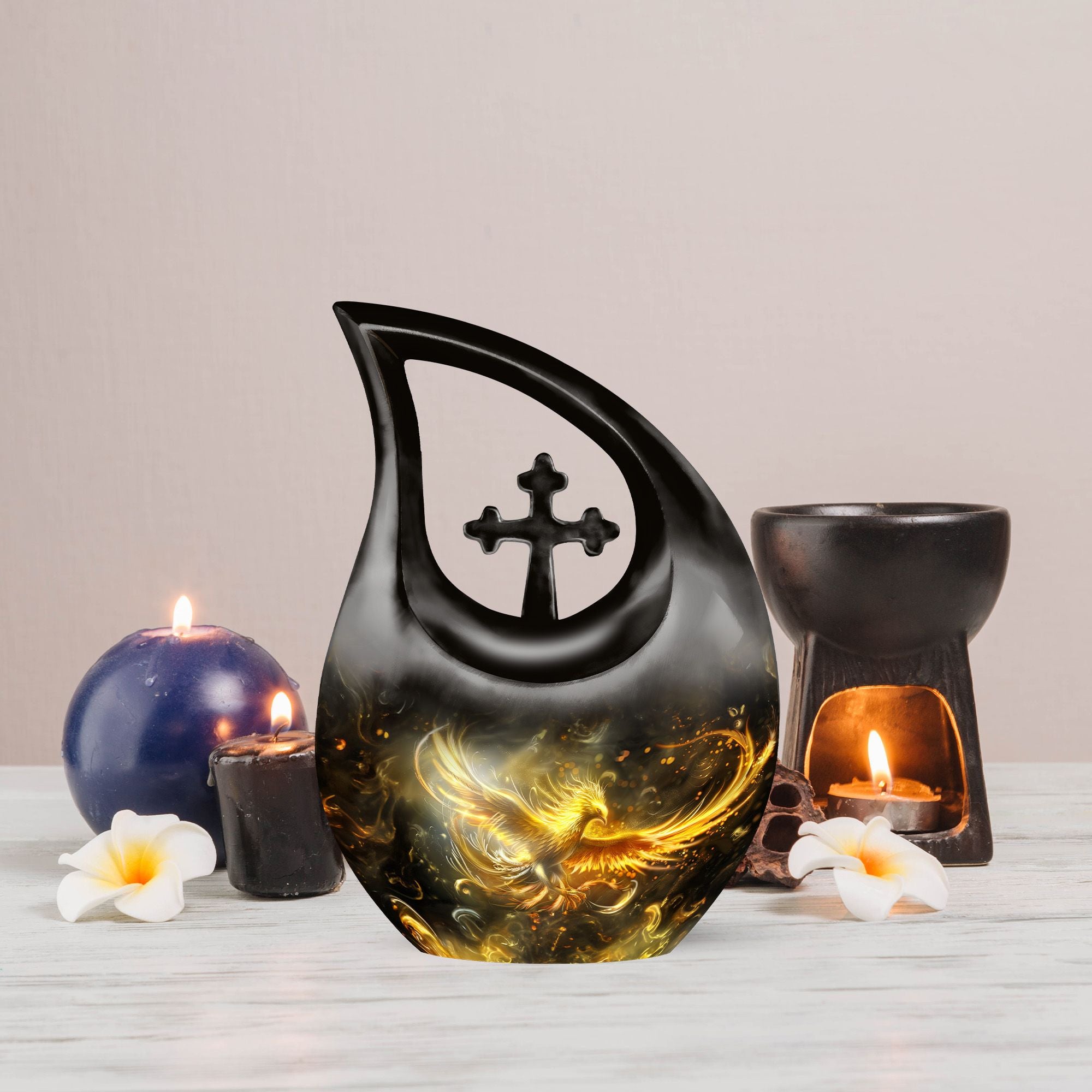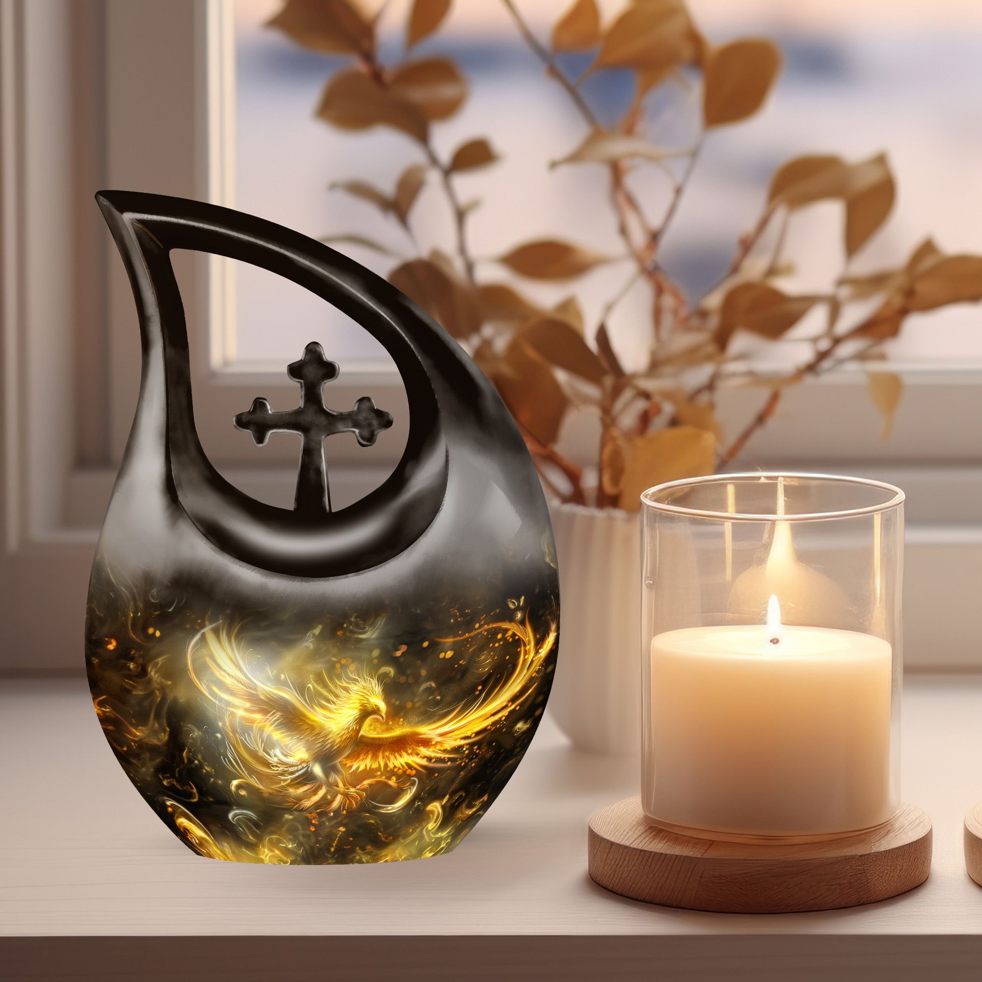 Rise from ashes and ascend into the heavens with our stunning Phoenix Urn, perfect for a memorable tribute. This custom urn, designed for human ashes, stands at a regal 10 inches, made from robust aluminium. Weighing 3.3 pounds, it ensures a sturdy and secure shrine for your loved ones. The 'Cross Drop' theme that embellishes the urn adds a serene elegance and resonates with the spiritual journey beyond physical existence. Not only is it visually symbolic, but it also has a capacity of 200 cubic inches, allowing it to accommodate a sizeable amount of ashes comfortably. It comes with a soft velvet pouch, ensuring the contained ashes are undisturbed and offering an additional layer of respectful containment. For a more personalized touch, the urn can be engraved with names, truly embodying a bespoke memorial. Ideal for adults and seniors on the journey of remembrance, this phoenix urn serves as an enduring symbol of eternal love. Find the ideal fit with our varied range, from extra-large cremation urns to medium size urns, ensuring everyone finds their perfect memorial tribute.