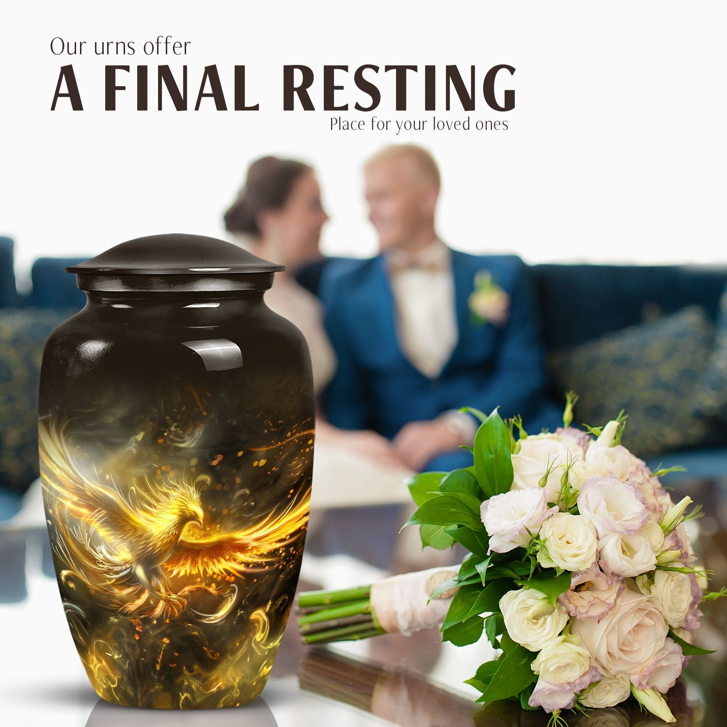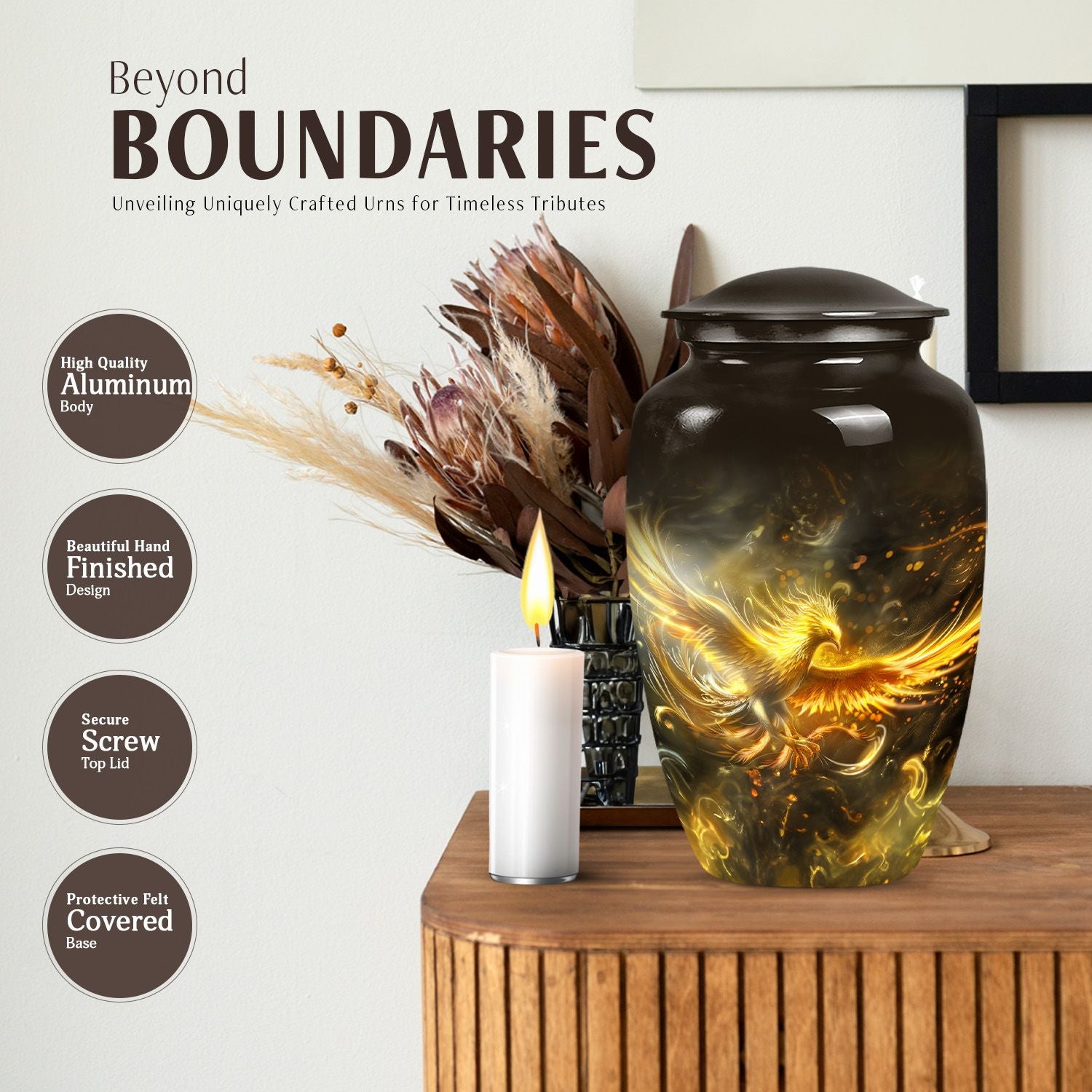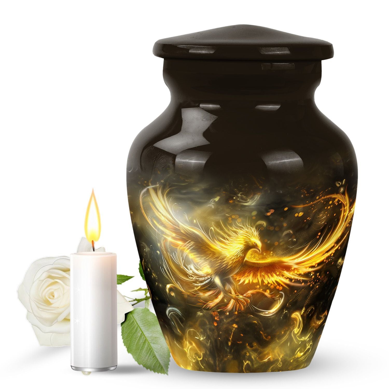 Nurture the memories of your loved ones with this aesthetically pleasing abstract-themed Phoenix Urn for women's ashes. It combines functionality and artistry, manifesting as a quintessential memorial urn created to stand the test of time. Sized at 10 inches and weighing a mere 3.3 pounds, this large, metallic urn is crafted from durable aluminium to securely handle up to 200 cubic inches of ashes. Its abstract theme radiates a deep touch of adoration and serenity that will compliment your homage to the departed. This classic urn comes complete with a plush velvet pouch, designed to carefully contain the ashes. Moreover, it offers the option of personalizing it with engraved names, enabling you to create a unique, heartfelt tribute. Ideal for ground burial or housing as an heirloom, this cremation urn is more than just a vessel; it honours the beautiful journey of life. Immerse in its lasting tribute: Urns for human ashes, specifically designed to cherish the female spirit.