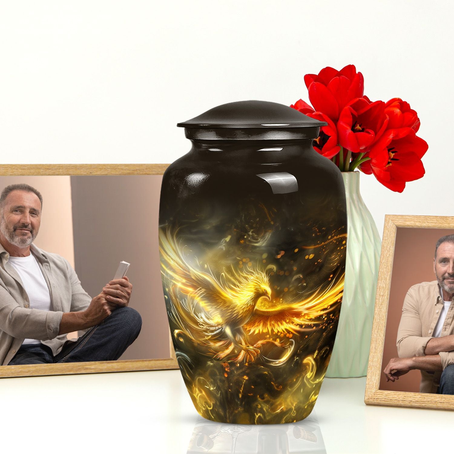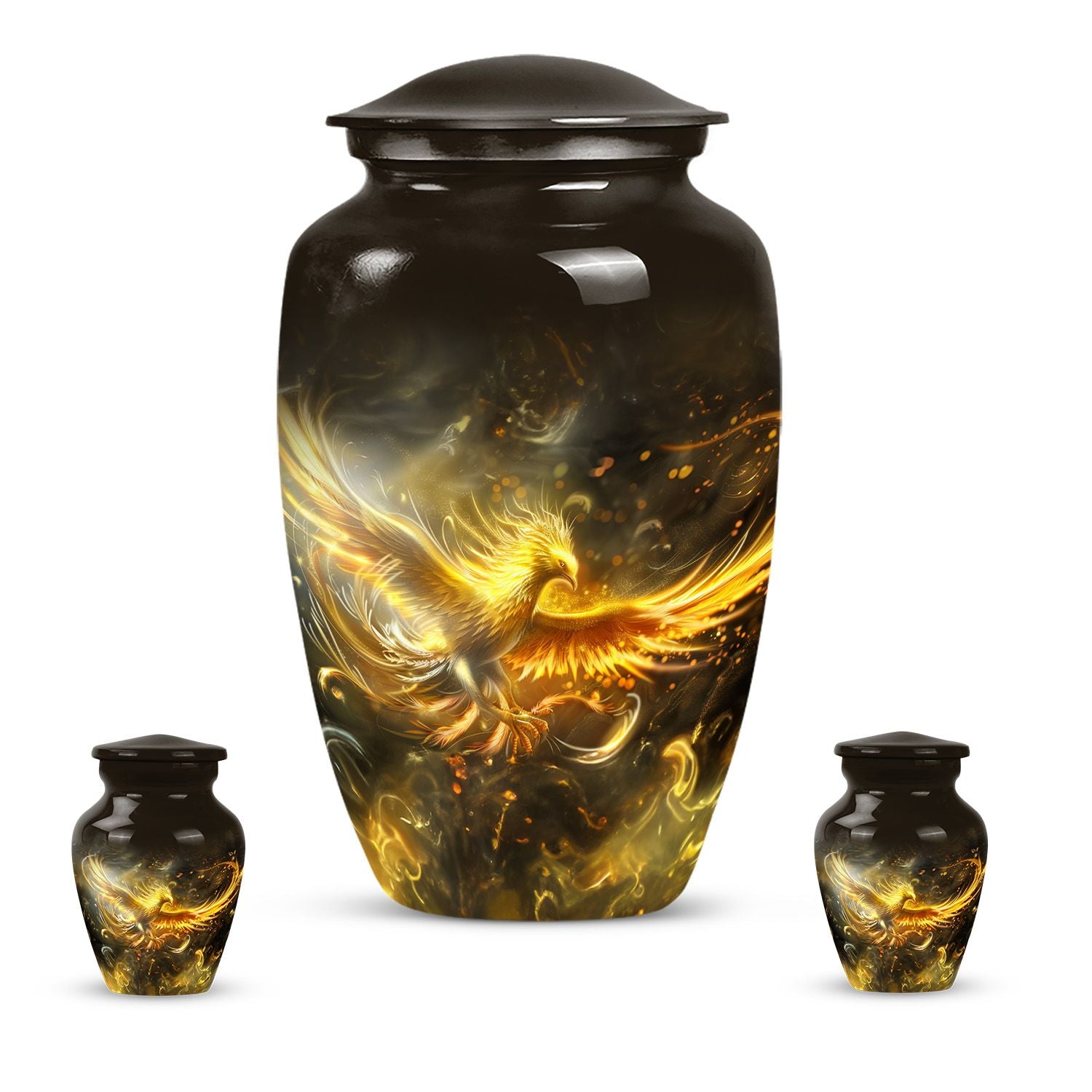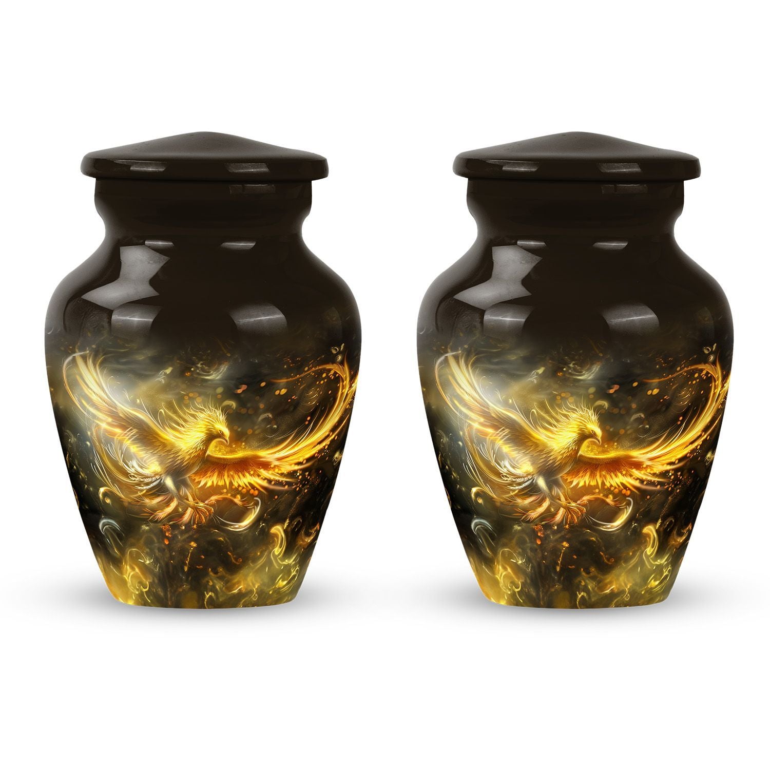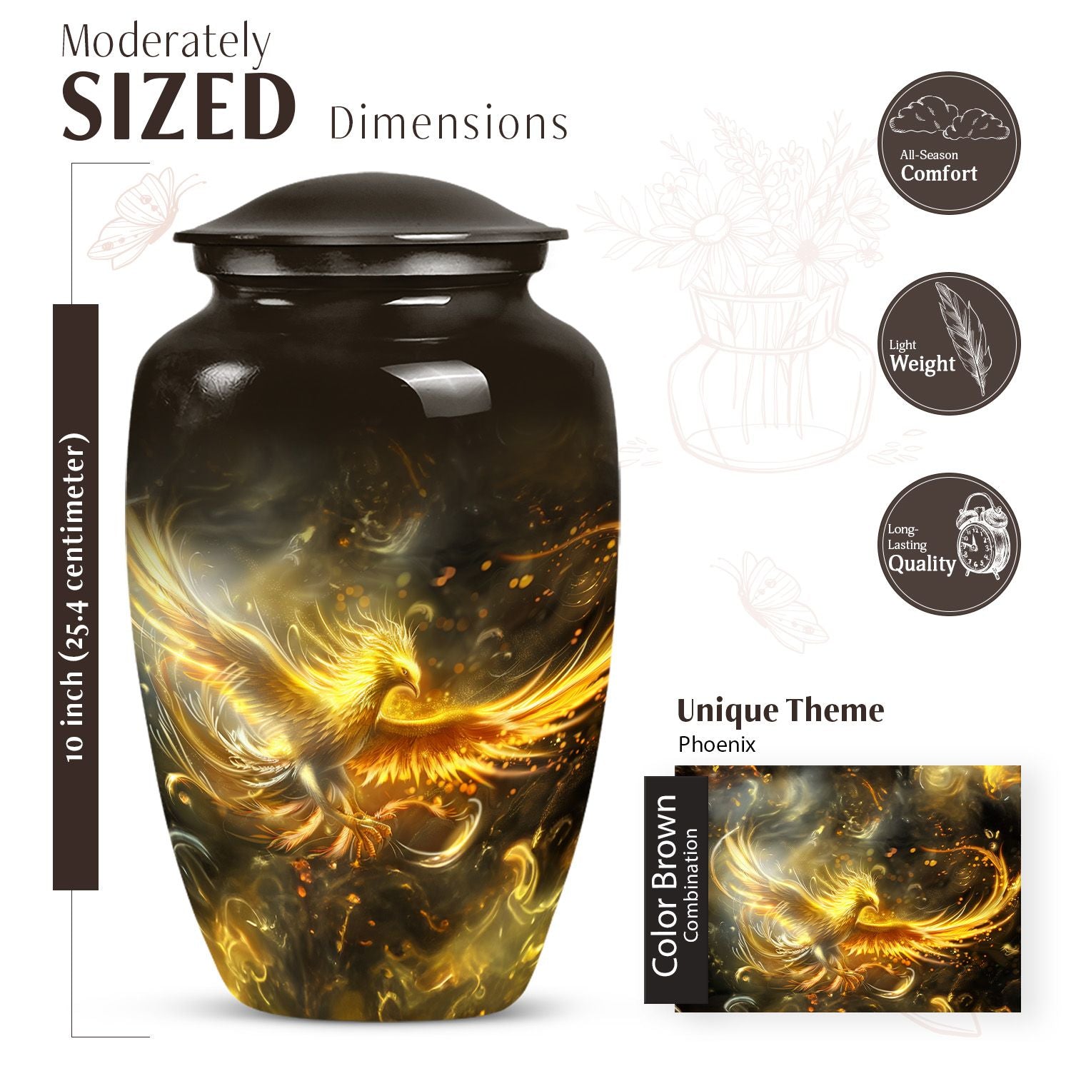 Nurture the memories of your loved ones with this aesthetically pleasing abstract-themed Phoenix Urn for women's ashes. It combines functionality and artistry, manifesting as a quintessential memorial urn created to stand the test of time. Sized at 10 inches and weighing a mere 3.3 pounds, this large, metallic urn is crafted from durable aluminium to securely handle up to 200 cubic inches of ashes. Its abstract theme radiates a deep touch of adoration and serenity that will compliment your homage to the departed. This classic urn comes complete with a plush velvet pouch, designed to carefully contain the ashes. Moreover, it offers the option of personalizing it with engraved names, enabling you to create a unique, heartfelt tribute. Ideal for ground burial or housing as an heirloom, this cremation urn is more than just a vessel; it honours the beautiful journey of life. Immerse in its lasting tribute: Urns for human ashes, specifically designed to cherish the female spirit.
