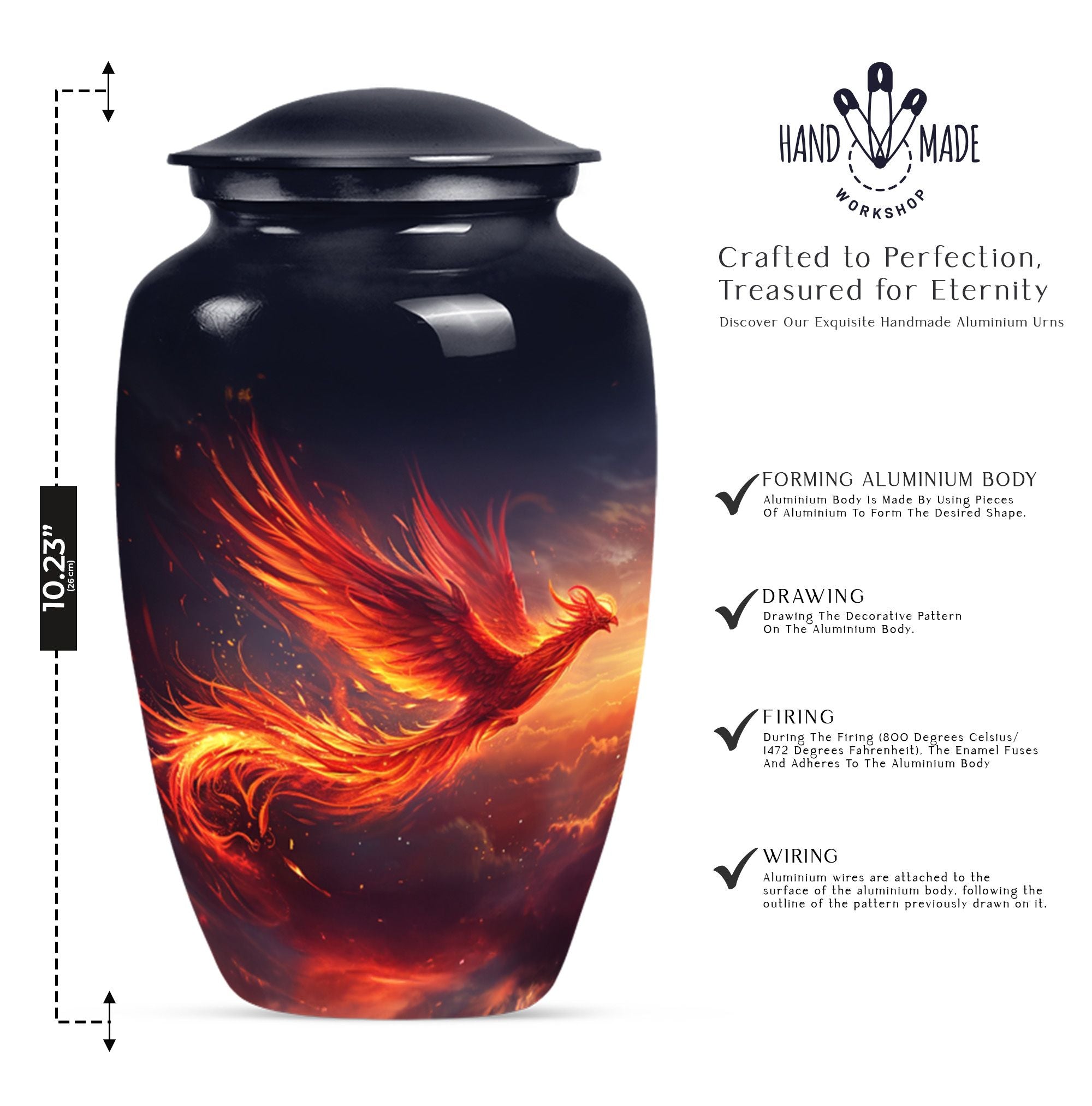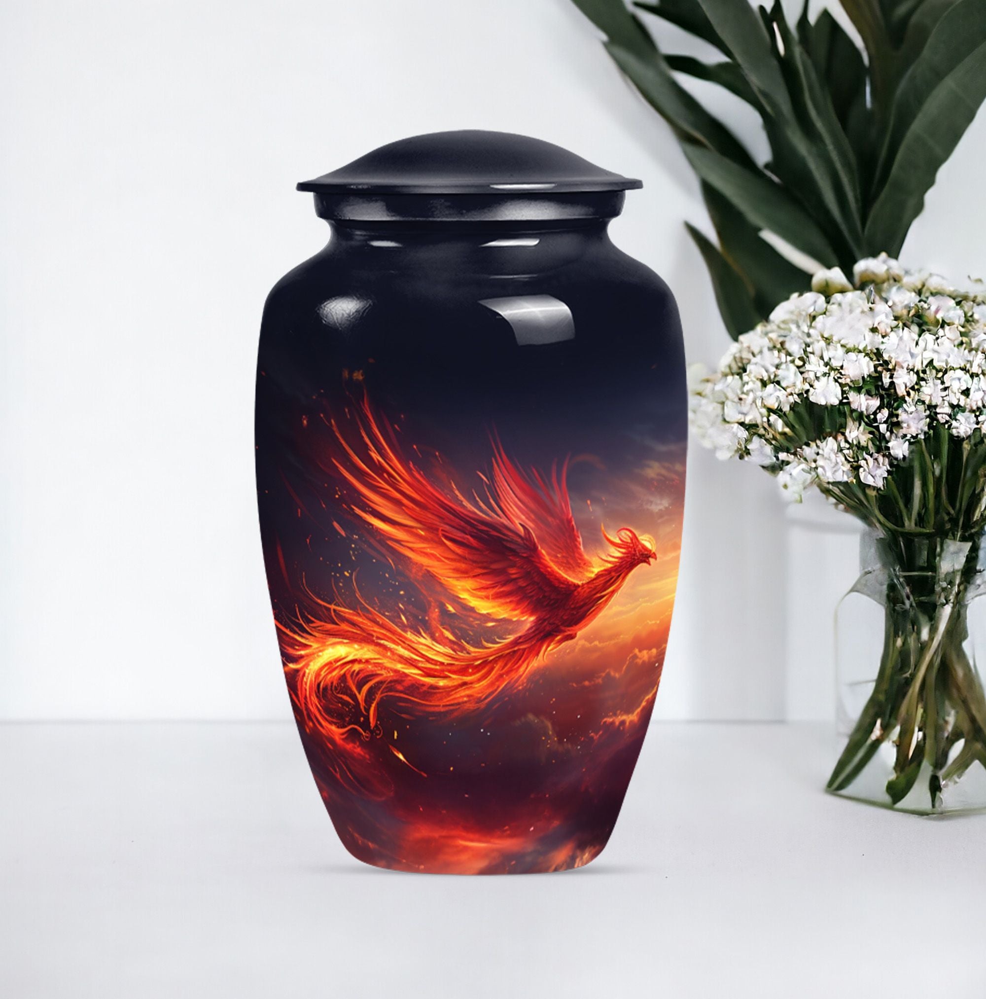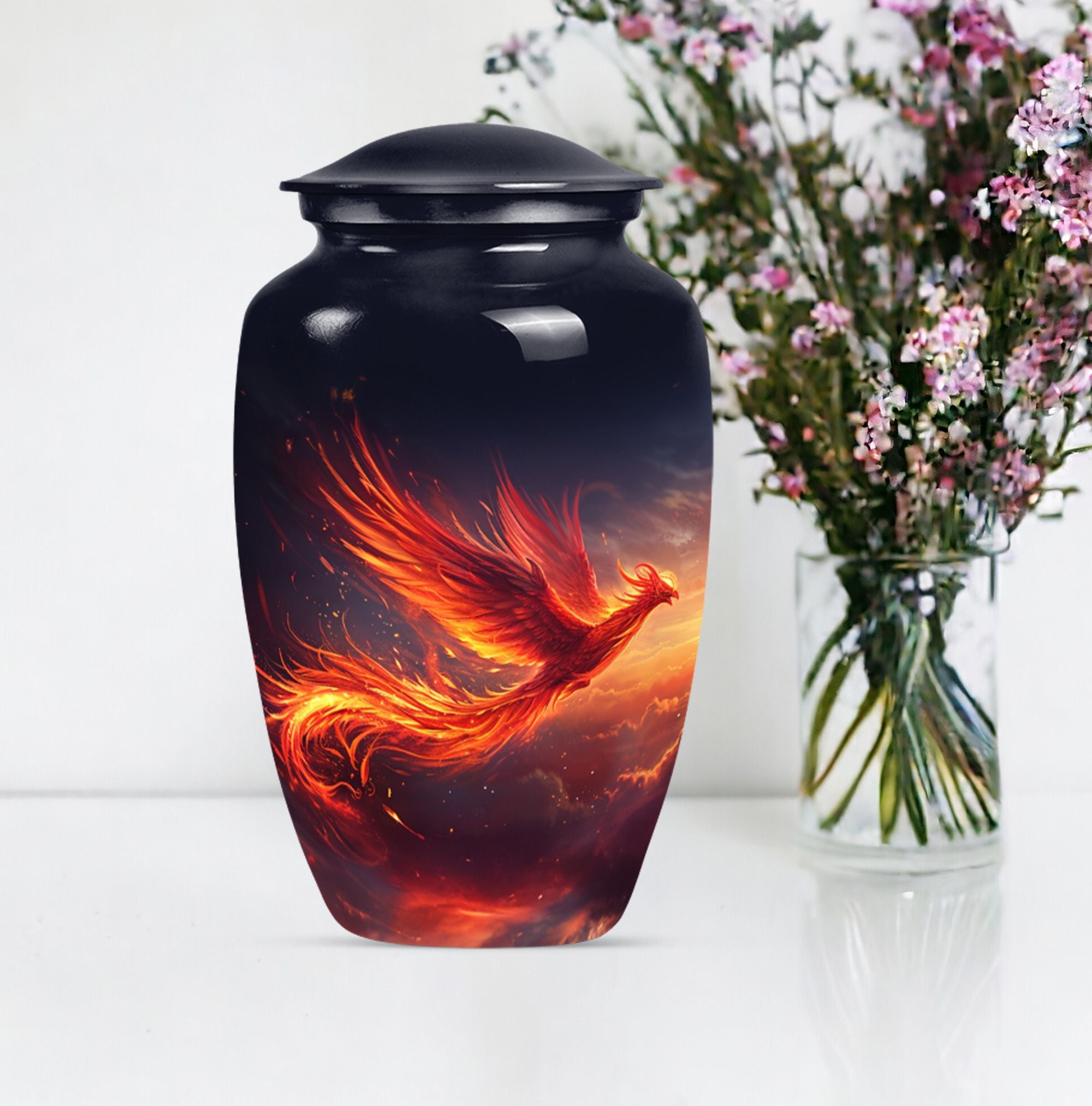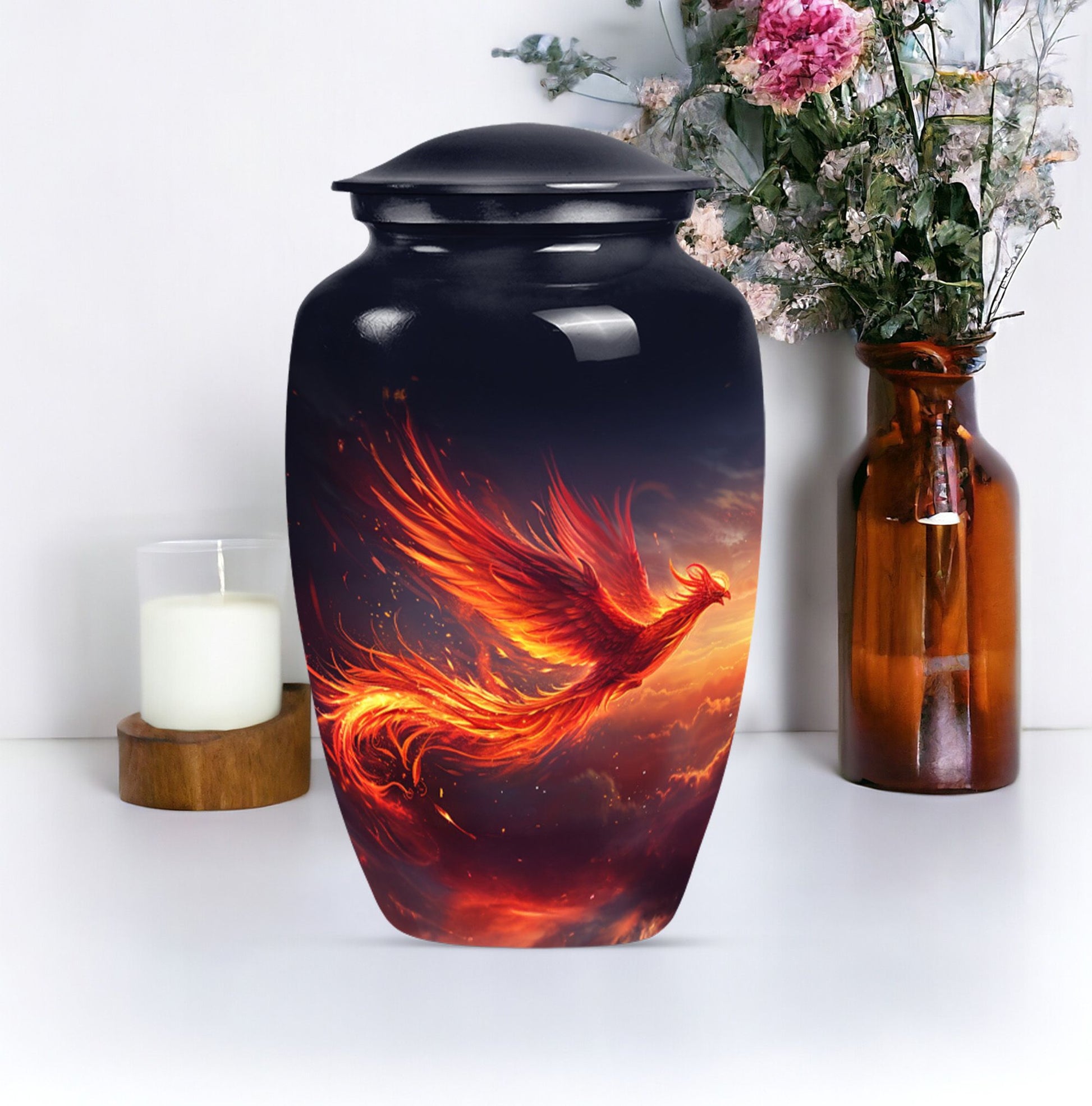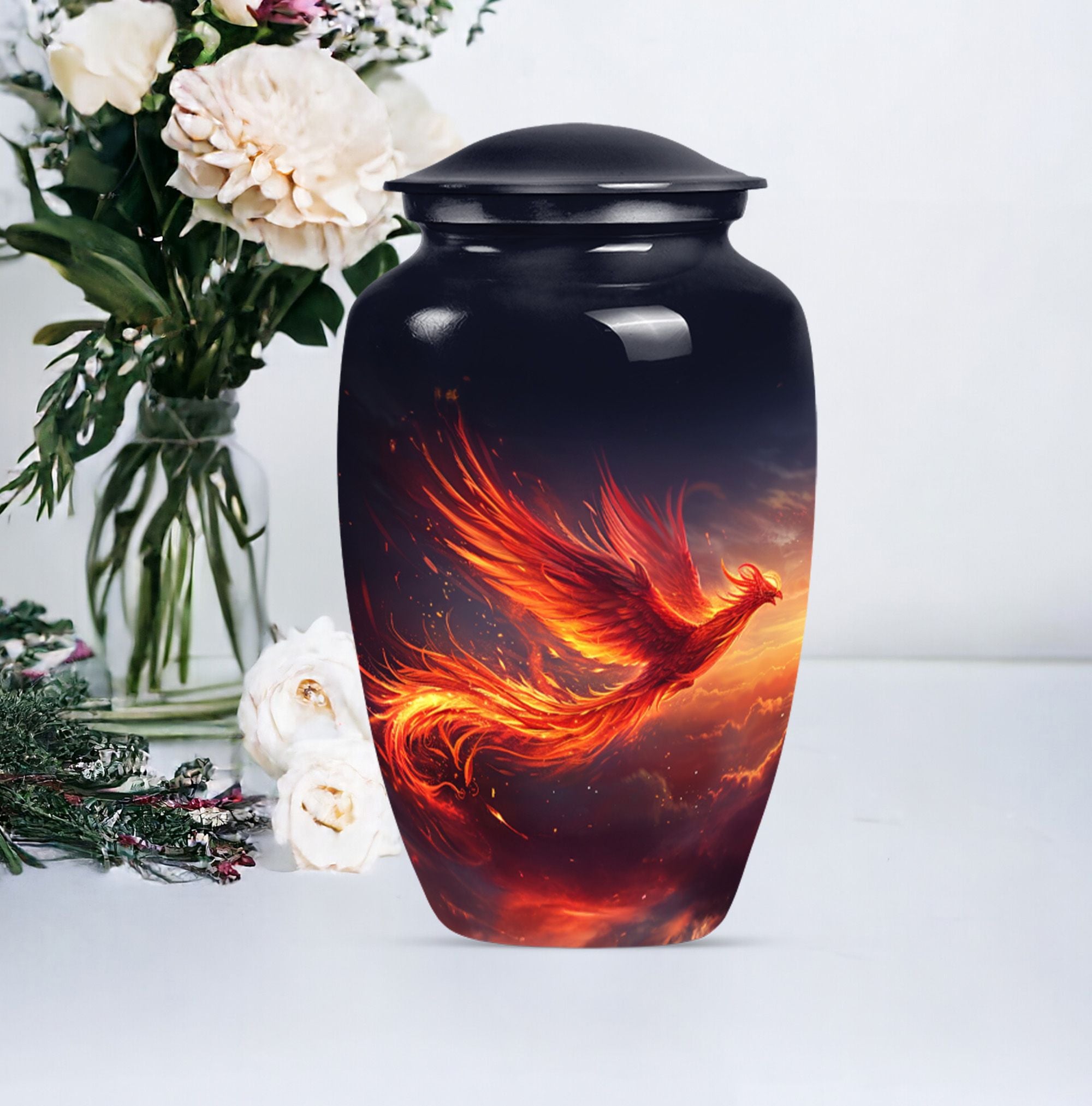 Honor your loved one with the dignified elegance of our Phoenix Urn, a top-quality large funeral urn. Created for adults and seniors alike, it measures a substantive 10 inches in height and weighs a sturdy 3.3 pounds. Every inch of this memorial urn is enveloped in the mesmerizing allure of an abstract theme, crafted meticulously from robust aluminium. Despite the large stature, the urn has a capacity to securely hold 200 cubic inches of ashes. The customization allows for personal engraving of names, making it an intimate choice for commemorating a loved one's journey. It comes with a velvet pouch which adds an extra layer of protection for the ashes. Besides being a vehicle of profound sentiment, the Phoenix Urn is the epitome of the term 'memorial adult urn', becoming a cherished token of precious memories. With the inclusion of 'funeral urn for mom', 'human urn ash adult', 'urns for ashes' and 'custom cremation urns' in your search, you're sure to find our urn that pairs strength with sensitivity.