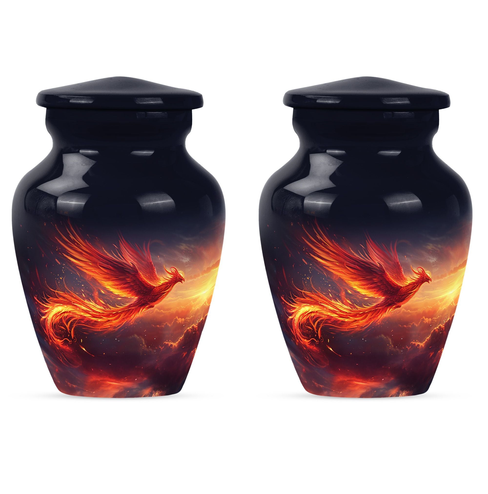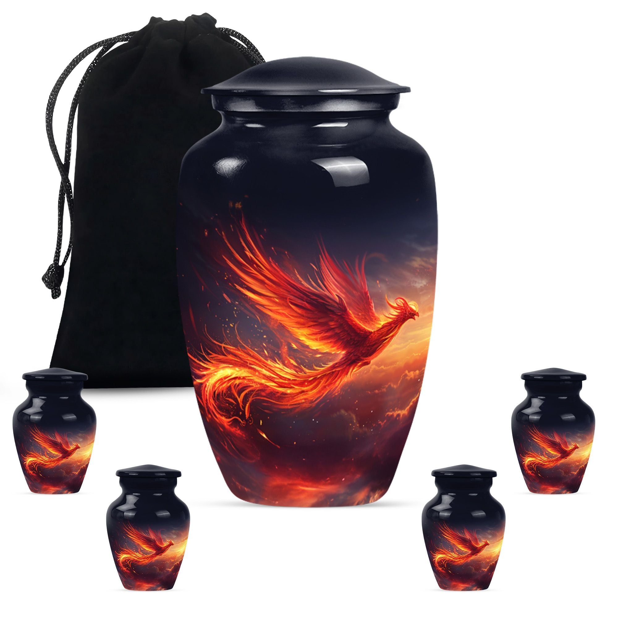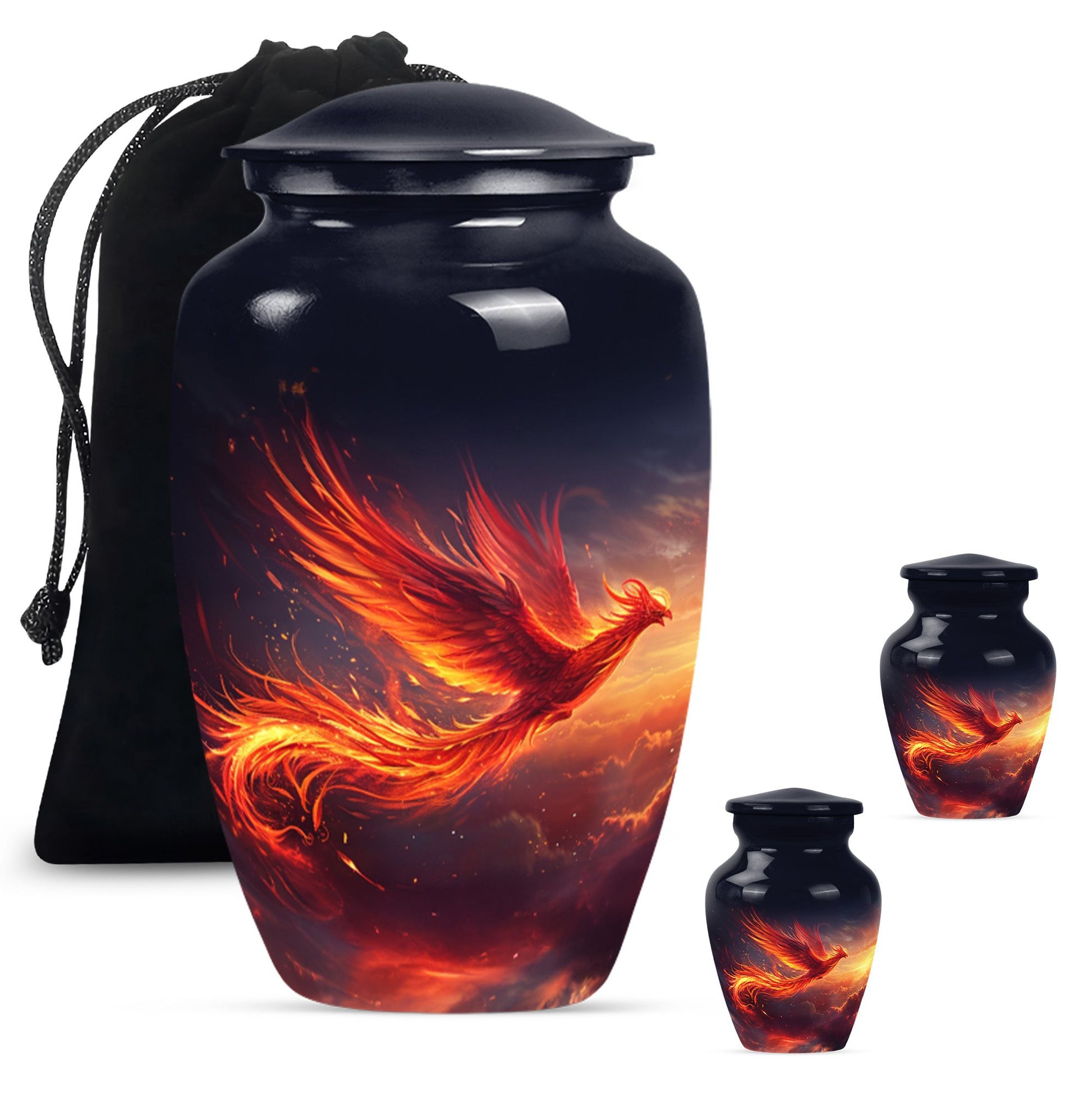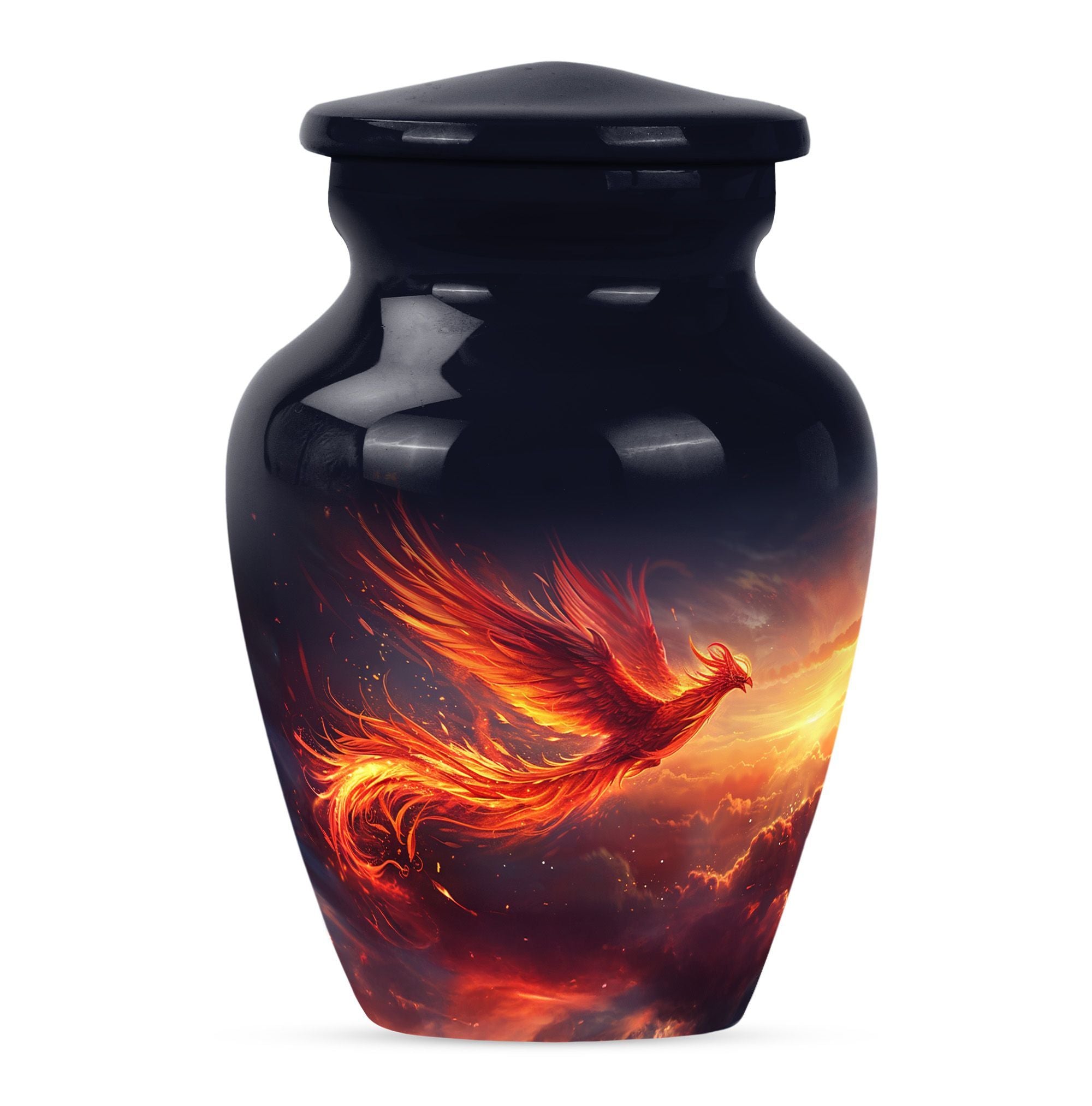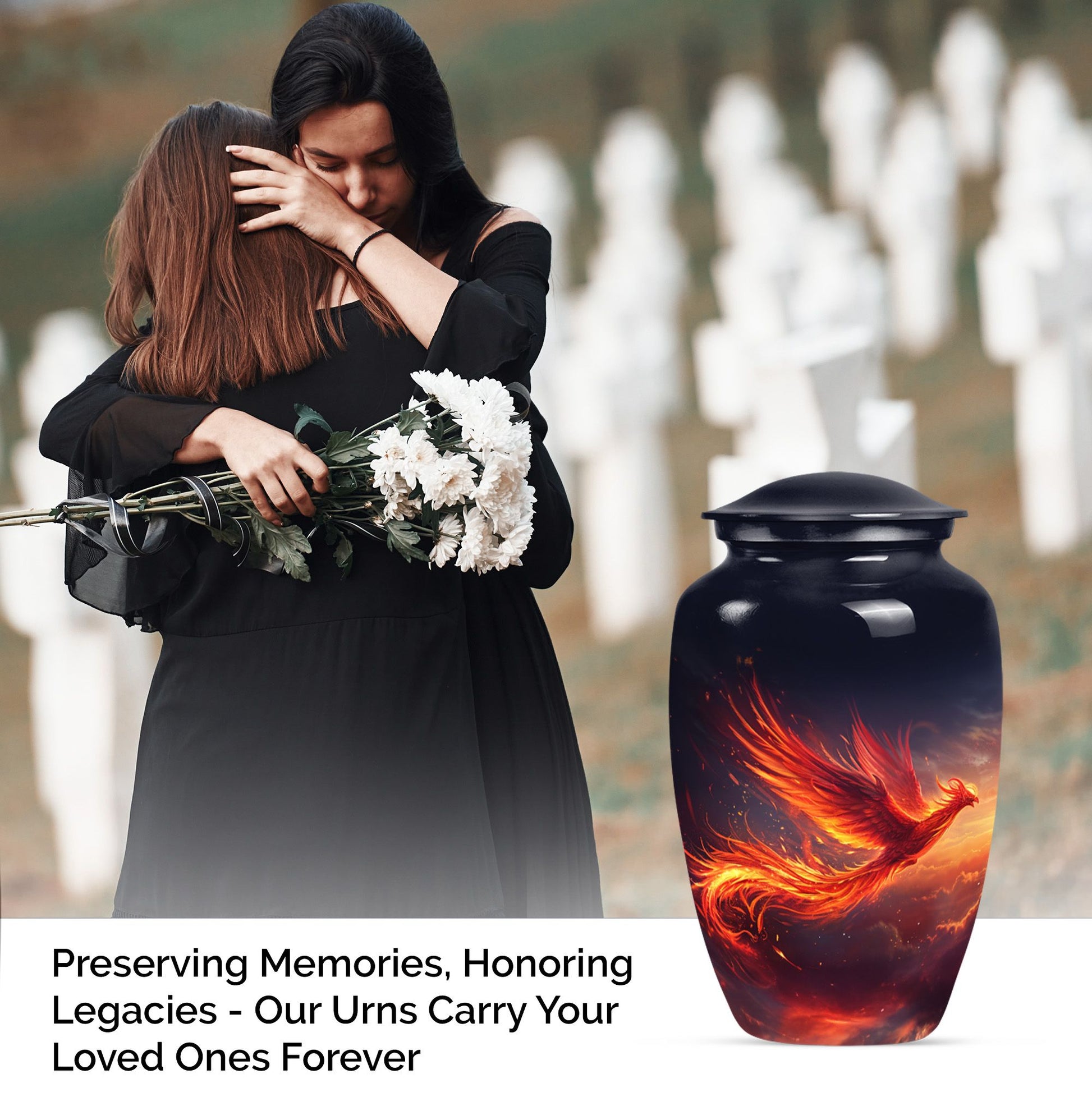 Honor your loved one with the dignified elegance of our Phoenix Urn, a top-quality large funeral urn. Created for adults and seniors alike, it measures a substantive 10 inches in height and weighs a sturdy 3.3 pounds. Every inch of this memorial urn is enveloped in the mesmerizing allure of an abstract theme, crafted meticulously from robust aluminium. Despite the large stature, the urn has a capacity to securely hold 200 cubic inches of ashes. The customization allows for personal engraving of names, making it an intimate choice for commemorating a loved one's journey. It comes with a velvet pouch which adds an extra layer of protection for the ashes. Besides being a vehicle of profound sentiment, the Phoenix Urn is the epitome of the term 'memorial adult urn', becoming a cherished token of precious memories. With the inclusion of 'funeral urn for mom', 'human urn ash adult', 'urns for ashes' and 'custom cremation urns' in your search, you're sure to find our urn that pairs strength with sensitivity.