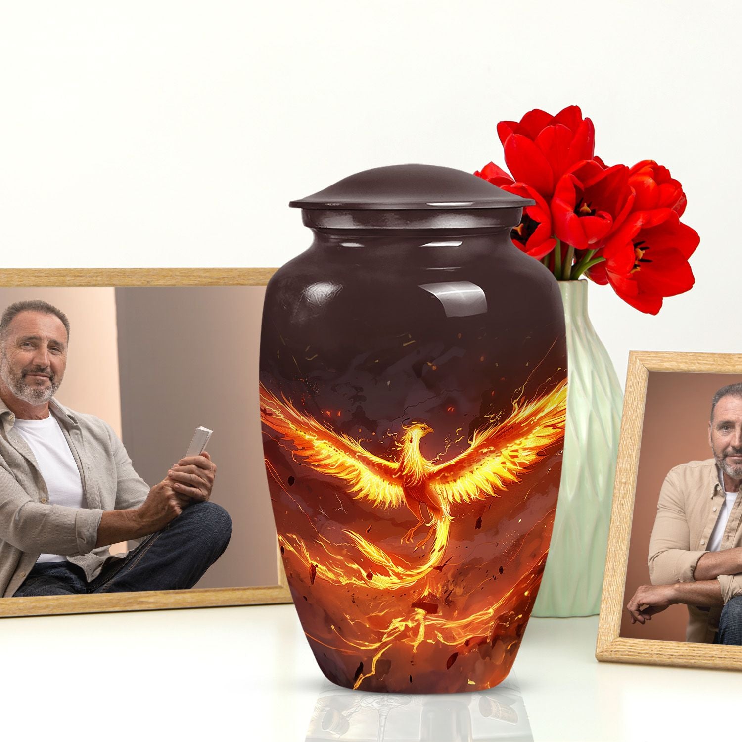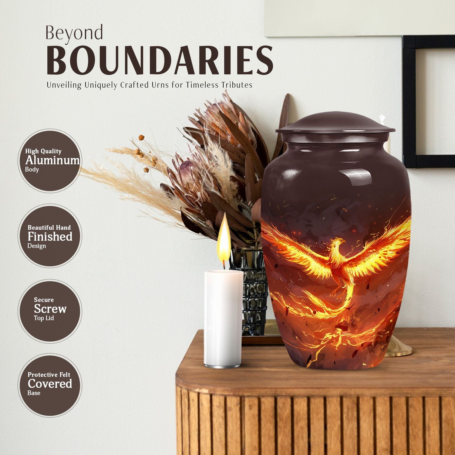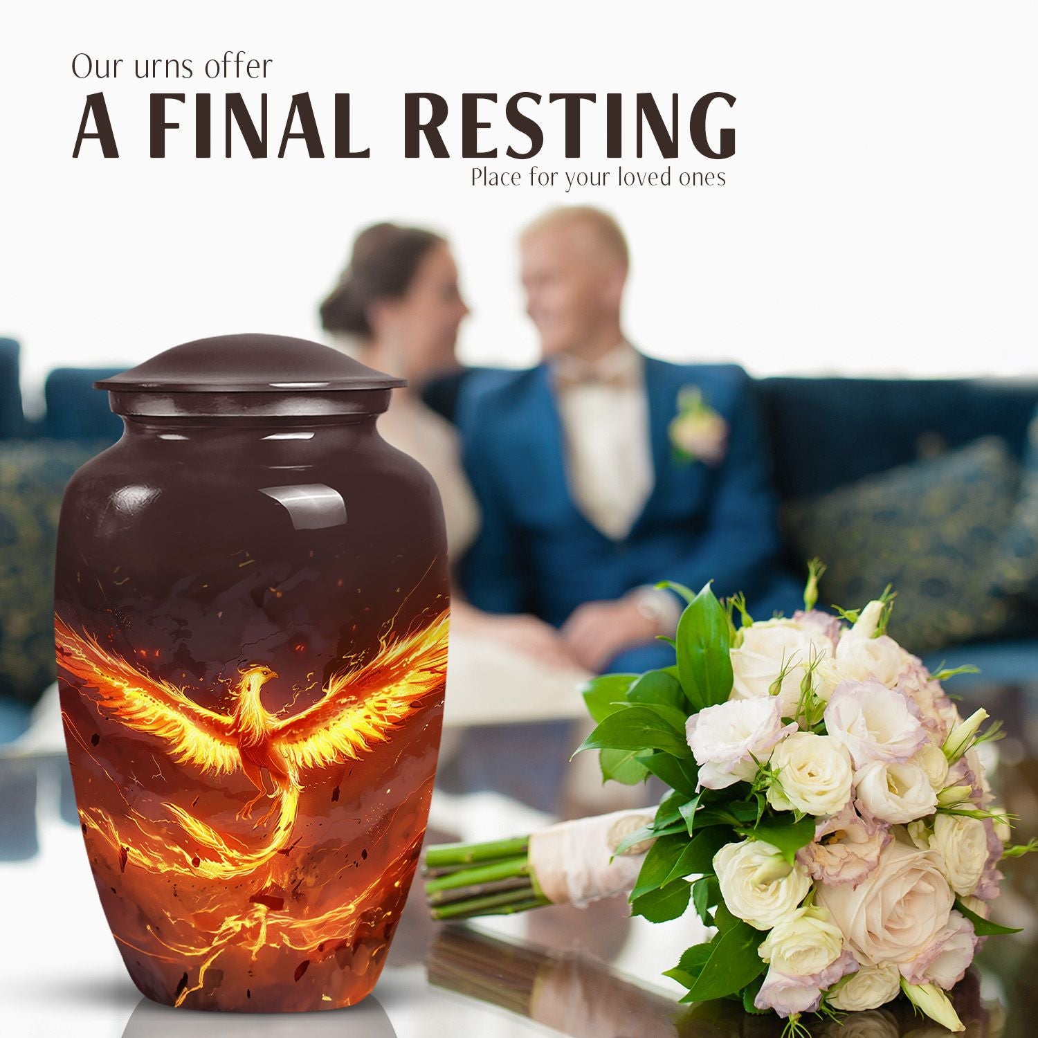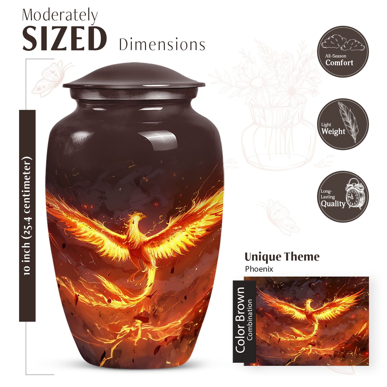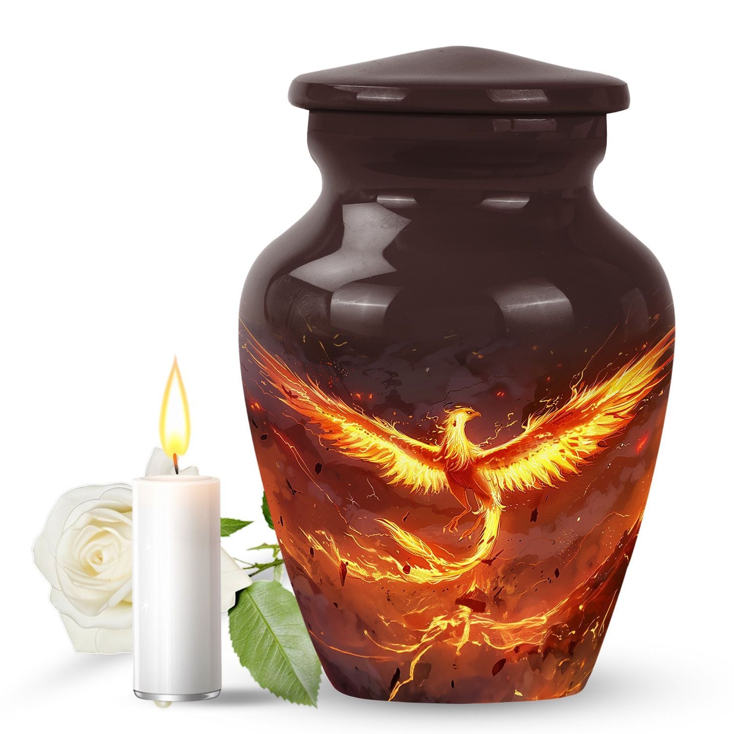 Honor your departed loved ones' memories with our Classic Phoenix Urn, a redefined memorial urn for male and female adults. This distinguished cremation urn stands elegant at 10 inches, crafted from durable aluminum and weighs a solid 3.3 pounds. Its abstract theme blends beautifully in any setting, symbolizing the eternal cycle of rebirth and regeneration, with a capacity to hold a woodsy 200 cubic inches of ashes. Think not just large urns - what sets our phoenix urn apart is its plaintive significance. Changing the way you commemorate, it offers a personal touch with an option to engrave names, silently voicing the unexpressed profound memories. The package comes complete with a velvet pouch bestowing a respectful containment for the ashes. Complementing the urn’s stature, it can even double as companion urns for two adults, a serene yet powerful beacon of remembrance. Say more than just love when you choose our Phoenix Urn, tell unforgettable stories of the heart.