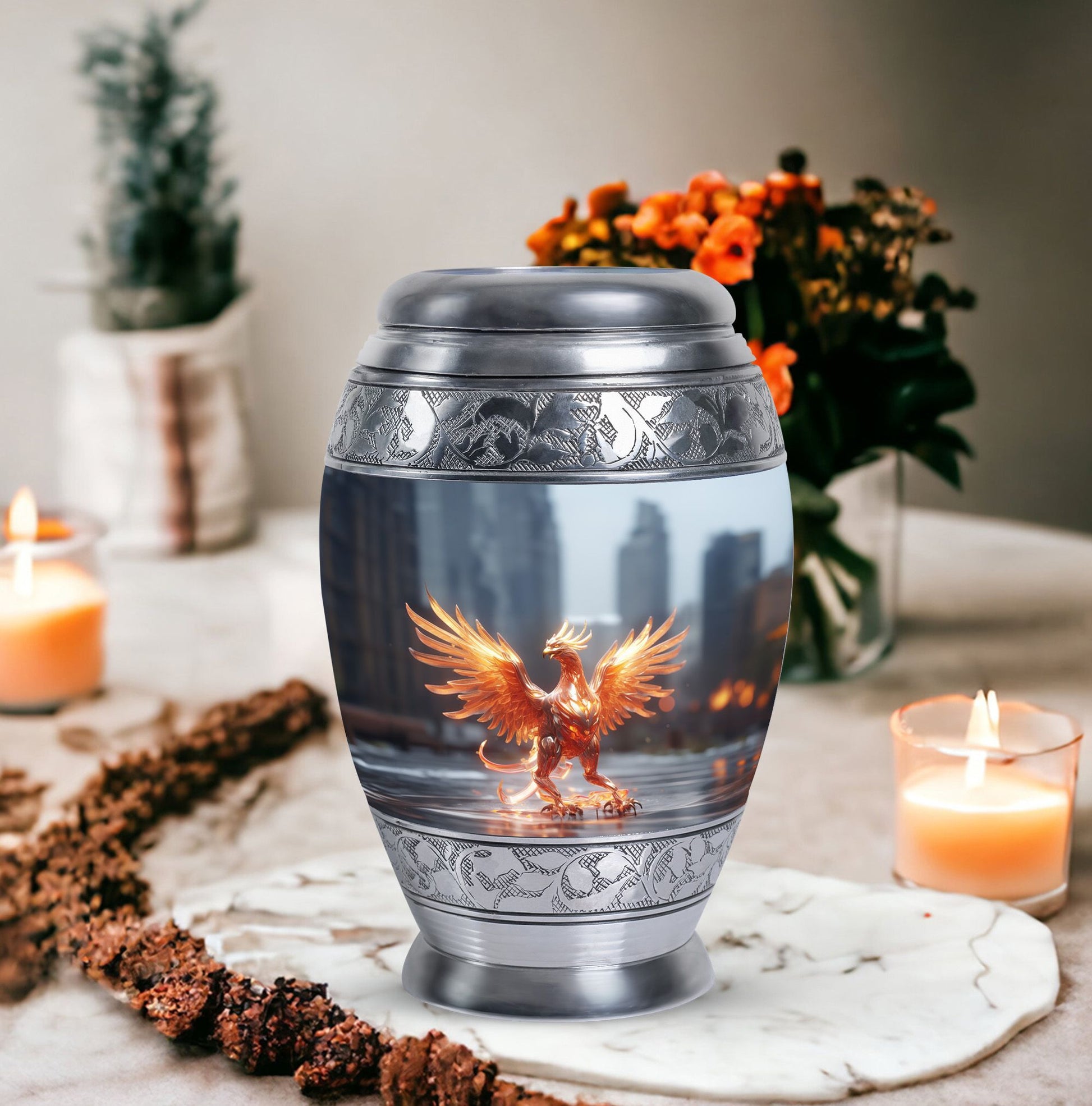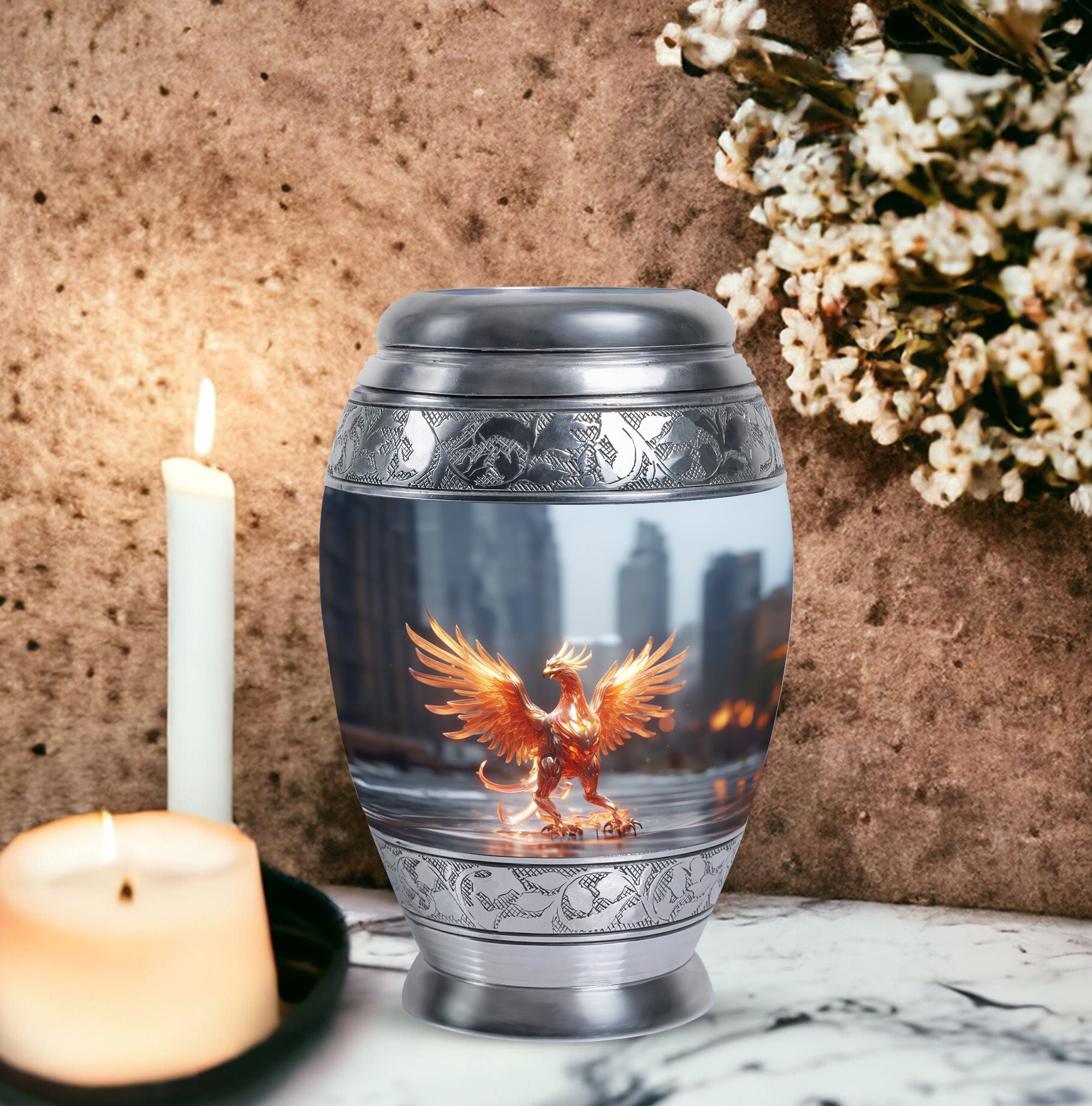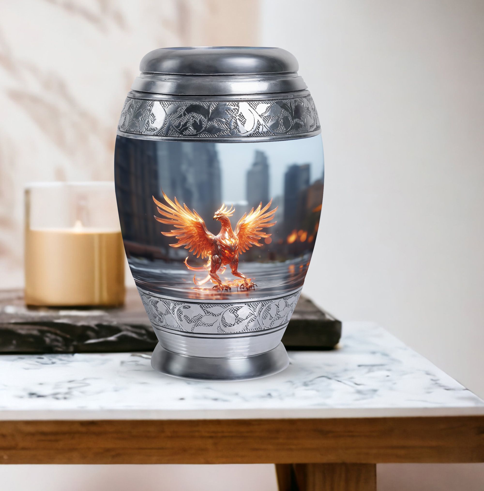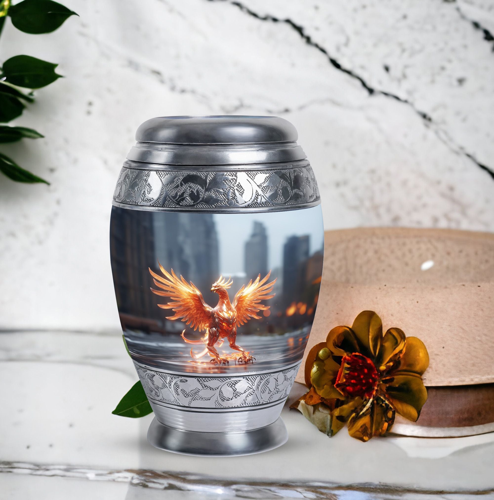 Bring everlasting peace to your departed loved one with our meticulously crafted Phoenix Memorial Urn. This large aluminium urn, known for its robustness and durability, stands 10 inches tall and weighs 3.3 pounds, making it both sturdy and enduring. Moreover, the urn includes enough capacity for 200 cubic inches of ashes, ensuring an apt resting place. Its reminiscing 'Elegant Memorial Urn' style coupled with the size of 3 inches, resonates pure solemnity and elegance, making it a rightful tribute to a cherished life. Along with the urn, you also receive a velvet pouch which can serve as a secondary containment for the ashes. To add a personal touch, you can have names engraved on the urn, truly making it a unique resting place your loved one deserves. The Phoenix Memorial Urn offers quality and dignity, echoing sentiments of 'sorry for your loss'. This urn makes the journey of life to after-life a little more comforting when shopping for burial urns for adults, urn containers, urns for Dad, and custom cremation urns.