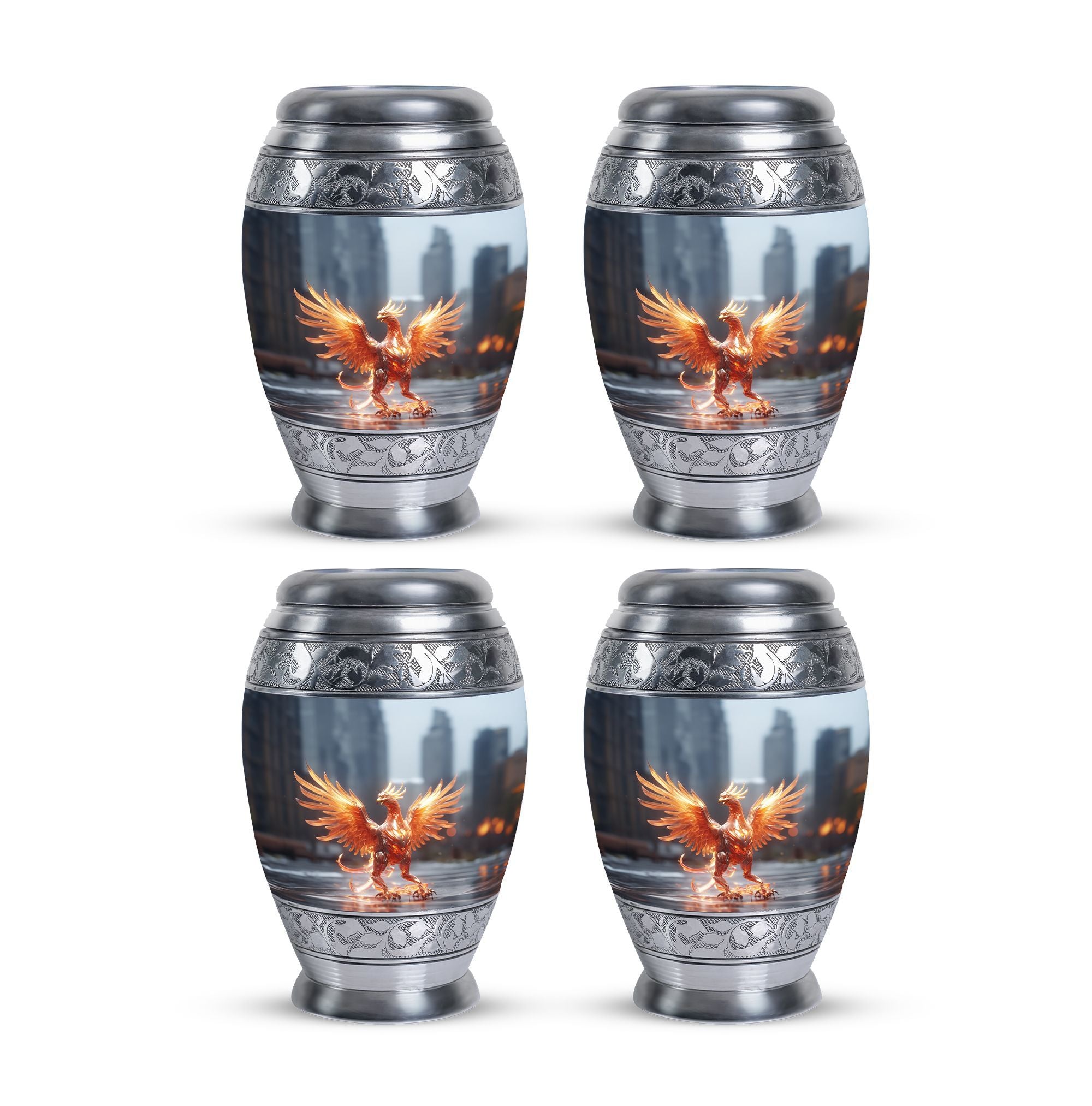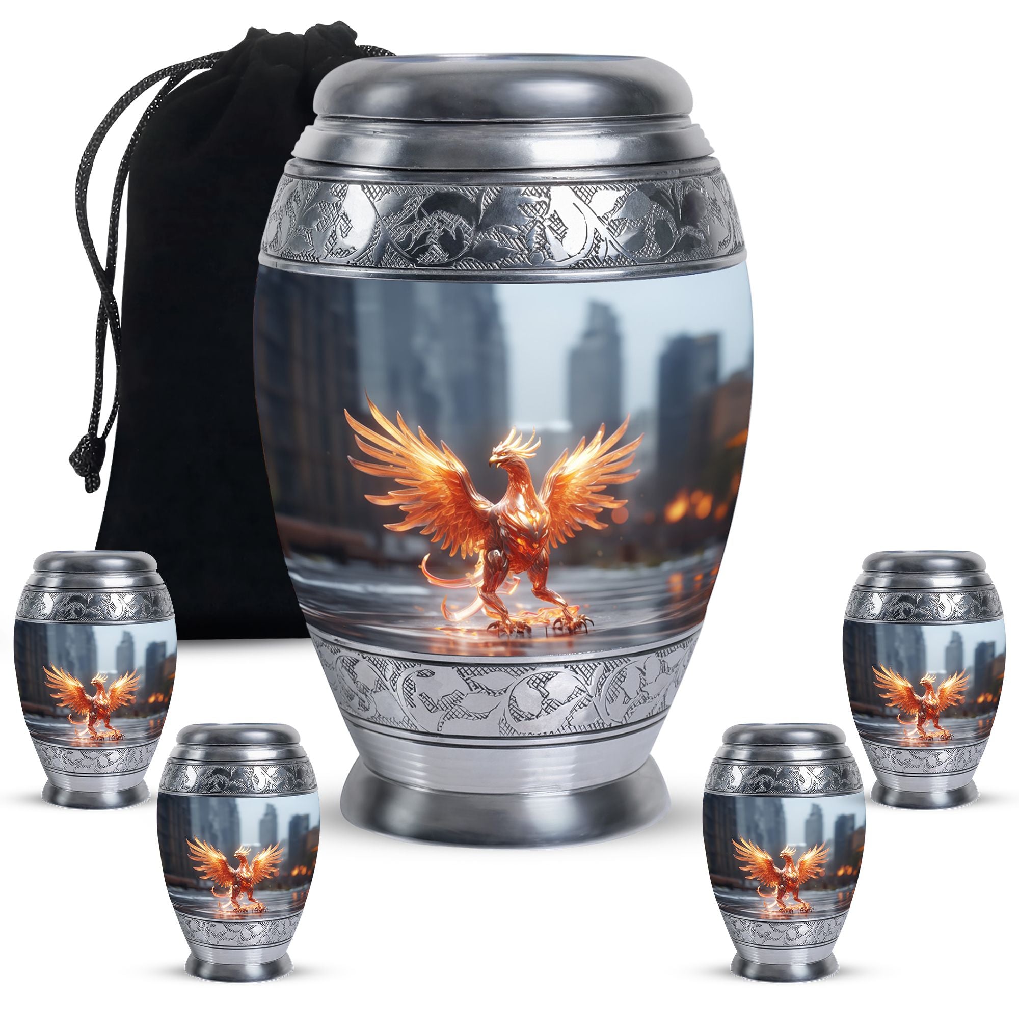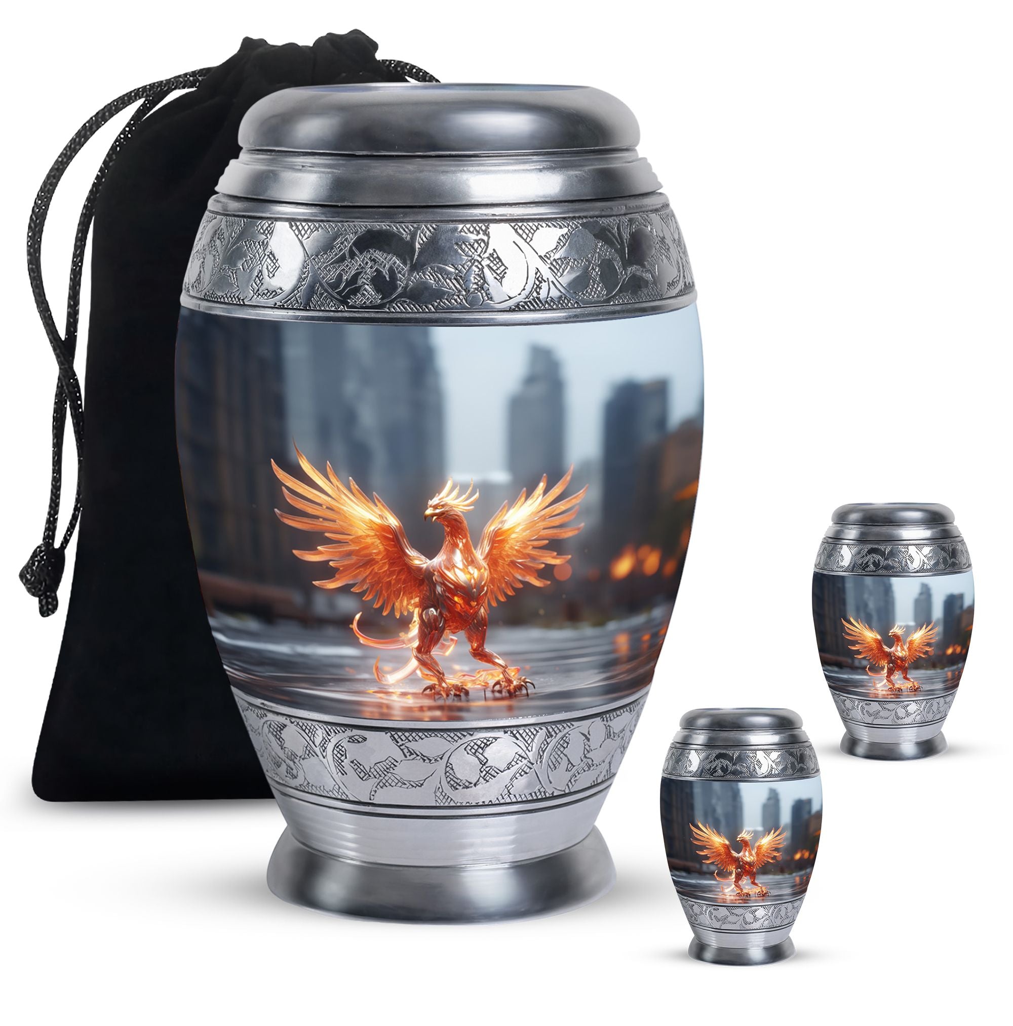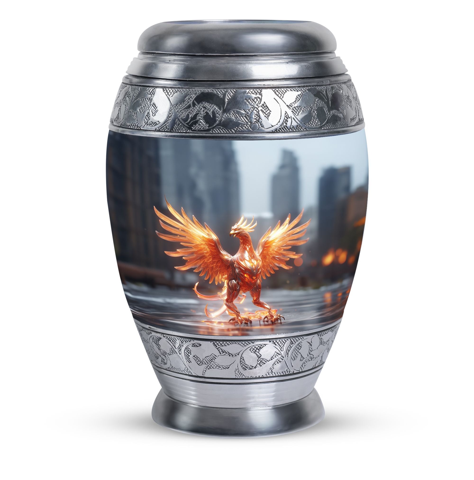 Bring everlasting peace to your departed loved one with our meticulously crafted Phoenix Memorial Urn. This large aluminium urn, known for its robustness and durability, stands 10 inches tall and weighs 3.3 pounds, making it both sturdy and enduring. Moreover, the urn includes enough capacity for 200 cubic inches of ashes, ensuring an apt resting place. Its reminiscing 'Elegant Memorial Urn' style coupled with the size of 3 inches, resonates pure solemnity and elegance, making it a rightful tribute to a cherished life. Along with the urn, you also receive a velvet pouch which can serve as a secondary containment for the ashes. To add a personal touch, you can have names engraved on the urn, truly making it a unique resting place your loved one deserves. The Phoenix Memorial Urn offers quality and dignity, echoing sentiments of 'sorry for your loss'. This urn makes the journey of life to after-life a little more comforting when shopping for burial urns for adults, urn containers, urns for Dad, and custom cremation urns.