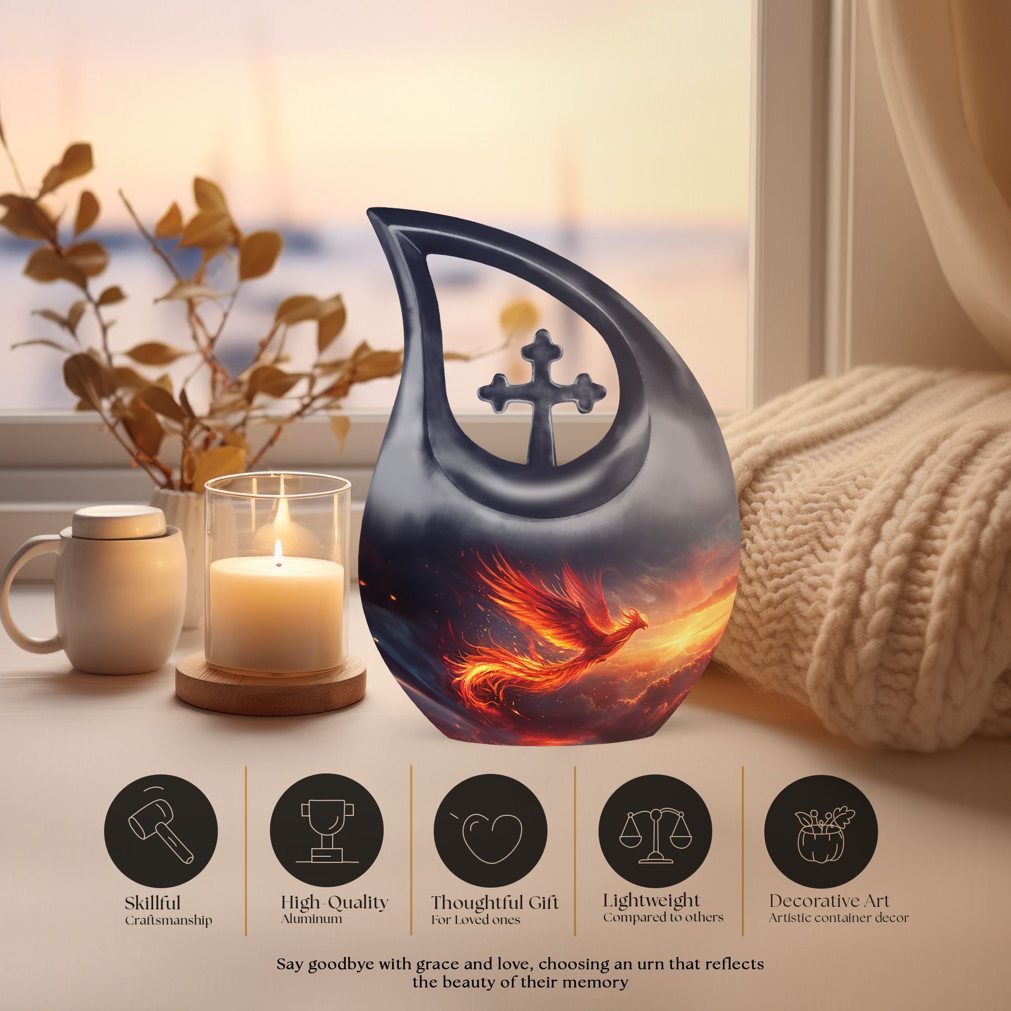 This Phoenix Bird Memorial Urn offers a heartfelt way to honor a cherished life, symbolizing renewal, strength, and eternal peace. Designed for families seeking funeral urns for human ashes, it brings comfort and meaning during moments of remembrance. Its gentle elegance makes it suitable for those needing an adult funeral urn or unique urns for ashes with emotional significance.