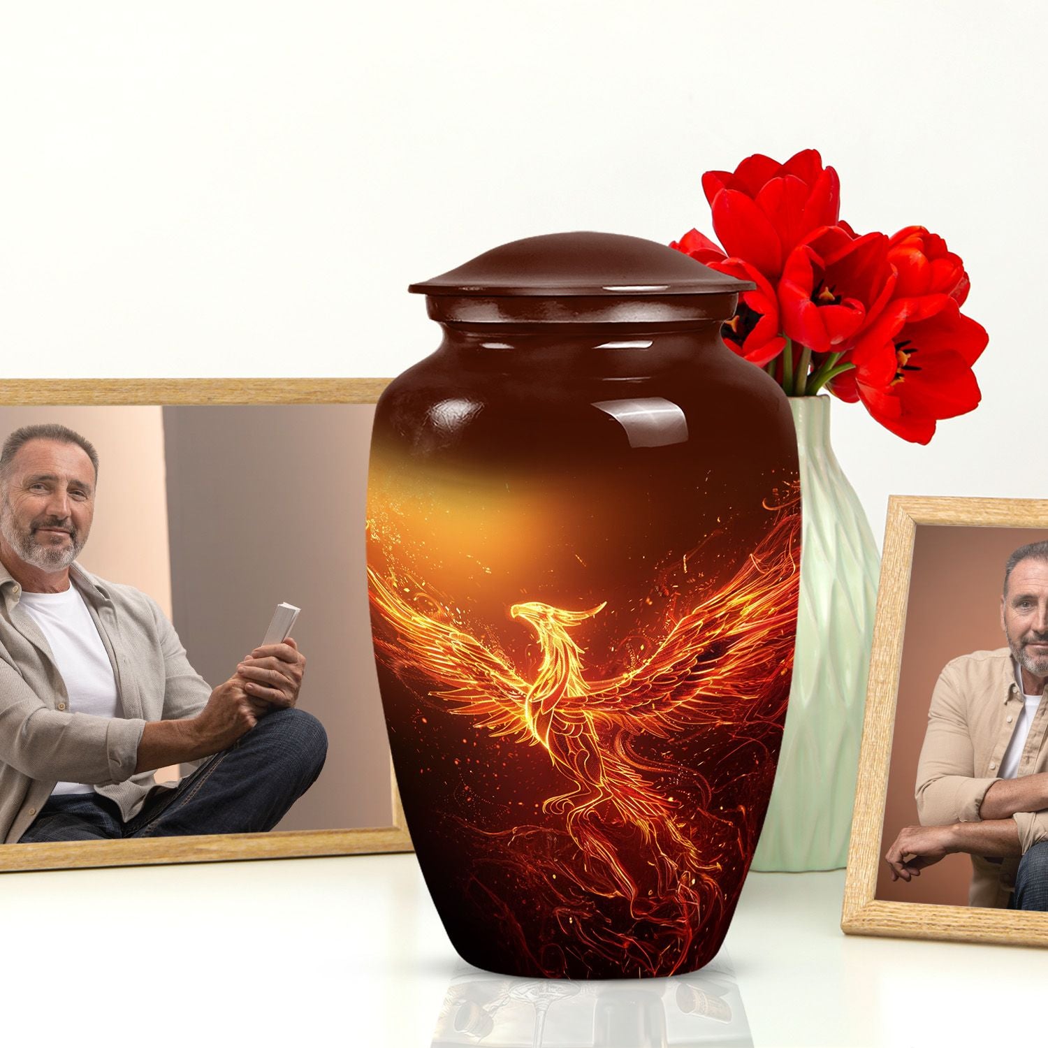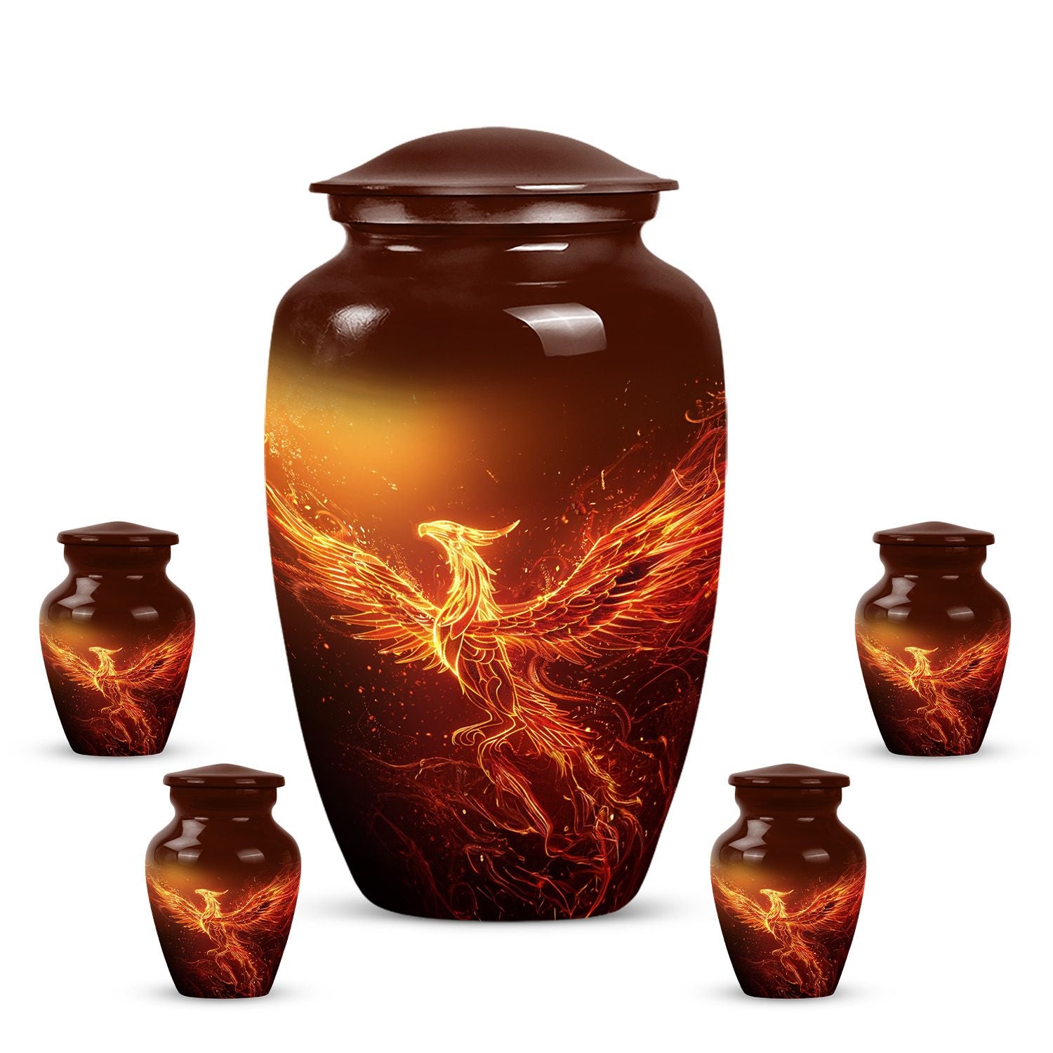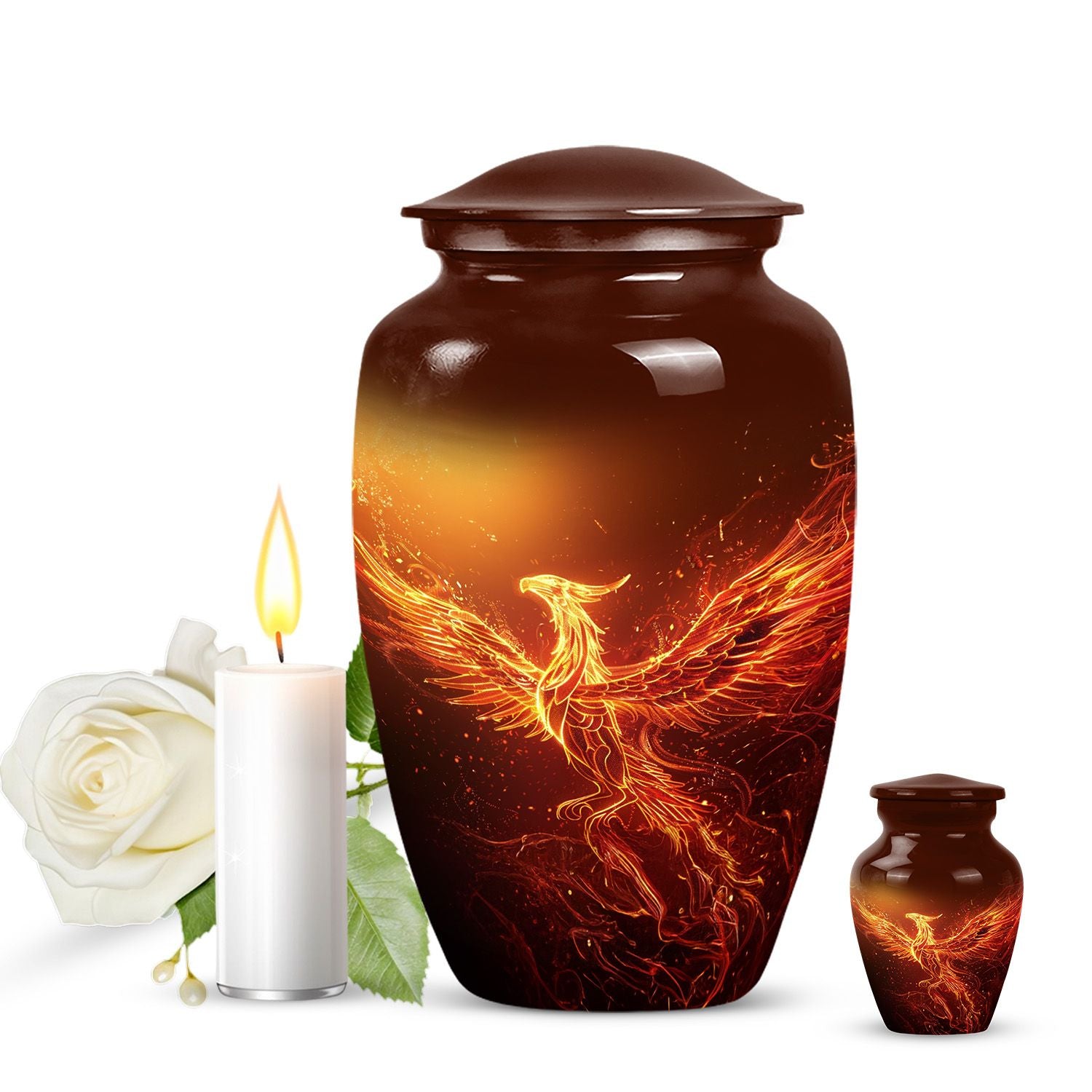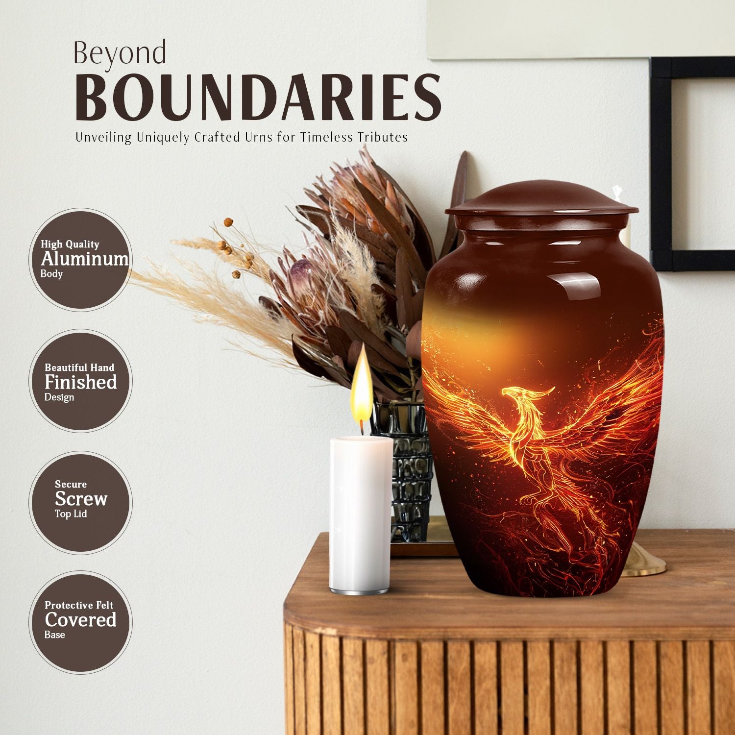 An exquisite tribute to your departed loved ones, this Phoenix Urn majestically captures the essence of life, survival, and rebirth. This burial urn, designed for adults and seniors, stands at a substantial 10 inches in height and weighs 3.3 pounds, embodying durability and permanence. Its intricate abstract theme is not only compellingly evocative but is sure to resonate with those looking for a touching tribute. The urn’s size and robust structure, large urns crafted from high-quality, resilient aluminium, offers a significant capacity of 200 cubic inches, providing ample space for lasting memories. To add a personalized touch, you can engrave names on it, making sure the memory of your loved ones never fades away. The urn comes with a velvet pouch, a respectful and sophisticated containment for the ashes, ensuring their sanctity. Whether you're looking for urns for a female adult, a dual urn for an adult male and female, or a metal urn for in-ground burial, this expansive and striking phoenix urn caters to all, leaving a lasting legacy for your beloved.