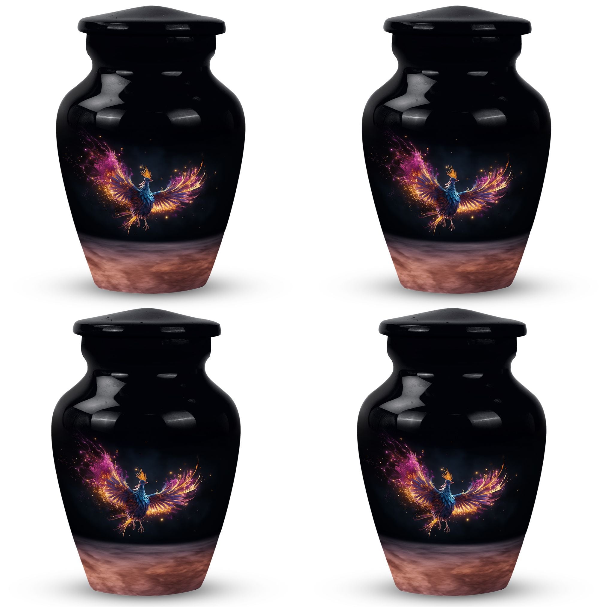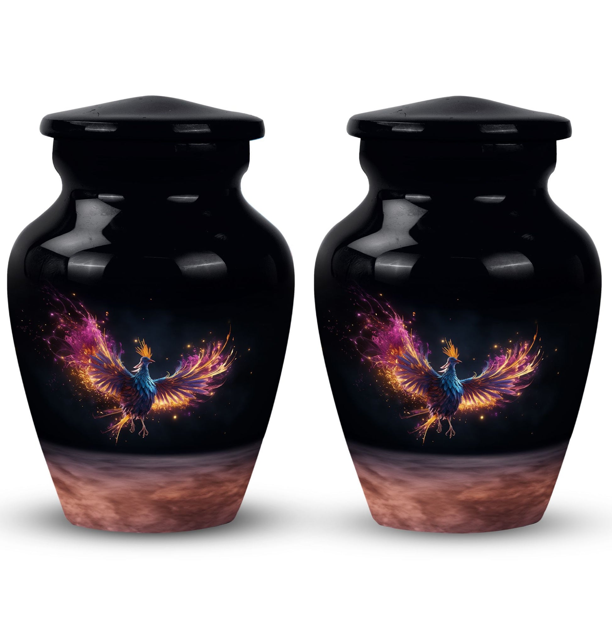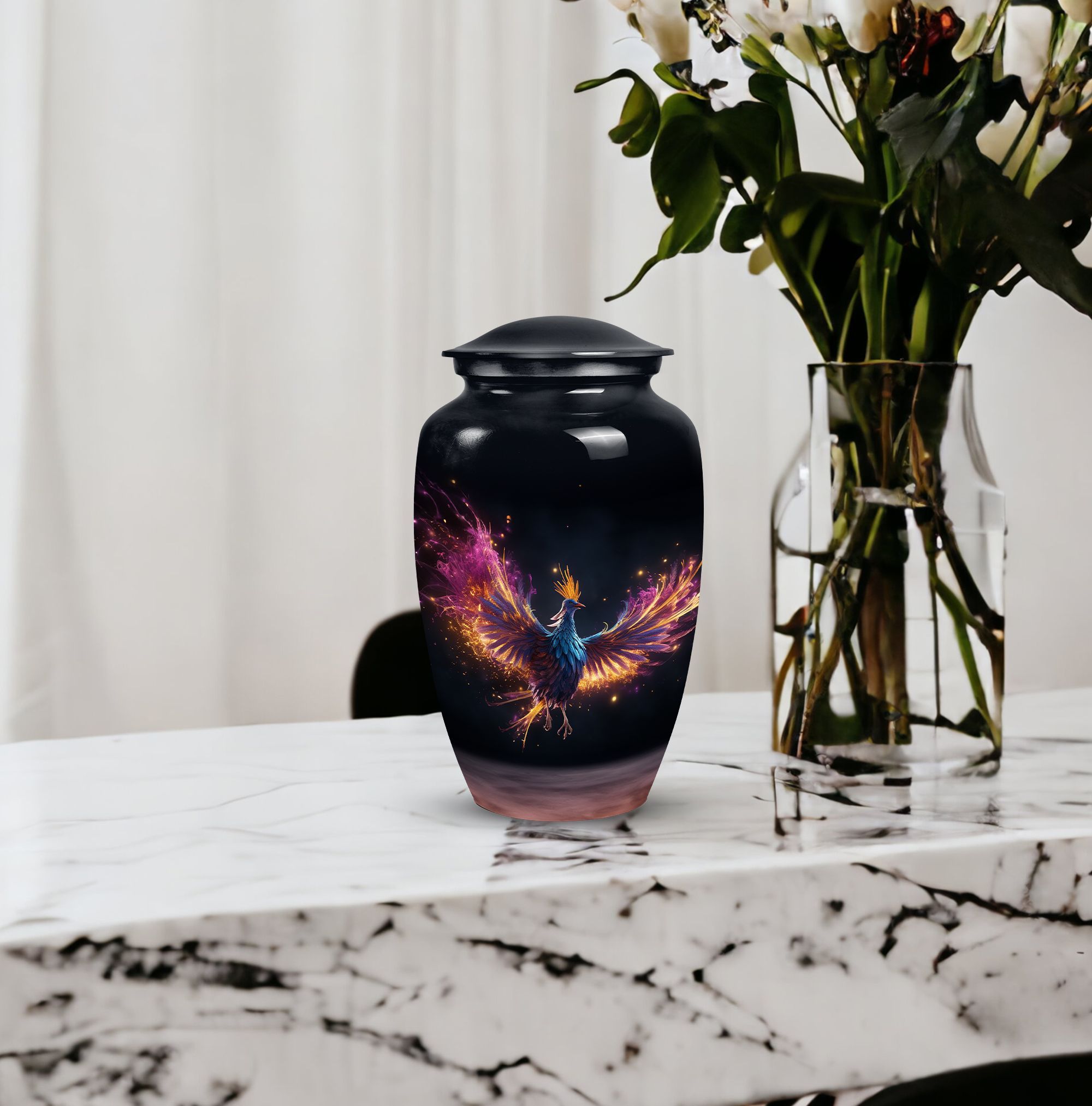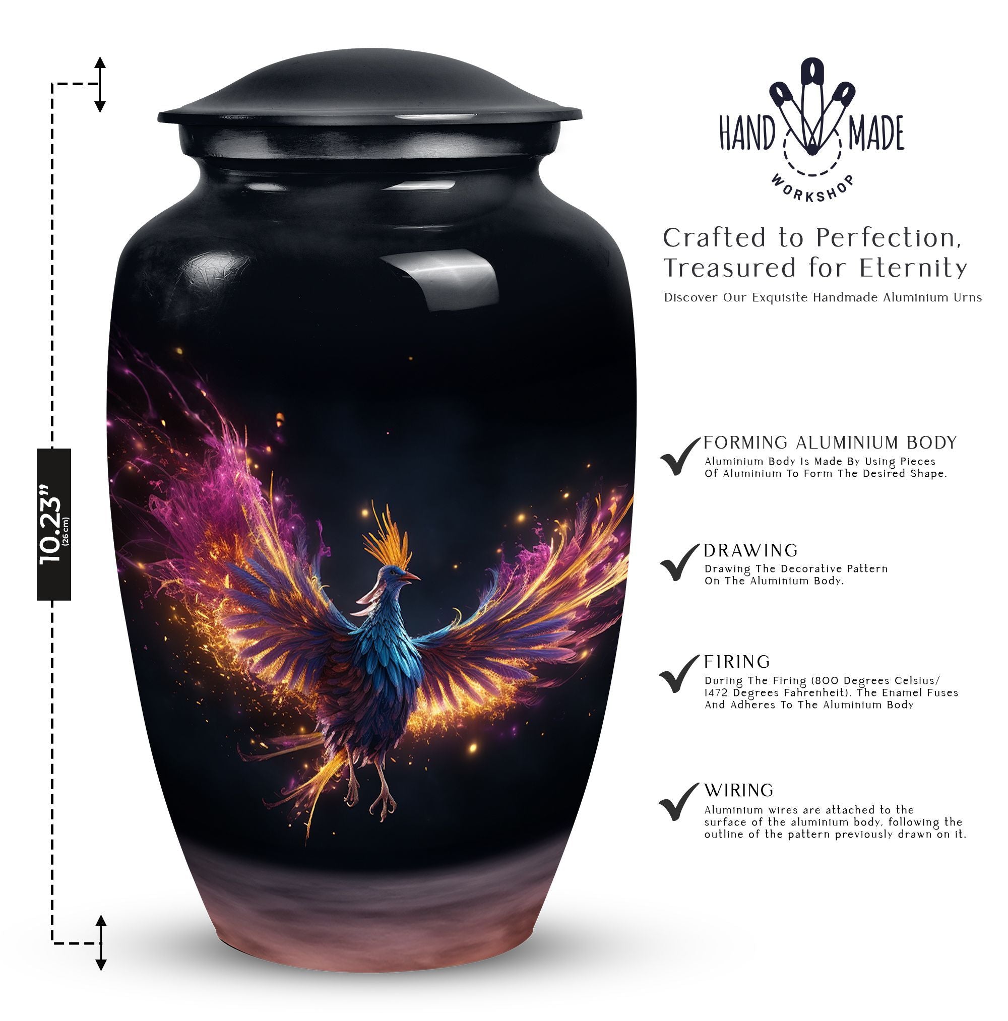 Introducing our exquisite Colorful Phoenix Urns for Human Ashes, a fitting tribute to commemorate your loved ones. As a special category of the large urns, this specific piece measures 10 inches in height and can hold up to 200 cubic inches of your cherished one's ashes. Besides its adequate size, this classic urn is molded from durable aluminium, ensuring lasting memory. Along with a tasteful 3-inch dimension, our urn comes with a weight of 3.3 pounds - offering a profound sense of substance and presence. Taking customization to the next level, we offer you the chance to personalize this urn by engraving names of your choice. Each purchase includes a velvet pouch for containment of ashes, adding an extra layer of elegance and safety to this valuable memorial urn. If you are in the market for small urns for ashes or other modern urn solutions, our collection is worth considering. Bring a unique and personalized edge to your memorial ceremony with our standout cremation urn.