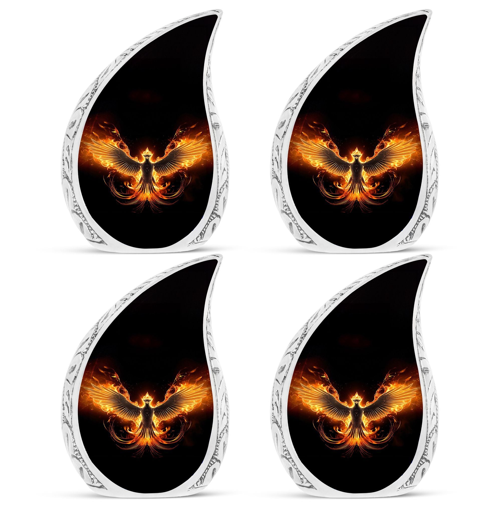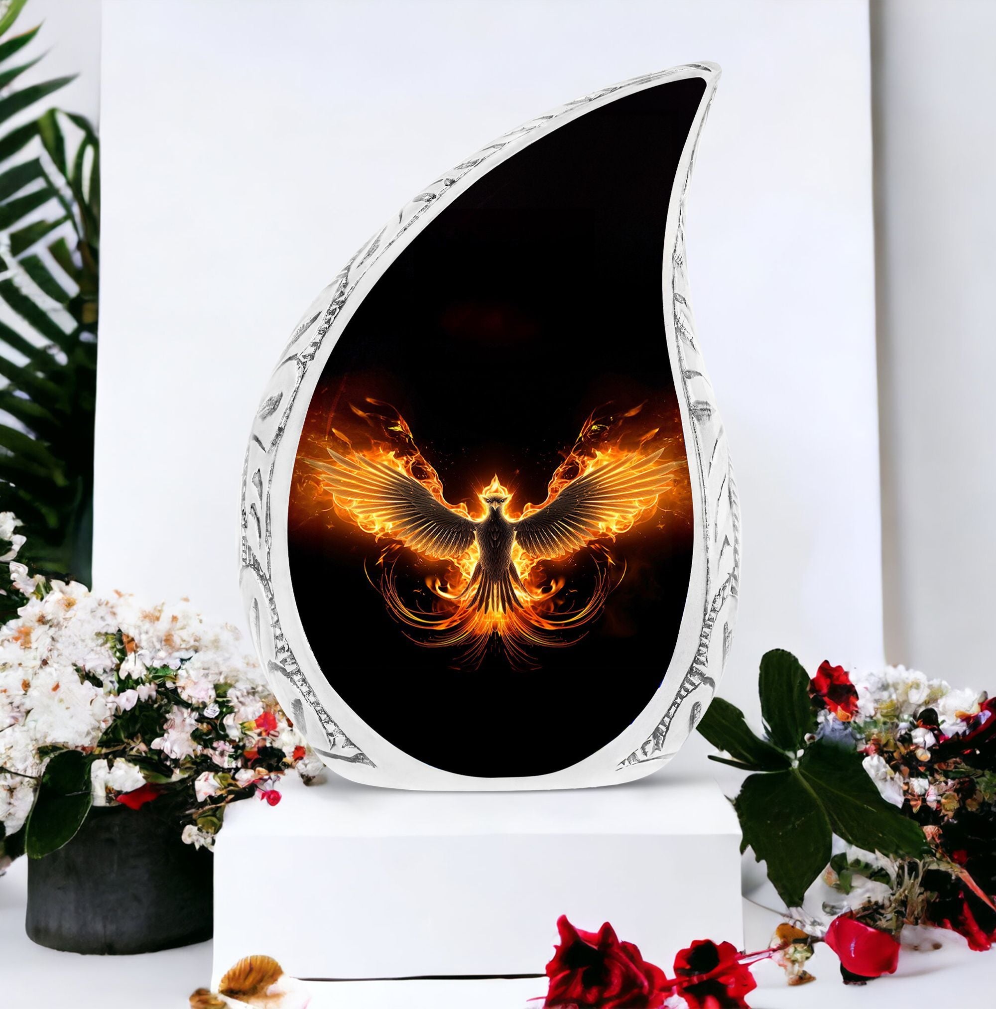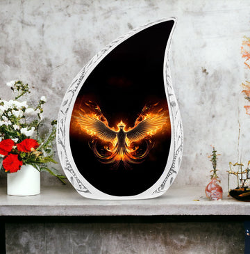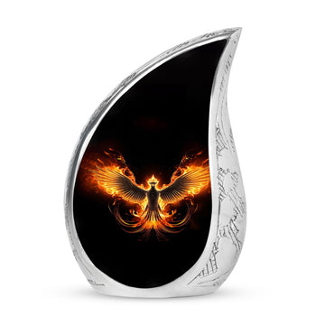 Immerse yourself in the rich symbolism of the Fire Phoenix Cremation Urn, epitomizing resurrection, rebirth and eternal life. Exquisitely crafted from superior Aluminium, this 3-inch urn offers ample space with a capacity of 200 cubic inches. Ensuring ease of mobility, it weighs a mere 3.3 pounds, standing 10 inches tall emitting undeniable presence. Adorned with a timeless 'Classic Urn' design, this Urn Container carries symbolic value and grandeur. This Large Urn proves ideal for adults and seniors looking for Burial Urns for Adults or customized Urns for Dad. To add an individual touch, you may Personalize the urn with engraved names, honoring your loved one’s memory uniquely. Additionally, the pack includes a dedicated velvet pouch for secure containment of ashes. Carefully designed to bring comfort during tough times, the Fire Phoenix Cremation Urn stands as an embodiment of love, respect, and eternal remembrance.