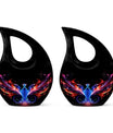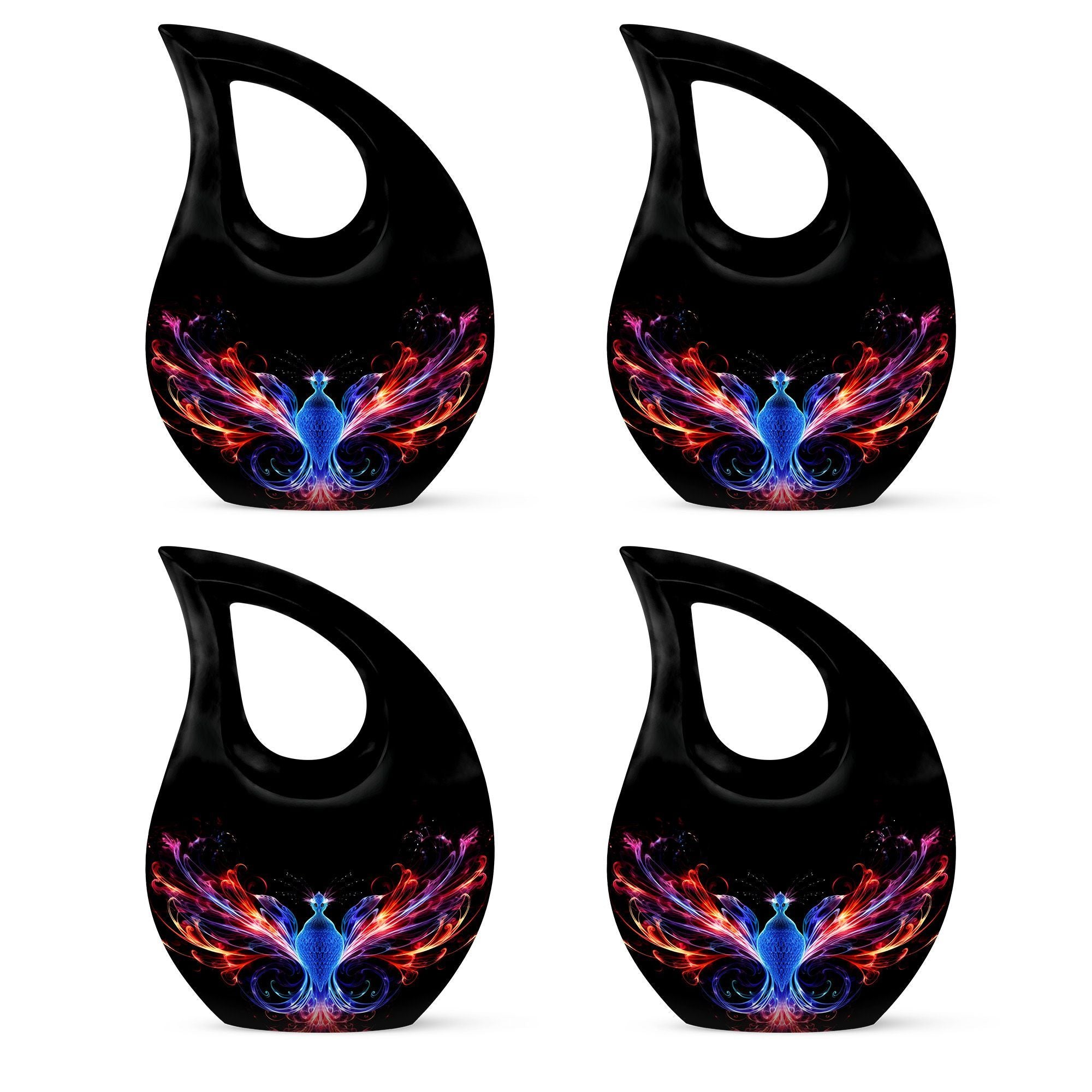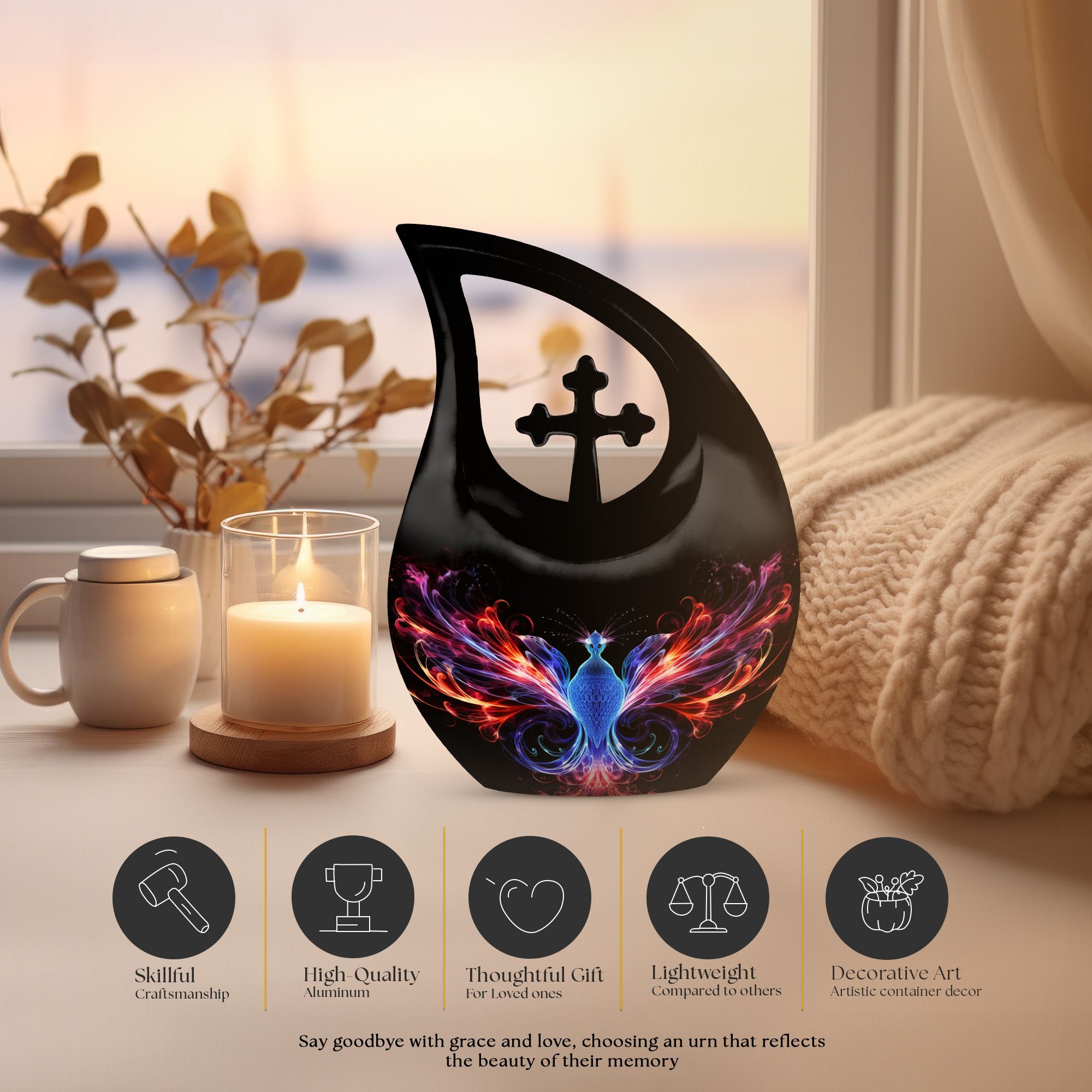 Expertly handcrafted from durable aluminum, this large cremation urn features a deep black body illuminated by vibrant peacock hues swirling in abstract nebula patterns — symbolizing life, eternity, and transformation. The secure screw-top lid ensures ashes are safely preserved, while the elegant design makes this large urn for ashes for women or men a perfect centerpiece for memorial displays or burial ceremonies.