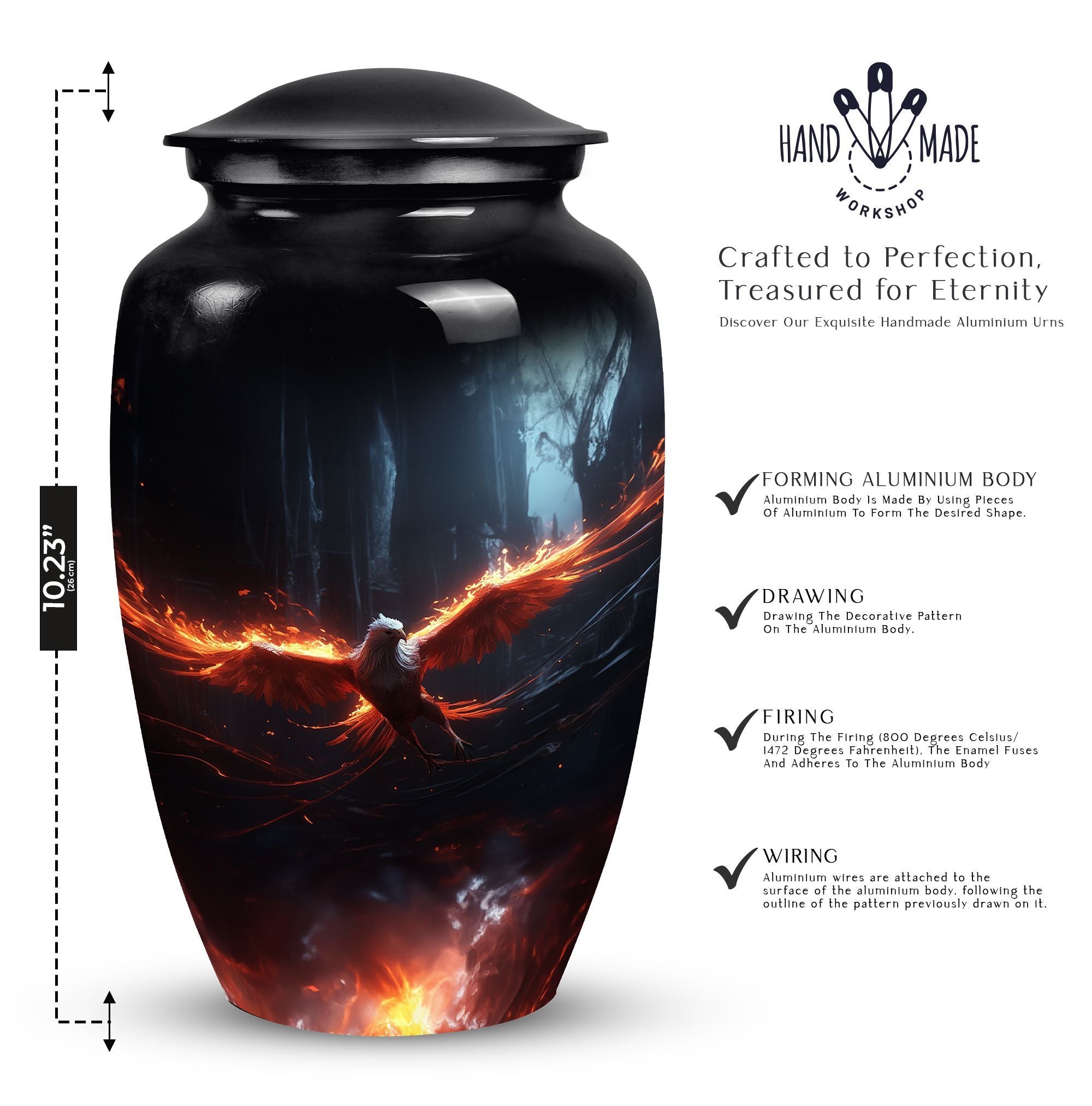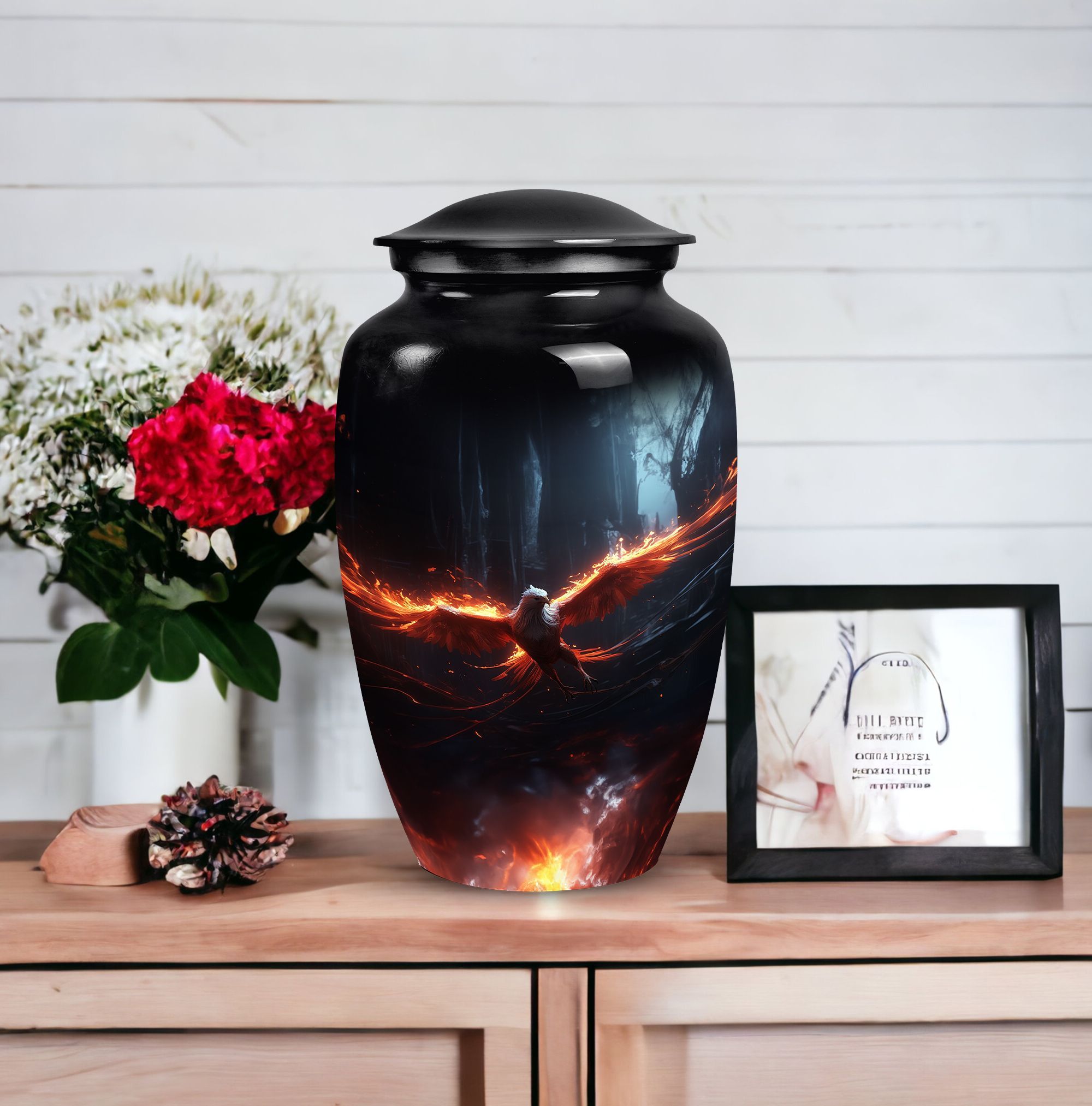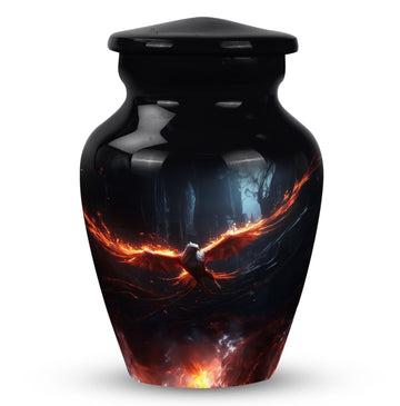 Our Phoenix Cremation Urn offers a high-quality, durable solution for those seeking distinctive memorial gifts. This large-sized urn, crafted from robust aluminium, exhibits a beautiful classic urn design. Its larger size, measuring at 10 inches in height and capable of holding 200 cubic inches of material, ensures ample space for containment of ashes. The product packaging includes a luxurious velvet pouch to safely and respectfully store your loved one's remains. The urn's weight is a stable 3.3 pounds, which offers a sense of physical remembrance. Break away from common urn aesthetics with a Phoenix Cremation Urn. This product is also customizable; engrave names to cherish and remember your loved one in a deeply personal way. This urn is not just a vessel, but a symbol of homage, perfect for personalized gifts for adults. With the Phoenix Cremation Urn, keep the light of memory, love and respect forever bright.