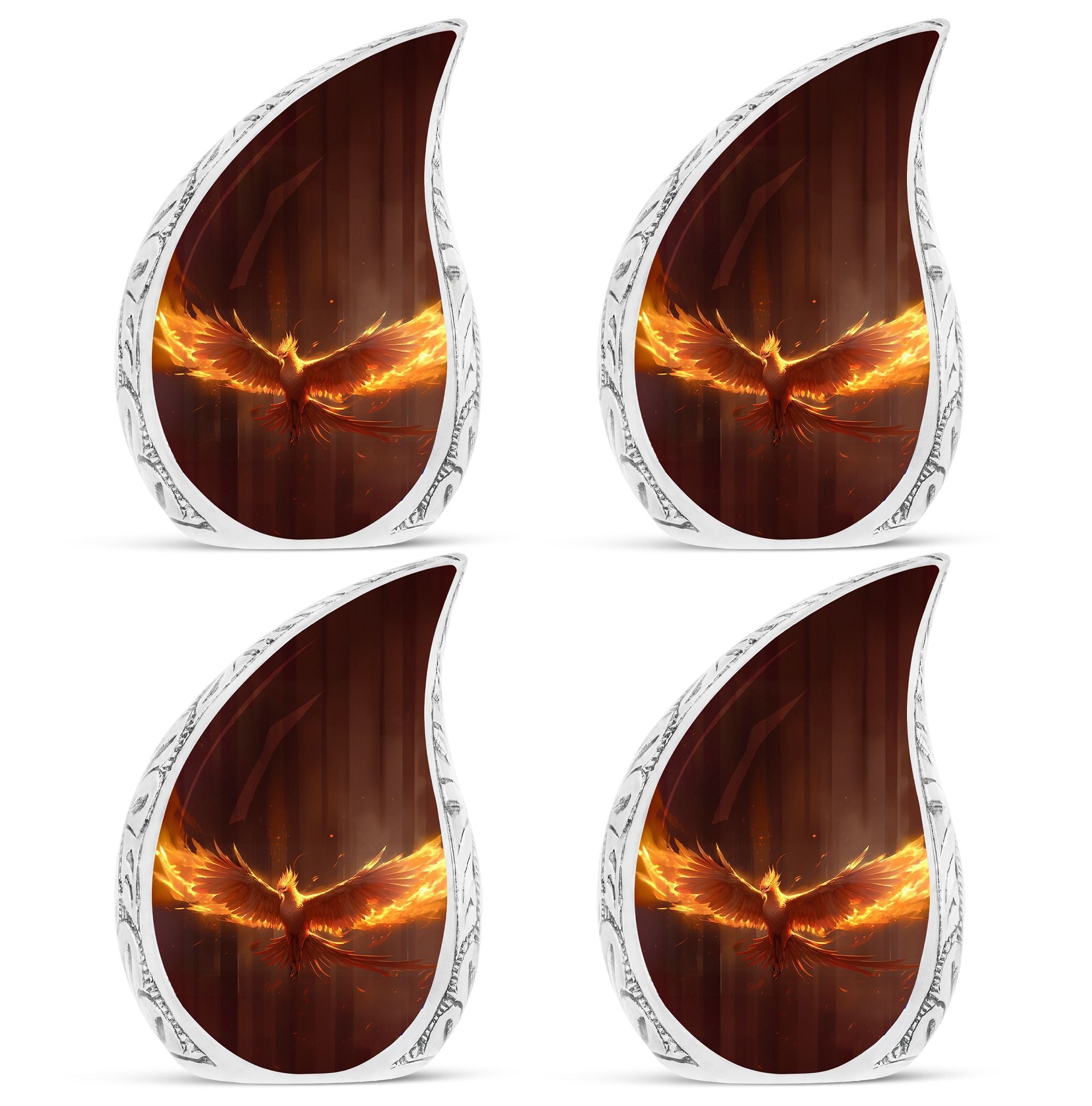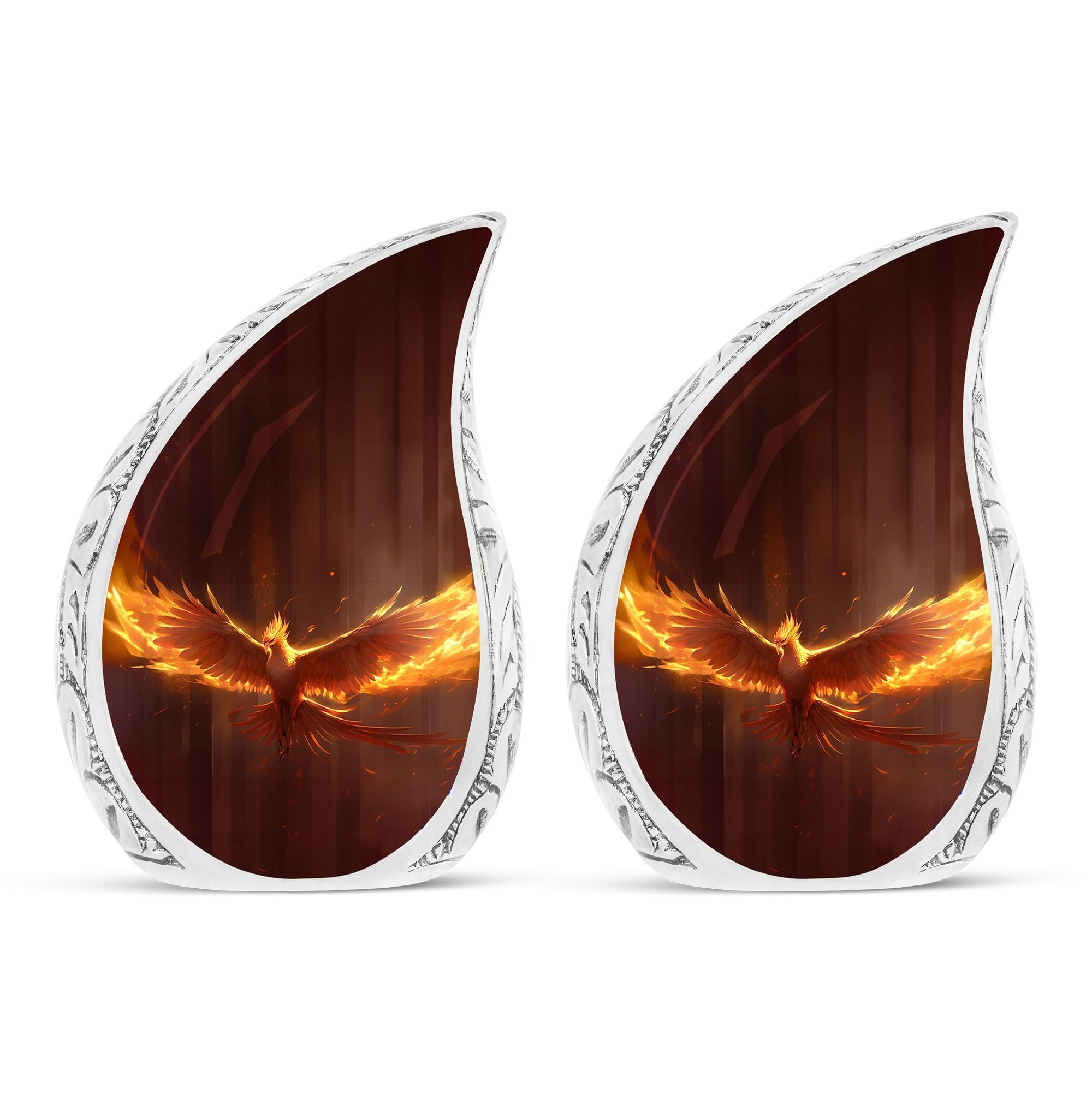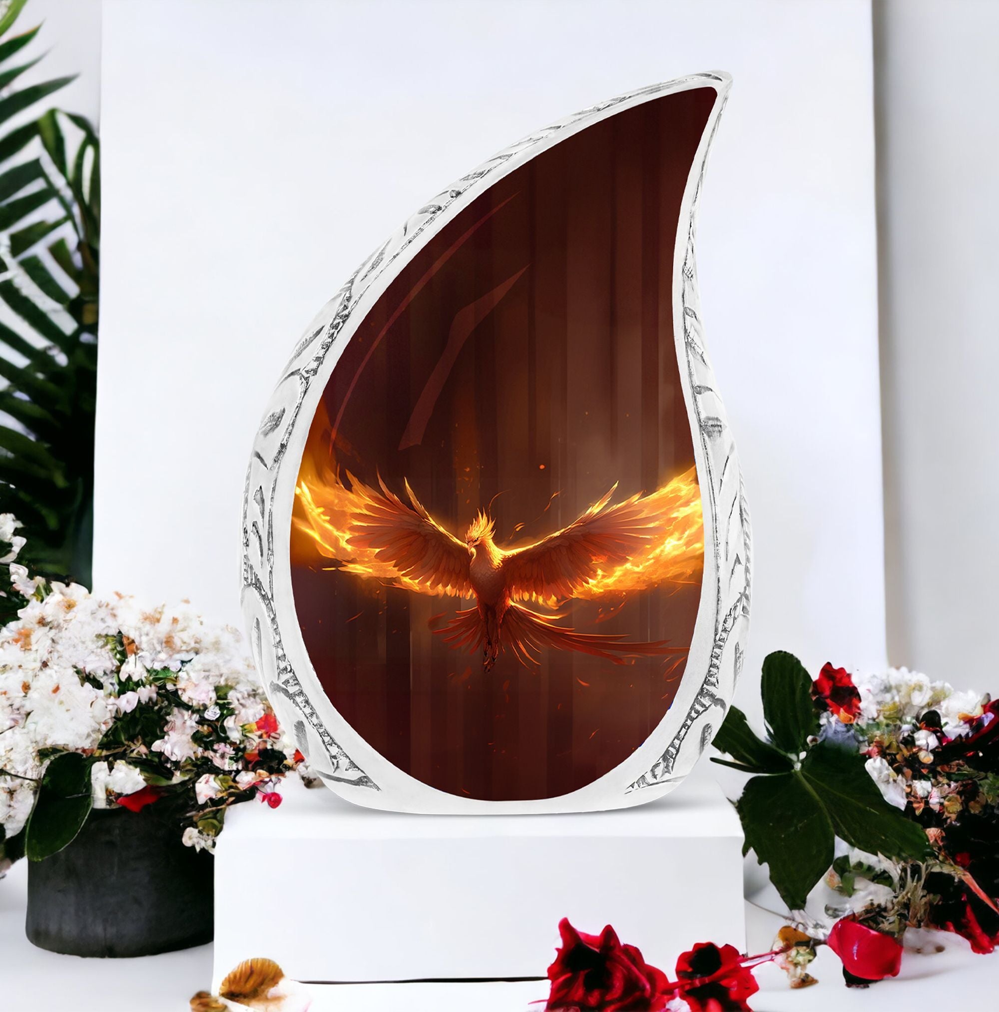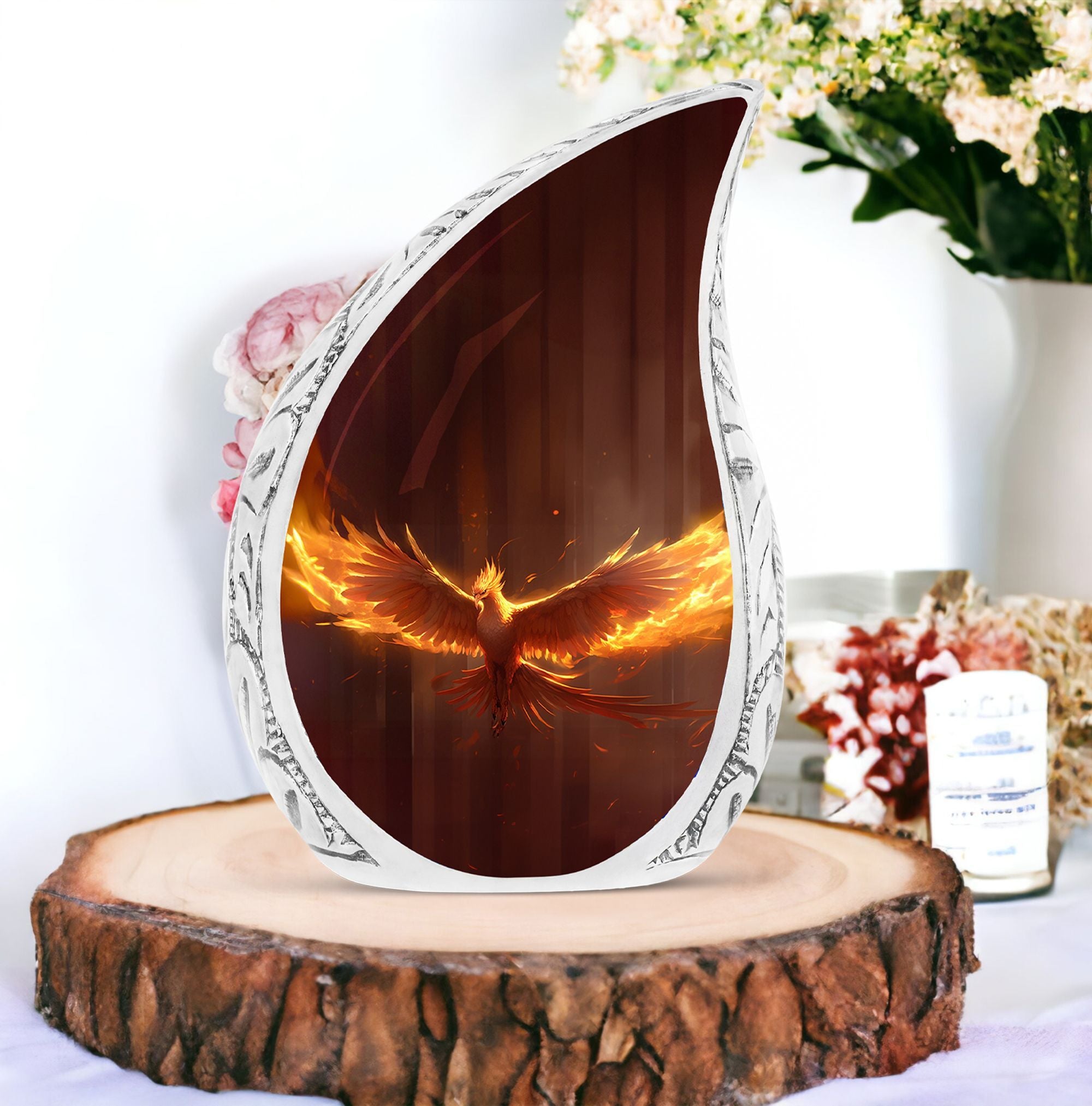 Experience the definitive fusion of beauty, spiritual connection, and thoughtful remembrance with our Large Phoenix Urn. This cremation urn, masterfully crafted from durable aluminium, provides both elegance and reliable permanence. With dimensions of 10 inches in height and a conviction of 3.3 pounds, the container boasts a generous capacity of 200 cubic inches, making it an excellent choice for memorializing a dear departed. This cremation urn, size 3 Inch, comes with a delicate velvet pouch, ensuring containment and gentle protection of the beloved's ashes. Further increasing the sentimentality of this eternal keepsake is the option to customize it; personalize this Phoenix Urn with engraved names to immortalize your loved one's memory. This product is most appropriate for individuals seeking unique urns for dad or metal urns for ashes. Rich in detail and sentimental value, our large urns for ashes perfectly symbolize lasting love and remembrance.