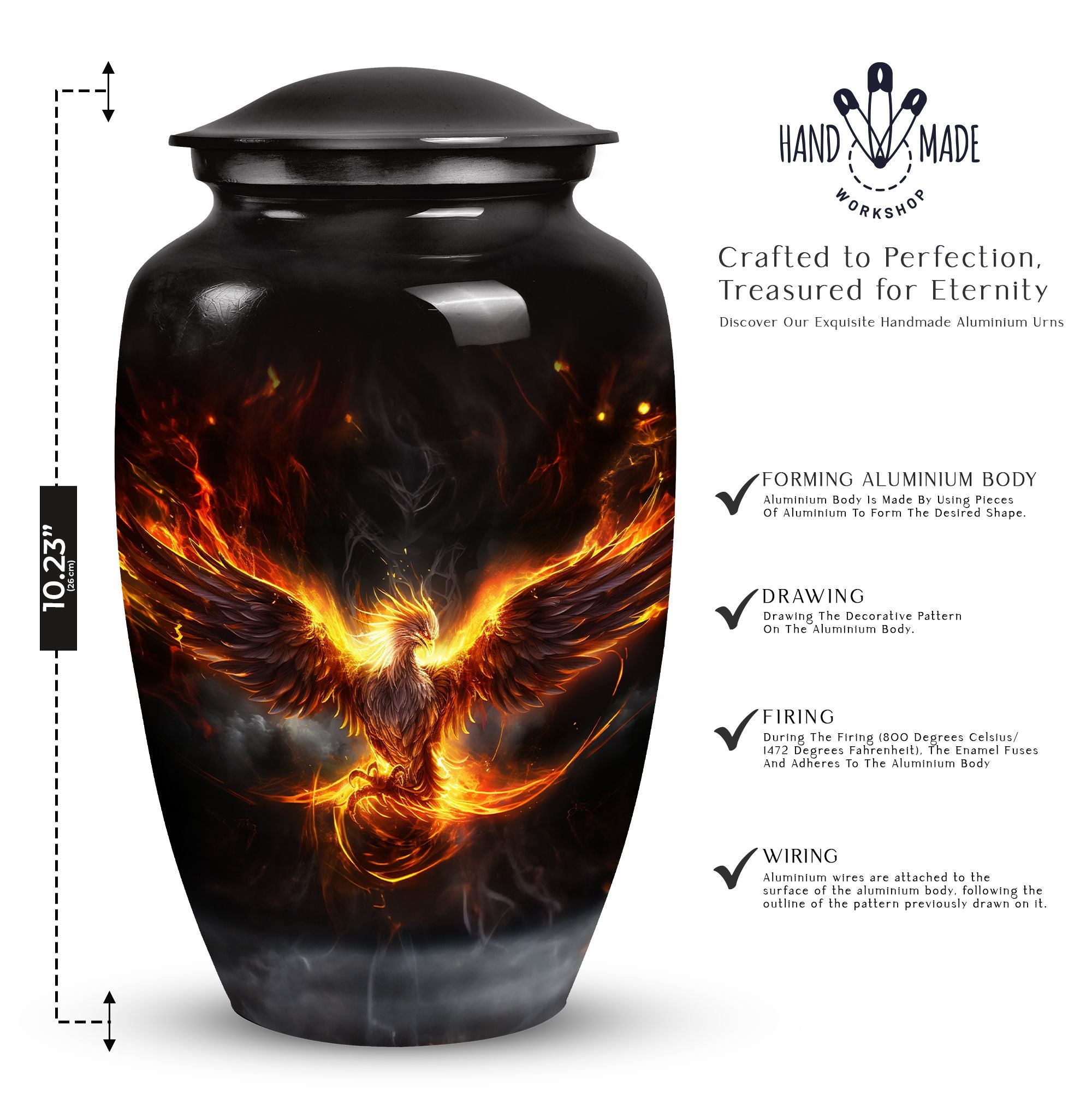Adorned with a gorgeous Phoenix emblem, this Cremation Urn provides a soothing, uplifting place of rest for your loved one. Designed for adults, be they male or female, this urn is a fitting ode to a cherished existence. Its elegant lines are an homage to the person you knew, while the mythical Phoenix symbolizes their resilience and the eternal cycle of life and death. Specially crafted for ashes post-cremation, this urn is a thoughtful treasure holder for the sprinklings of a transformed life. Often sought by people searching for 'Urns For Human Ashes,' it serves as a poignant reminder of a life well-lived. This Urn aids in fondly encapsulating the memories of a mother or father—serving as an enduring, quiet presence, symbolizing the continuing influence of a parent in our lives. The 'Phoenix Urn' is more than a ceremonial supply; it is a tangible piece of your love, respect, and admiration.