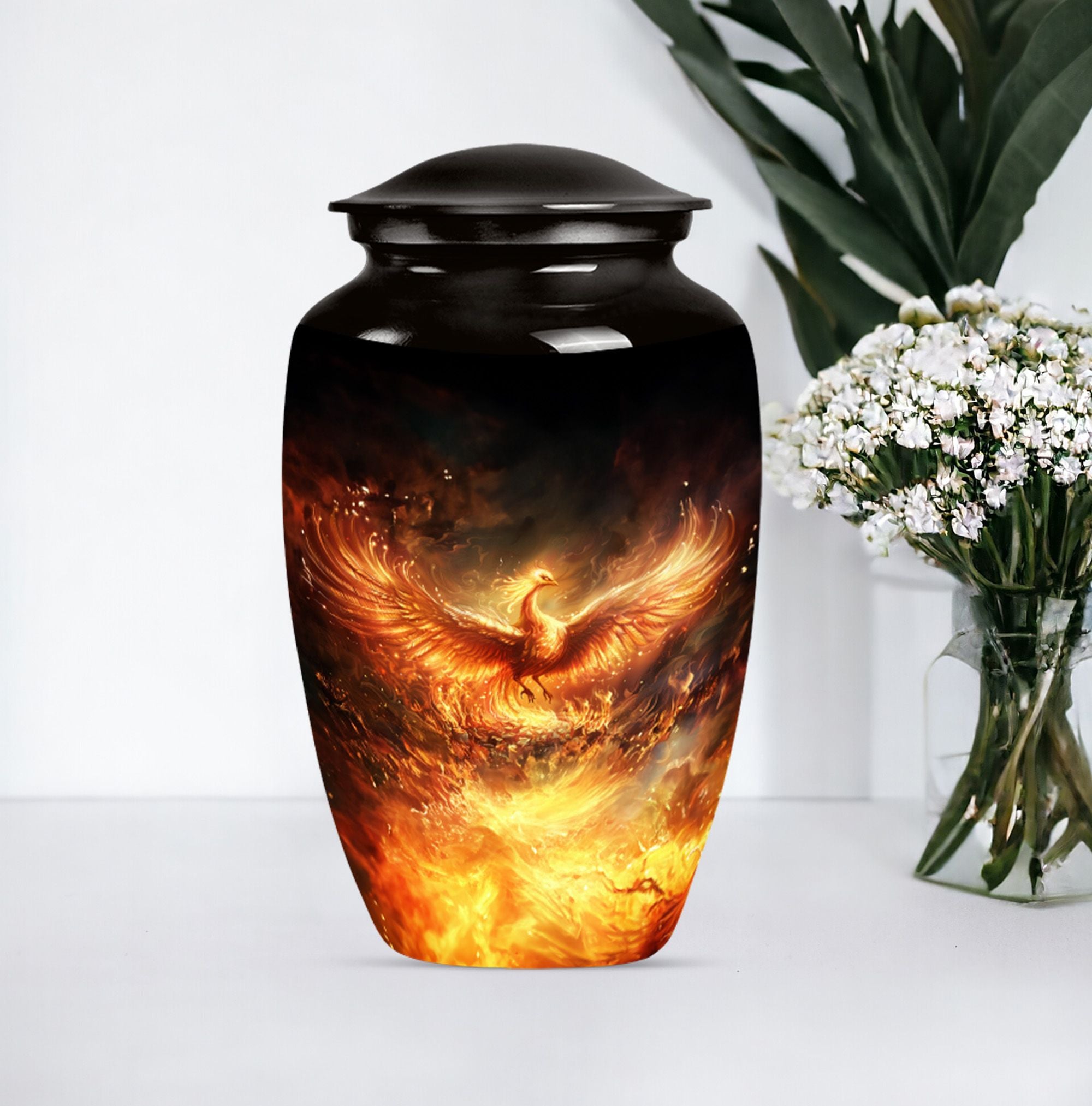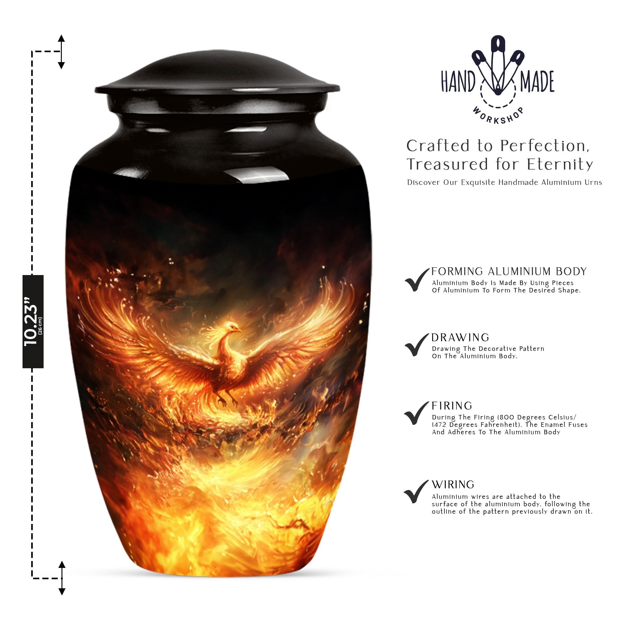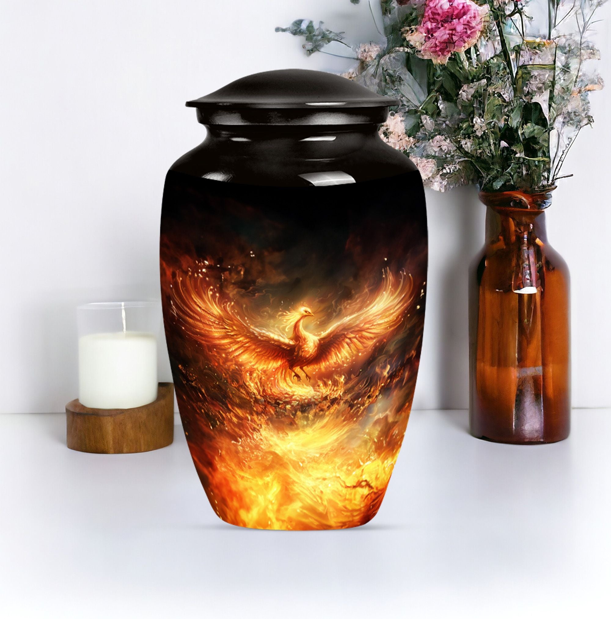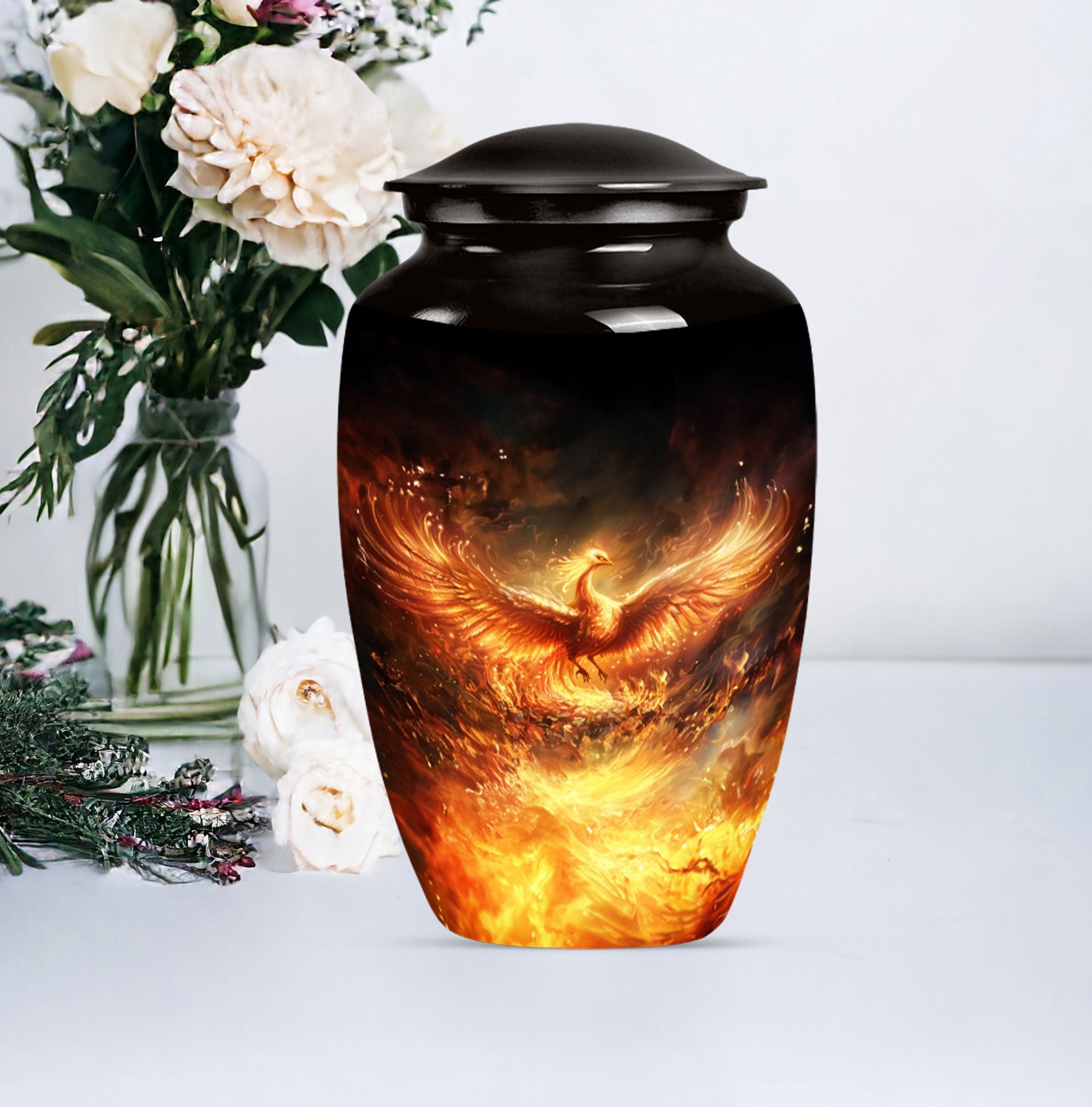 Treasure the memory of your cherished one with our Phoenix Urn, an exquisite burial urn for human ashes, masterfully crafted from durable aluminum. This cremation urn embodies both beauty and resilience, matching the strength of your enduring love. Sized delicately at 10 inches, it fits effortlessly wherever you wish to place it in your home. Weighing a mere 3.3 pounds, it is gratifyingly substantial. With a capacity of 200 cubic inches, the urn is large enough to honor the one you lost. Our Phoenix Urn also comes with a soft velvet pouch to keep the remains safely contained. Its theme is abstract, illustrating the infinite connection between our world and the next. Add a personal touch with our customization option, allowing you to engrave the departed's name onto the urn. The classic design merges traditional dignity with contemporary elegance. Consequently, it’s an ideal choice as a funeral urn for mom or any loved one. Grief may be universal, but every person is unique. Celebrate their individuality with our Phoenix Urn.
