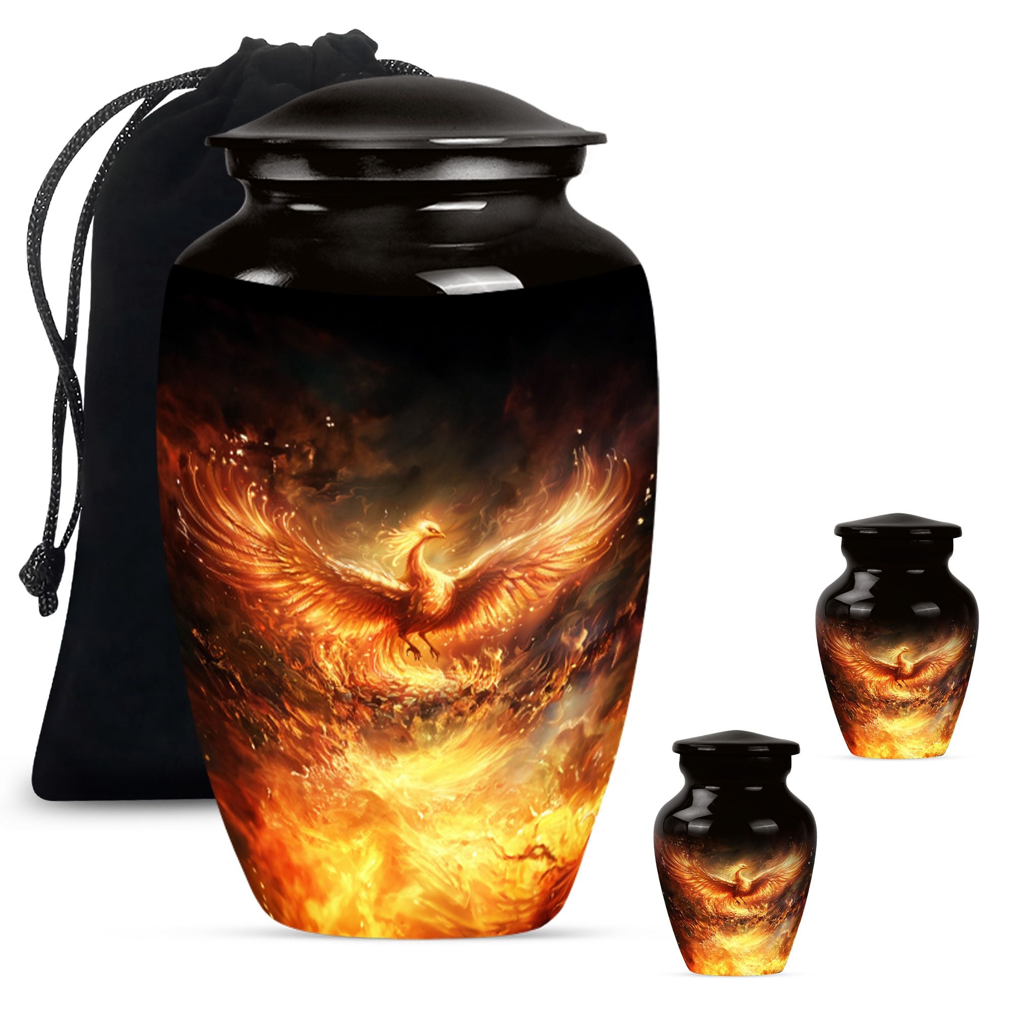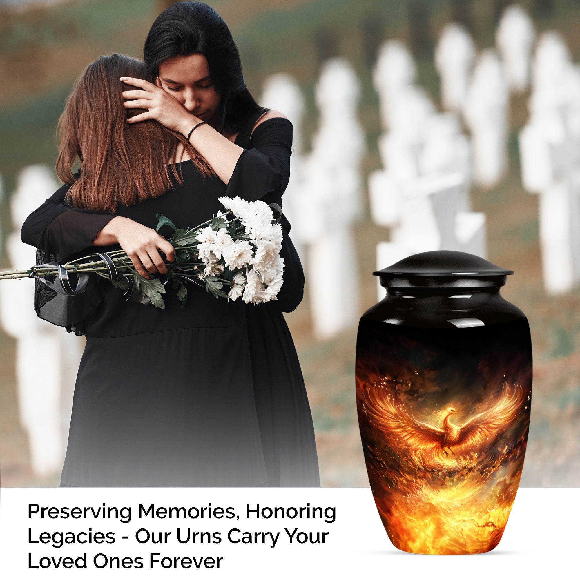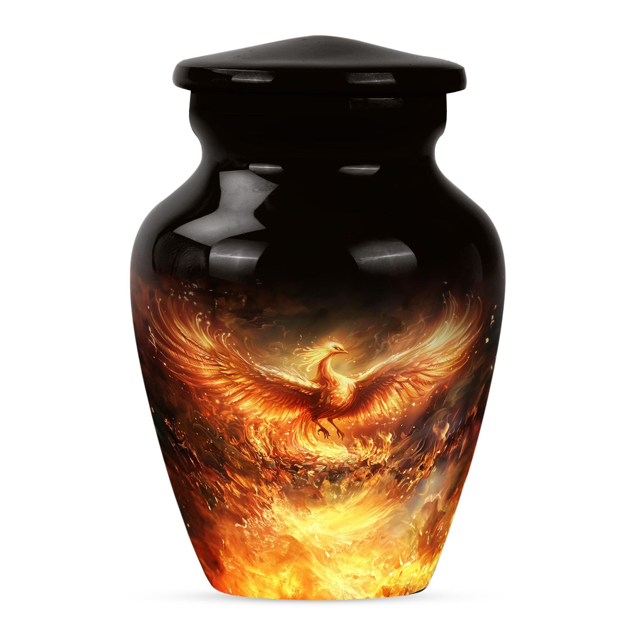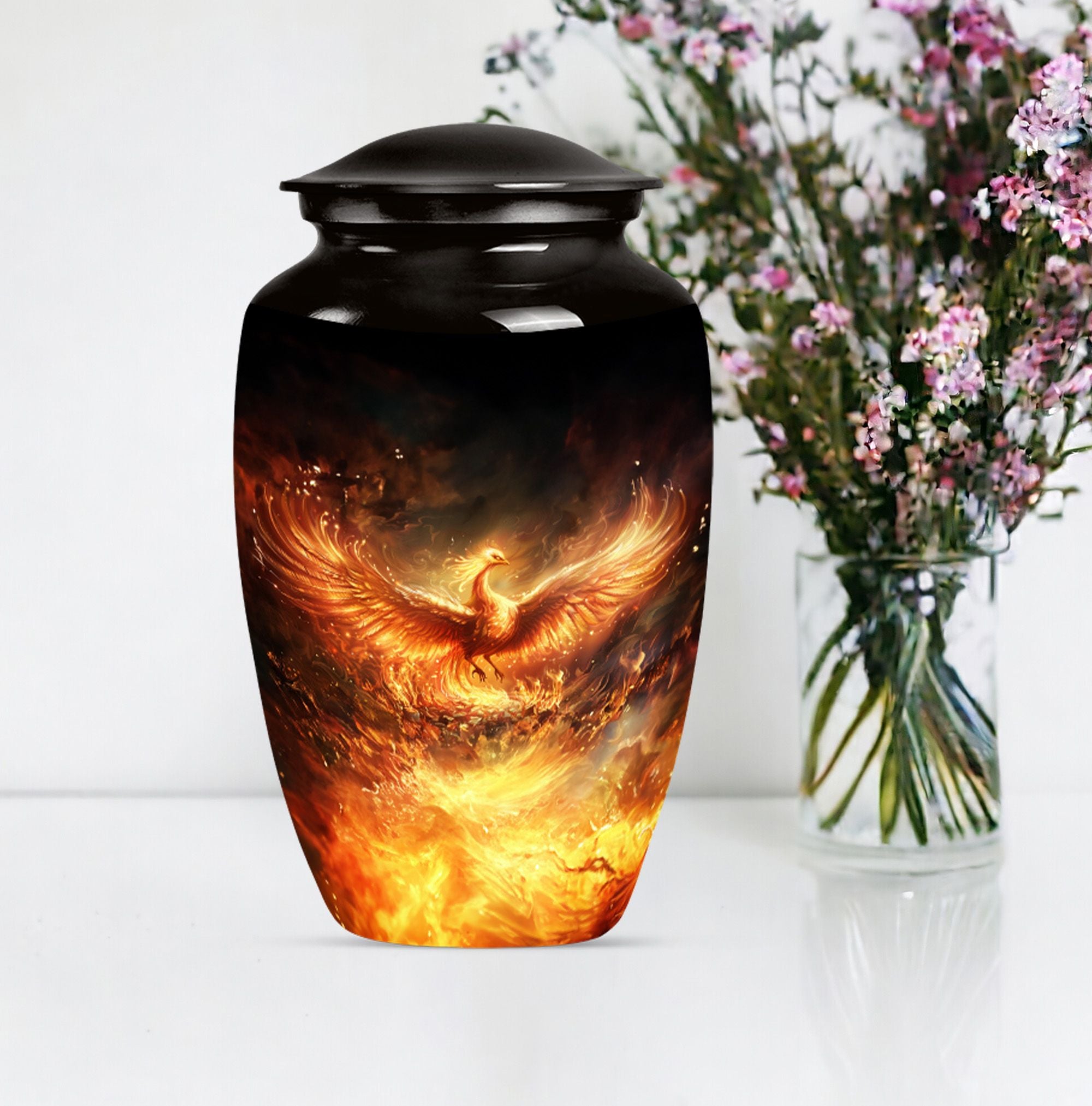 Treasure the memory of your cherished one with our Phoenix Urn, an exquisite burial urn for human ashes, masterfully crafted from durable aluminum. This cremation urn embodies both beauty and resilience, matching the strength of your enduring love. Sized delicately at 10 inches, it fits effortlessly wherever you wish to place it in your home. Weighing a mere 3.3 pounds, it is gratifyingly substantial. With a capacity of 200 cubic inches, the urn is large enough to honor the one you lost. Our Phoenix Urn also comes with a soft velvet pouch to keep the remains safely contained. Its theme is abstract, illustrating the infinite connection between our world and the next. Add a personal touch with our customization option, allowing you to engrave the departed's name onto the urn. The classic design merges traditional dignity with contemporary elegance. Consequently, it’s an ideal choice as a funeral urn for mom or any loved one. Grief may be universal, but every person is unique. Celebrate their individuality with our Phoenix Urn.