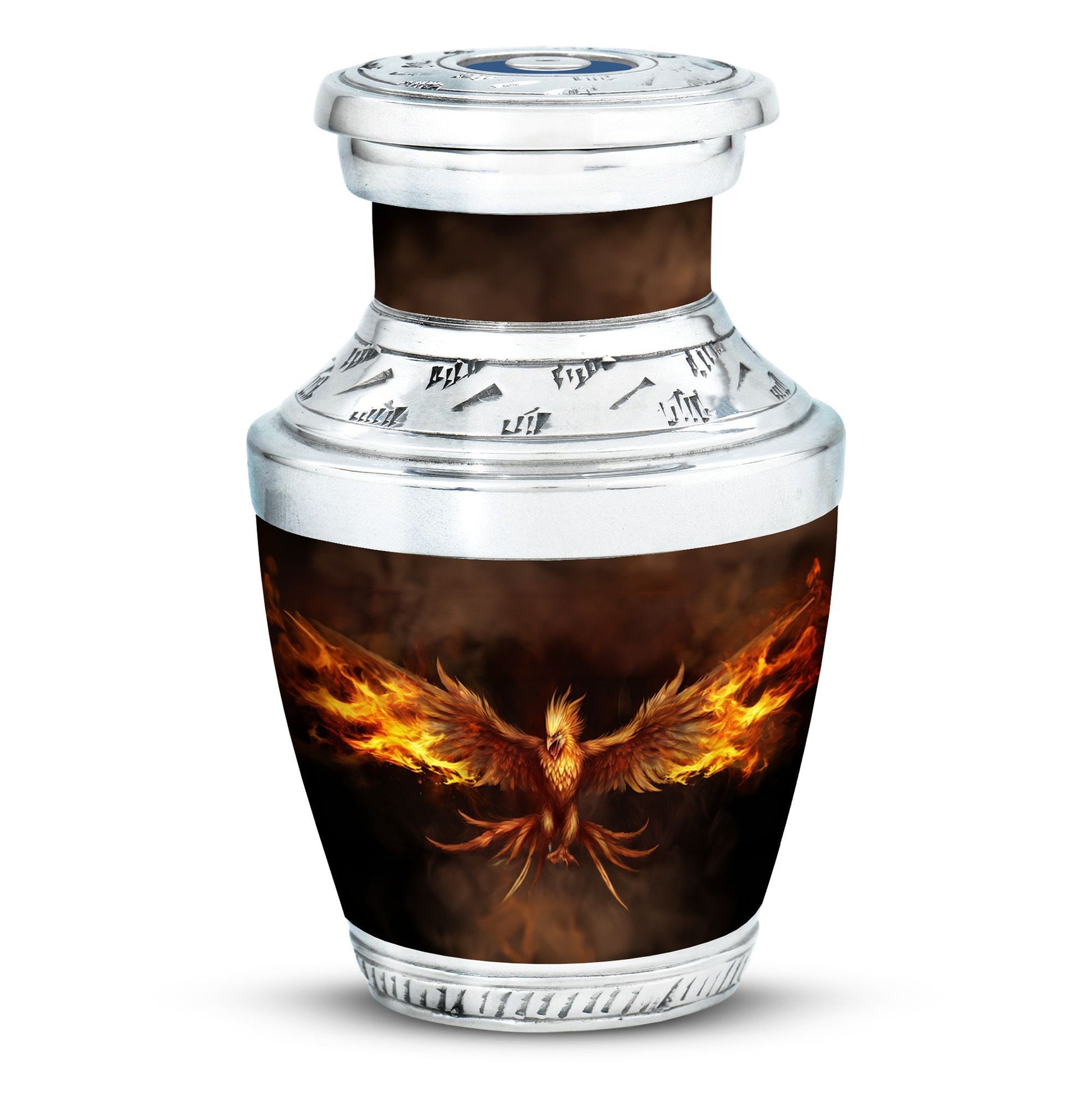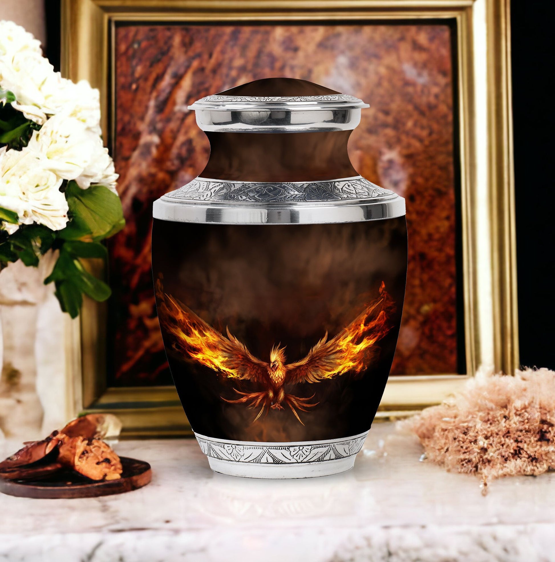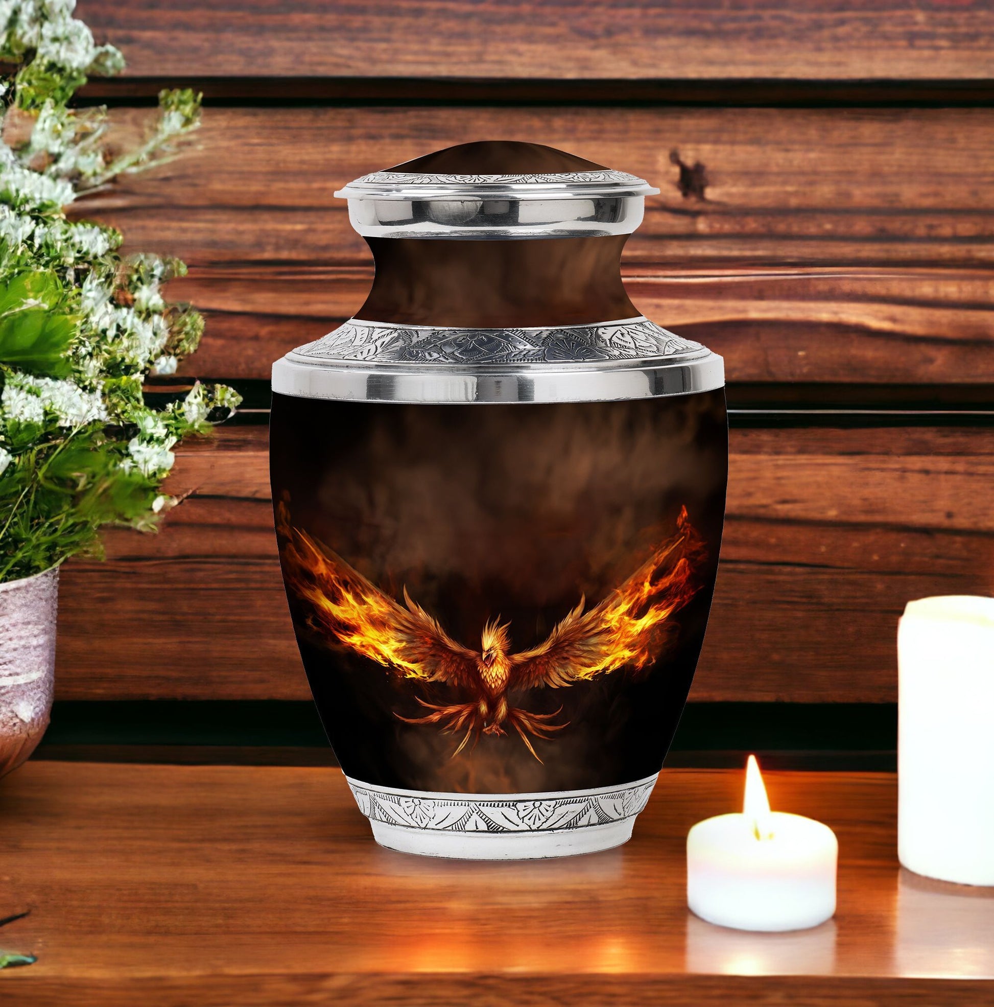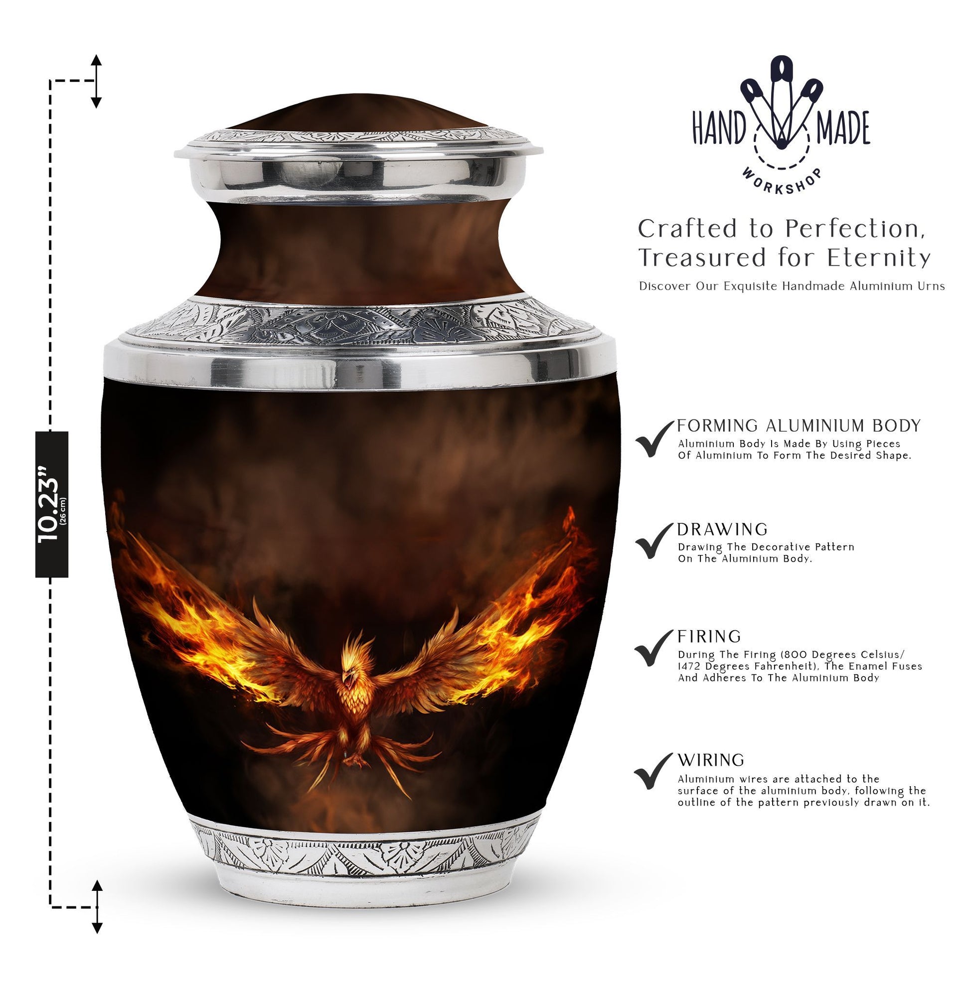 Discover our precious Angry Phoenix Urns for Ashes, a priceless vessel to keep the cherished memories of your loved ones alive. Our large urns, handcrafted meticulously with superior-quality aluminium, weigh a solid 3.3 pounds, providing longevity and durability. With dimensions of 10 inches in height, these urns sequel to human ashes urn specification, offering a generous capacity of up to 200 cubic inches. Our package includes a classy velvet pouch, providing an extra layer of protection and care for the sanctity of the ashes. Moreover, we believe in personalizing emotions, therefore offer the facility to engrave names on these memorial urn containers, anchoring their memory forever. Perfectly suited for men's ashes but not limited to, these urns can be a sentimental keepsake. Note: We emphasize on urn design except the design 'Classic Urn'.