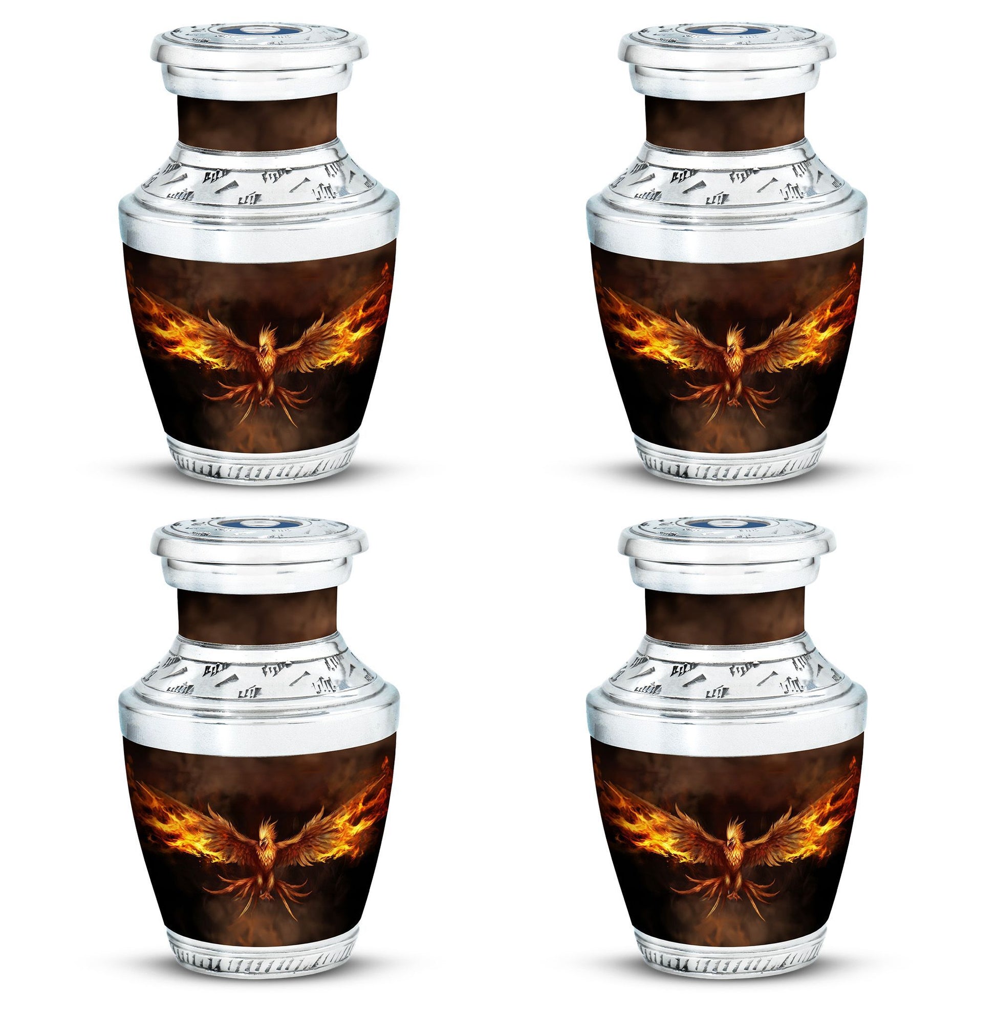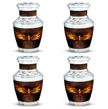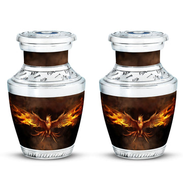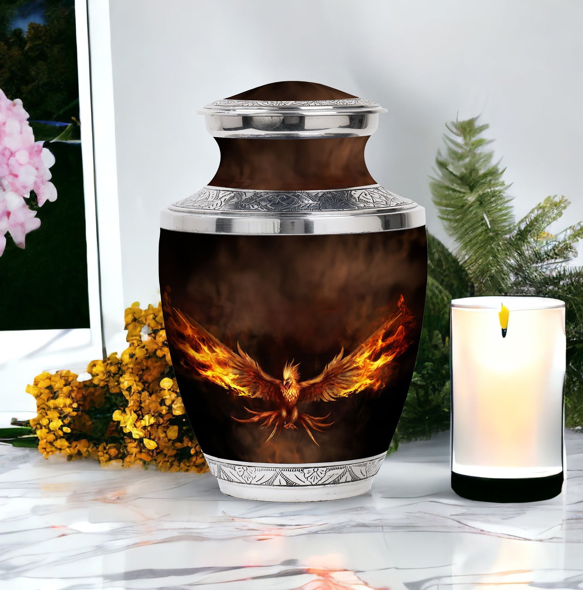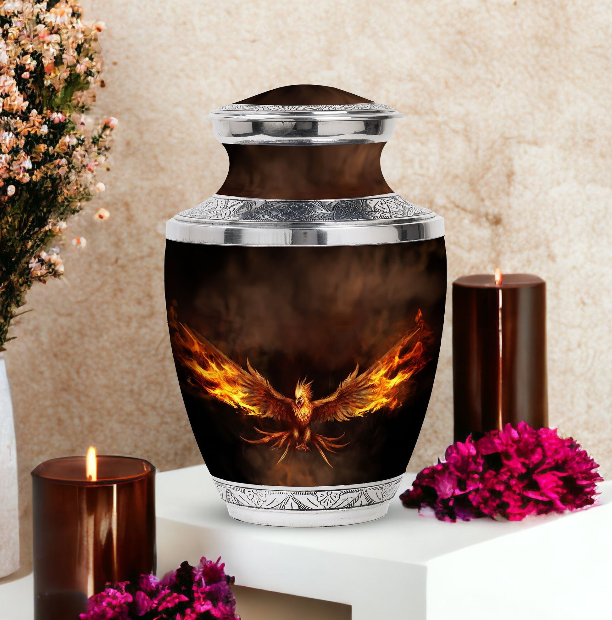 Discover our precious Angry Phoenix Urns for Ashes, a priceless vessel to keep the cherished memories of your loved ones alive. Our large urns, handcrafted meticulously with superior-quality aluminium, weigh a solid 3.3 pounds, providing longevity and durability. With dimensions of 10 inches in height, these urns sequel to human ashes urn specification, offering a generous capacity of up to 200 cubic inches. Our package includes a classy velvet pouch, providing an extra layer of protection and care for the sanctity of the ashes. Moreover, we believe in personalizing emotions, therefore offer the facility to engrave names on these memorial urn containers, anchoring their memory forever. Perfectly suited for men's ashes but not limited to, these urns can be a sentimental keepsake. Note: We emphasize on urn design except the design 'Classic Urn'.