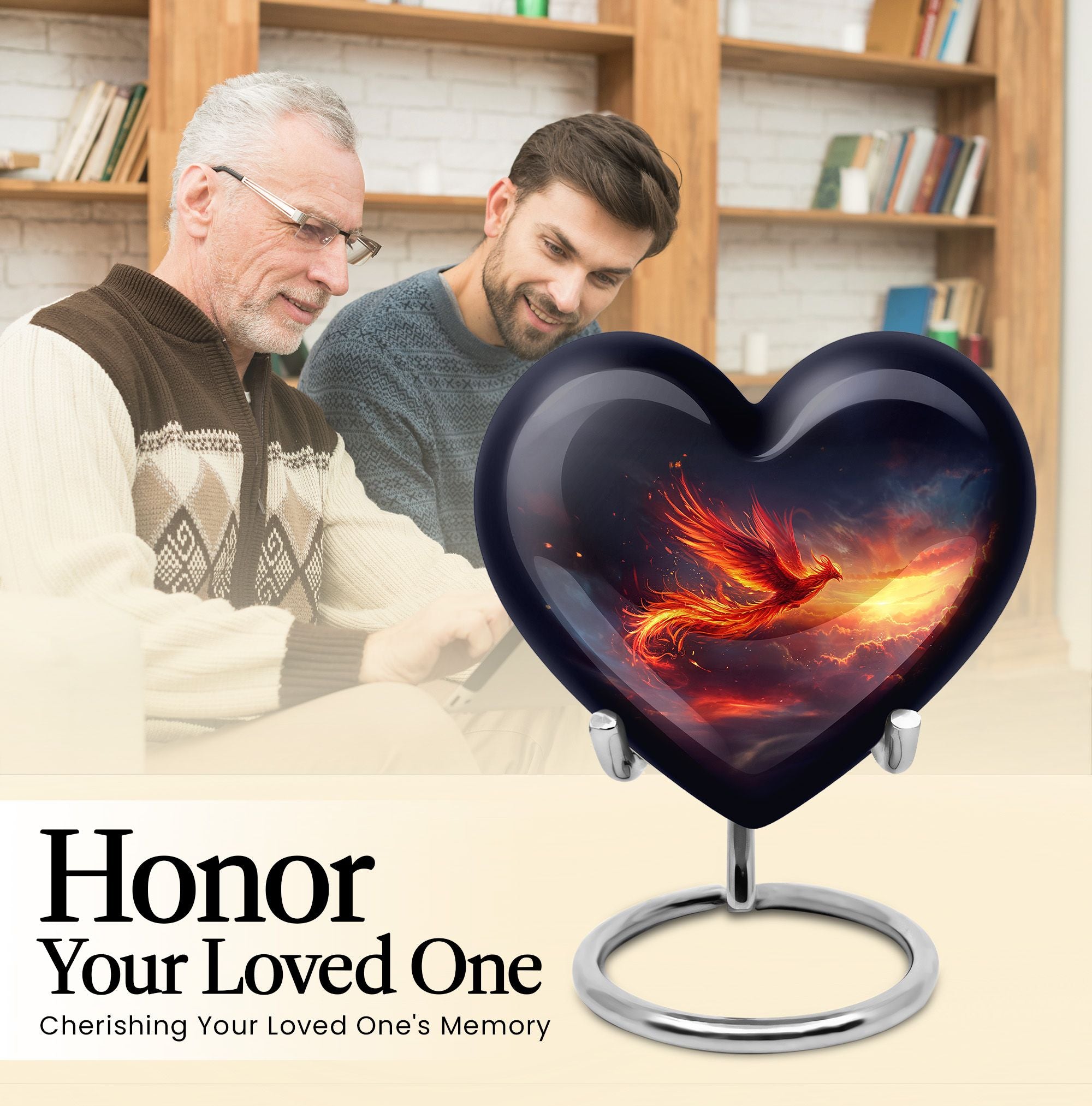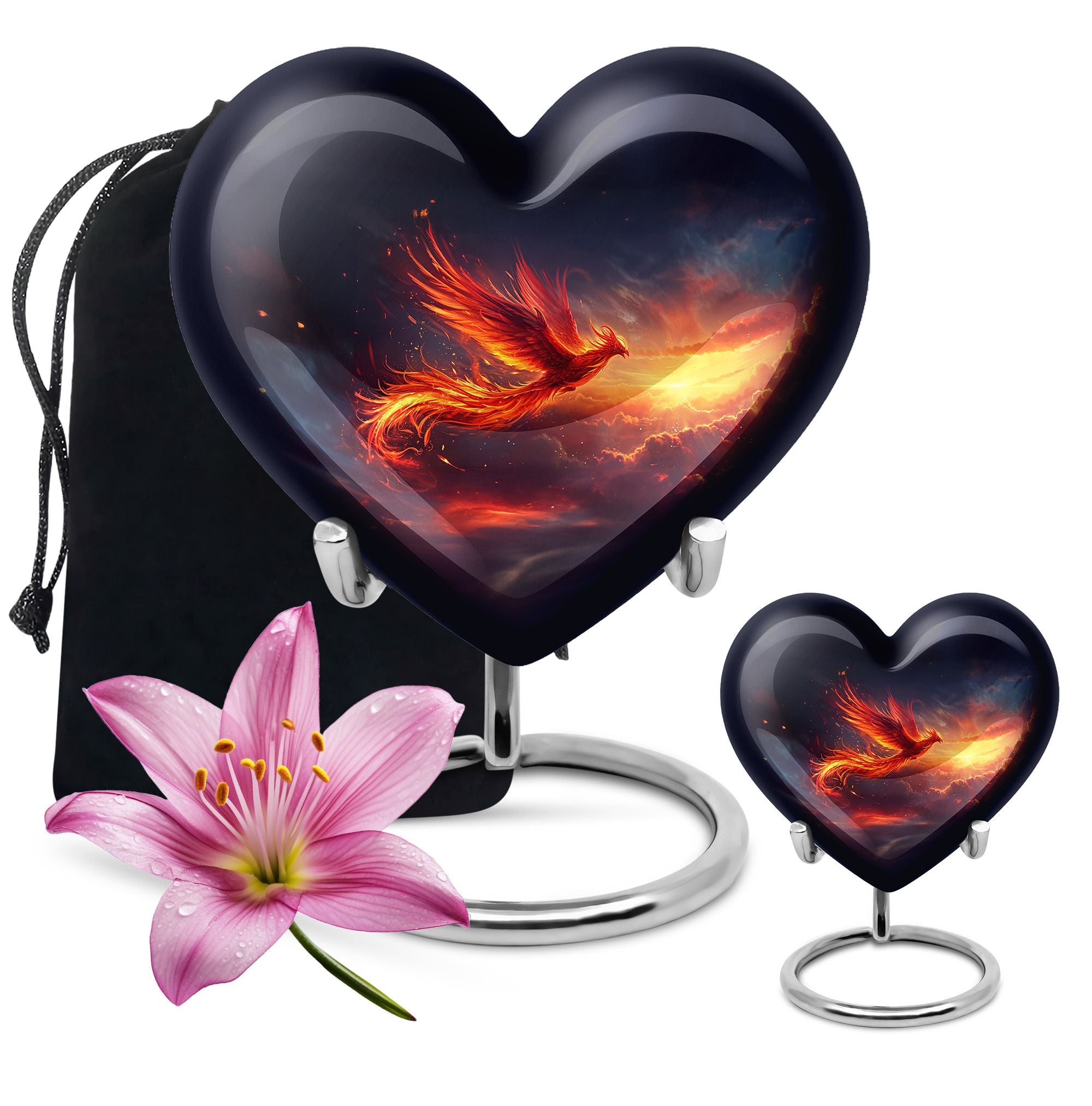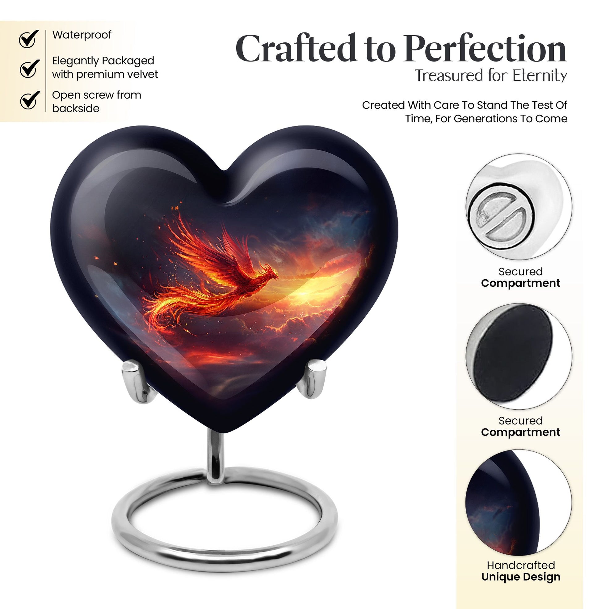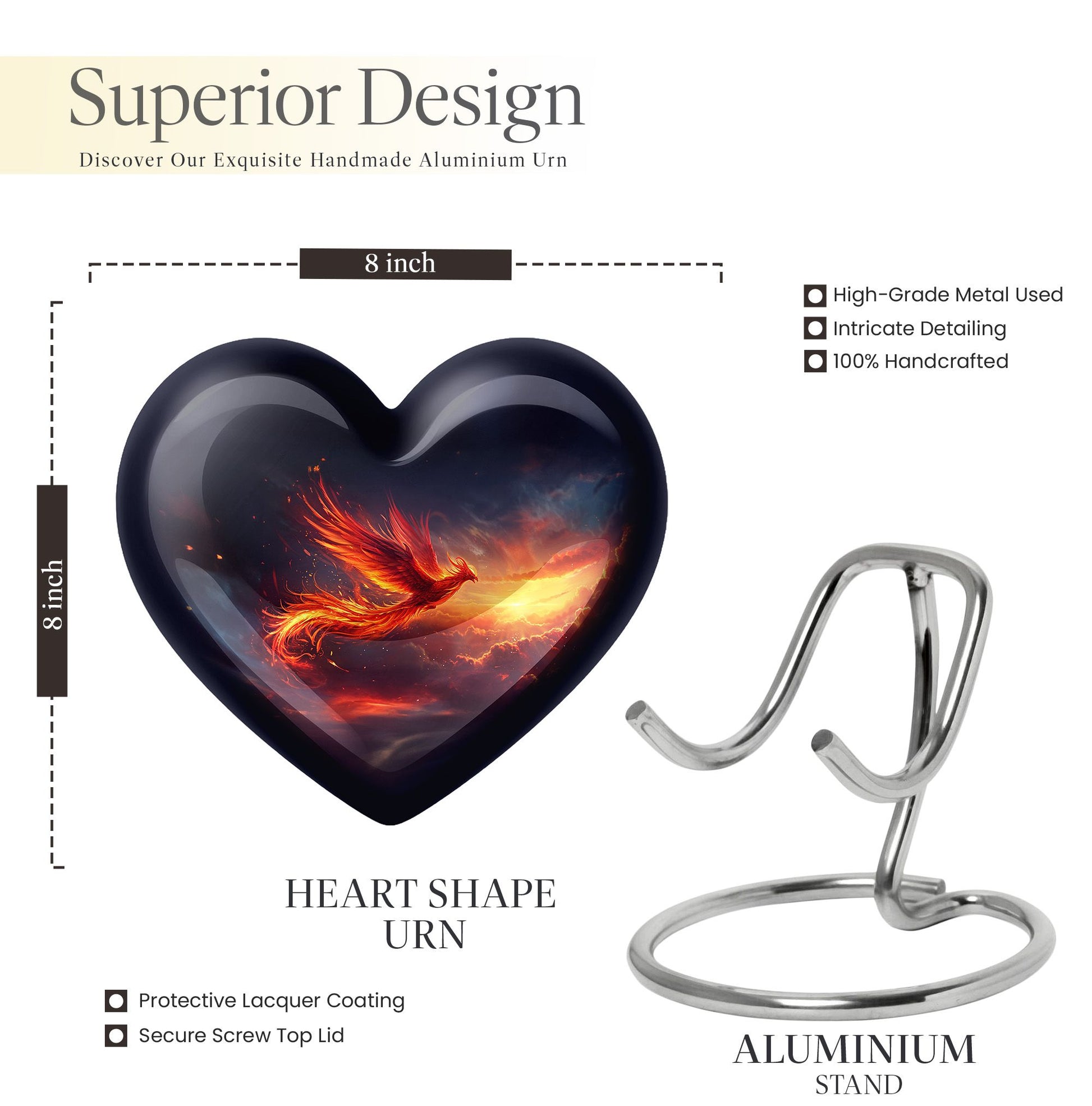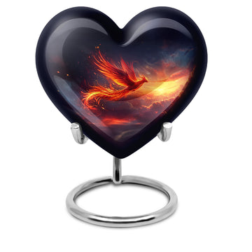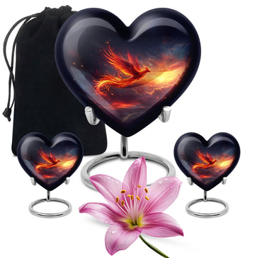 Experience a heartwarming sense of peace and closure with our Phoenix Urn, a large memorial urn delicately crafted from robust aluminum. We've designed it with reverence and respect for your cherished loved one. This 10-inch artfully made urn manifests a visual journey that encapsulates an abstract theme to subtly honor the uniqueness of those we miss dearly. Remarkably lightweight at 3.3 pounds, handling it is both secure and comfortable. It generously accommodates up to 200 cubic inches of ashes, ensuring a fitting resting place. Your funeral urn for mom, or any family member, can be uniquely personalized with carefully engraved names, adding a touch of intimacy to the memory. Our package includes a velvet pouch, providing an elegant containment solution for the precious ashes. Beyond the resplendent construction, our Phoenix Urn's thoughtful approach to aiding during difficult moments sets it apart. Whether you're searching for memorial adult urns, human urn ash adult, urns for ashes, or custom cremation urns, our Phoenix Urn offers a heart-touching tribute and healing symbol of your unwavering love.