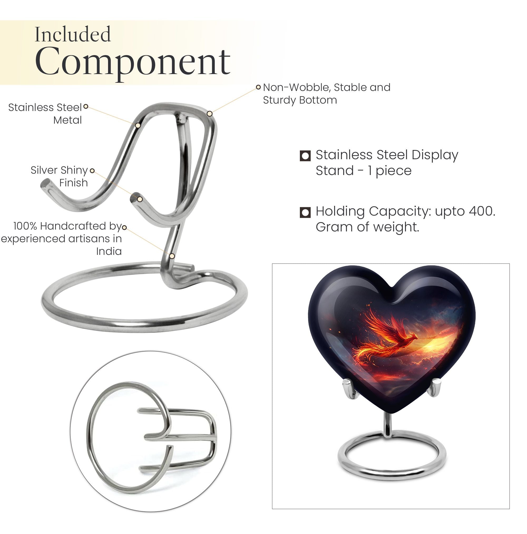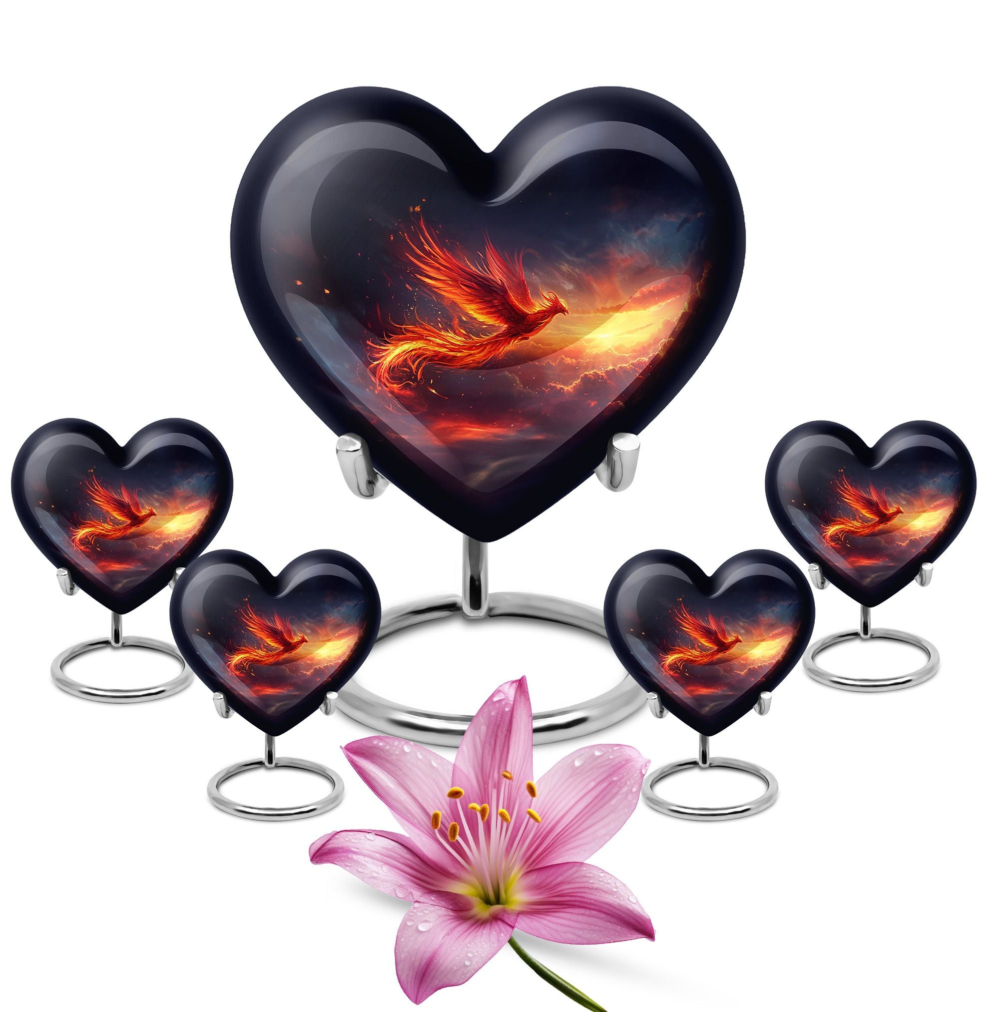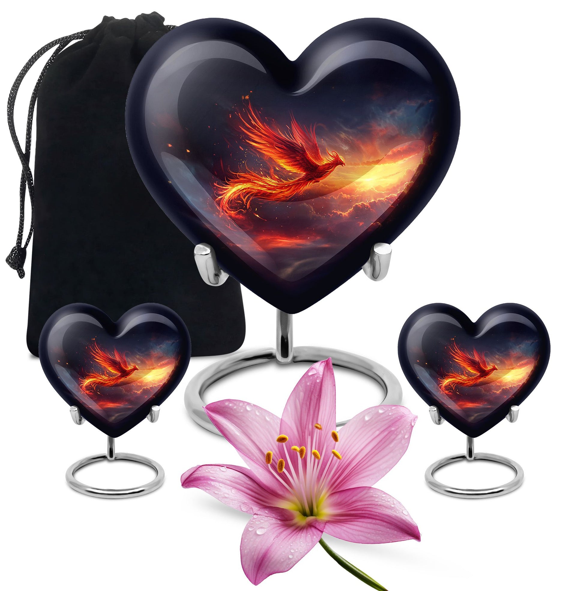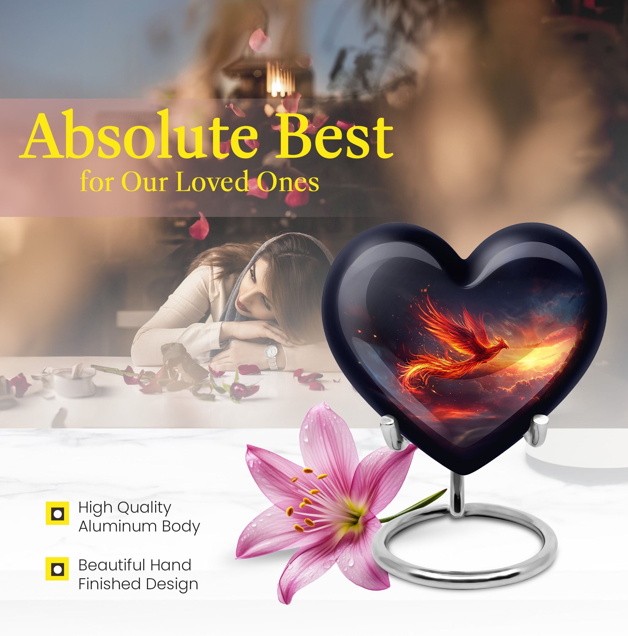 Experience a heartwarming sense of peace and closure with our Phoenix Urn, a large memorial urn delicately crafted from robust aluminum. We've designed it with reverence and respect for your cherished loved one. This 10-inch artfully made urn manifests a visual journey that encapsulates an abstract theme to subtly honor the uniqueness of those we miss dearly. Remarkably lightweight at 3.3 pounds, handling it is both secure and comfortable. It generously accommodates up to 200 cubic inches of ashes, ensuring a fitting resting place. Your funeral urn for mom, or any family member, can be uniquely personalized with carefully engraved names, adding a touch of intimacy to the memory. Our package includes a velvet pouch, providing an elegant containment solution for the precious ashes. Beyond the resplendent construction, our Phoenix Urn's thoughtful approach to aiding during difficult moments sets it apart. Whether you're searching for memorial adult urns, human urn ash adult, urns for ashes, or custom cremation urns, our Phoenix Urn offers a heart-touching tribute and healing symbol of your unwavering love.