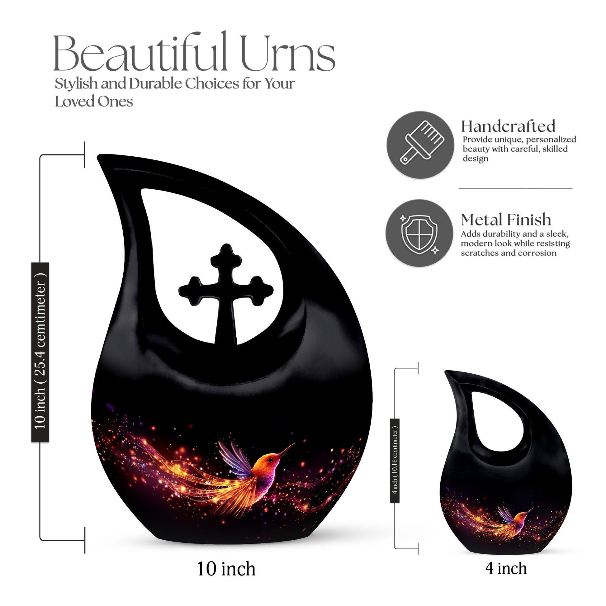 Expertly handcrafted from durable aluminum, this large cremation urn combines modern artistry with lasting strength. Its glossy black teardrop body highlights the radiant hummingbird motif, symbolizing the soul’s gentle journey toward eternal peace. Designed for both display and burial, this large urn for human ashes ensures security with a tight screw-top lid, offering comfort and reassurance to families seeking a large human ashes urn of exceptional quality and beauty.