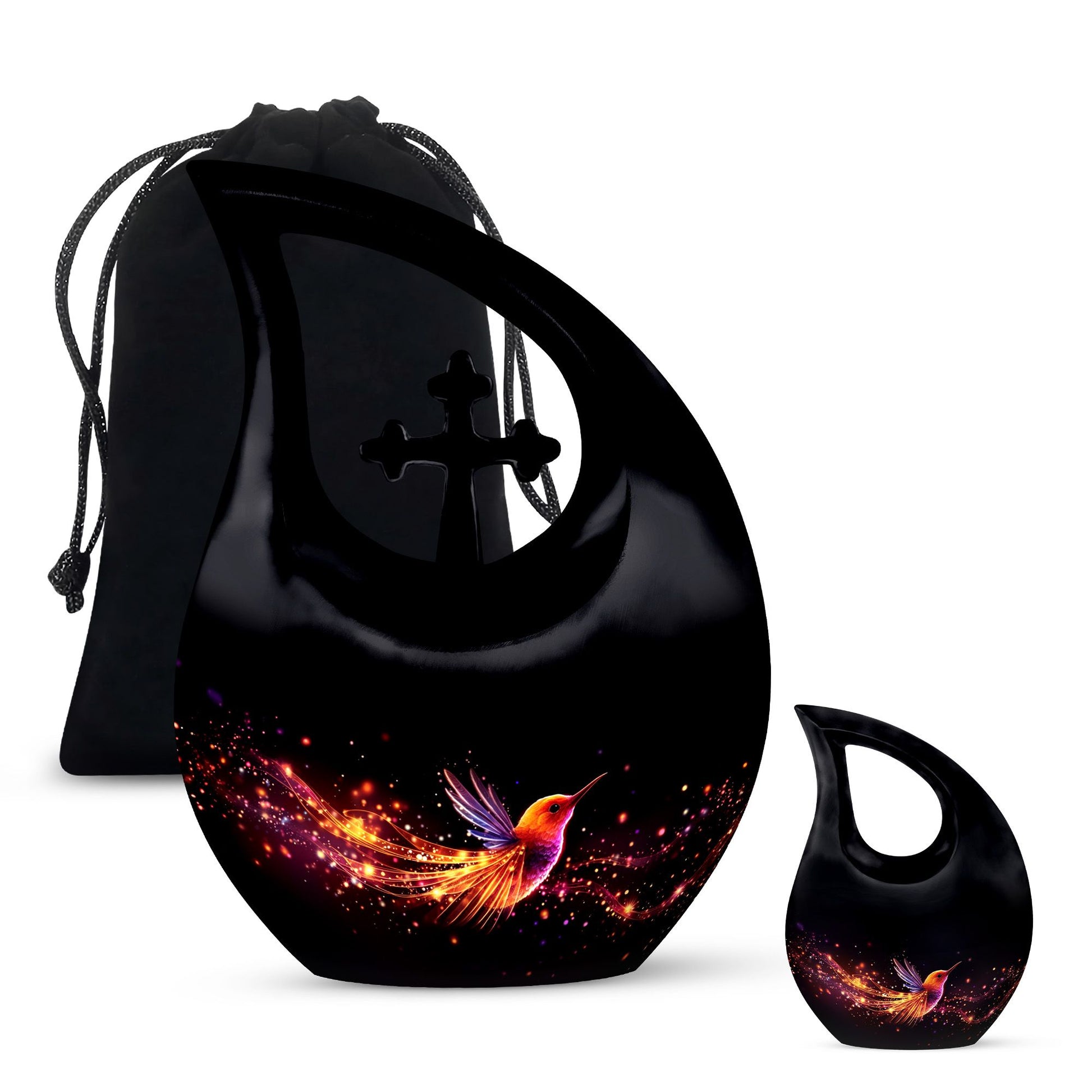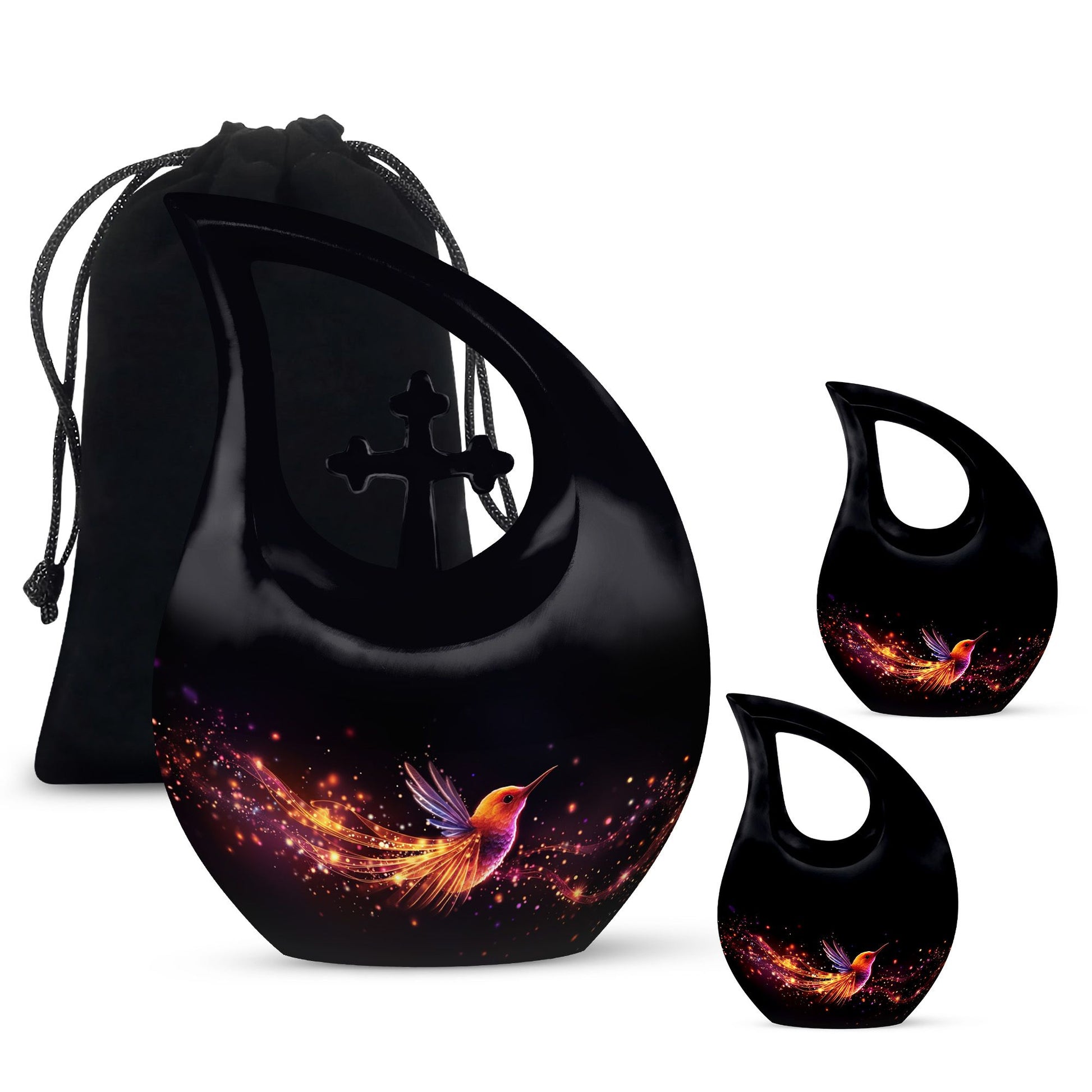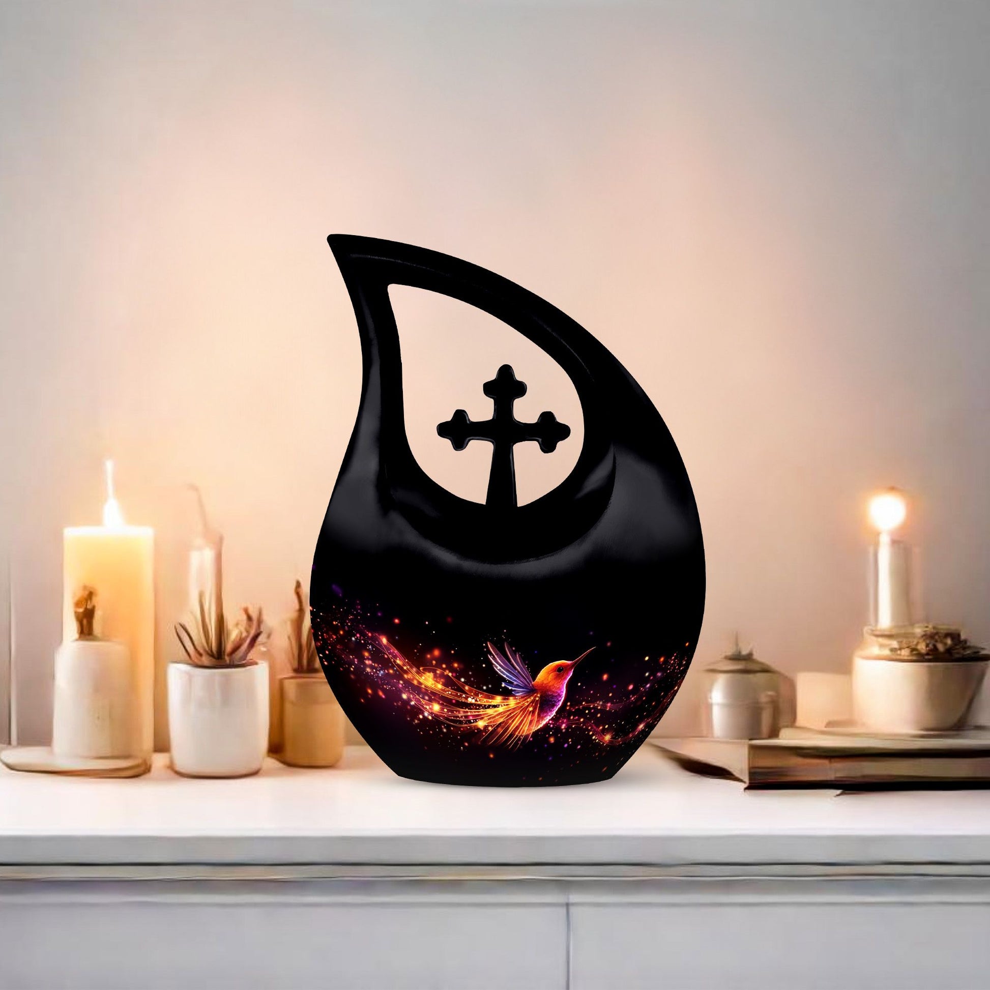 Celebrate a life full of love, grace, and beauty with this Black Teardrop Cremation Urn, featuring a glowing hummingbird design that symbolizes lightness, peace, and the joy of eternal remembrance. This elegant piece offers a meaningful tribute for both men and women, making it a perfect choice among large urns for human ashes adult female and large urns for ashes adult male.