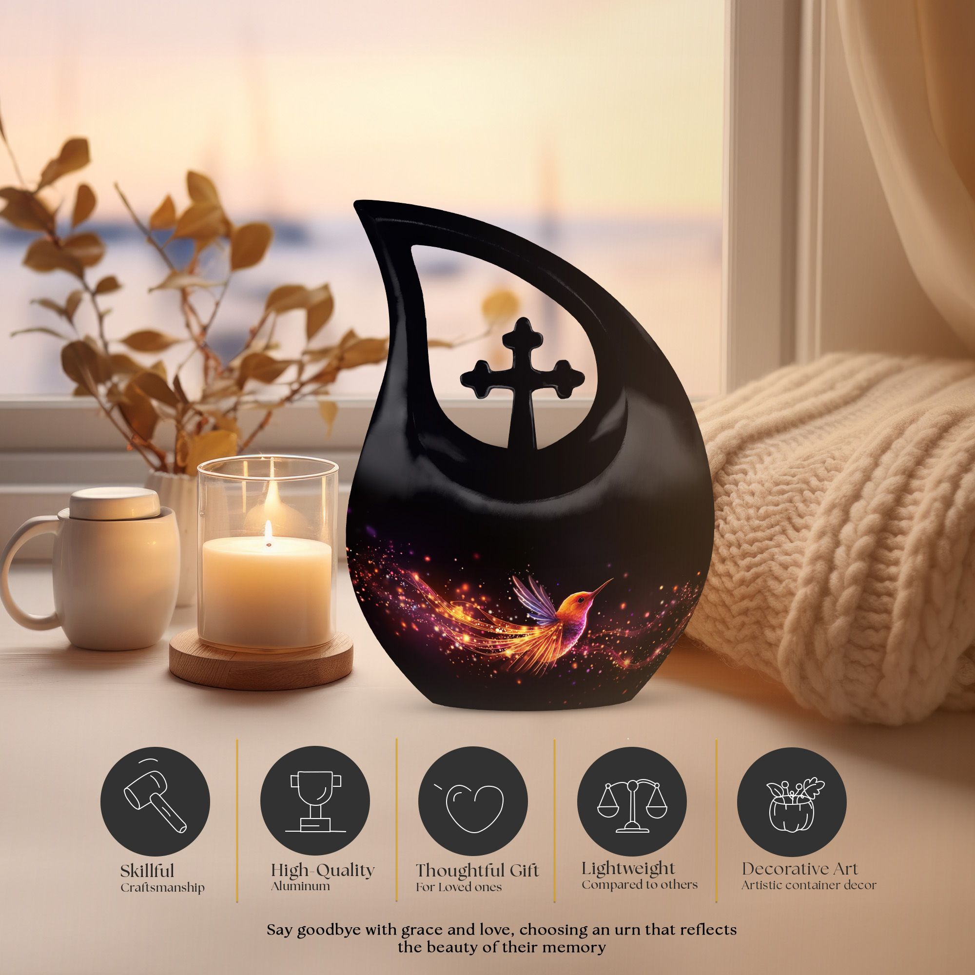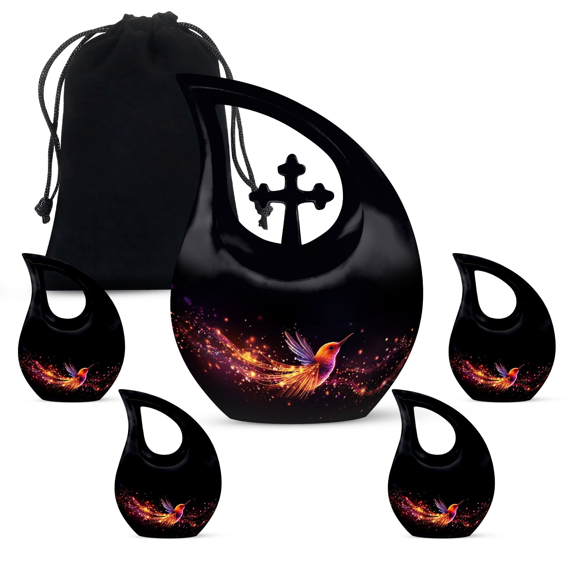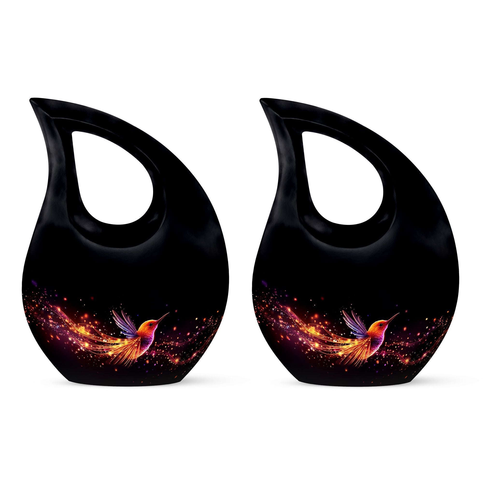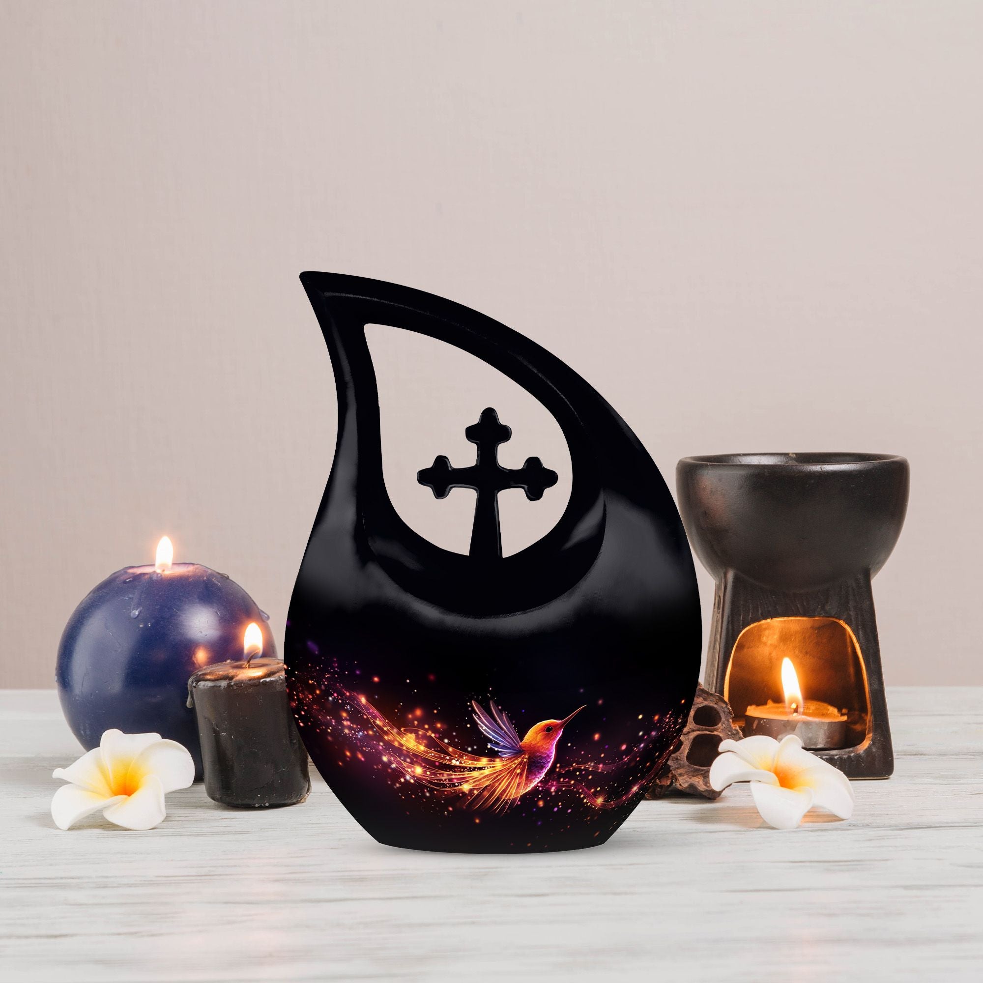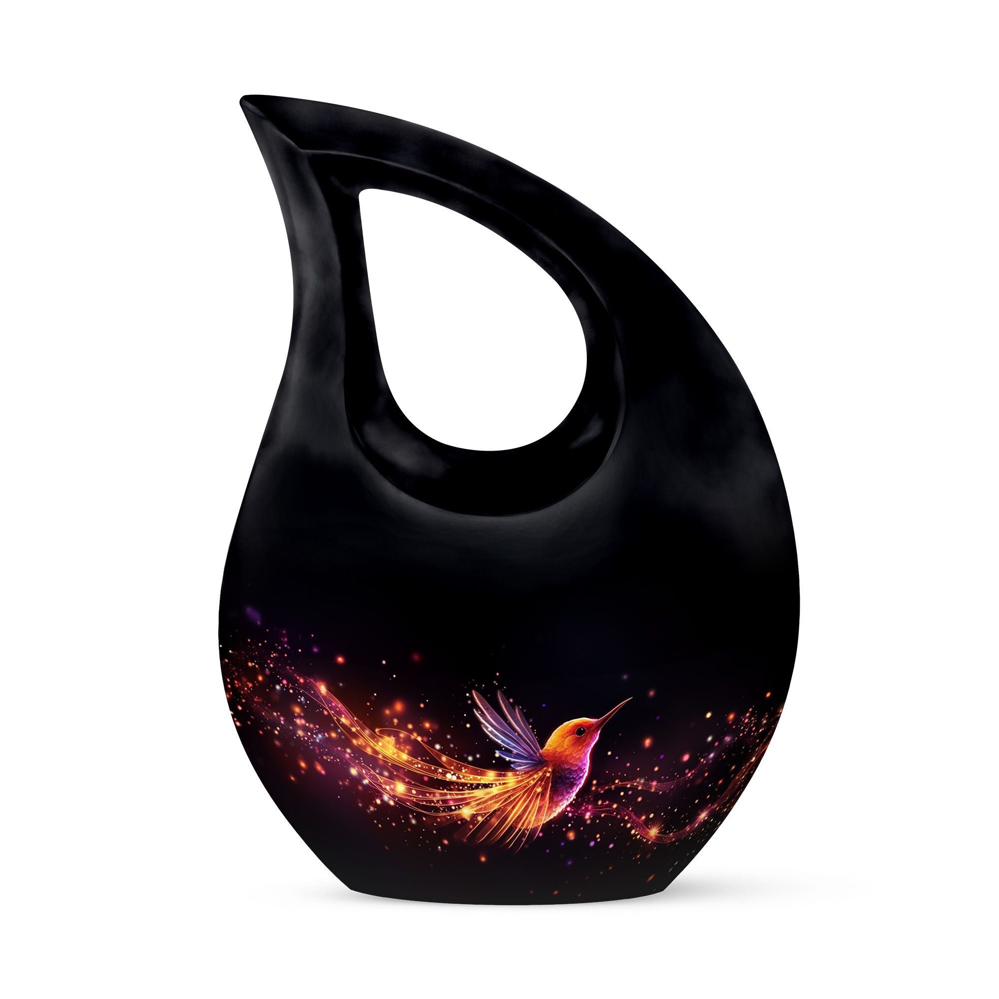 Celebrate a life full of love, grace, and beauty with this Black Teardrop Cremation Urn, featuring a glowing hummingbird design that symbolizes lightness, peace, and the joy of eternal remembrance. This elegant piece offers a meaningful tribute for both men and women, making it a perfect choice among large urns for human ashes adult female and large urns for ashes adult male.