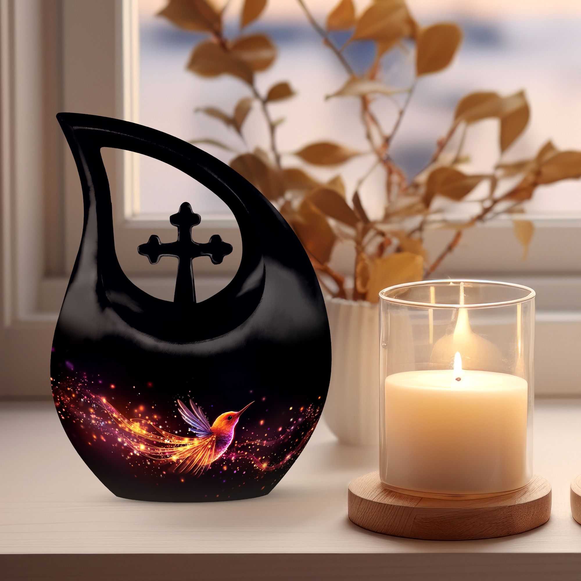 The glowing hummingbird reflects peace and renewal — a delicate messenger of love transcending time and space. This large urn for human ashes serves not just as a vessel, but as a comforting reminder that every cherished memory continues to shine, forever held in the heart.