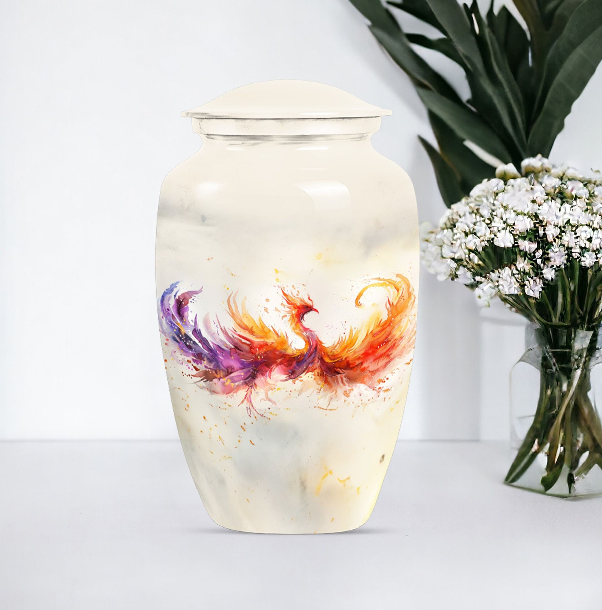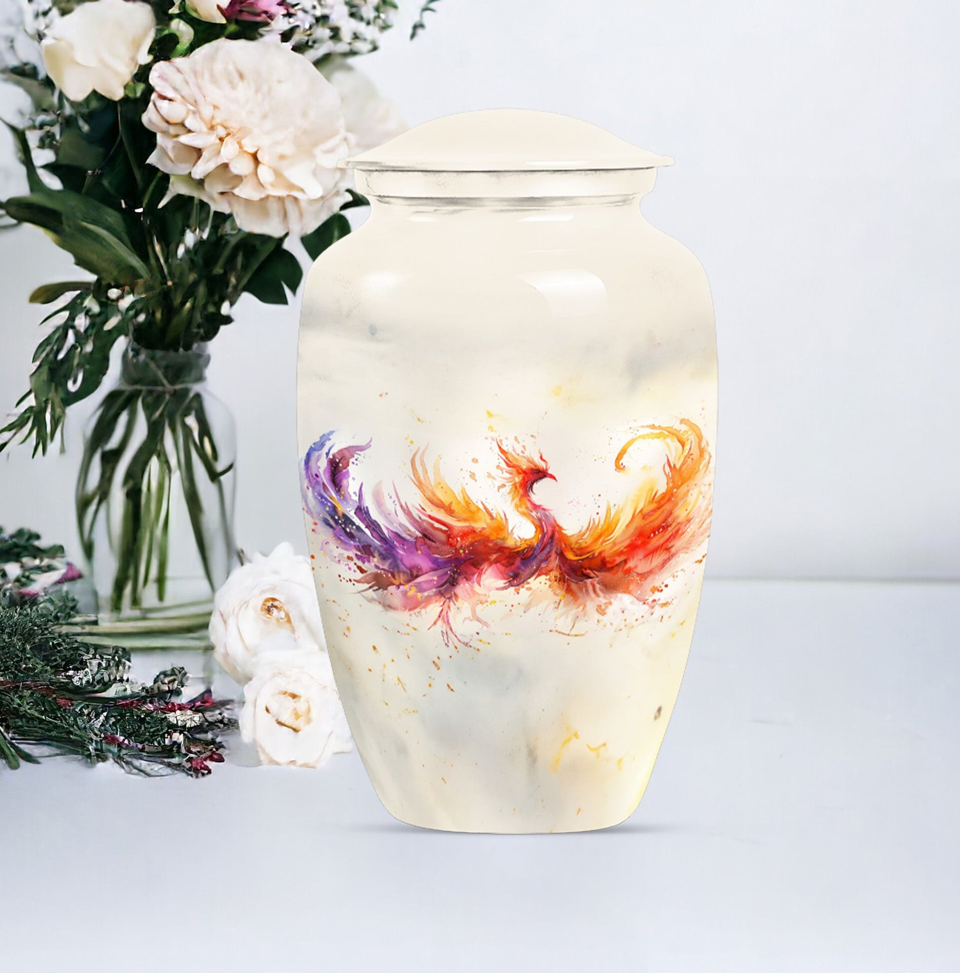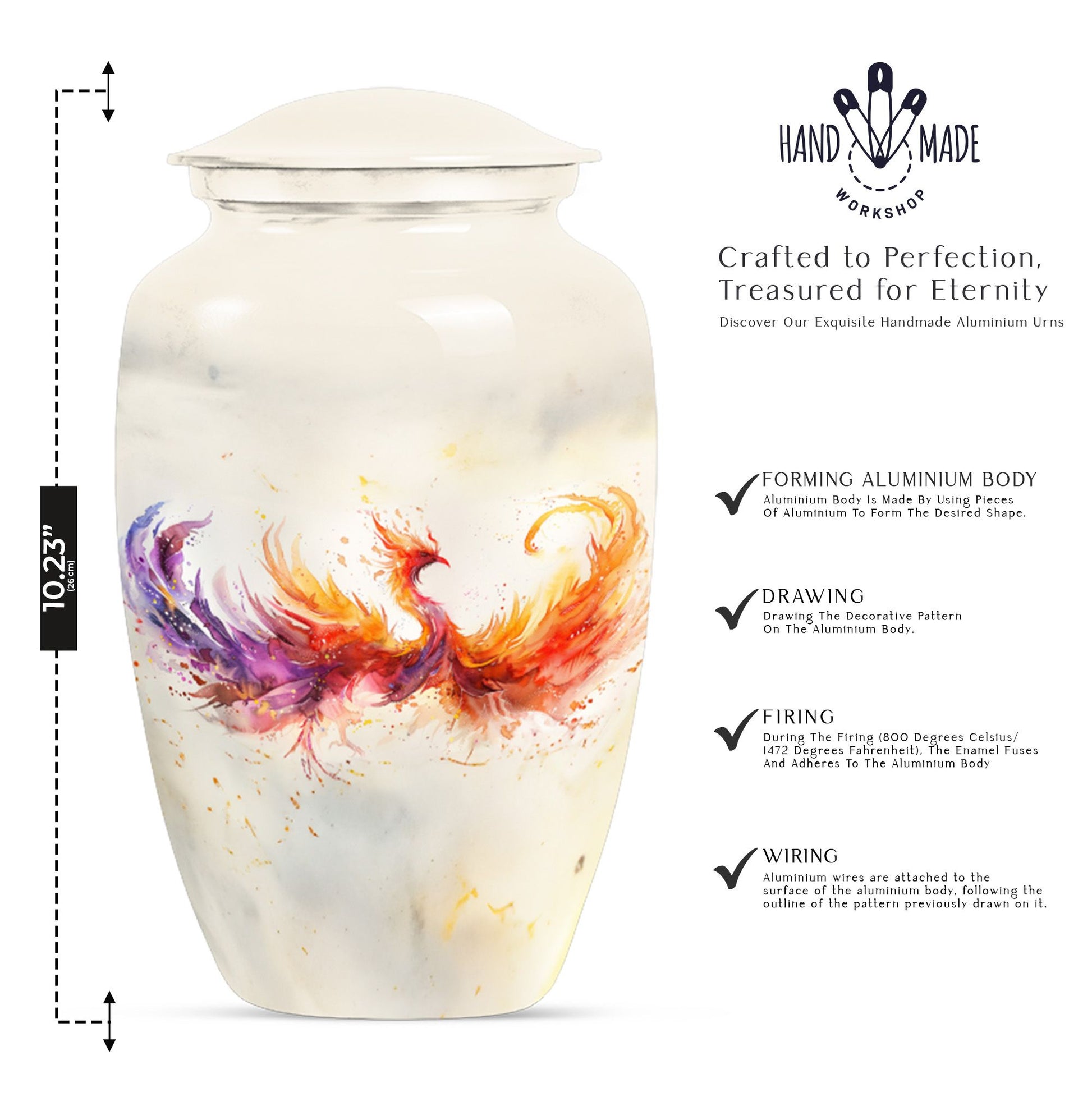 Honor those you love and remember with our exquisite Phoenix Urn. Our large-format, aluminium urn offers a generous 200 cubic inch capacity, sufficient for an adult's ashes. Its weight of 3.3 pounds pairs with its 10-inch height to give it a substantial, comforting presence. Supporting the theme of abstract elegance, each urn's shape adopts a timeless, classic design to symbolize the endless cycle and rebirth, much like the mythical Phoenix. Add a personal touch with our custom engraving offering, allowing you to affix names and commemorative words on your loved one's final resting place. This memorial urn is beyond an object; it's an embodiment of cherished memories, love unfading. Packaged with a high-quality velvet pouch for containment of ashes, it ensures safe and elegant storage. Perfectly suitable search keywords include cremation urns for human ashes adult, personalized urns, burial cremation urn, and memorial urns for mom.