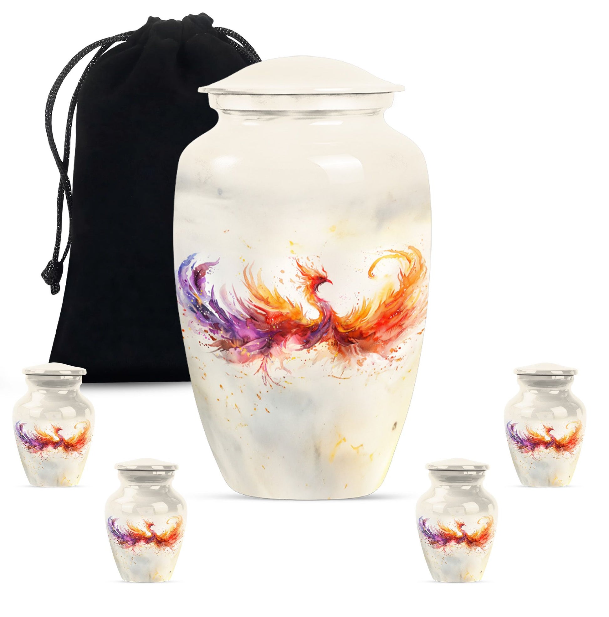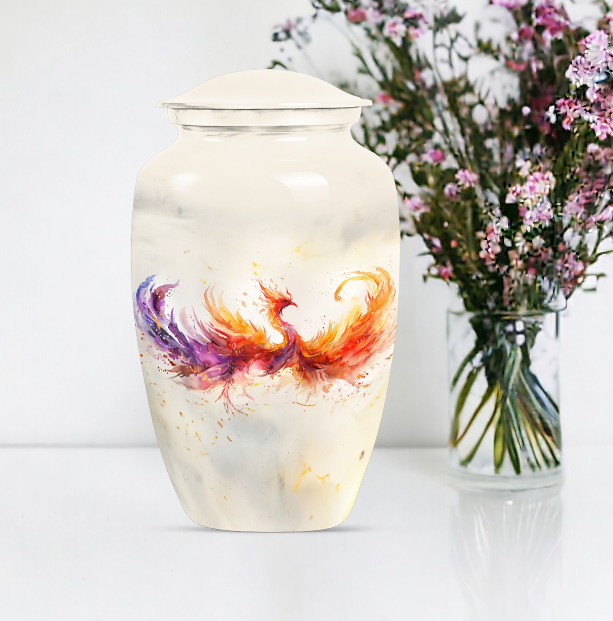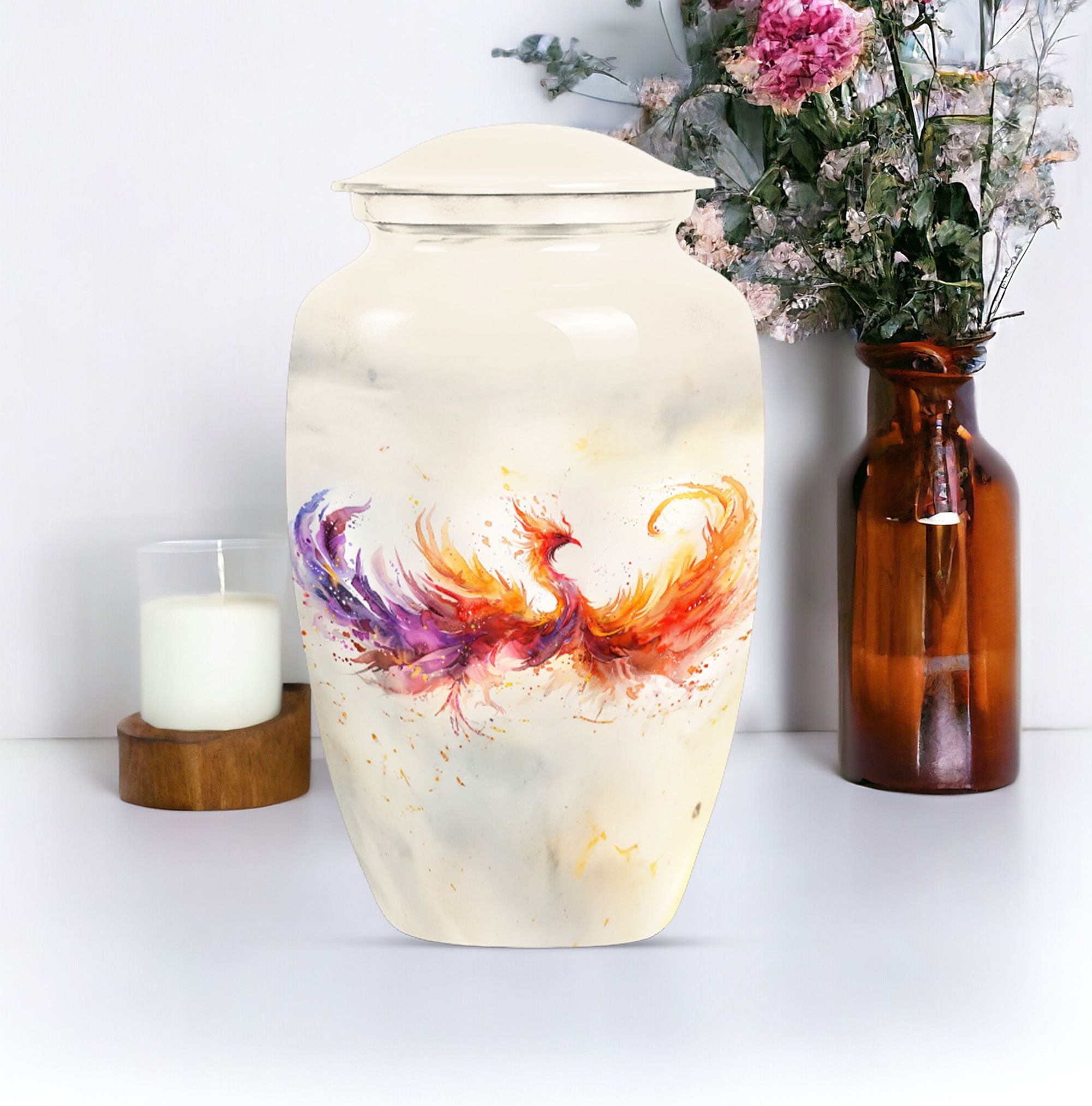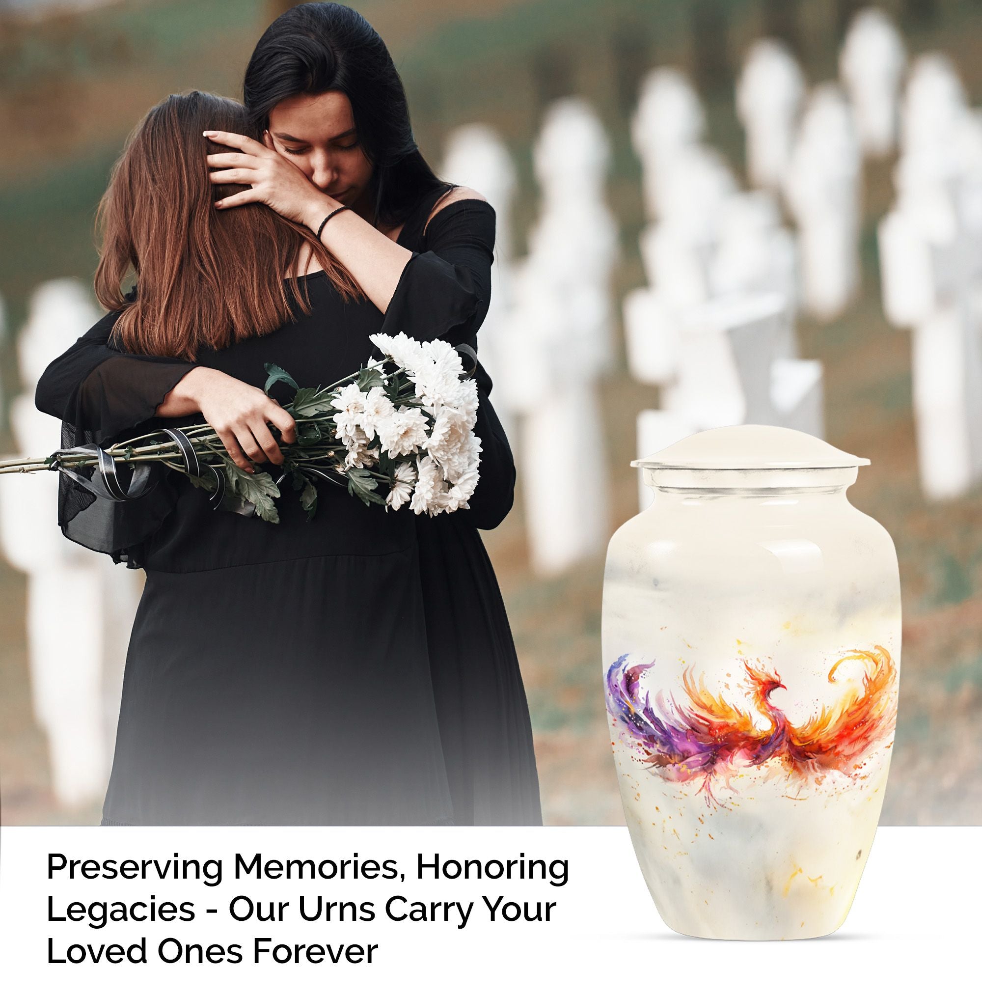 Honor those you love and remember with our exquisite Phoenix Urn. Our large-format, aluminium urn offers a generous 200 cubic inch capacity, sufficient for an adult's ashes. Its weight of 3.3 pounds pairs with its 10-inch height to give it a substantial, comforting presence. Supporting the theme of abstract elegance, each urn's shape adopts a timeless, classic design to symbolize the endless cycle and rebirth, much like the mythical Phoenix. Add a personal touch with our custom engraving offering, allowing you to affix names and commemorative words on your loved one's final resting place. This memorial urn is beyond an object; it's an embodiment of cherished memories, love unfading. Packaged with a high-quality velvet pouch for containment of ashes, it ensures safe and elegant storage. Perfectly suitable search keywords include cremation urns for human ashes adult, personalized urns, burial cremation urn, and memorial urns for mom.