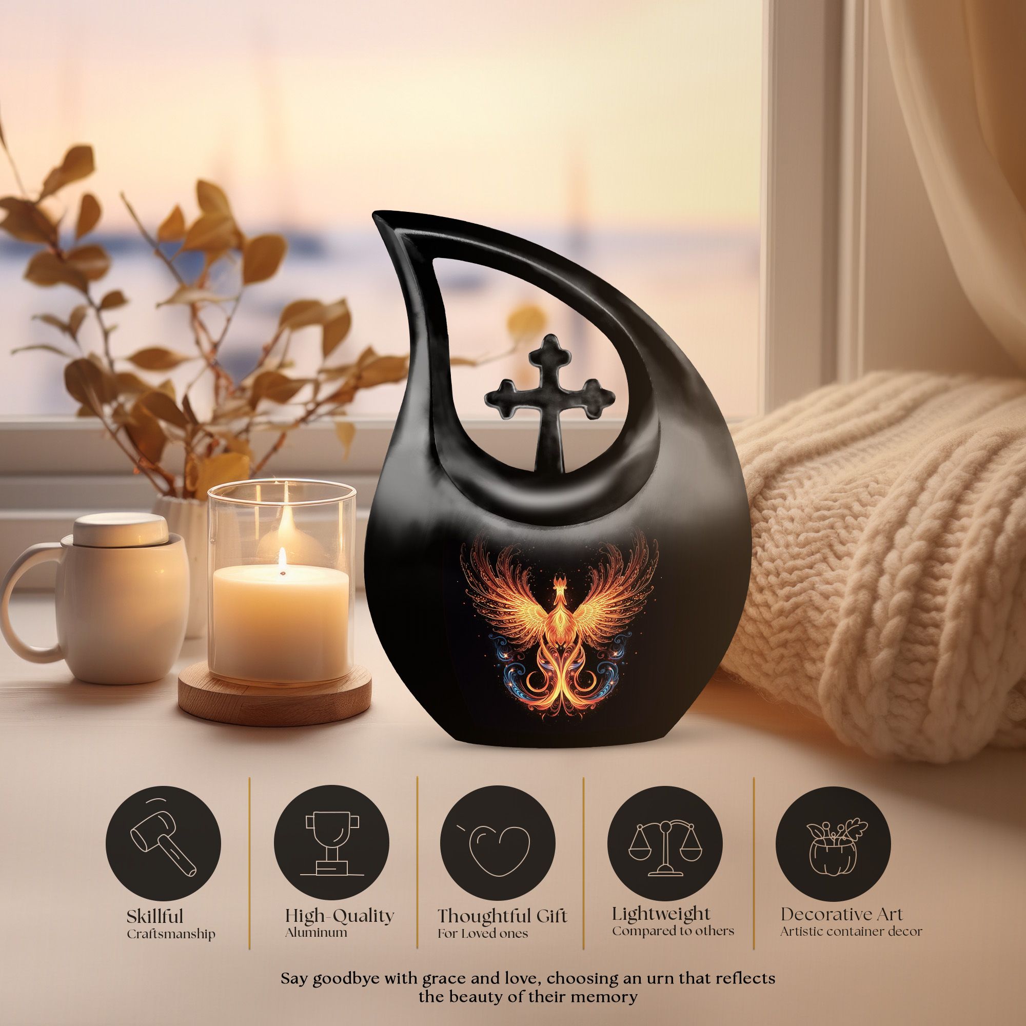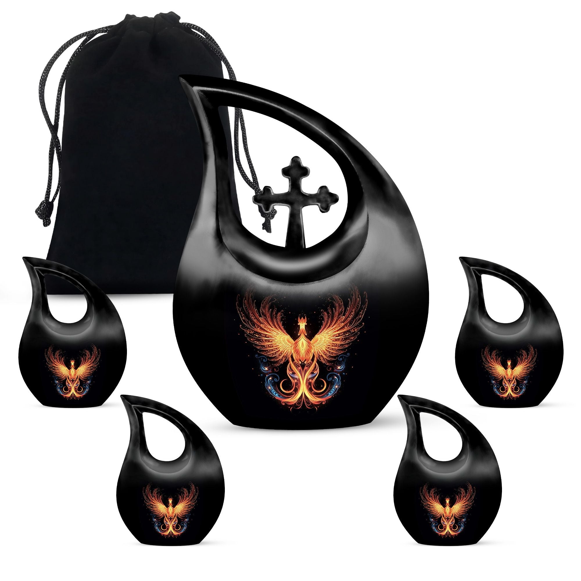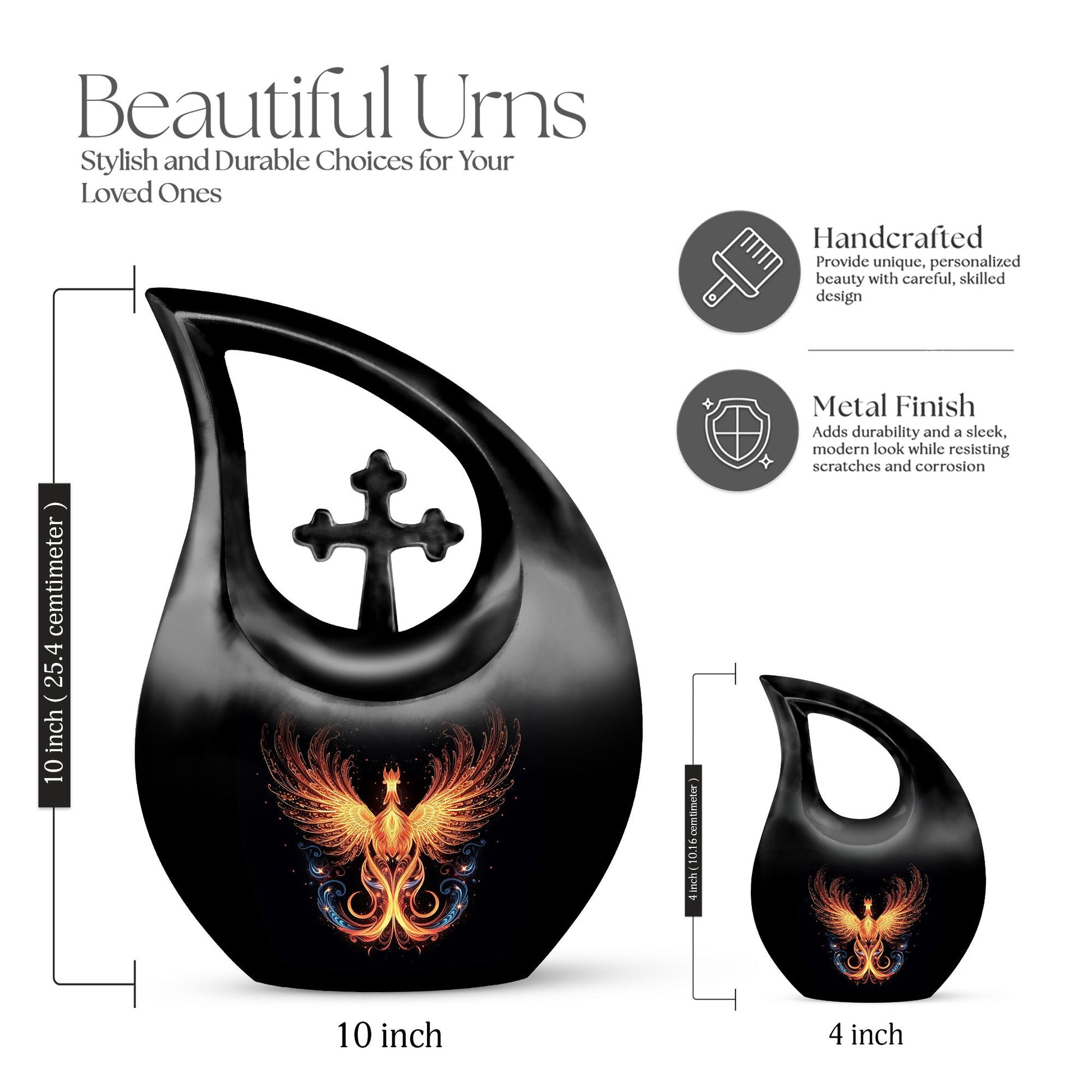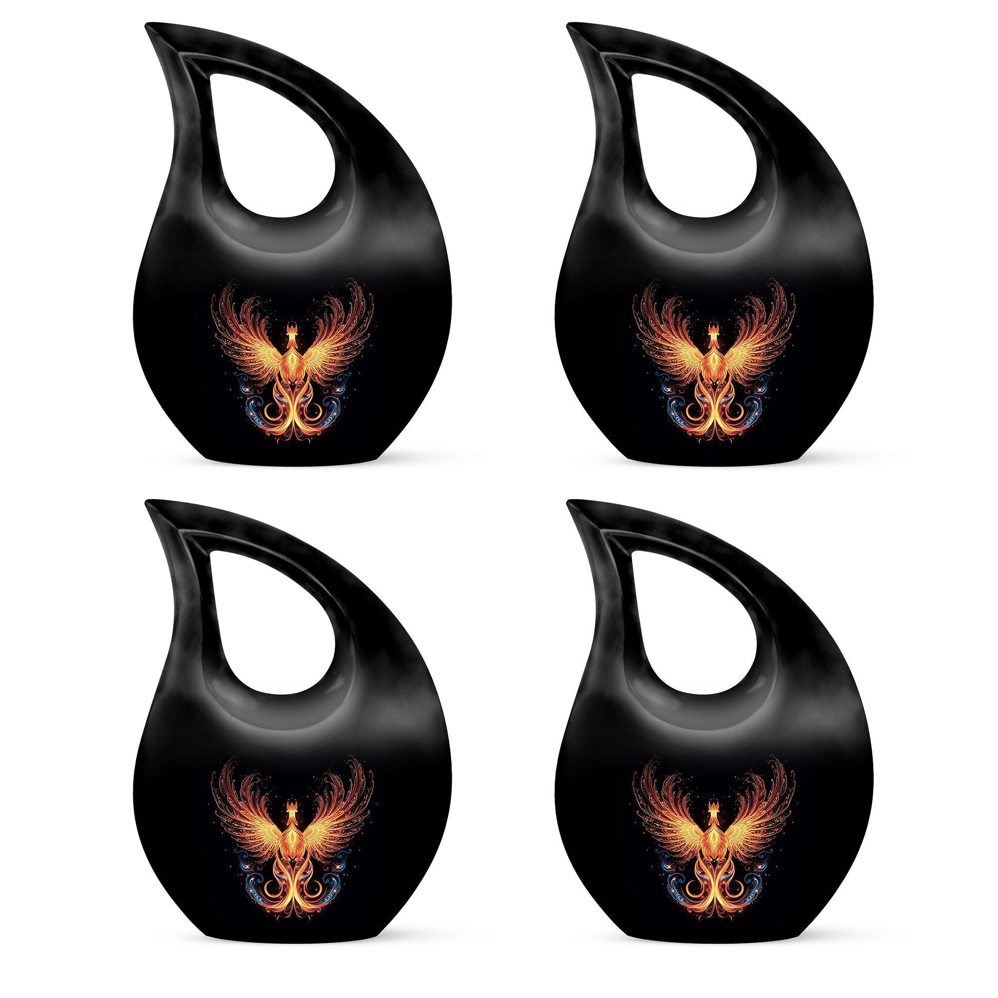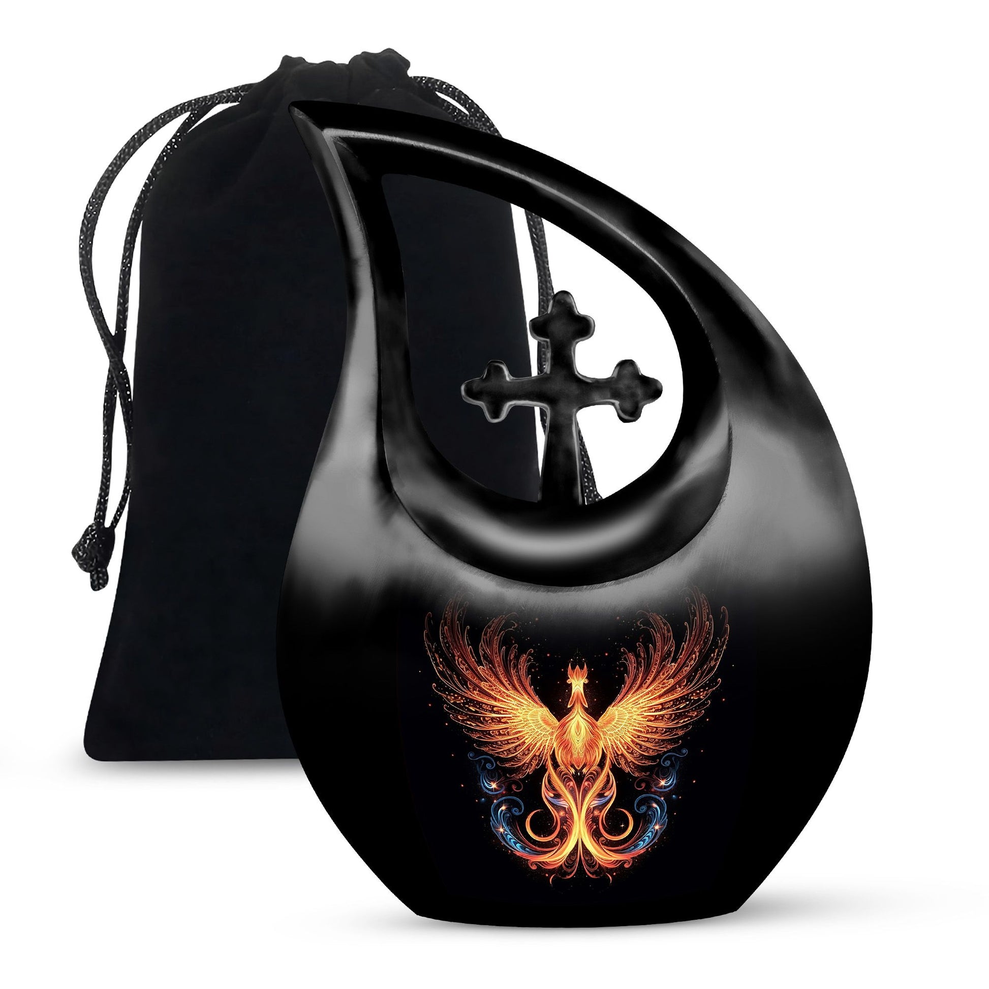 Crafted from premium-grade aluminum, this urn showcases the majestic phoenix bird—a symbol of immortality and renewal—against a sleek black finish. Skilled artisans polish every surface to a mirror-like shine, giving it both sophistication and depth. Ideal as a men urns for human ashes or urn for ashes adult female, it combines emotional beauty with practical strength. The design’s detailing and sturdy structure make it suitable for display at home, burial, or memorial services.